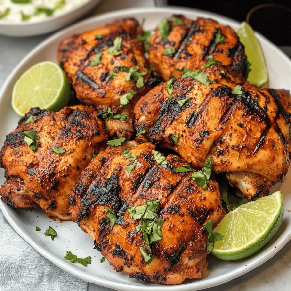 Nehme die Hähnchenschenkel aus der Marinade und lege sie vorsichtig auf den vorgeheizten Grill. Grille sie für etwa 7-8 Minuten mit offenem Deckel, bis sie schön angebräunt sind und die äußere Schicht leicht knusprig aussieht.