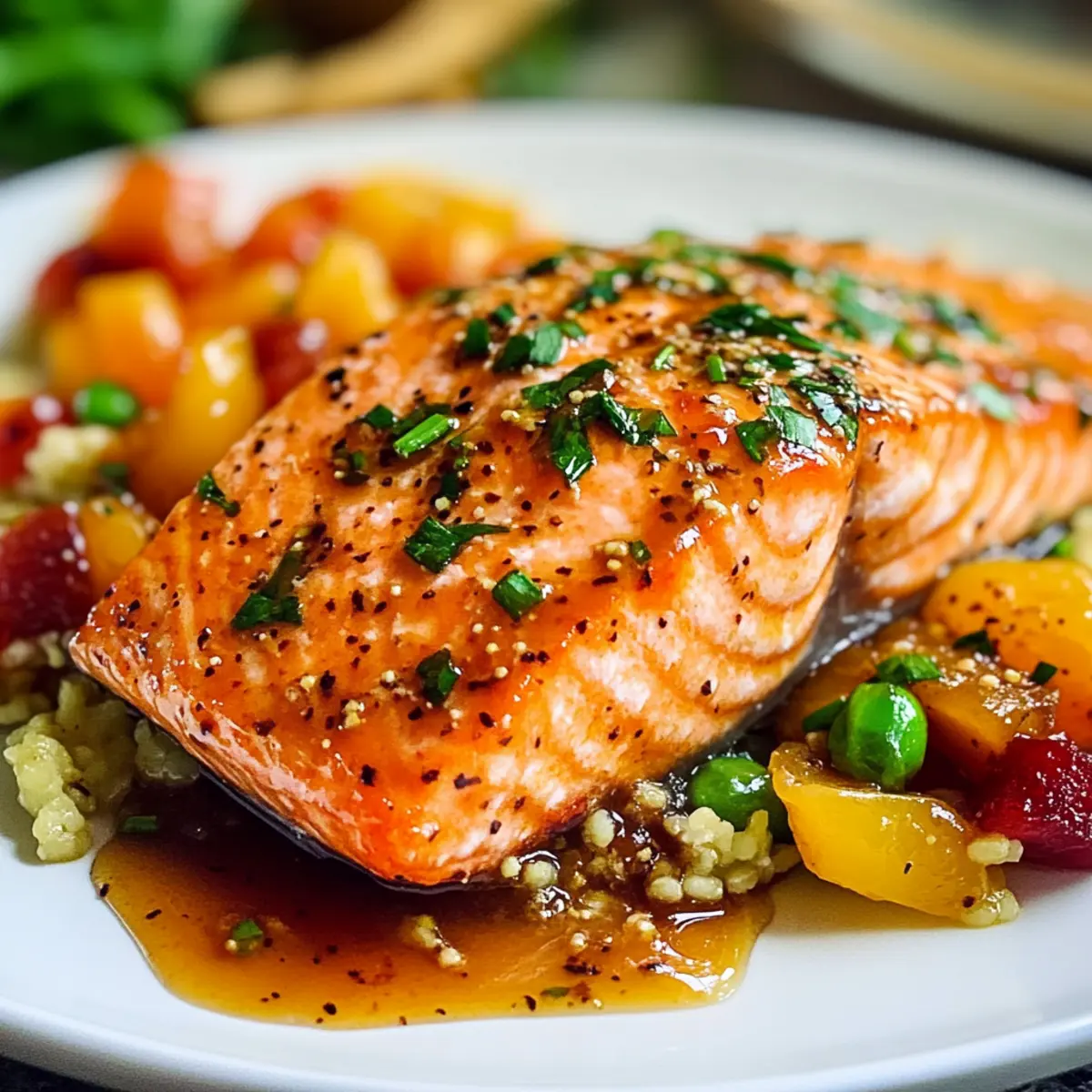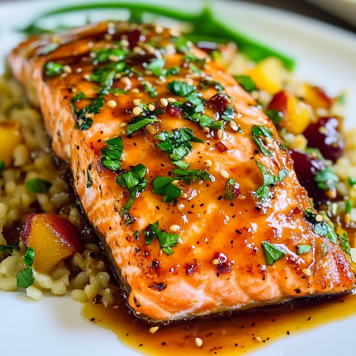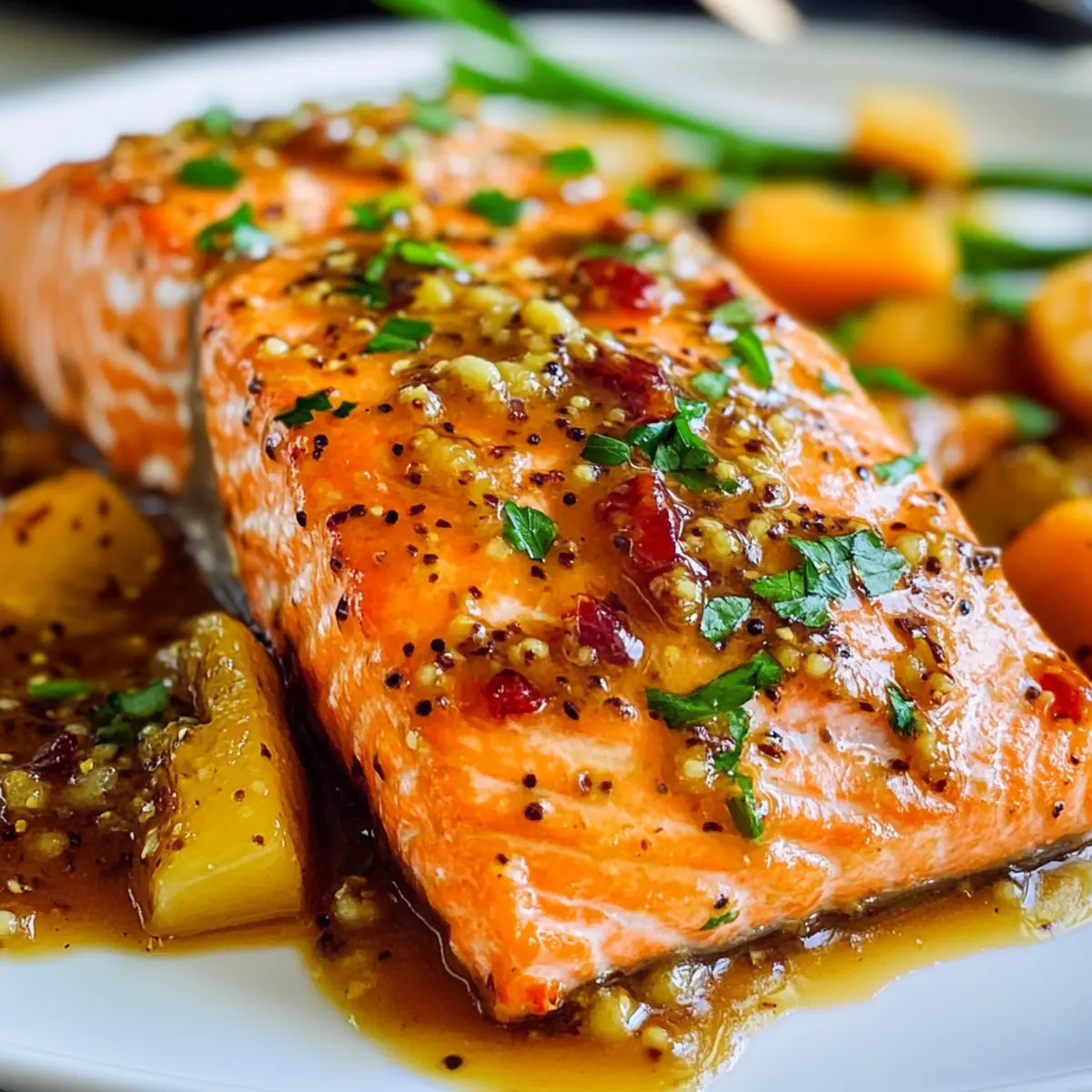 Wenn die Tage länger werden und der Frühling in die Küche einzieht, verspüre ich oft die Sehnsucht nach leichten, fruchtigen Gerichten. Diese Aprikosen-Dijon-glasierte Lachs wird schnell zum Star jedes Abendessens! Die Kombination aus zartem Lachs und einem süß-sauren Glanz aus Aprikosenmarmelade und Dijon-Senf sorgt für einen wahrhaft köstlichen Geschmack, der sowohl das Herz als auch den Gaumen erfreut. In weniger als 20 Minuten zubereitet, ist dieses Rezept perfekt für geschäftige Wochentage oder festliche Anlässe wie Ostern, sodass Sie mehr Zeit mit Ihren Lieben verbringen können. Bereit, diese köstliche Eroberung auszuprobieren? Warum schmeckt Lachs so gut mit Aprikosen? Einfachheit ganz groß: Mit nur wenigen Zutaten ist dieses Rezept im Handumdrehen zubereitet. Fruchtige Süße: Die Aprikosenmarmelade sorgt für eine harmonische Süße, die perfekt zum Lachs passt. Herzhafter Genuss: Die Kombination aus Dijon-Senf und Sojasauce verleiht dem Gericht Tiefe und Würze. Vielseitig einsetzbar: Ob für ein schnelles Abendessen unter der Woche oder ein festliches Osteressen – dieses Rezept beeindruckt in jeder Situation. Gastfreundliches Gericht: Ihre Gäste werden begeistert sein von der einfachen Zubereitung und dem raffinierten Geschmack. Perfekt dazu passt ein Ananas Cowboy Candy zur Abrundung Ihres Menüs! Zutaten für Aprikosen-Dijon-Glasierte Lachs • Entdecken Sie die einfachen Zutaten für ein unvergessliches Gericht! Für den Lachs • Lachsfilets – Hauptproteinquelle; sorgt für einen reichen, buttrigen Geschmack. • Salz und Pfeffer – Abschmecken für das perfekte Aroma. Für die Glasur • Aprikosenmarmelade (1/4 Tasse) – Fügt Süße und fruchtige Komplexität hinzu. • Körniger Senf (1 Esslöffel) – Bringt milde Schärfe; kann durch normalen Senf ersetzt werden, wenn weniger Textur gewünscht ist. • Dijon-Senf (1 Esslöffel) – Verleiht Tiefe und einen Hauch von Säure; kann für milderen Geschmack weggelassen werden. • Sojasauce (1 Esslöffel, low sodium) – Fügt herzhaften Geschmack hinzu; ersetzen Sie es durch Tamari für eine glutenfreie Variante. • Limettensaft (1 Esslöffel) – Bietet Säure zur Balance der Süße; frische Limette ist optimal. • Ingwer (2 Teelöffel, gerieben) – Bringt Wärme und Gewürze; kann bei Bedarf durch gemahlenen Ingwer ersetzt werden. • Knoblauch (2 Teelöffel, gerieben) – Verstärkt das herzhaft Profil; verwenden Sie frischen Knoblauch für einen stärkeren Geschmack. Genießen Sie dieses Rezept, das nicht nur schnell geht, sondern auch wunderbar fruchtig ist – die perfekte Lösung für Ihre nächste Mahlzeit! Schritt-für-Schritt-Anleitung für Aprikosen-Dijon-Glasierte Lachs Schritt 1: Ofen vorheizen Heizen Sie Ihren Ofen auf 200 °C (400 °F) vor. Dies ist der perfekte Zeitpunkt, um die Hitze aufzubauen, sodass Ihr Lachs eine köstlich knusprige Glasur erhält. Nutzen Sie eine Ofenmitte, um gleichmäßige Wärmeverteilung zu gewährleisten. Während der Ofen aufheizt, können Sie sich auf die Zubereitung der Glasur konzentrieren. Schritt 2: Glasur vorbereiten In einer großen Schüssel kombinieren Sie die Aprikosenmarmelade, den körnigen Senf, den Dijon-Senf, die Sojasauce, den Limettensaft, den geriebenen Ingwer und den geriebenen Knoblauch. Vermischen Sie alles gut, bis eine gleichmäßige, leicht klebrige Glasur entsteht. Diese aromatische Mischung wird den Aprikosen-Dijon-Glasierte Lachs perfekt verfeinern und ihm einen unverwechselbaren Geschmack verleihen. Schritt 3: Lachs vorbereiten Nehmen Sie Ihre Lachsfilets und legen Sie sie auf eine mit Backpapier ausgelegte Auflaufform. Klopfen Sie sie leicht trocken und würzen Sie beide Seiten mit etwas Salz und Pfeffer. Dies hilft, den natürlichen Geschmack des Lachses hervorzuheben und eine gute Basis für die süß-säuerliche Glasur zu schaffen, die das Hauptmerkmal des Aprikosen-Dijon-Glasierte Lachs ist. Schritt 4: Lachs glasieren Bestreichen Sie die Oberseite der Lachsfilets großzügig mit der vorbereiteten Glasur. Verwenden Sie einen Pinsel oder einen Löffel, um sicherzustellen, dass die Glasur gleichmäßig verteilt ist. Achten Sie darauf, alle Filets gut zu bedecken, da dies während des Backens für eine caramelisierte Kruste sorgt und den Lachsgeschmack intensiviert. Schritt 5: Lachs backen Schieben Sie die Auflaufform vorsichtig in den vorgeheizten Ofen und backen Sie den Lachs etwa 10 Minuten lang. Beobachten Sie den Lachs genau – er ist fertig, wenn er anfängt, leicht zu bröckeln und opulent glänzt. Die Glasur sollte eine goldene Farbe annehmen und dem Gericht eine appetitliche Optik verleihen. Schritt 6: Servieren Nehmen Sie den Aprikosen-Dijon-Glasierte Lachs aus dem Ofen und lassen Sie ihn kurz ruhen, bevor Sie ihn servieren. Dies hilft, die Säfte zu bewahren. Servieren Sie den Lachs warm, idealerweise mit einer Beilage wie Quinoa-Salat oder gedämpftem Gemüse. So genießen Ihre Gäste ein herrliches und gesundes Abendessen! Vorbereitungen für den Aprikosen-Dijon-Glasierte Lachs Diese Aprikosen-Dijon-glasierte Lachs ist eine perfekte Wahl für Meal Prep! Sie können die Glasur bis zu 3 Tage im Voraus zubereiten und im Kühlschrank aufbewahren, damit die Aromen gut durchziehen. Auch die Lachsfilets können bereits 24 Stunden zuvor gewürzt und mit der Glasur bestrichen werden, was dabei hilft, das Aroma zu intensivieren. Lagern Sie sie einfach in einem luftdichten Behälter, um die Frische zu bewahren. Wenn es Zeit zum Kochen ist, benötigen Sie nur noch etwa 10 Minuten im vorgeheizten Ofen, bis der Lachs weich und goldbraun ist. So genießen Sie ein köstliches Abendessen mit minimalem Aufwand und maximalem Geschmack! Was passt gut zu Aprikosen-Dijon-Glasierte Lachs? Ein köstliches Hauptgericht wie dieses Lachsgericht verdient eine harmonische Begleitung, die die Aromen perfekt ergänzt. Quinoa-Salat: Dieser leichte Salat bringt frische Kräuter und knackige Texturen mit, die den Lachs wunderbar Kontrast bieten.