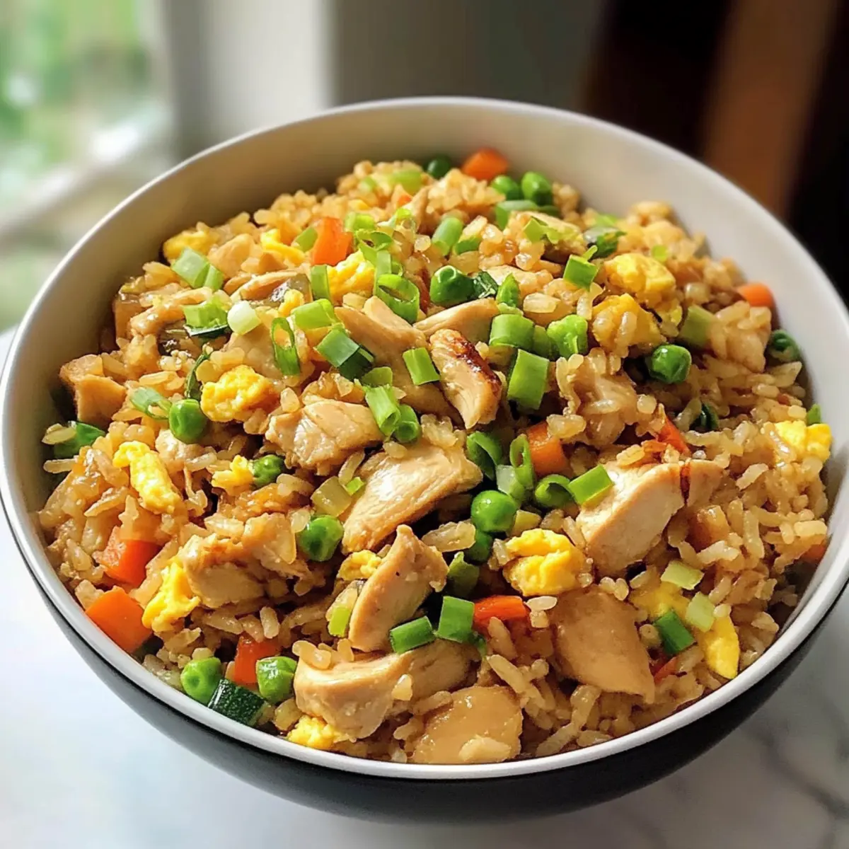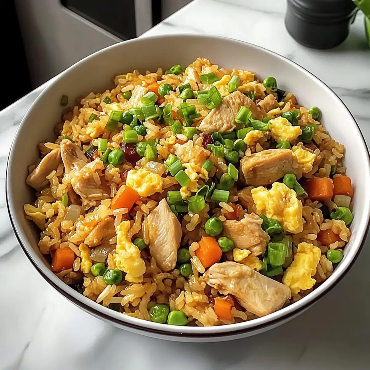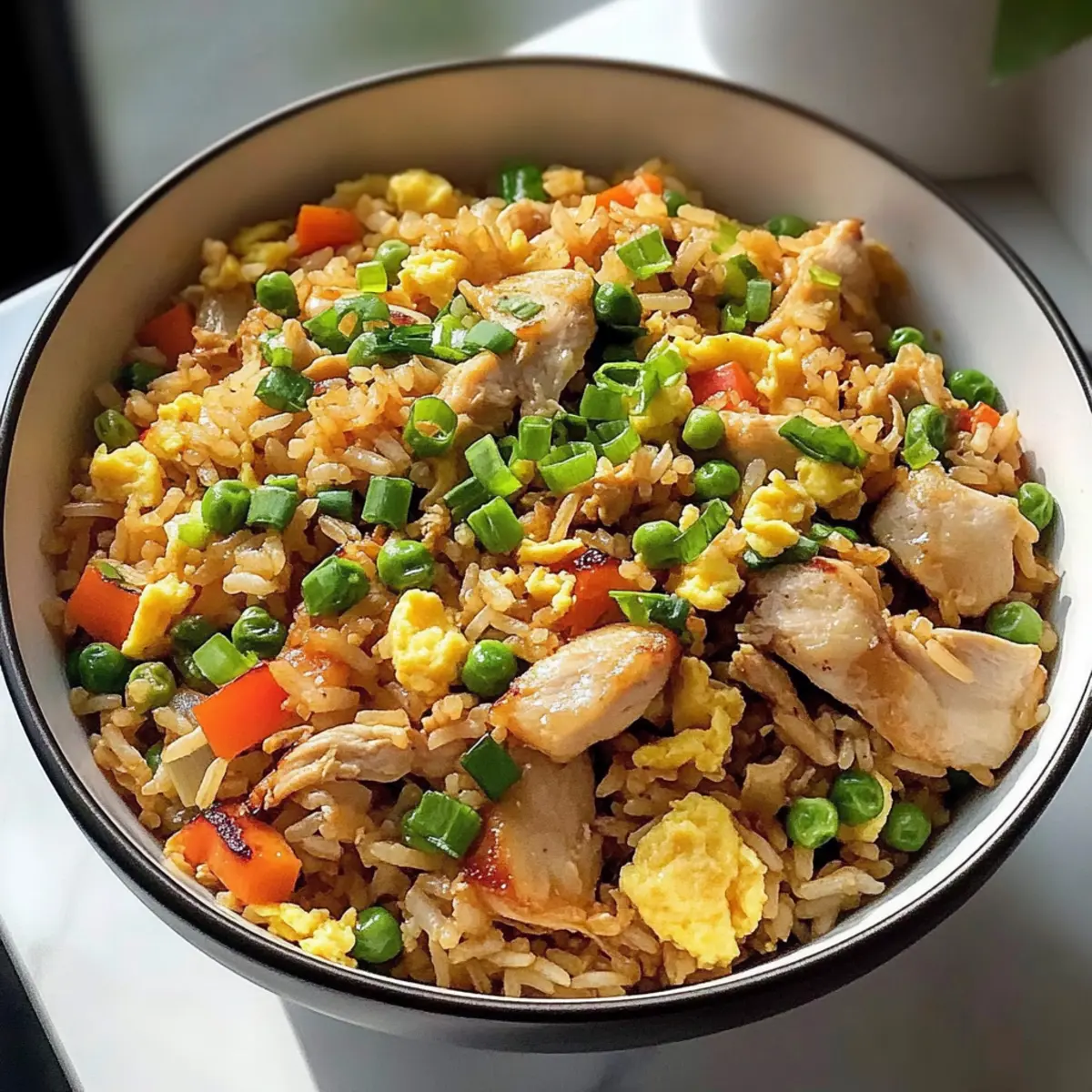 „Wir müssen was mit den Resten machen!“ hörte ich neulich beim Kochen von meinem Freund sagen, während er einen Blick in unseren Kühlschrank warf. Und genau das brachte mich zu meinem letzten Lieblingsgericht: Asiatischer Hühnerbratreis. Diese schnell zubereitete Delikatesse ist nicht nur ein großartiger Weg, um übrig gebliebenen Reis und Gemüse zu verwerten, sondern sie schmeckt auch himmlisch! Innerhalb von etwa 20 Minuten verwandelt sich ein einfaches Abendessen in ein buntes, hochproteinreiches Gericht, das die ganze Familie glücklich macht. Die Kombination aus knusprigen Gemüsestücken, zartem Hähnchen und dem verlockenden Aroma der asiatischen Gewürze wird jeden Bissen zu einem Erlebnis. Bist du bereit, deine Küchenskills auf das nächste Level zu heben? Lass uns gemeinsam dieses Rezept entdecken! Warum solltest du diesen Hühnerbratreis lieben? Schnelligkeit: In nur 20 Minuten zauberst du ein schmackhaftes Gericht, perfekt für hektische Wochentage. Vielfalt: Die Kombination aus Hähnchen, frischem Gemüse und aromatischen Gewürzen macht jeden Biss zum Genuss. Nachhaltigkeit: Nutze deine Reste clever, um aus übrig gebliebenem Reis und Gemüse etwas Leckeres zu kreieren. Proteinreich: Mit zartem Hähnchen und Eiern bietet dieses Gericht eine tolle Proteinquelle für die ganze Familie. Genuss: Vergiss den Takeout! Dieser Hühnerbratreis ist nicht nur frisch, sondern auch viel schmackhafter als das Restaurantessen. Um dein asiatisches Kocherlebnis zu erweitern, probiere auch unsere Cremige Knoblauch Baby oder die Knoblauch Chili Lotuswurzel als Beilagen! Asiatischer Hühnerbratreis Zutaten Für die Sauce Chinesischer Kochwein – Fügt Tiefe und Umami-Geschmack zur Sauce hinzu. Hinweis: Sake kann als Ersatz verwendet werden. Austernsauce – Sorgt für einen reichen, herzhaften Geschmack. Hinweis: Verwende vegetarische Austernsauce für eine vegetarische Variante. Hellsojasauce – Verleiht dem Gericht eine salzige Tiefe. Hinweis: Tamari eignet sich als glutenfreie Alternative. Sesamöl – Bietet ein nussiges Aroma und Geschmack. Hinweis: Kann durch ein aromatisiertes Öl ersetzt werden. Weißer Pfeffer – Fügt eine subtile Schärfe hinzu. Hinweis: Schwarzer Pfeffer kann als Alternative verwendet werden. Gemahlener Ingwer – Bringt Wärme und Würze in das Gericht. Hinweis: Frischer Ingwer sorgt für einen lebhafteren Geschmack. Für die Hauptzutaten Öl – Zum Kochen verwendet; reguläres Pflanzen- oder Rapsöl funktioniert gut. Hinweis: Wähle ein Öl mit hohem Rauchpunkt für die besten Ergebnisse. Eier – Dienen als Proteinquelle und tragen zur Textur bei. Hinweis: Verwende Tofu für eine pflanzliche Variante. Hähnchenbrust – Hauptproteinbestandteil, in mundgerechte Stücke geschnitten. Hinweis: Tofu oder Tempeh können für eine vegetarische Option verwendet werden. Knoblauch – Fügt ein aromatisches Aroma hinzu. Hinweis: Granulierter Knoblauch kann verwendet werden, wenn frischer nicht verfügbar ist. Zwiebel – Bildet die Geschmacksbasis, klein gewürfelt. Hinweis: Schalotten bieten eine süßere Geschmacksalternative. Speck – Fügt Rauchigkeit und Reichhaltigkeit hinzu. Hinweis: Vegetarischer Speck oder Pilze können für eine fleischfreie Option verwendet werden. Für das Gemüse Karotte – Sorgt für Süße und Farbe. Hinweis: Paprika oder Erbsen können ebenfalls gut funktionieren. Mais – Fügt Süße und Textur hinzu. Hinweis: Frischer, gefrorener oder eingemachter Mais kann verwendet werden. Erbsen – Geben einen Farbtupfer und Nährstoffe. Hinweis: Jede frische oder gefrorene grüne Gemüseart kann ersetzt werden. Gekochter weißer Reis (am besten vom Vortag) – Essenziell für die perfekte Bratreis-Textur. Hinweis: Frischer Reis kann verwendet werden, wenn er zuvor abgekühlt wird. Frühlingszwiebeln – Fügen Frische und Knusprigkeit hinzu; die weißen Teile werden zum Kochen verwendet, die grünen zum Garnieren. Hinweis: Schnittlauch kann für einen ähnlichen Geschmack ersetzt werden. Schritt-für-Schritt-Anleitung für Asiatischen Hühnerbratreis Step 1: Sauce vorbereiten Mische in einer Schüssel den chinesischen Kochwein, die Austernsauce, die Hellsojasauce, das Sesamöl, den weißen Pfeffer und den gemahlenen Ingwer gut durch. Stelle die Sauce beiseite, während du dich um die restlichen Zubereitungen kümmert. Diese aromatische Mischung wird deinem Asiatischen Hühnerbratreis den charakteristischen Geschmack verleihen. Step 2: Zutaten vorbereiten Zerkleinere den Knoblauch, würfle die Zwiebel, die Karotte und das Hähnchen in kleine Stücke. Schneide den Speck und die Frühlingszwiebeln und achte darauf, die weißen Teile von den grünen zu trennen. Halte alle vorbereiteten Zutaten bereit, da sie schnell verarbeitet werden müssen, um ein gleichmäßiges Garen zu gewährleisten. Step 3: Eier rühren Erhitze einen Wok bei mittlerer bis hoher Temperatur und füge einen Esslöffel Öl hinzu. Schlage die Eier hinein und verrühre sie für etwa 2-3 Minuten, bis sie gestockt und leicht goldbraun sind. Nimm die Eier aus dem Wok und stelle sie zur Seite, damit sie nicht übergaren. Step 4: Speck anbraten Füge im selben Wok den geschnittenen Speck hinzu und brate ihn bei mittlerer Hitze für etwa 1 Minute an, bis er leicht knusprig ist. Gib dann den Knoblauch und die Zwiebel hinzu und brate alles zusammen für 30 Sekunden, bis der Knoblauch aromatisch ist und die Zwiebel glasig wird. Step 5: Hähnchen hinzufügen Jetzt ist es Zeit, das vorbereitete Hähnchen in den Wok zu geben. Koche das Hähnchen für 1-1,5 Minuten oder bis es fast durchgegart und die Stücke leicht goldbraun sind. Achte darauf, das Hähnchen regelmäßig umzurühren, damit es gleichmäßig garen kann. Step 6: Gemüse einarbeiten Füge die gewürfelte Karotte, den Mais und die Erbsen in den Wok hinzu. Brate alles zusammen für etwa 1 Minute, bis das Gemüse erhitzt, aber immer noch fest ist. Diese frischen Zutaten bringen Farbe und Nährstoffe in deinen Asiatisc