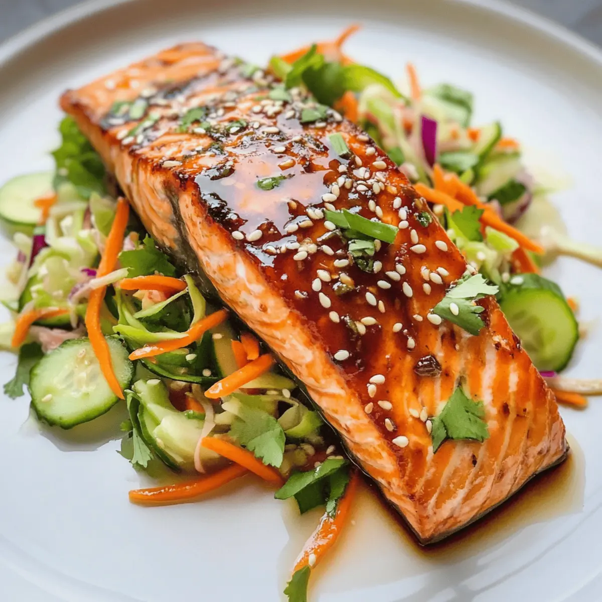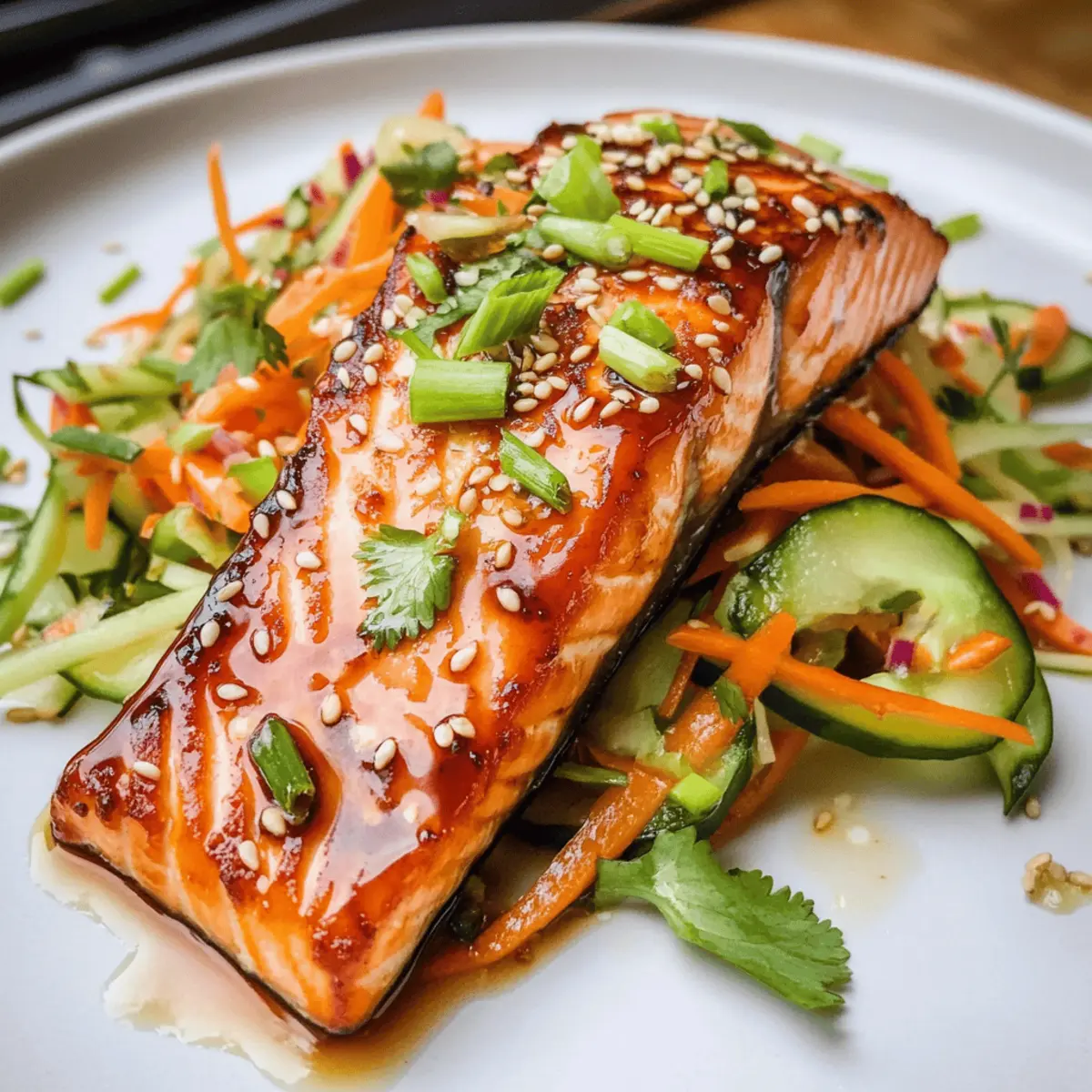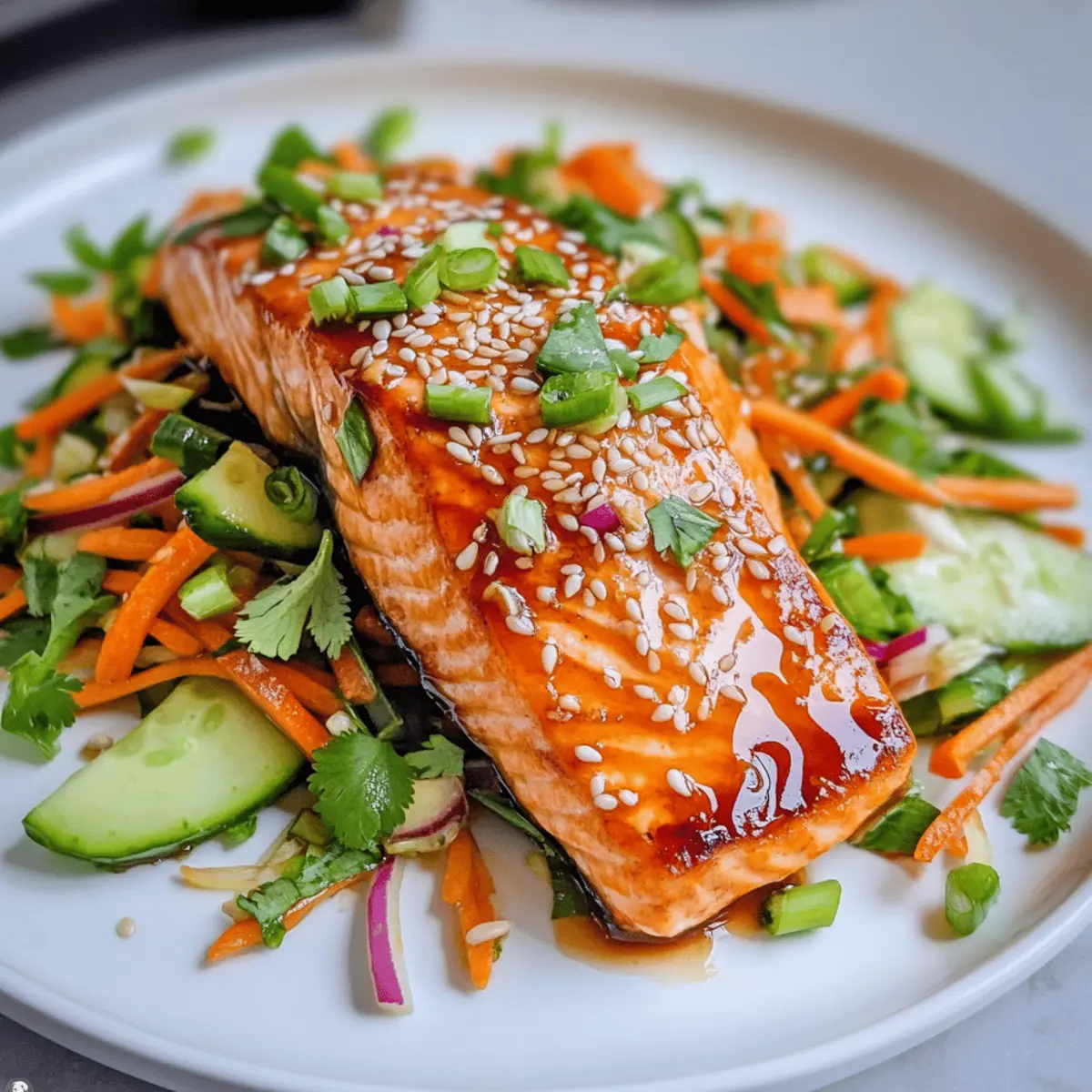 Es war ein dieser schnellen Abende, an denen ich keine Lust auf aufwendiges Kochen hatte, aber trotzdem etwas Frisches und Leckeres auf den Tisch bringen wollte. Da kam mir das Rezept für Asian Salmon mit süßem Karotten- und Gurkenslaw gerade recht. Diese Kombination überzeugt nicht nur durch ihre gesunde Zubereitung, die glutenfrei ist, wenn man Tamari anstelle von Sojasauce verwendet, sondern auch durch die schnelle Zubereitungszeit. Der in einer aromatischen Marinade aus Sojasauce, Zitronengras, Ingwer und Knoblauch eingelegte Lachs lässt sich im Handumdrehen im Ofen garen. Mit der knackigen Slaw kombinieren sich Aromen, die zum Träumen anregen und perfekt für ein leichtes Abendessen sind. Neugierig, wie du dieses geschmackliche Abenteuer selbst erleben kannst? Warum wirst du dieses Rezept lieben? Einfachheit: Die Zubereitung ist unkompliziert und benötigt nur grundlegende Küchentalente, perfekt für geschäftige Wochentage. Frischer Crunch: Die Kombination aus Karotten und Gurken verleiht dem Gericht nicht nur eine knackige Textur, sondern auch frische Aromen. Gesunde Wahl: Mit der glutenfreien Option durch Tamari ist dieser Lachs eine nährstoffreiche Auswahl, die du ohne schlechtes Gewissen genießen kannst. Aromatische Marinade: Der Lachs wird in einer verführerischen Marinade eingelegt, die das Gericht besonders würzig und schmackhaft macht. Vielseitig: Du kannst die Gemüsesorten nach Belieben anpassen – probiere zum Beispiel auch Ananas Cowboy Candy für eine fruchtige Note dazu. Schnell und lecker: In weniger als 30 Minuten hast du ein köstliches Essen auf dem Tisch, das garantiert auch deine Familie begeistern wird! Asiatischer Lachs Zutaten Für den Lachs Sojasauce – Verleiht dem Gericht einen umami Geschmack; für glutenfreien Genuss Tamari verwenden. Zitronengraspaste – Fügt eine zitrusartige Note hinzu; frisches Zitronengras kann auch genutzt werden. Knoblauch – Verstärkt den Geschmack; frischer Knoblauch hat die beste Wirkung. Ingwer – Bringt Wärme ins Gericht; kann bei Bedarf durch gemahlenen Ingwer ersetzt werden. Chiliflocken oder frische Chili – Fügen Schärfe hinzu; nach Belieben anpassen. Koriander – Sorgt für Frische und Komplexität; kann durch Petersilie ersetzt werden. Limettensaft – Bietet Säure, die die Aromen balanciert; frischer Limettensaft ist am besten. Honig – Kompensiert die Salzigkeit der Sojasauce; kann durch braunen Zucker oder Ahornsirup ersetzt werden. Lachs (250g/8oz) – Die Hauptzutat; wild gefangener Lachs wird für den besten Geschmack empfohlen. Für den Slaw Gurke – Gibt dem Slaw einen knackigen Biss; lässt sich durch Zucchini ersetzen, wenn gewünscht. Karotte – Bringt Süße und Farbe ins Gericht; verschiedene Karottensorten sorgen für Abwechslung. Radieschen – Fügen einen pfeffrigen Crunch hinzu; können durch Paprika für zusätzliche Süße ersetzt werden. Frühlingszwiebeln – Bringen einen milden Zwiebelgeschmack; reguläre Zwiebeln, fein geschnitten, können auch verwendet werden. Erdnüsse – Sorgt für Crunch und Reichhaltigkeit; für eine nußfreie Variante können Sonnenblumenkerne verwendet werden. Dressing-Zutaten (für das Slaw) Geröstete Erdnüsse – Zum Zerstoßen für das Dressing; andere Nüsse oder Samen können ebenfalls verwendet werden. Knoblauch – Wie oben beschrieben für zusätzlichen Geschmack. Chili – Für die Schärfe; nach Geschmack anpassen. Salz – Wichtig zur Würzung; nach Belieben anpassen. Palmzucker (oder brauner Zucker) – Für den süßen Ausgleich; einfach austauschbar. Fischsauce – Fügt einen salzigen Tiefgang hinzu; kann bei vegetarischen Varianten durch Sojasauce ersetzt werden. Frischer Limettensaft – Für spritzige Frische; auch hier ist frisch am besten. Tamarindo-Sauce (optional) – Sorgt für eine zusätzliche Säure; kann weggelassen werden, wenn nicht verfügbar. Schritt-für-Schritt-Anleitung für Asiatischer Lachs mit süßem Karotten- und Gurkenslaw Schritt 1: Lachs marinieren In einer Schüssel vermischst du Sojasauce, Zitronengraspaste, Knoblauch, Ingwer, Limettensaft, Koriander und Chili. Lege die Lachsfilets in die Marinade und achte darauf, dass sie gut bedeckt sind. Decke die Schüssel ab und lasse den Lachs für 30 Minuten im Kühlschrank ziehen, damit sich die Aromen entfalten können. Schritt 2: Dressing vorbereiten Zerstoße die Erdnüsse, den Knoblauch, die Chili und das Salz in einem Mörser, bis eine feine Paste entsteht. Füge die Fischsauce, den Limettensaft und die Tamarindosauce (falls verwendet) hinzu und vermische alles gut. Stelle das Dressing beiseite, um den Geschmack ziehen zu lassen, während du die restlichen Zutaten zubereitest. Schritt 3: Slaw-Gemüse vorbereiten Schäle die Karotte und schneide sie zusammen mit der Gurke und den Radieschen in dünne Streifen oder Stifte. Schneide die Frühlingszwiebeln und die Chili in feine Ringe. Vermische das gesamte Gemüse in einer großen Schüssel und gieße das vorbereitete Dressing darüber, bevor du alles gut vermengst. Schritt 4: Lachs garen Heize den Ofen auf 200°C vor (Grillfunktion). Nimm die marinierten Lachsfilets aus dem Kühlschrank und bestreiche sie mit einem Hauch Honig, um eine köstliche Karamellisierung zu erzielen. Lege die Filets auf ein mit Backpapier belegtes Blech und grille sie für etwa 7 Minuten, bis sie goldbraun und zart sind. Schritt 5: Servieren Verteile das knusprige Slaw gleichmäßig auf die Teller, bevor du den fertig gegarten Lachs darauflegst. Garniere das Gericht mit gerösteten Sesamkörnern und zusätzlichen Frühlingszwiebeln für einen schönen Look. Genieße diesen leckeren Asiatischen Lachs mit süßem Karotten- und Gurkenslaw direkt! Tipps für den besten asiatischen Lachs Marinade nicht sparen: Lasse den Lachs mindestens 30 Minuten marinieren, um die Aromen vollständig aufnehmen zu können. So wird dein Gericht besonders schmackhaft. Gemüse schneiden: Verwende eine Mandoline oder ein scharfes Messer, um die Karotte