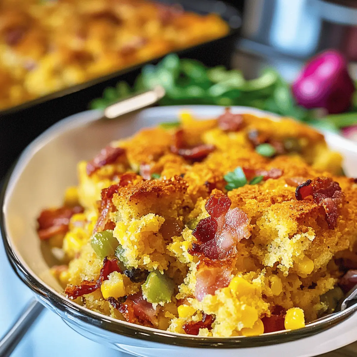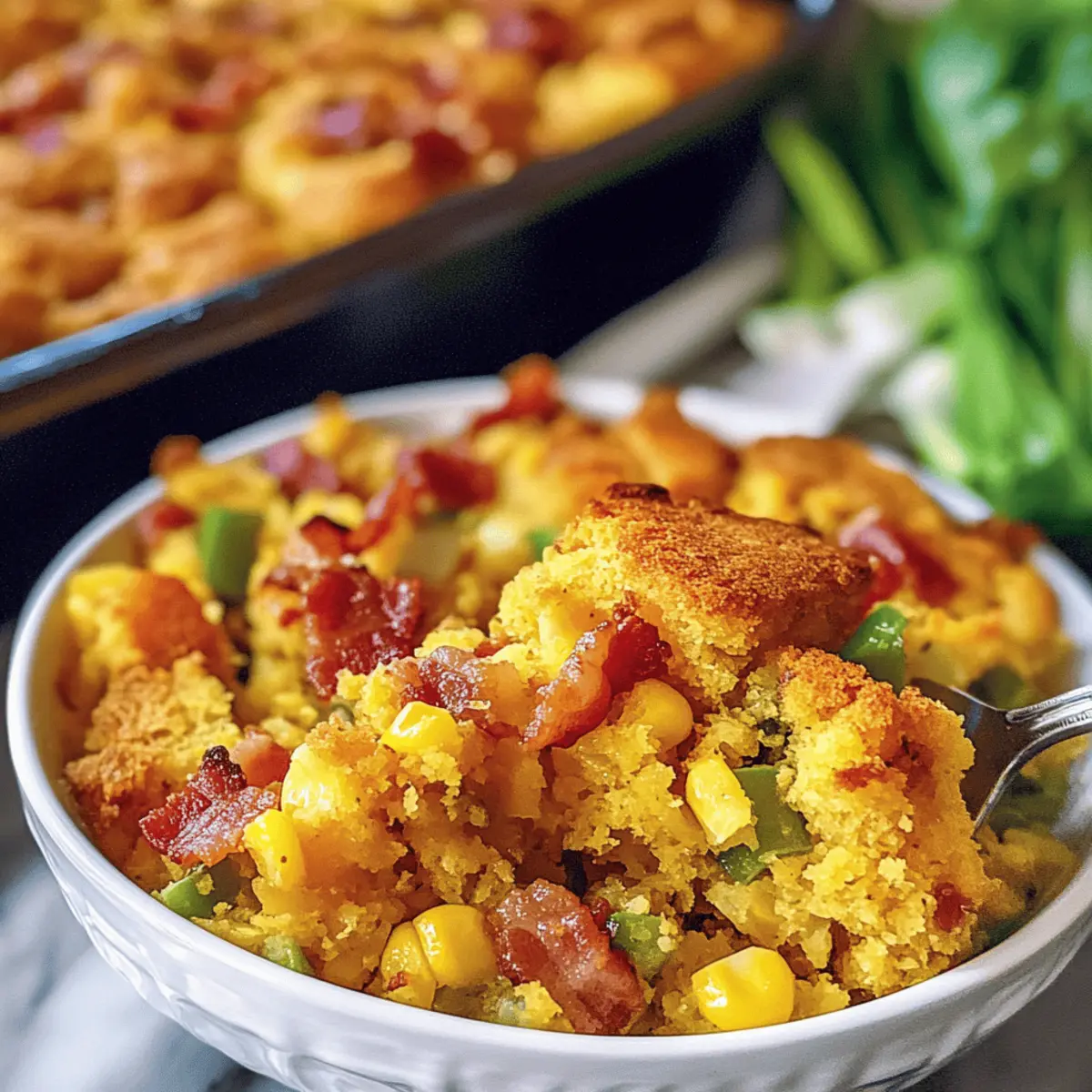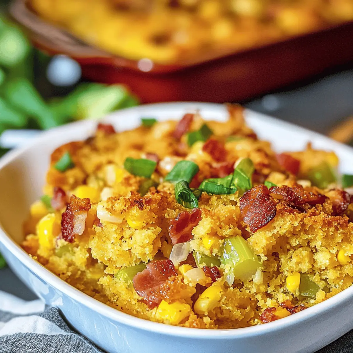 Als ich zum ersten Mal den Duft von frisch gebackenem Southern Cornbread Dressing mit Bacon in meinem Haus wahrnahm, fühlte ich mich sofort an die Familienzusammenkünfte meiner Kindheit erinnert. Dieses köstliche, feuchte Gericht ist die perfekte Ergänzung zu jedem festlichen Essen und bietet eine harmonische Mischung aus wärmenden Aromen und Texturen. Mit der Kombination aus angebautem Mais, zartem Brot und knusprigem Bacon wird es nicht nur zur Gaumenfreude, sondern auch zu einem herzlichen Komfortessen, das die Seele wärmt. Besonders praktisch ist, dass dieses Rezept leicht anpassbar ist, sodass du kreativ mit Zutaten spielen kannst, um deine persönliche Note einzubringen. Neugierig, wie du dieses traditionelle Gericht zubereiten kannst, das garantiert jedem schmeckt? Warum solltest du das Rezept lieben? Einfachheit: Die Zubereitung ist unkompliziert und erfordert nur grundlegende Kochfähigkeiten. Herzhafter Geschmack: Die Kombination von Bacon, Gemüse und Kräutern liefert ein reichhaltiges Geschmackserlebnis. Vielseitigkeit: Passe die Zutaten an deine Vorlieben an, z.B. mit Buffalo Huehnchen Mit oder füge etwas frisches Gemüse hinzu. Perfekte Textur: Die Mischung aus cremigem Mais und knusprigem Brot sorgt für ein unglaublich angenehmes Mundgefühl. Ideales Festessen: Absolut perfekt für Feiertage und Familienessen – jeder wird nach mehr verlangen. Vorbereitung: Du kannst es im Voraus zubereiten und einfach im Ofen aufwärmen, was dir Zeit an einem geschäftigen Feiertag spart. Zutaten für Bacon Cornbread Dressing • Für die Füllung: Bacon – Fügt eine herzhafte Tiefe und Geschmack hinzu; bevorzuge die normale Schnittführung. Süße Zwiebel – Trägt zur Süße und zu aromatischen Schichten bei. Sellerie – Sorgt für Knusprigkeit und Frische in der Füllung. Gemahlener Salbei – Bietet aromatische Kräuternoten und ist typisch für traditionelle Füllungen. Küchen-salz & schwarzer Pfeffer – Essentiell zur Würzung; nach Geschmack anpassen. Knoblauch – Bringt ein duftendes Element, das den Gesamtgeschmack verbessert. Cornbread – Dient als Basis und sorgt für Textur; kann gekauft oder selbst gemacht werden. Eintags-weißes Brot – Steigert die Feuchtigkeit und Textur; ist für die richtige Konsistenz unerlässlich. Frische Petersilie – Fügt Farbe und Frische hinzu; optional als Garnitur. Eier – Bindet die Mischung zusammen und verleiht Reichhaltigkeit. Creme-mais – Wesentlich für die Feuchtigkeit; sollte nicht durch normale Dosenmais ersetzt werden. Ungesalzene Hühnerbrühe – Befeuchtet die Mischung; benutze mehr für eine feuchtere Füllung. Gesalzene Butter – Fügt Reichhaltigkeit und Geschmack hinzu; vor dem Backen darüber träufeln. Schritt-für-Schritt-Anleitung für Bacon Cornbread Dressing Schritt 1: Ofen vorheizen Heize den Ofen auf 175°C vor und bereite eine 23×33 cm große Auflaufform mit einer Antihaft-Sprühbeschichtung vor, damit das Bacon Cornbread Dressing beim Backen nicht anhaftet. Diese Vorbereitung ist entscheidend, damit dein Dressing gleichmäßig gart und optimal servierfertig ist. Schritt 2: Bacon kochen Erhitze eine große Pfanne bei mittlerer Hitze und koche den gewürfelten Bacon, bis er knusprig ist; das dauert etwa 8-10 Minuten. Achte darauf, den Bacon gut zu bräunen, da dies den herzhaften Geschmack deines Dressing intensiviert. Lass ihn auf einem Papierhandtuch abtropfen und bewahre das Fett in der Pfanne. Schritt 3: Gemüse anbraten In dem verbliebenen Baconfett brate die gewürfelte Zwiebel, den Sellerie, Salz, Pfeffer und den gemahlenen Salbei an, bis die Zwiebel durchsichtig ist (ca. 5 Minuten). Füge dann den gehackten Knoblauch hinzu und koche ihn kurz mit (etwa 1 Minute), um das Aroma freizusetzen. Dies ist die Geschmacksbasis für dein Dressing. Schritt 4: Brotmischung vorbereiten In einer großen Schüssel zerbrich das gebackene Cornbread und zerkleinere das Weißbrot in kleine Würfel. Diese Mischung bildet die perfekte Basis für das Bacon Cornbread Dressing und sorgt für die gewünschte Konsistenz und Textur, also achte darauf, dass sie gleichmäßig vermischt wird. Schritt 5: Zutaten zusammenfügen Mische nun den knusprigen Bacon, die angebratenen Gemüse und die frisch gehackte Petersilie unter die Brotmasse, bis alles gut verteilt ist. So vereinst du die verschiedenen Aromen, die deinem Dressing den speziellen Geschmack verleihen werden. Schritt 6: Flüssige Zutaten vermengen In einer separaten Schüssel verquirle die Eier, den cremigen Mais und 500 ml Hühnerbrühe gründlich. Diese Mischung bindet die Zutaten und sorgt für die benötigte Feuchtigkeit, die das Dressing so köstlich macht. Füge sie dann zur Brot- und Gemüsemischung hinzu und mische alles gut. Schritt 7: Konsistenz anpassen Vereine alle Zutaten, bis sie gut vermischt sind. Wenn das Bacon Cornbread Dressing zu trocken erscheint, füge nach Bedarf mehr Hühnerbrühe hinzu, bis es eine feuchte, aber nicht wässrige Konsistenz hat. Es sollte vor dem Backen gut durchfeuchtet sein. Schritt 8: In die Auflaufform füllen Gib die Mischung in die vorbereitete Auflaufform und glätte die Oberfläche mit einem Spatel. Dadurch wird sichergestellt, dass das Dressing gleichmäßig gart und die Oberseite schön knusprig wird. Träufle dann geschmolzene Butter darüber, um zusätzliche Reichhaltigkeit zu verleihen. Schritt 9: Backen Backe das Bacon Cornbread Dressing für 60-70 Minuten im vorgeheizten Ofen, bis die Oberseite goldbraun ist und die Mitte fest ist (dürfte leicht wackeln). Halte ein Auge auf das Dressing, denn das richtige Timing ist entscheidend, um ein perfektes Ergebnis zu erzielen. Schritt 10: Abkühlen lassen und servieren Lass das Dressing nach dem Backen 15-20 Minuten abkühlen, bevor du es servierst. So setzen sich die Aromen und die Konsistenz wird ideal. Garniere es eventuell mit frischer Petersilie, um einen Farbklecks und zusätzliche Frische hinzuzufügen. Was passt zu Bacon Cornbread Dressing? Das perfekte Fe