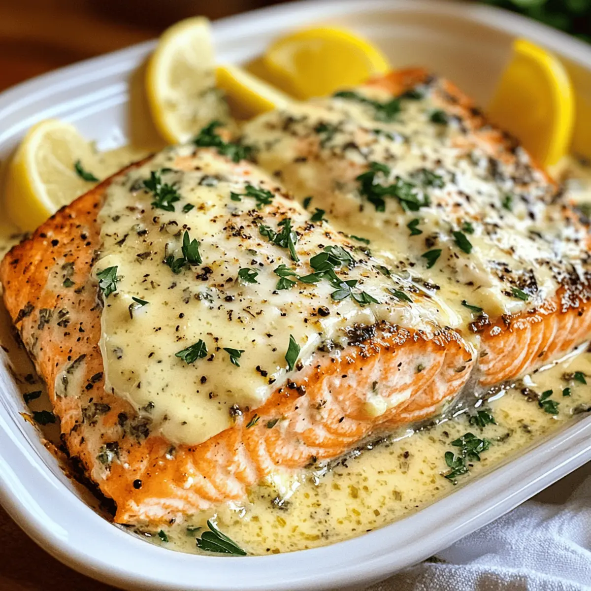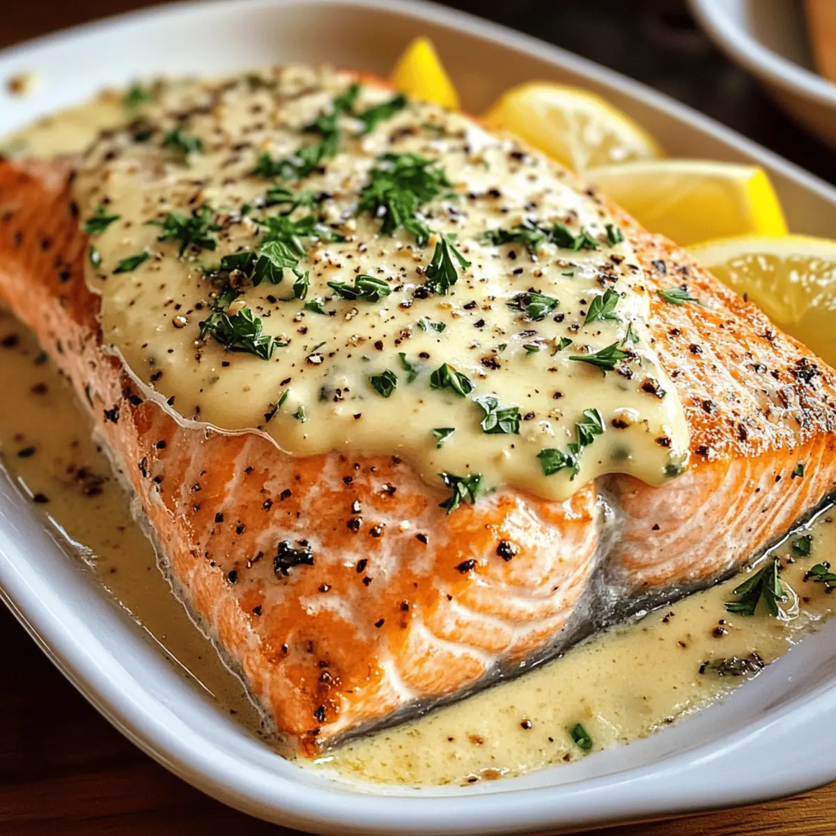 6. Lass den Lachs für 2 Minuten ruhen, garniere mit frischer Petersilie und serviere Zitronenschnitze dazu.