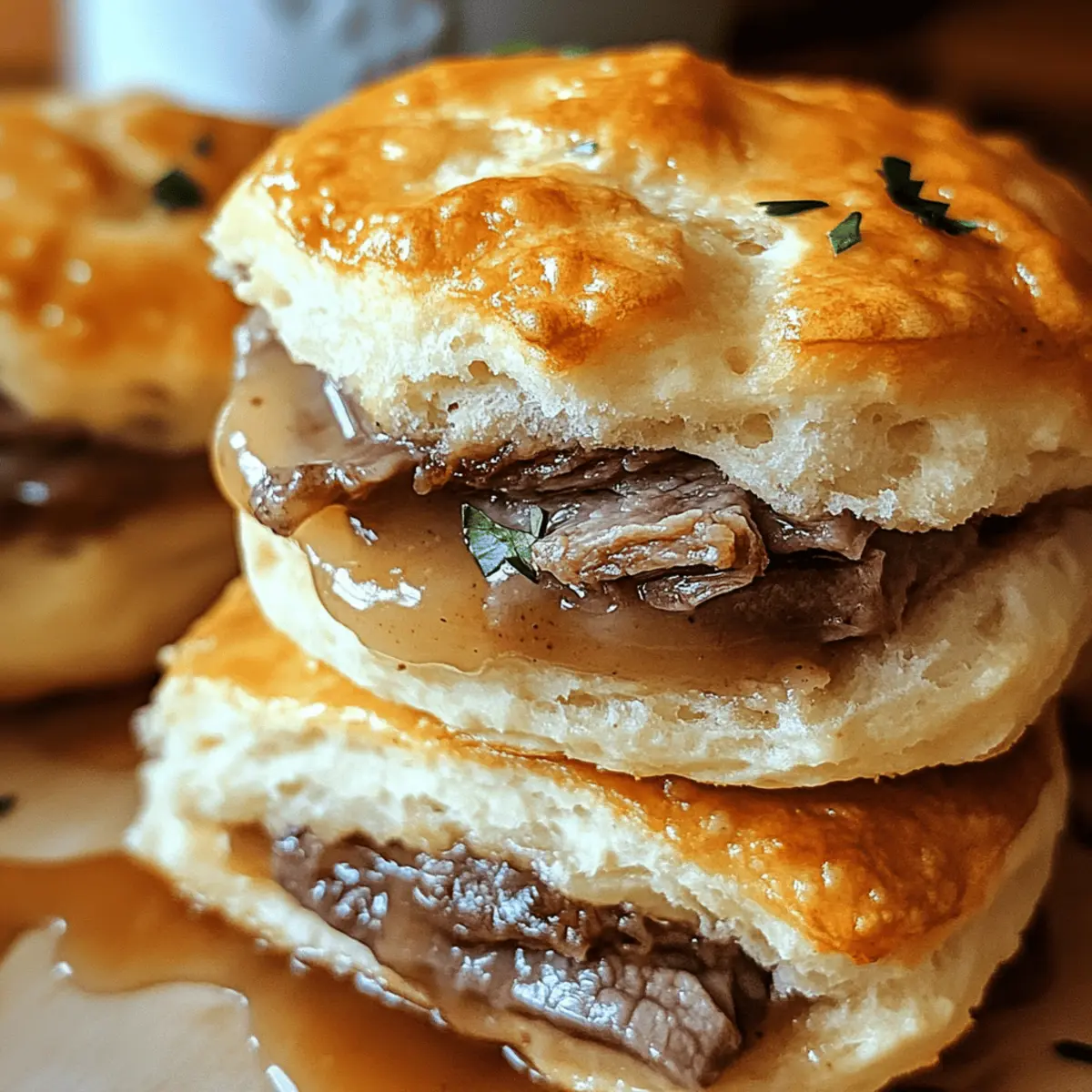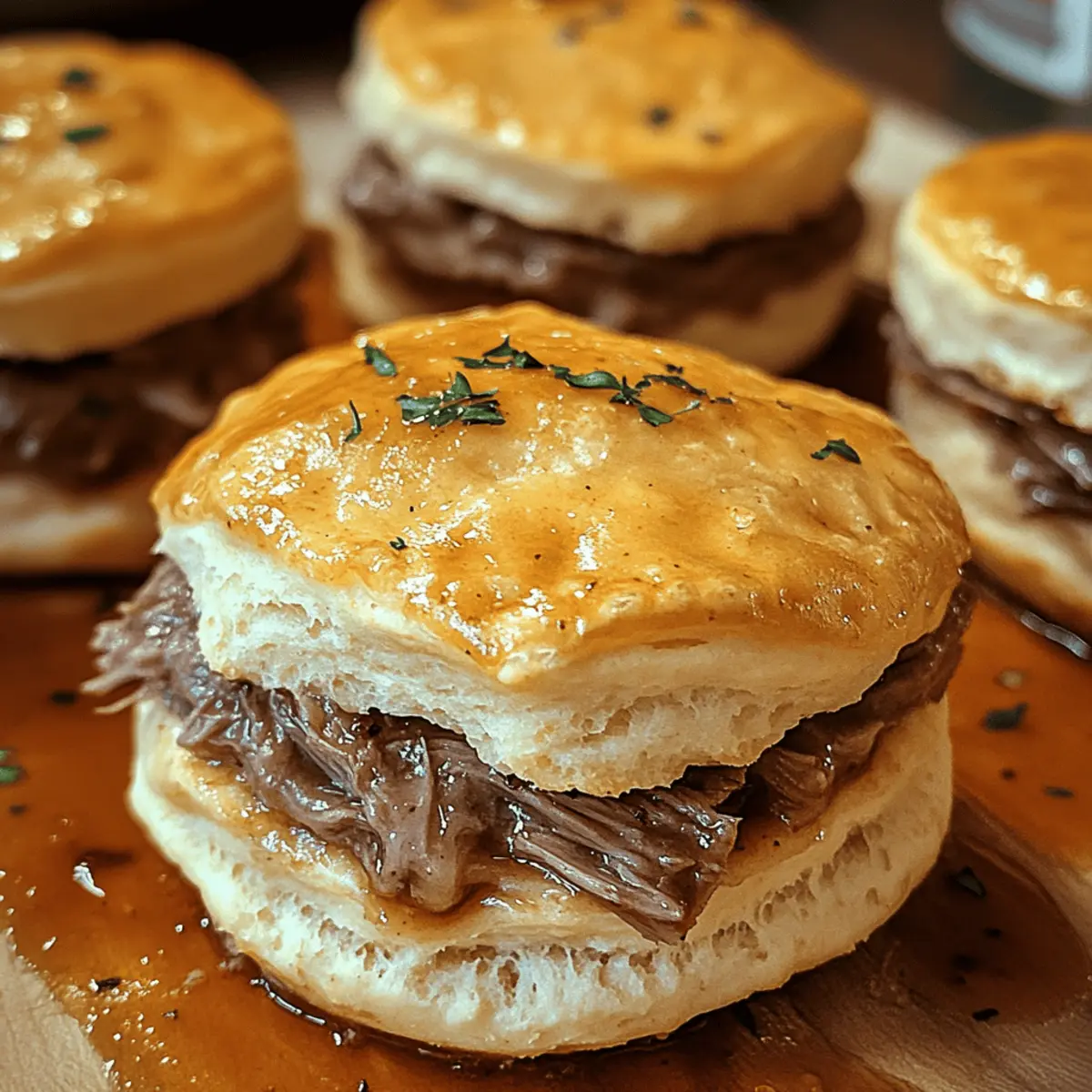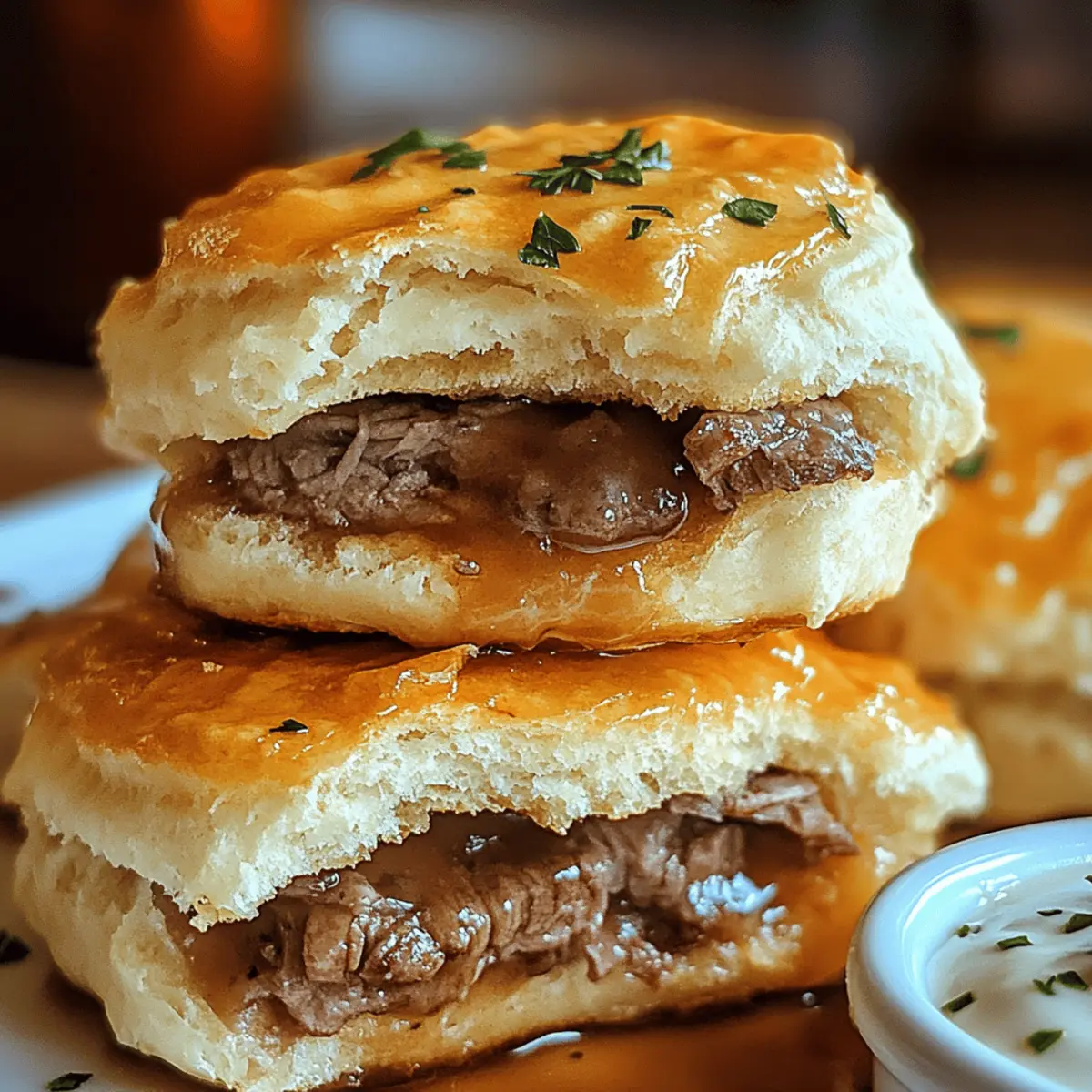 Wenn ich an die perfekte Kombination aus Komfort und Geschmack denke, fallen mir sofort die Baked French Dip Biscuits ein. Diese köstliche, handliche Variante des klassischen French Dip Sandwiches ist der ideale Begleiter für gesellige Abende oder schnelle Familienessen. Mit zartem Roastbeef, schmelzendem Provolone-Käse und dem knusprigen Teig aus Hörnchenrollen sind sie nicht nur super einfach zuzubereiten, sondern bieten auch eine erstaunliche Vielseitigkeit – von Optionen für verschiedene Fleisch- und Käsesorten bis hin zu aufregenden zusätzlichen Zutaten. Diese Rezept wird garantiert zum neuen Favoriten in deiner Küche! Und sag mal, welche Füllungen würdest du als erstes ausprobieren? Warum sind diese Biscuits ein Genuss? Vielseitigkeit: Du kannst die Füllungen ganz nach deinem Geschmack anpassen, von zartem Hähnchen bis zu würzigem Steak. Schnell und einfach: Mit nur wenigen Zutaten und minimalem Aufwand sind sie perfekt für den hektischen Alltag. Aromatischer Genuss: Der warme Au Jus sorgt für eine himmlische Dip-Erfahrung, die du nicht widerstehen kannst. Familienfreundlich: Kinder und Erwachsene lieben diese kleinen Leckerbissen gleichermaßen. Probiere auch die Mango Sago Dessert für einen süßen Abschluss! Baked French Dip Biscuit Zutaten Hier findest du alles, was du für diese köstlichen gebackenen French Dip Biscuits benötigst! Für den Teig • Hörnchenrollenteig – sorgt für eine fluffige und knusprige Textur, kann alternativ durch Keks- oder Blätterteig ersetzt werden. Für die Füllung • Delikatessen Roastbeef – liefert einen herzhaften Geschmack, alternativ eignet sich auch zerrupftes Brathähnchen oder Putenbrust. • Provolone Käse – schmilzt wunderbar und sorgt für eine cremige Füllung, Ersatzmöglichkeiten sind Mozzarella oder weiße Cheddar. Für den Au Jus • Rinderbrühe – sorgt für einen warmen, herzhaften Dip, optimiere deine Zeit mit fertiger oder selbstgemachter Brühe. Schritt-für-Schritt-Anleitung für Einfache gebackene French Dip Biscuits Step 1: Ofen vorheizen Heize den Ofen auf 190°C vor. Dieser erste Schritt sorgt dafür, dass deine Einfache gebackene French Dip Biscuits gleichmäßig und knusprig gebacken werden. Überprüfe mit einem Ofenthermometer, ob die richtige Temperatur erreicht ist, bevor du mit dem nächsten Schritt fortfährst. Step 2: Füllung vorbereiten Nehme den Hörnchenrollenteig und rolle ihn auf einer sauberen Arbeitsfläche aus. Schneide den Teig in gleichmäßige Dreiecke und lege jeweils ein Stück Delikatessen Roastbeef und eine Scheibe Provolone Käse darauf. Wickele den Teig um die Füllung, sodass kleine Taschen entstehen, und drücke die Ränder gut zusammen, um ein Auslaufen während des Backens zu verhindern. Step 3: Backen Lege die gefüllten Teigtaschen auf ein mit Backpapier ausgelegtes Backblech. backe sie für 12 bis 15 Minuten, bis sie goldbraun und knusprig sind. Achte darauf, dass die Oberfläche schön aufgeht und eine leicht goldene Farbe annimmt, was auf die perfekte Backzeit hinweist. Step 4: Au Jus vorbereiten Während die Biscuits im Ofen sind, erhitze in einem kleinen Topf die Rinderbrühe bei mittlerer Hitze. Lasse die Brühe etwa 5 Minuten köcheln, bis sie warm ist. Dies wird der herzhaft-warme Dip sein, der perfekt zu deinen Einfache gebackene French Dip Biscuits passt. Step 5: Servieren Lass die Biscuits nach dem Backen ein paar Minuten abkühlen, bevor du sie servierst. Dies sorgt dafür, dass sie nicht zu heiß sind, während du sie mit dem warmen Au Jus servierst. Platziere die Biscuits und die Brühe schön auf einem Teller, damit jeder seine eigenen Dip-Taschen genießen kann. Expertentipps für gebackene French Dip Biscuits Teig optimal ausrollen: Stelle sicher, dass der Hörnchenrollenteig gleichmäßig ausgerollt ist, um dicke Nähte zu vermeiden. Das sorgt für ein besseres Backergebnis. Zutaten für zusätzlichen Geschmack: Ziehe in Betracht, sautierte Zwiebeln oder Pilze hinzuzufügen, um den Geschmack deiner gebackenen French Dip Biscuits zu intensivieren. Backzeit anpassen: Wenn du gefrorene Biscuits verwendest, achte darauf, die Backzeit anzupassen und die Packungsanweisungen zu befolgen, um die besten Ergebnisse zu erzielen. Variationen und Alternativen für Baked French Dip Biscuits Entdecke spannende Möglichkeiten, um diese köstlichen Biscuits nach deinem Geschmack anzupassen! Fleischalternative: Ersetze das Roastbeef durch zärtliches Hähnchen oder Putenbrust für eine leichtere Variante. Käsewechsel: Provolone kann durch geschmolzenen Mozzarella oder würzigen weißen Cheddar ersetzt werden, um den Käsegeschmack zu variieren. Würzige Note: Füge gehackte Jalapeños oder pikanter Senf hinzu, um den Biscuits eine scharfe Note zu verleihen. Die Kombination von Käse und Wärme wird dich begeistern! Vegetarische Option: Verwende gegrilltes Gemüse wie Paprika und Zucchini in Kombination mit Feta-Käse für eine fleischlose Füllung. Zusätzliche Aromen: Experimentiere mit Kräutern wie Thymian oder Rosmarin, um die Biscuits noch aromatischer zu gestalten. Eine kleine Prise verstärkt den Genuss! Würzige Füllung: Mische etwas BBQ-Sauce in die Füllung für eine rauchige Geschmacksfusion. Vor oder nach dem Backen, die Wahl liegt bei dir! Süßes Finale: Serviere die Biscuits mit einer süßen Dipp-Sauce, etwa einem klassischen Ketchup oder einer pikanten Mango-Chutney, die als toller Kontrast fungiert. Entdecke auch die köstlichen Spinat Feta Quesadillas für eine weitere kreative Füllungsoption! Was passt zu Einfache gebackene French Dip Biscuits? Genießen Sie einen vollwertigen Abend mit diesen herzhaften kleinen Leckereien, die sowohl Gaumenfreuden als auch eine einladende Atmosphäre bieten. Cremige Kartoffelpüree: Diese seidige Beilage ergänzt die krossen Biscuits perfekt und sorgt für ein harmonisches Zusammenspiel von Texturen und Aromen. Frischer Caesar-Salat: Leichte, knusprige Römersalatblätter und ein cremiges Dressing sorge