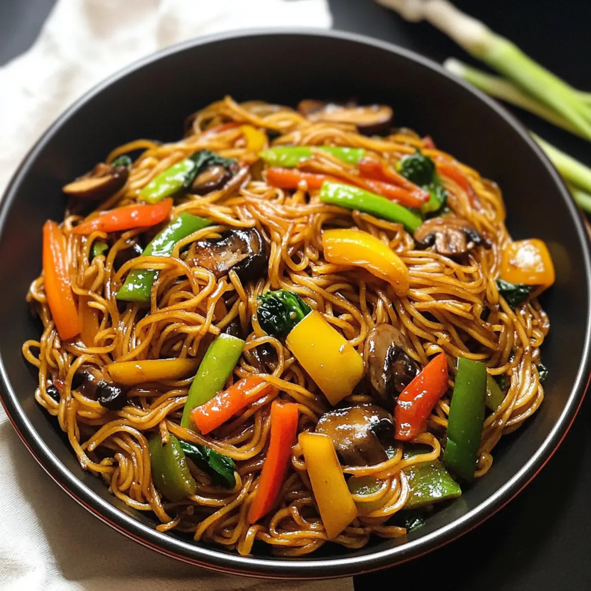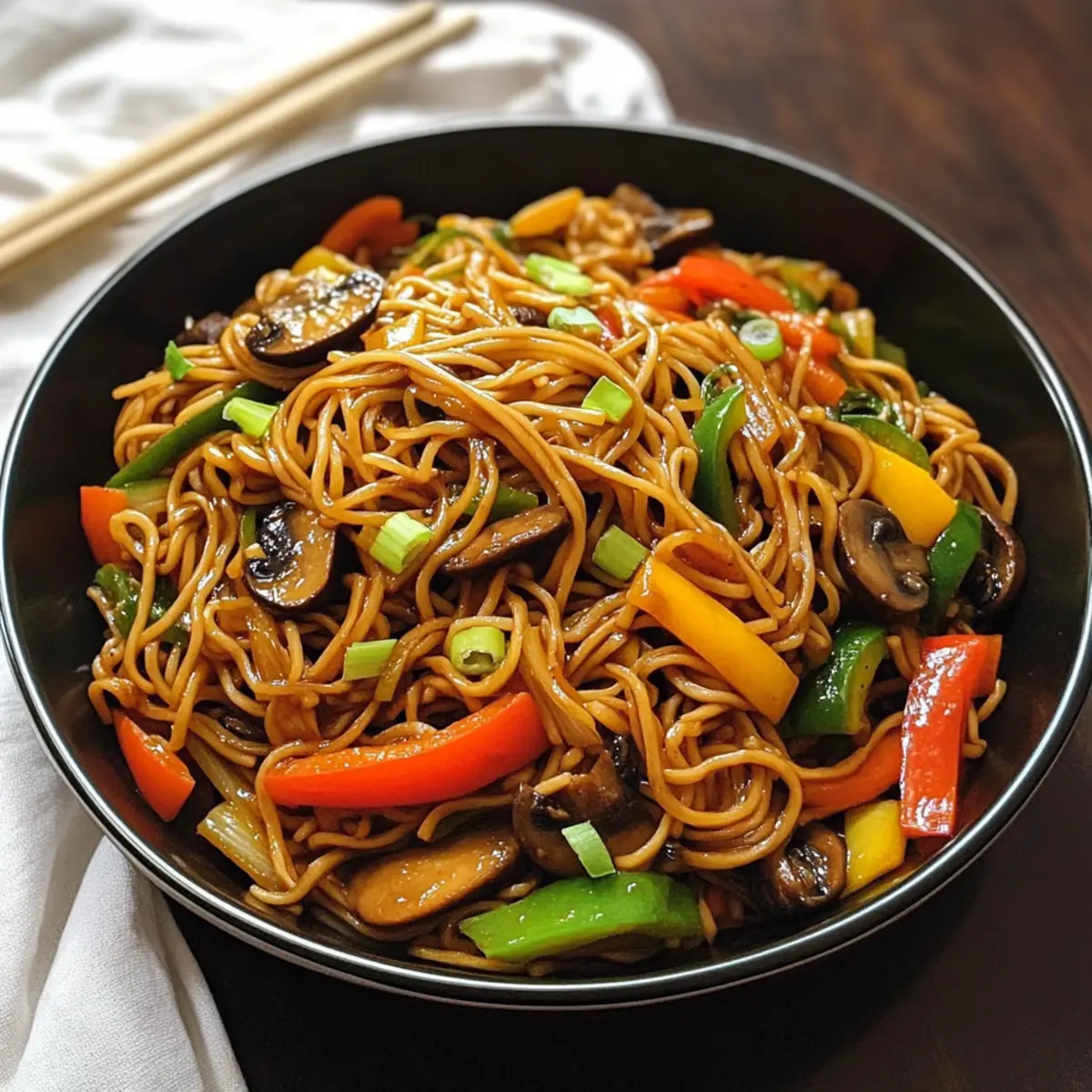 Genieße die köstlichen Beladenen Gemüsenudeln Lo Mein, die schnell zubereitet werden und ideal für eine gesunde, vegetarische Mahlzeit sind.