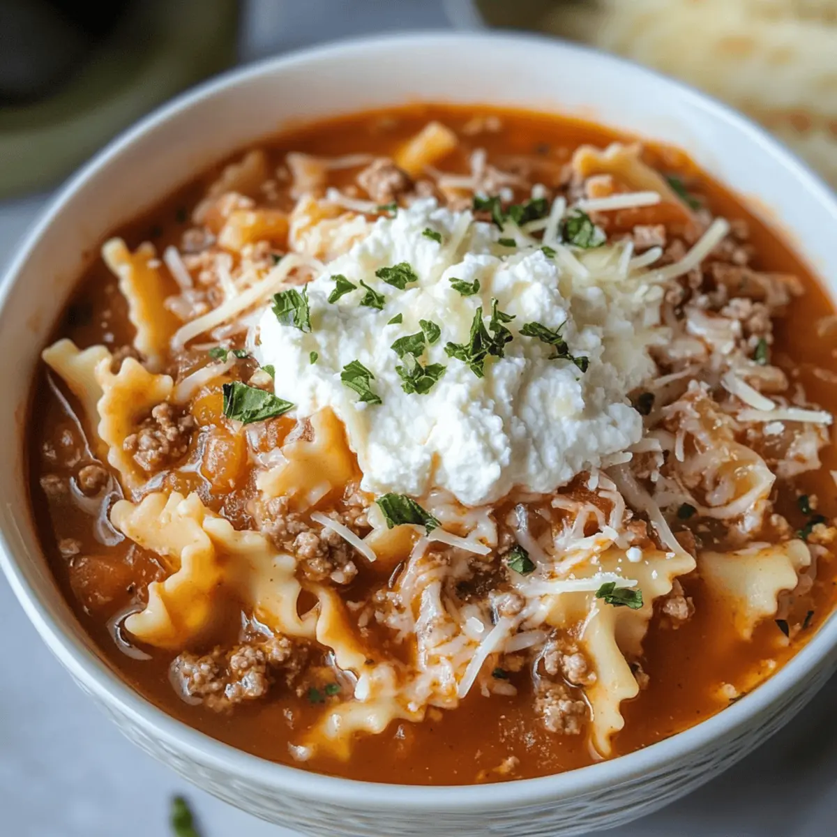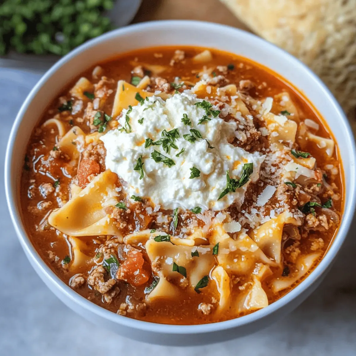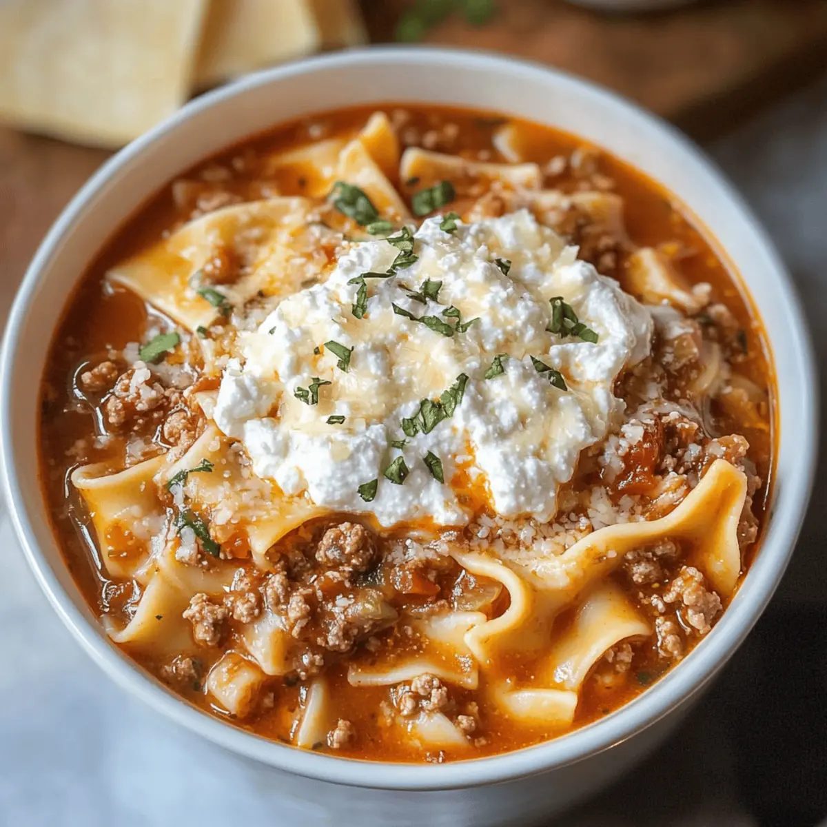 Eines Abends, während ich die Reste von einem langen Tag verdaute, wollte ich einfach nur etwas Warmes und Trostspendendes. Plötzlich kam mir die Idee: Lasagnensuppe! Diese genussvolle Fusion vereint die herzhaften, käsehaltigen Aromen traditioneller Lasagne in einer einfachen, köstlichen Ein-Topf-Mahlzeit. Perfekt für stressige Wochentage ist unsere Easy Cheesy Lasagna Soup in weniger als einer Stunde fertig. Dieses Gericht ist nicht nur schnell vorbereitet, sondern auch unglaublich anpassbar – ob mit Rinderhackfleisch, Gemüse oder einer anderen Pasta Ihrer Wahl. Wer könnte da widerstehen? Bereit, Ihre nächste Lieblingssuppe zu entdecken? Warum werden Sie diese Suppe lieben? Einfachheit: Die Zubereitung ist denkbar einfach und benötigt lediglich grundlegende Kochfähigkeiten. Wärmender Geschmack: Die Kombination aus würzigen Aromen und geschmolzenem Käse sorgt für ein unvergleichliches Geschmackserlebnis, das Herz und Seele wärmt. Anpassbare Zutaten: Ob mit Rinderhack, einer vegetarischen Alternative oder glutenfreier Pasta, diese Suppe lässt sich nach Belieben variieren. Schnell gemacht: In weniger als einer Stunde auf dem Tisch, perfekt für hektische Abende. Familienfreundliche Wahl: Diese Lasagnensuppe hat das Potenzial, zum neuen Favoriten auf der Abendessen-Tabelle zu werden – ideal für alle, die klassischen Komfort mögen! Tolle Portionsgröße: Ob für eine kleine Runde oder eine große Familie, die Suppe lässt sich einfach portionieren und ist zudem hervorragend zum Einfrieren geeignet. Zutaten für die Lasagnensuppe Für die Brühe • Olivenöl – sorgt für Geschmack und eignet sich hervorragend zum Anbraten. Alternativ können Sie Avocadoöl oder Butter verwenden. • Rinderhackfleisch – liefert reichlich Protein und einen herzhaften Geschmack; empfehlenswert ist die Verwendung von 85/15 Hackfleisch. Alternativen sind Puten- oder Hähnchenhack oder für eine vegetarische Variante Linsen. • Zwiebel (gehackt) – bringt Süße und Tiefe ins Gericht; frische Zwiebel ist besser als Pulver für hochwertigen Geschmack. • Knoblauch (gehackt) – verleiht ein aromatisches Geschmacksprofil; ca. 6 Zehen sind optimal, je nach Vorliebe anpassen. • Zerkleinerte Tomaten – bildet die Basis der Brühe; ersetzen Sie sie durch Tomatenpüree oder passierte Tomaten, vermeiden Sie jedoch Fertigsaucen wegen des hohen Salzgehalts. • Lorbeerblatt – verstärkt die Geschmacksnoten während des Kochens; vor dem Servieren entfernen. • Getrocknete Kräuter (Basilikum, Petersilie, Oregano) – bringen italienische Gewürze ins Spiel; frische Kräuter können in doppelt so großer Menge verwendet werden. • Schwarzer Pfeffer & rote Pfefferflocken – sorgen für eine pikante Note; nach Geschmack anpassen oder die roten Pfefferflocken für eine mildere Variante weglassen. • Rinderbrühe (niedriger Natriumgehalt) – sorgt für die nötige Flüssigkeit und Geschmack; Hühner- oder Gemüsebrühe sind ebenfalls geeignet. • Wasser – ergänzt die Brühe zur gewünschten Konsistenz; nach Wunsch anpassen. • Pasta (Reginetti oder gebrochene Lasagneblätter) – bildet das Herzstück des Gerichts; etwas kürzer garen, um ein Überkochen zu vermeiden. Alternativ können Sie auch Mafaldini oder Farfalle verwenden. • Ricotta & Parmesan – dienen als köstliche Beigabe und verleihen der Suppe Cremigkeit; können durch milchfreie Käsealternativen ersetzt oder ganz weggelassen werden für eine milchfreie Version. Schritt-für-Schritt-Anleitung für die Herzhafte Lasagna Suppe Step 1: Olivenöl erhitzen Erhitzen Sie 2 Esslöffel Olivenöl in einem großen Topf bei mittlerer bis hoher Hitze für etwa 3 Minuten, bis das Öl schimmert. Achten Sie darauf, dass das Öl nicht raucht, da dies den Geschmack beeinträchtigt. Ein schwerer Topf eignet sich ideal für gleichmäßige Wärmeverteilung. Step 2: Rinderhackfleisch anbraten Fügen Sie 500 Gramm Rinderhackfleisch hinzu und braten Sie es für ca. 10 Minuten an, bis es gleichmäßig gebräunt ist. Rühren Sie das Fleisch regelmäßig um, um ein Anbrennen zu verhindern. Das Fleisch sollte vollständig durchgegart sein und keine rosa Stellen mehr aufweisen. Step 3: Zwiebel und Knoblauch hinzufügen Geben Sie eine gehackte Zwiebel und 6 gehackte Knoblauchzehen in den Topf. Sautieren Sie die Mischung für 2–3 Minuten, bis die Zwiebel weich und transparent wird. Die Aromen sollten eine angenehme, aromatische Basis bilden, die die restlichen Zutaten ergänzt. Step 4: Tomaten und Gewürze einrühren Fügen Sie 800 Gramm zerkleinerte Tomaten, ein Lorbeerblatt, 1 Teelöffel getrockneten Basilikum, 1 Teelöffel getrocknete Petersilie, 1 Teelöffel Oregano, sowie Salz, schwarzen Pfeffer und rote Pfefferflocken nach Geschmack hinzu. Rühren Sie alles gut um und bringen Sie die Mischung zum Kochen. Lassen Sie die Aromen für ein paar Minuten verschmelzen. Step 5: Brühe und Wasser ergänzen Gießen Sie 4 Tassen Rinderbrühe und 2 Tassen Wasser in den Topf. Rühren Sie alles gründlich um und bringen Sie die Flüssigkeit erneut zum Kochen. Achten Sie darauf, dass die Brühe gut vermischt ist, um eine gleichmäßige Konsistenz der Lasagna Suppe zu gewährleisten. Step 6: Pasta hinzufügen Fügen Sie nun 250 Gramm Reginetti oder gebrochene Lasagneblätter hinzu. Reduzieren Sie die Hitze auf mittlere Stufe und lassen Sie die Suppe uncovered für die Hälfte der empfohlenen Kochzeit der Pasta köcheln. So wird die Pasta al dente und verhindert, dass sie matschig wird. Step 7: Zugedeckt ruhen lassen Wenn die Pasta den gewünschten Al-Dente-Zustand erreicht hat, nehmen Sie den Topf vom Herd und lassen Sie die Suppe für 5 Minuten ruhen. Diese Ruhezeit ermöglicht es der Pasta, die Aromen aufzusaugen, während die Suppe weiterhin warm bleibt. Step 8: Lorbeerblatt entfernen und servieren Entfernen Sie das Lorbeerblatt und servieren Sie die Lasagna Suppe heiß. Garnieren Sie jedes Portion mit einem Löffel Ricotta und frisch geriebenem Parmesan.