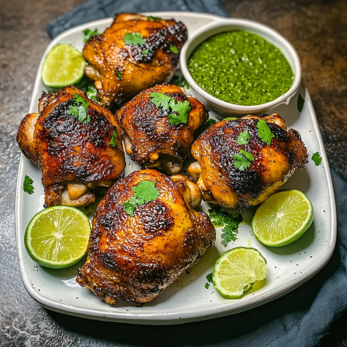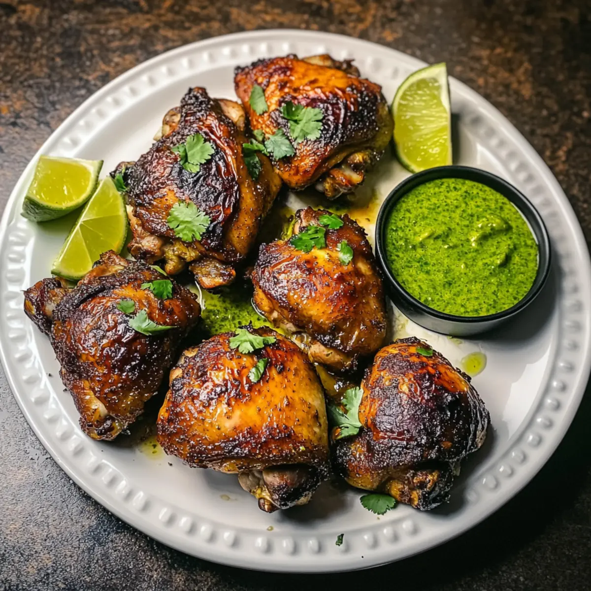 7. Serviere das krosse Brathähnchen mit der limettigen grünen Sauce und frischen Limettenvierteln.