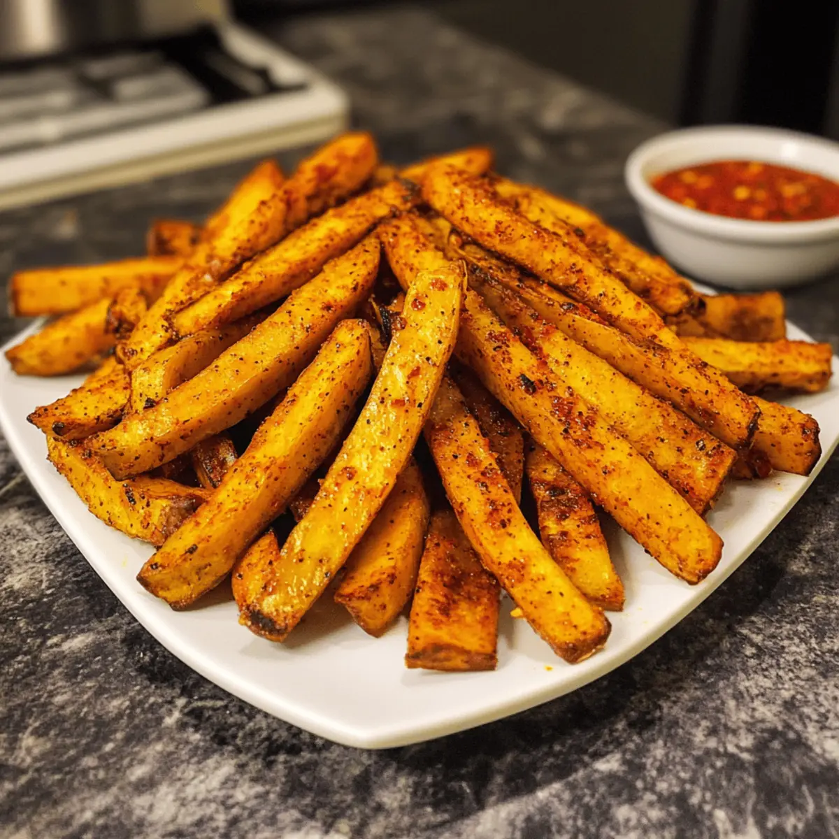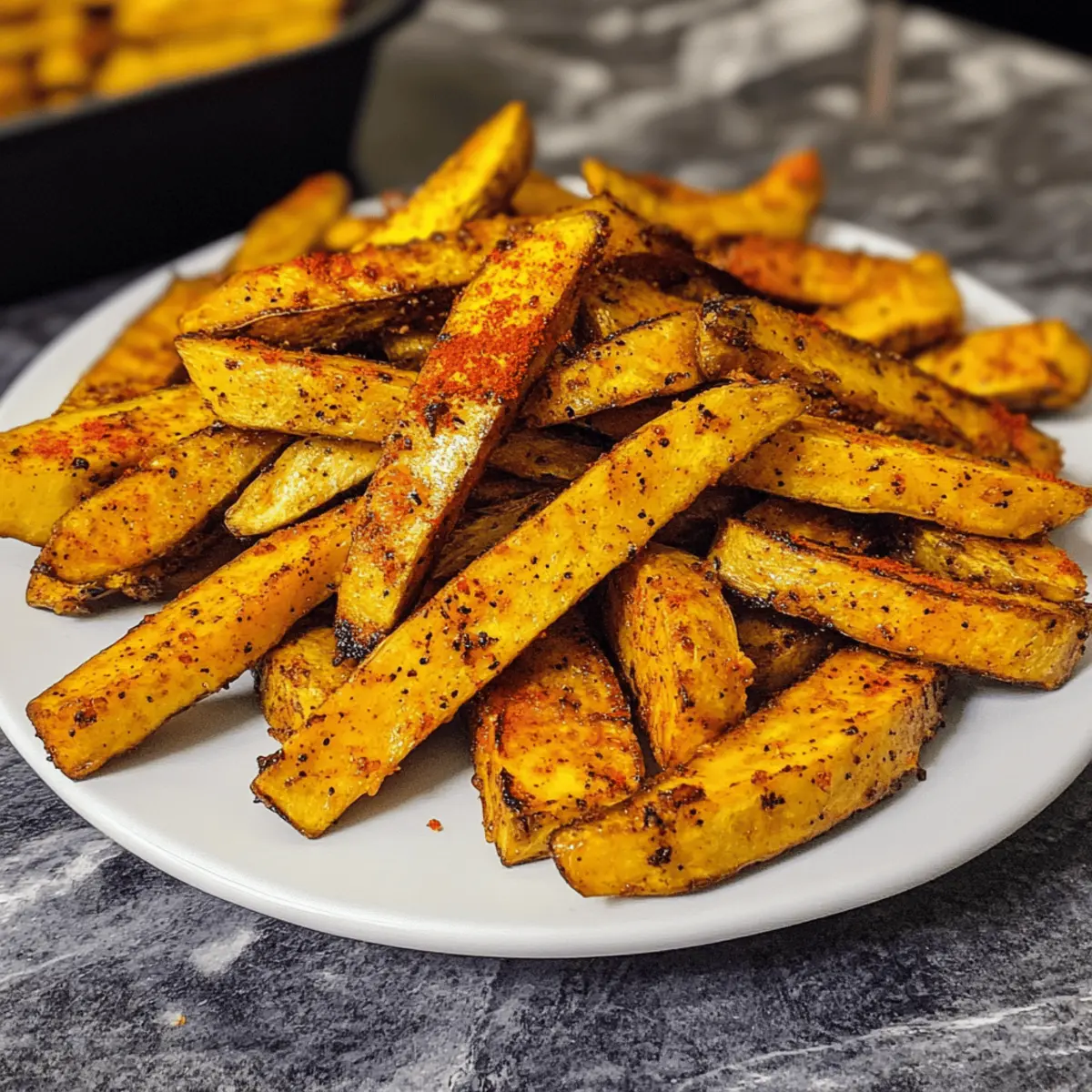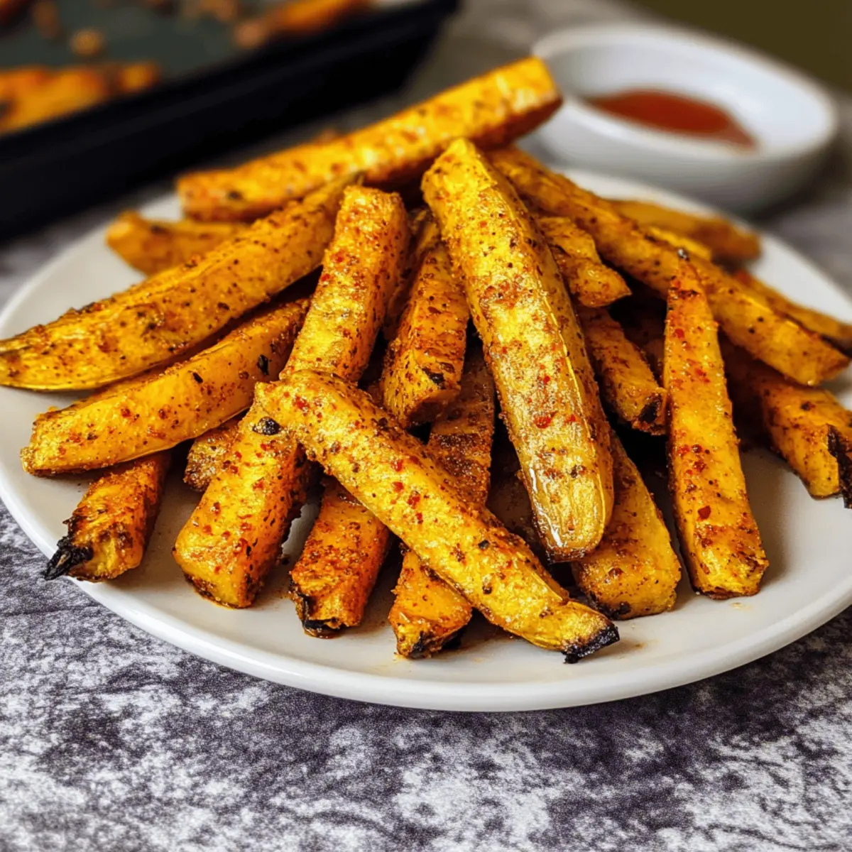 Es ist erstaunlich, wie einfach man mit den richtigen Zutaten eine kulinarische Reise antreten kann. Heute lade ich euch ein, die Welt der Cajun Plantain Fries zu entdecken—eine köstliche Abwandlung der klassischen Pommes, die durch ihre knusprige und würzige Textur begeistert. Diese frittierten Pflanzenzubereitung sind nicht nur unglaublich einfach zuzubereiten, sondern auch gesund und glutenfrei, was sie zu einem perfekten Snack oder einer Beilage für jede Mahlzeit macht. Wer kann schon einem schmackhaften Snack widerstehen, der gleichzeitig nahrhaft ist? Lasst uns gemeinsam herausfinden, wie man diese würzigen Cajun Baked Plantain Fries zubereitet und dabei das Beste aus pflanzlicher Kost herausholt. Seid ihr bereit, eure Geschmacksnerven zu verwöhnen? Warum sind diese Pommes so besonders? Einzigartiger Geschmack: Die Kombination aus Gewürzen und der natürlichen Süße der Kochbananen sorgt für ein Geschmackserlebnis, das man nicht verpassen sollte. Einfach zuzubereiten: Mit nur wenigen Schritten und grundlegenden Kochfertigkeiten könnt ihr diese köstlichen Pommes zaubern. Gesund und nahrhaft: Diese Cajun Plantain Fries sind glutenfrei und eine großartige gesunde Snack-Option, die voller Ballaststoffe steckt. Vielfältig einsetzbar: Sie passen perfekt zu verschiedenen Dips oder als Beilage zu eurem Lieblingsgericht. Vielleicht probiert ihr sie mit einer leckeren Avocado-Dip? Diese Avocado-Dip wäre eine hervorragende Wahl! Schnelles Rezept: In weniger als 30 Minuten sind diese Pommes fertig, was sie zur idealen Wahl für einen schnellen Snack oder eine gesellige Runde macht. Cajun Plantain Fries Zutaten Für die Pommes Kochbananen – Verwenden Sie große grüne Kochbananen für ein herzhaftes Geschmackserlebnis. Kokosöl – Sorgt für einen reichen Geschmack und hilft, die Pommes knusprig zu machen, kann aber durch ein neutrales Öl ersetzt werden. Zwiebelpulver – Fügt eine würzige Tiefe hinzu, kann auch durch frische Zwiebeln oder Schalotten ersetzt werden. Knoblauchpulver – Verstärkt den Geschmack durch seine aromatischen Eigenschaften; frischer, gehackter Knoblauch ist eine gute Alternative. Räucherpaprika – Verleiht ein süßes und rauchiges Geschmacksprofil; kann auch durch normale Paprika oder Chilipulver ersetzt werden. Getrockneter Oregano – Sorgt für eine erdige Note; andere getrocknete Kräuter wie Thymian oder Basilikum sind ebenfalls geeignet. Salz – Verstärkt den Geschmack; nach Belieben anpassen oder ein natriumfreies Alternativprodukt verwenden. Cayennepfeffer – Fügt Schärfe hinzu; Menge nach Geschmack anpassen oder weglassen für eine mildere Version. Schritt-für-Schritt-Anleitung für Cajun Plantain Fries Step 1: Ofen vorheizen Heizen Sie den Ofen auf 200 °C vor und legen Sie ein Backblech mit Backpapier aus. Dies gewährleistet, dass die Cajun Plantain Fries nicht anbrennen und leicht zu reinigen sind. Während der Ofen vorheizt, haben Sie genügend Zeit, um die Kochbananen vorzubereiten. Step 2: Kochbananen schneiden Schälen Sie die großen grünen Kochbananen und schneiden Sie sie in friesartige Stücke. Die Streifen sollten gleichmäßig und knapp einen Zentimeter dick sein, damit sie gleichmäßig garen. Legen Sie die pflanzlichen Streifen in eine große Schüssel, bereit für die Öl- und Gewürzmischung. Step 3: Öl hinzufügen Gießen Sie geschmolzenes Kokosöl über die geschnittenen Kochbananen und werfen Sie diese gut, bis sie gleichmäßig beschichtet sind. Diese Schritt hilft dabei, dass die Cajun Plantain Fries schön knusprig werden. Achten Sie darauf, dass alle Stücke gut mit dem Öl bedeckt sind, um ein gleichmäßiges Garen zu gewährleisten. Step 4: Gewürze vorbereiten In einer separaten Schüssel vermischen Sie Zwiebelpulver, Knoblauchpulver, räuchernde Paprika, Oregano, Salz und Cayennepfeffer. Mischen Sie alles gut, damit sich die Aromen entfalten und gleichmäßig verteilt sind. Dieser Gewürzmix wird die Cajun Plantain Fries verfeinern und ihnen die perfekte Würze geben. Step 5: Gewürze hinzufügen Streuen Sie die fertige Gewürzmischung über die mit Öl bedeckten Kochbananen und mischen Sie alles gründlich. Dadurch wird sichergestellt, dass jede Pommes optimal gewürzt ist. Die Gewürze verleihen den Cajun Plantain Fries ihren einzigartigen, scharfen und aromatischen Geschmack. Step 6: Pommes anordnen Legen Sie die gewürzten Kochbananen in einer einzigen Schicht auf das vorbereitete Backblech. Achten Sie darauf, dass sie nicht übereinanderliegen, damit die Luft zirkulieren kann und sie gleichmäßig knusprig werden. Dies ist entscheidend für das perfekte Ergebnis Ihrer Cajun Plantain Fries. Step 7: Backen Backen Sie die Cajun Plantain Fries 20 Minuten lang im vorgeheizten Ofen, indem Sie sie nach der Hälfte der Zeit einmal wenden. Sie sollten goldbraun und knusprig werden. Achten Sie darauf, dass sie nicht verbrennen, und beobachten Sie sie in den letzten Minuten des Backens aufmerksam. Step 8: Servieren Nehmen Sie die Cajun Plantain Fries aus dem Ofen und lassen Sie sie kurz abkühlen. Servieren Sie sie warm als gesunden Snack oder Beilage. Genießen Sie die knusprige Textur und den würzigen Geschmack dieses leckeren Gerichts mit Ihrem Lieblingsdip! Was passt zu Cajun Plantain Fries? Es gibt so viele köstliche Möglichkeiten, um eure Cajun Plantain Fries zu begleiten und das Geschmackserlebnis zu vervollständigen. Frischer Avocado-Dip: Dieser cremige Dip ergänzt die Würze der Pommes und bringt eine erfrischende, cremige Textur ins Spiel. Perfekt für einen geselligen Abend, während die Gewürze der Fries zum Vorschein kommen. Scharfe Mayo: Die Kombination aus würziger Mayonnaise bietet einen hervorragenden Kontrast zu den knusprigen Pommes und verleiht jedem Bissen einen scharfen Kick. So wird jeder Snack zu einem aufregenden Erlebnis! Guacamole: Die reichhaltige und cremige Guacamole harmoniert wunderbar mit den scharfen Aromen der Cajun Plantain Fries. Sie bietet eine frische Note und 
