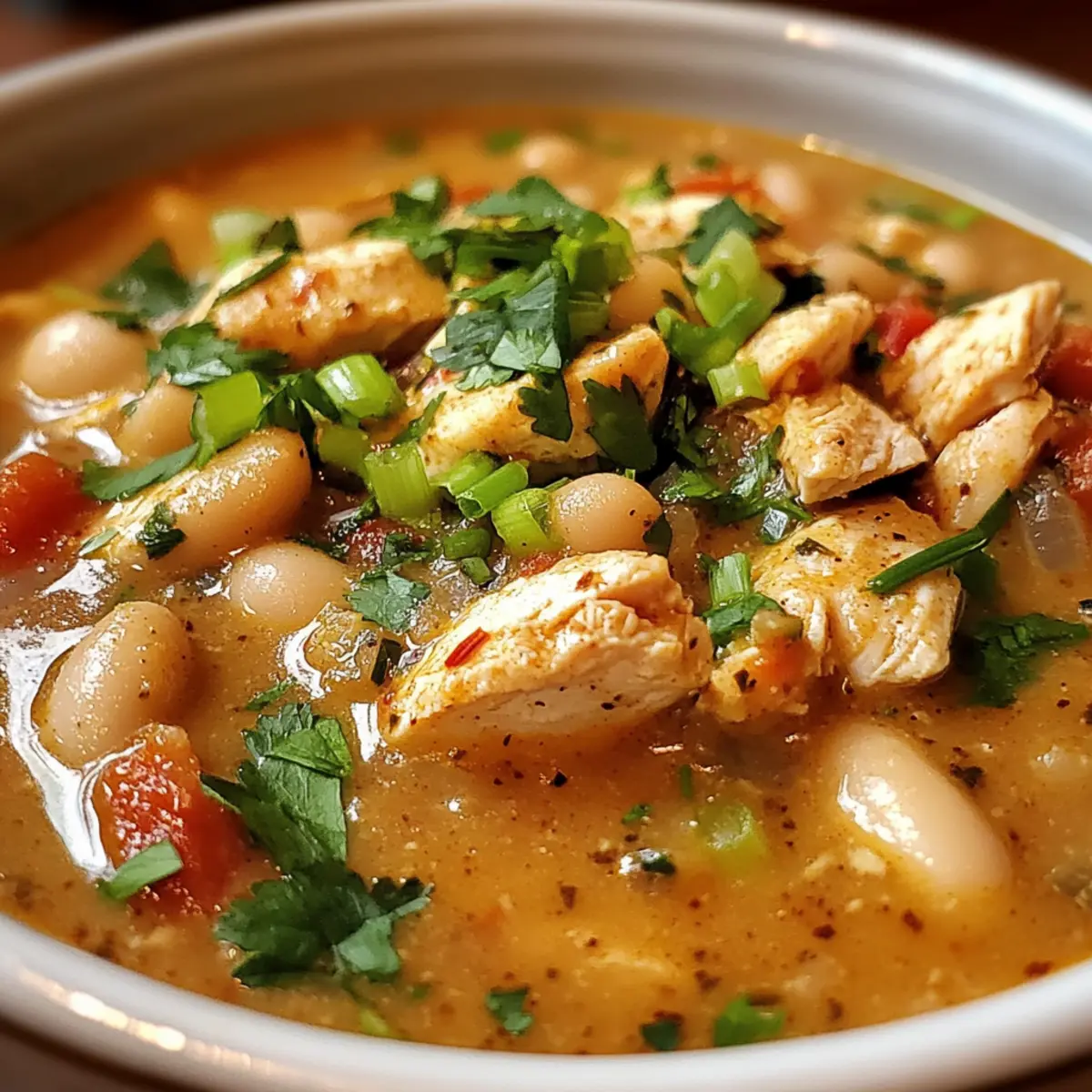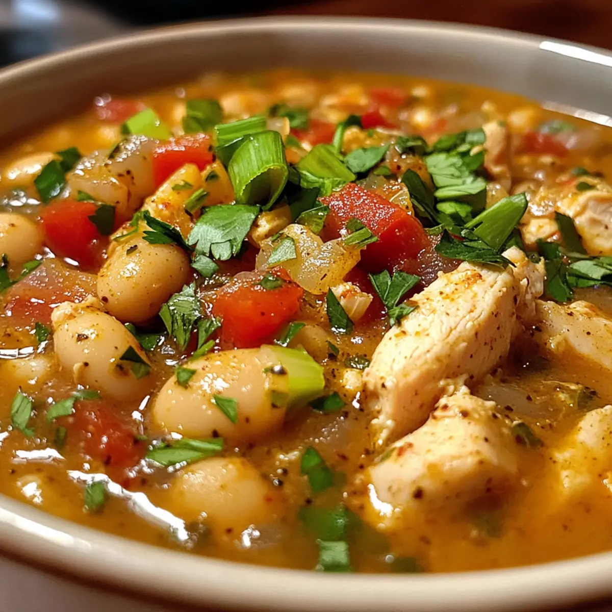 Löffeln Sie das Chili in Schalen und garnieren Sie es mit gehackten Frühlingszwiebeln und frischem Koriander oder Petersilie. Servieren Sie das Cajun Weiße Hühner-Chili sofort, um die frischen Aromen zu genießen. Diese schöne Garnitur sorgt für zusätzlichen Geschmack und Farbe auf Ihrem Teller.