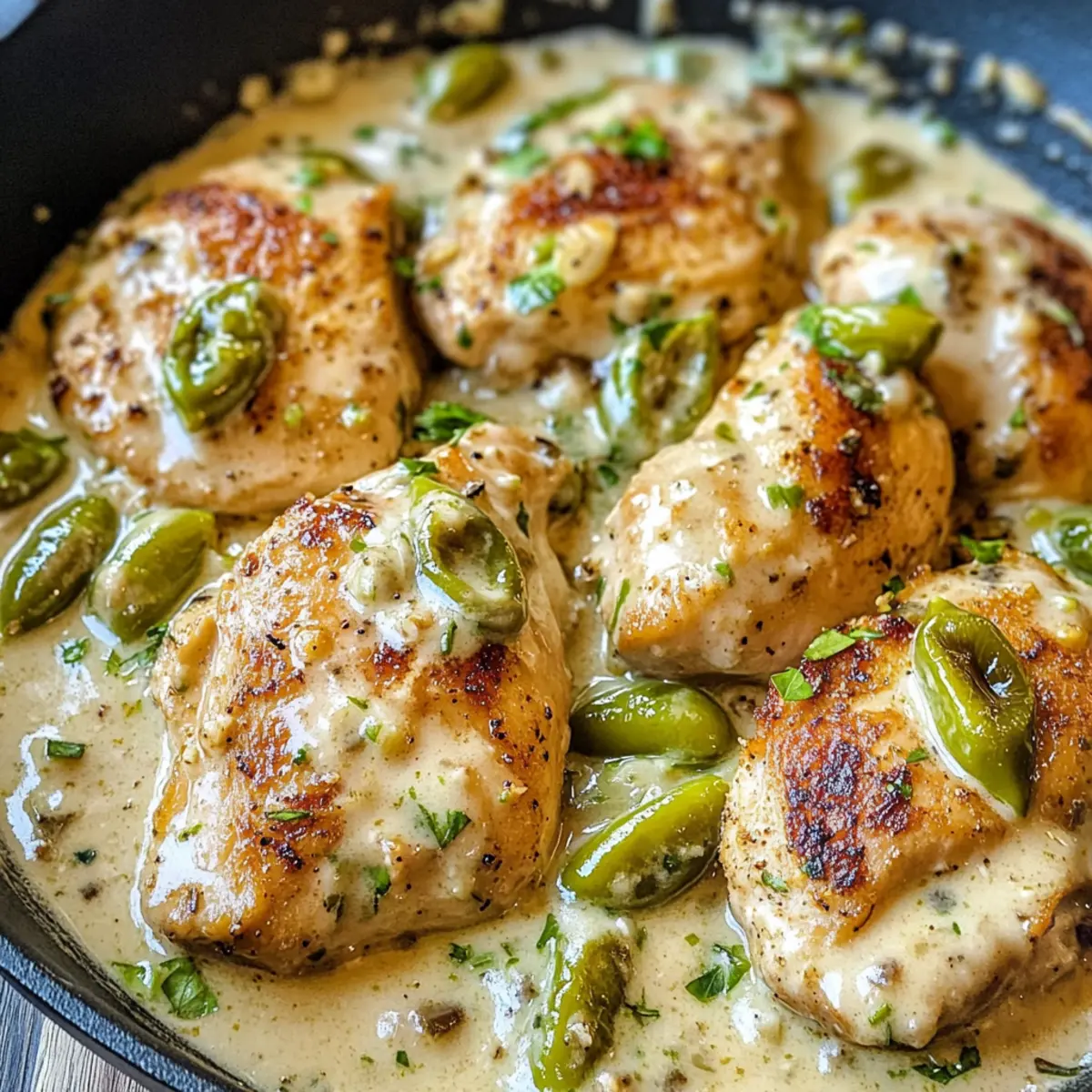 Die Cremige Pepperoncini-Hühnchen-Pfanne vereint zartes Hähnchen mit Pepperoncini und einer cremigen Sauce – perfekt für stressige Tage!
