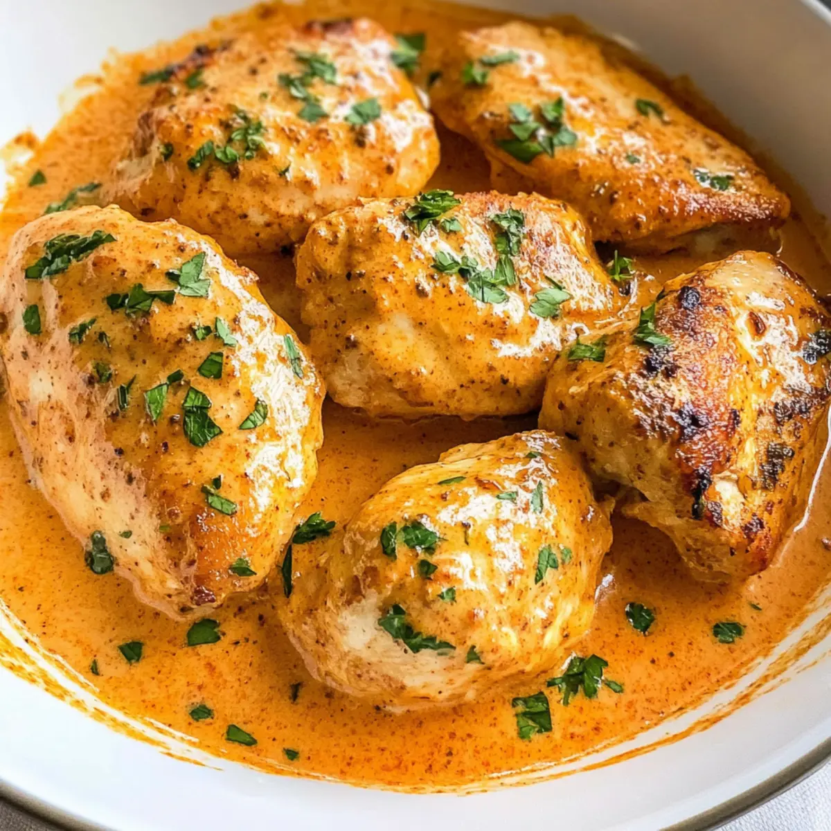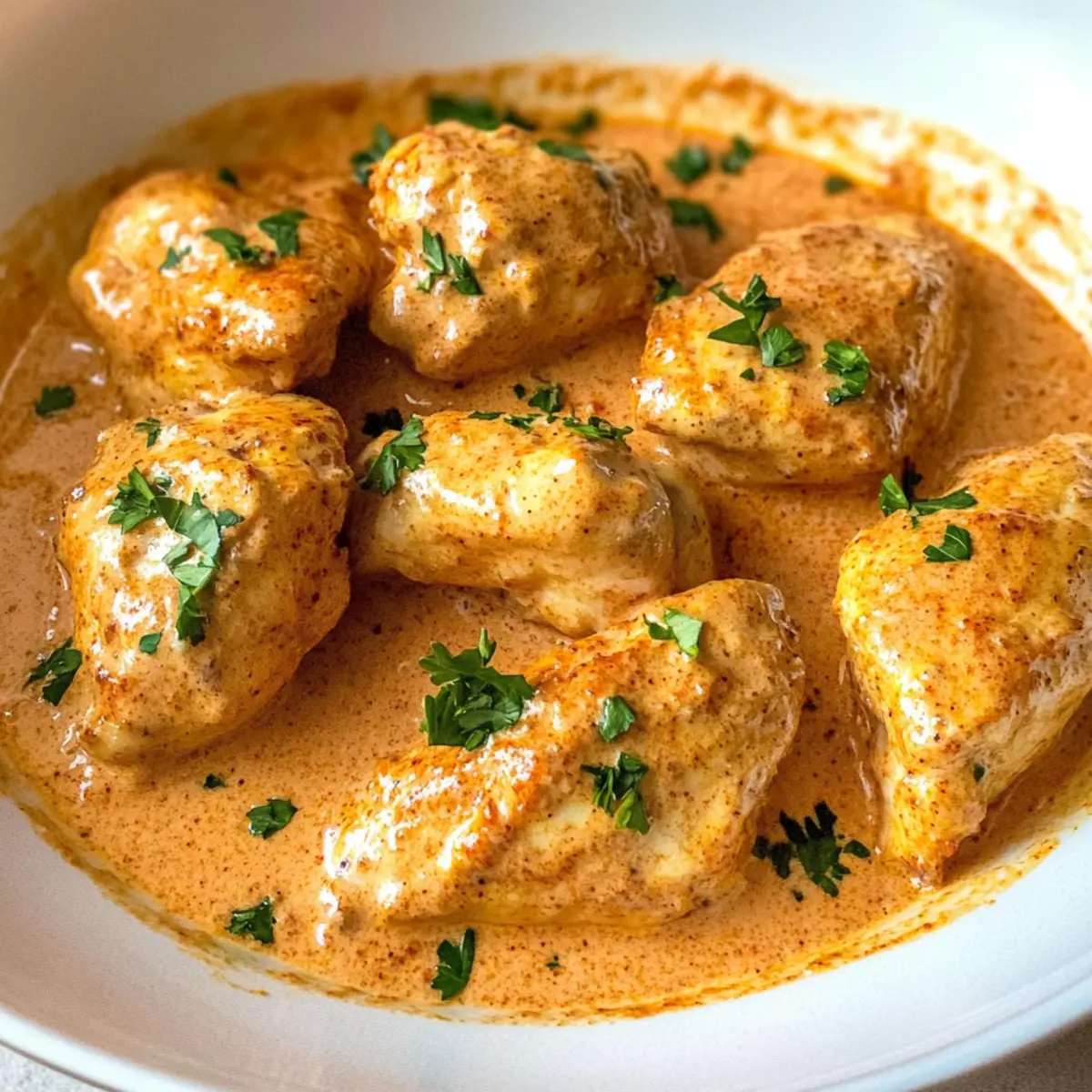 8. Nimm das cremige Paprika-Hühnchen vom Herd und serviere es heiß.