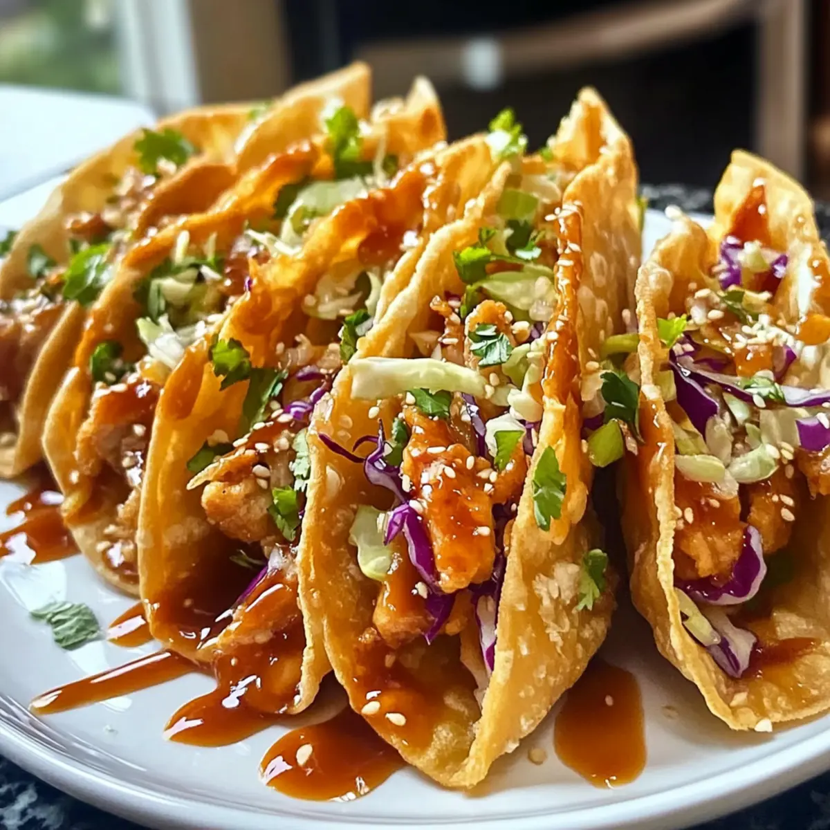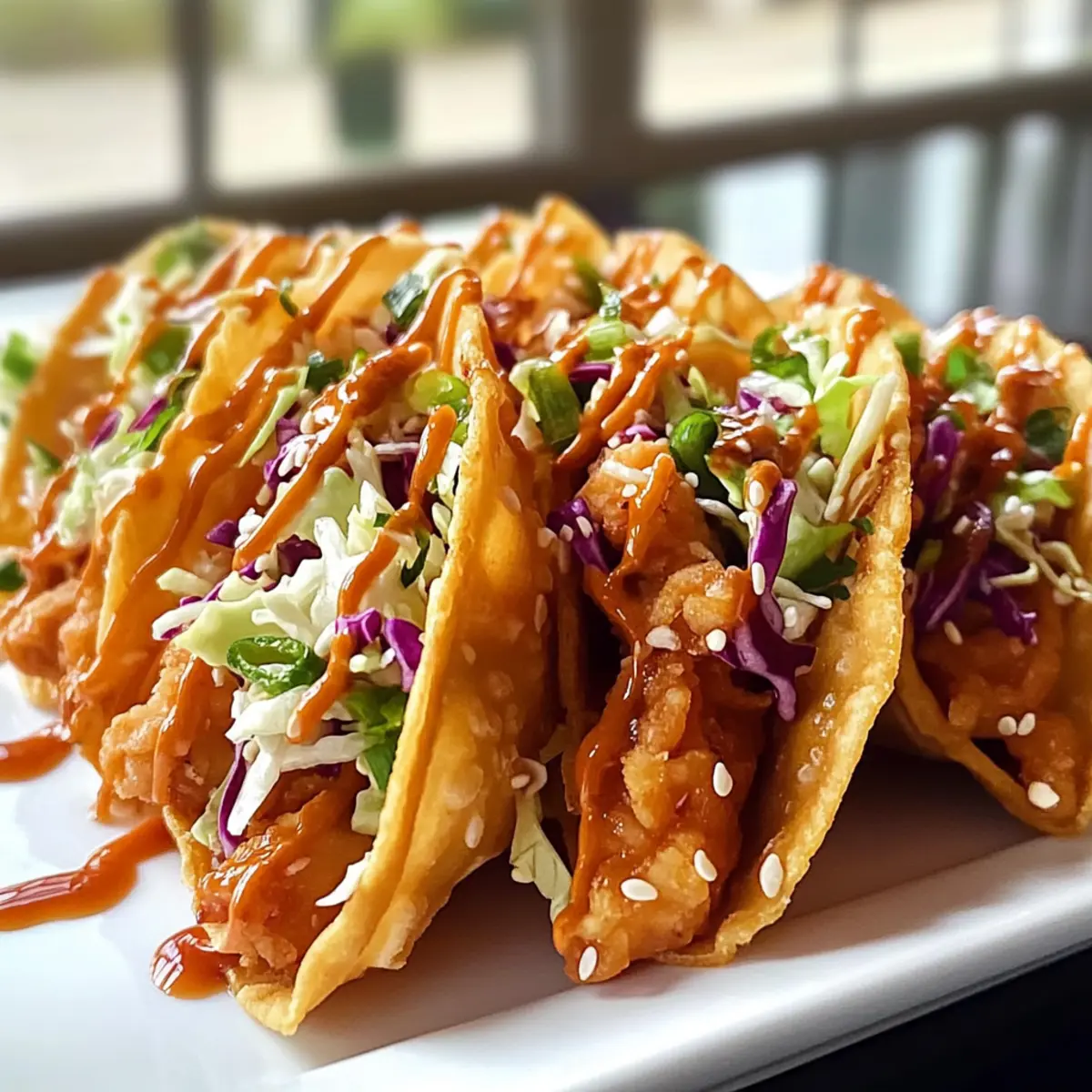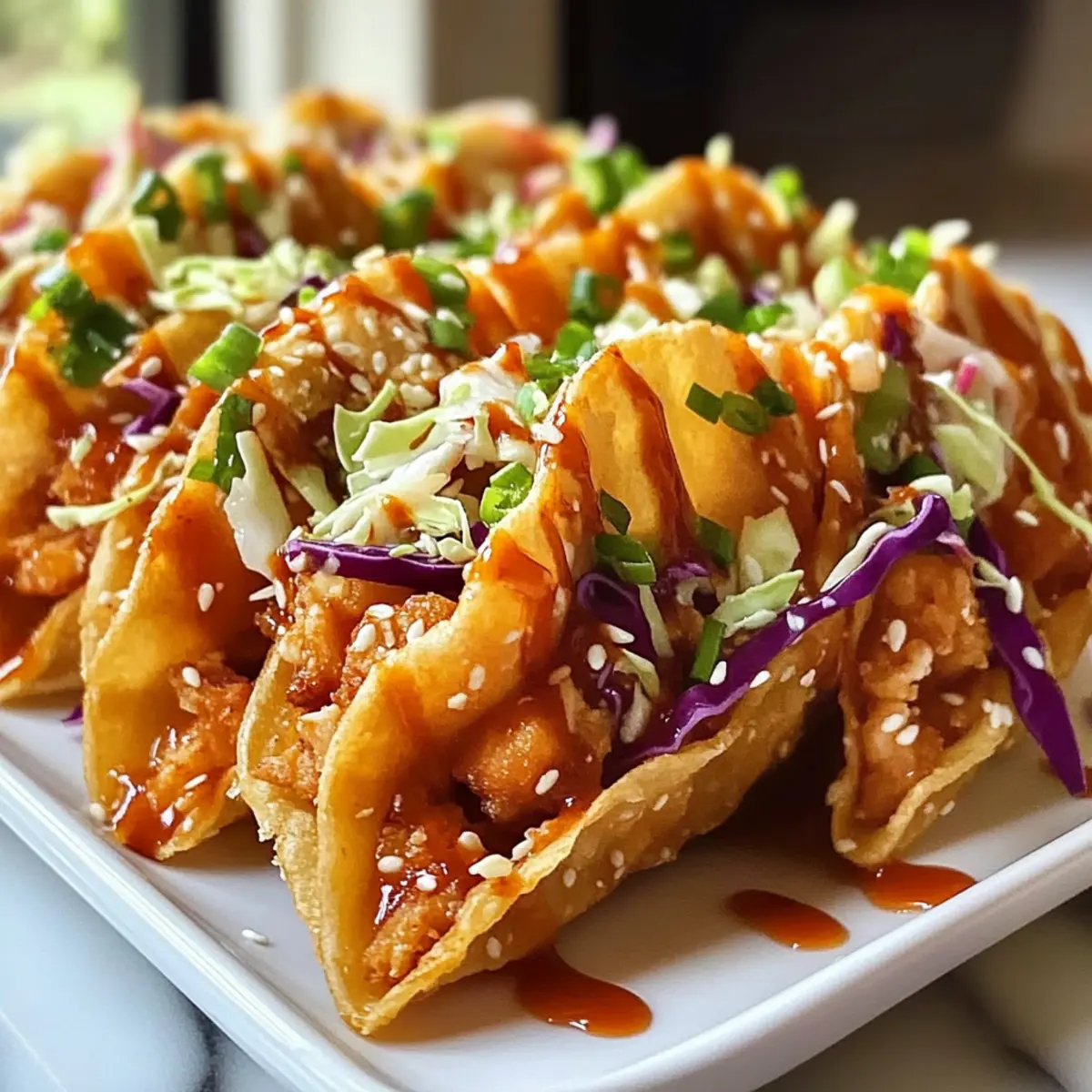 Plötzlich ertönte ein lautes Knacken, als ich die knusprigen Wonton-Wrapper in die heiße Pfanne legte. Es war der Beginn einer kleinen Geschmacksexplosion! Während ich im Eifer des Gefechts meinen Hähnchen-Teriyaki und die frischen Slaw-Zutaten zusammenstellte, wurde mir klar, dass diese Crispy Hähnchen Wonton Tacos nicht nur eine großartige Party-Appetizer sind, sondern auch in nur 25 Minuten zubereitet werden können. Der perfekte Zeitaufwand für einen aufregenden Snack oder ein schnelles Abendessen, das meine Freunde beeindrucken wird. Und das Beste? Sie sind absolut anpassbar, sodass ich auch Varianten mit Garnelen, Schweinefleisch oder sogar Tofu ausprobieren kann. Welche Variante wirst du zuerst testen? Warum werden diese Tacos dein Favorit? Einfachheit: Die Zubereitung ist so unkompliziert, dass selbst Küchenneulinge im Handumdrehen Erfolg haben. Vielseitigkeit: Du kannst mit verschiedenen Proteinen wie Garnelen oder Tofu experimentieren, um deine eigene Note hinzuzufügen. Knusprige Textur: Die Wonton-Wrapper sorgen für ein unwiderstehlich knuspriges Erlebnis, das perfekt mit der zarten Füllung harmoniert. Aromatische Aromen: Die Kombination aus Teriyaki, frischem Gemüse und einer süßen Chili-Sauce zaubert einen einzigartigen Geschmack, der deine Gäste begeistert. Schnelle Zubereitung: In nur 25 Minuten hast du eine beeindruckende Mahlzeit fertig, ideal für spontane Anlässe. Partyhit: Diese Tacos sind nicht nur lecker, sondern auch ein echter Hingucker auf jedem Buffet – sie werden bestimmt schnell verschwinden! Crispy Hähnchen Wonton Taco Zutaten • Für alle, die die besten Zutaten für Crispy Hähnchen Wonton Tacos suchen! Für das Hähnchen 2 Hähnchenbrustfilets ohne Haut – Die Hauptzutat für herzhafte Füllung, alternativ kannst du Garnelen oder Schweinefleisch verwenden. ⅓ Tasse Teriyaki-Sauce – Sorgt für süß-salzige Geschmackstiefe; homemade Teriyaki ist eine tolle Alternative. 1 EL Sesamöl (geteilt) – Verstärkt den Geschmack; klassisch ist besser als Olivenöl für authentische Gerichte. 1 EL natriumarme Sojasauce – Würzt das Hähnchen; Tamari ist eine glutenfreie Option. 2 Knoblauchzehen, fein gehackt – Bringt aromatische Tiefe in das Gericht. 1 TL frischer Ingwer, gerieben – Gibt eine angenehme, wärmende Note. Für den Slaw 2 Tassen Coleslaw-Mischung (Kohl und Karotten) – Für den extra Crunch; du kannst vorgepackte Mischungen verwenden, um Zeit zu sparen. 2 Frühlingszwiebeln, dünn geschnitten – Bringt Frische und Textur in die Füllung. 1 EL Reisessig – Hellert den Slaw und macht den Kohl zarter. 1 TL Honig – Fügt eine süße Note hinzu, die perfekt harmoniert. Für die Wonton Tacos 12 Wonton-Wrapper – Die knusprige Hülle der Tacos; kannst sie auch gesund backen für weniger Fett. 2 EL süße Chilisauce – Sorgt für einen süß-würzigen Kick; mit Sriracha für mehr Schärfe kombinierbar. 1 TL Sesamsamen – Für die Garnitur und nussigen Geschmack. 2 EL frischer Koriander, gehackt – Fügt eine frische Note als Garnitur hinzu. Genieße die Zubereitung deiner Crispy Hähnchen Wonton Tacos, bei denen jeder Biss mehr Freude bringt! Schritt-für-Schritt-Anleitung für Crispy Hähnchen Wonton Tacos Step 1: Hähnchen marinieren Schneide die Hähnchenbrust in dünne Streifen und mariniere sie in einer Schüssel mit Teriyaki-Sauce, ½ EL Sesamöl, Sojasauce, gehacktem Knoblauch und geriebenem Ingwer. Lass das Ganze für etwa 10 Minuten ziehen, damit die Aromen gut einziehen. Step 2: Hähnchen anbraten Erhitze eine große Pfanne bei mittlerer Hitze und füge das marinierte Hähnchen hinzu. Koche es für 5-7 Minuten, bis es goldbraun und durchgegart ist, und achte darauf, gelegentlich umzurühren. Du erkennst, dass das Hähnchen fertig ist, wenn es nicht mehr rosa ist. Step 3: Slaw zubereiten Während das Hähnchen brät, mische in einer Schüssel die Coleslaw-Mischung, geschnittene Frühlingszwiebeln, Reisessig und Honig. Tossiere alles gut, bis die Zutaten gleichmäßig vermischt sind. Der frische Slaw wird nach dem Mischen appetitlich knackig. Step 4: Wonton-Wrapper frittieren Erhitze in einer kleinen Pfanne genügend Öl, um die Wonton-Wrapper zu frittieren. Lege jeweils einige Wonton-Wrapper für 20-30 Sekunden in das heiße Öl und brate sie, bis sie goldbraun und knusprig sind. Anschließend auf Küchenpapier abtropfen lassen. Step 5: Tacos füllen Nimm die knusprigen Wonton-Wrapper und fülle jeden mit einer Portion des gebratenen Hähnchens, gefolgt von einer Portion des vorbereiteten Slaw. Träufle süße Chilisauce über die Füllung, um eine zusätzliche Geschmacksdimension zu verleihen. Step 6: Anrichten und servieren Garnieren die gefüllten Tacos mit Sesamsamen und frischem, gehacktem Koriander. Serviere die Crispy Hähnchen Wonton Tacos sofort, damit sie knusprig bleiben. Ideal als Snack oder als eindrucksvoller Appetizer auf jeder Feier! Variationen und Ersatzmöglichkeiten für Crispy Hähnchen Wonton Tacos Lass deiner Kreativität freien Lauf und entdecke die vielen Möglichkeiten, diese köstlichen Tacos nach deinem Geschmack zu variieren! Protein: Tausche das Hähnchen gegen Garnelen oder gewürztes Schweinefleisch aus. Diese Alternativen bringen eine aufregende Wendung in dein Gericht. Tofu: Für eine vegane Variante kannst du festen Tofu verwenden, der in Würfel geschnitten und vor dem Anbraten gedünstet wird. So bleibt das Gericht lecker und sättigend. Gemüse: Füge dem Slaw weitere Zutaten wie knackigen Sellerie oder geraspelte Rüben hinzu, um zusätzliche Frische und Farbvariationen zu schaffen. Schärfe: Wenn du es gerne scharf magst, kannst du frische Jalapeños oder Sriracha in die Füllung einarbeiten. Ein kleiner Kick wird den Geschmack verstärken! Honigersatz: Nutze Agavendicksaft anstelle von Honig für eine vegane Option im Slaw. Auch hier erhältst du die süße Note, die so gut harmoniert. Ergänzende Aromen: Experimentiere mit frischen Kräutern wie Minze oder Petersilie im S
