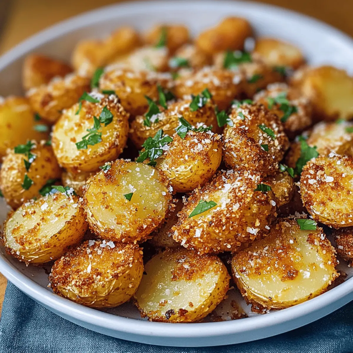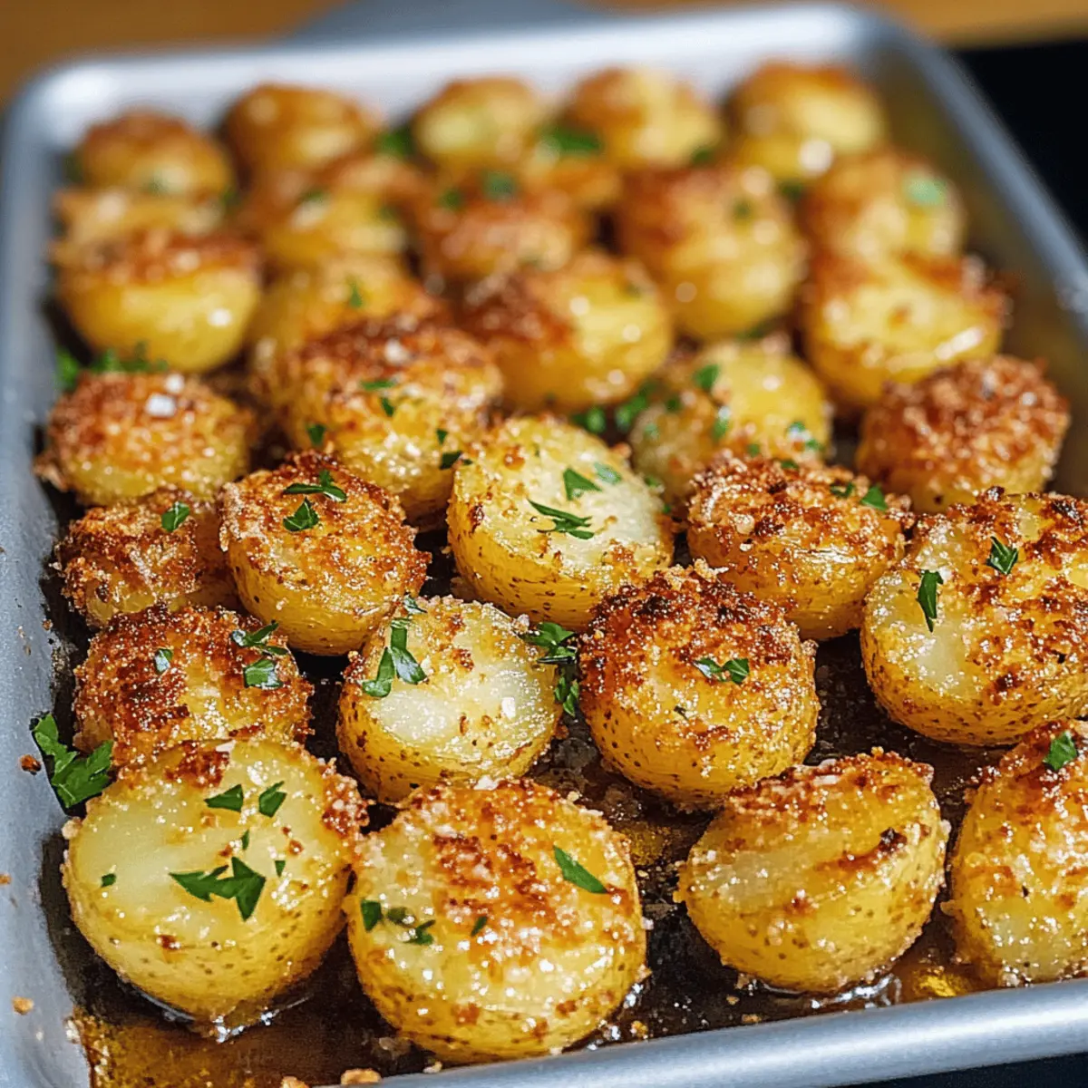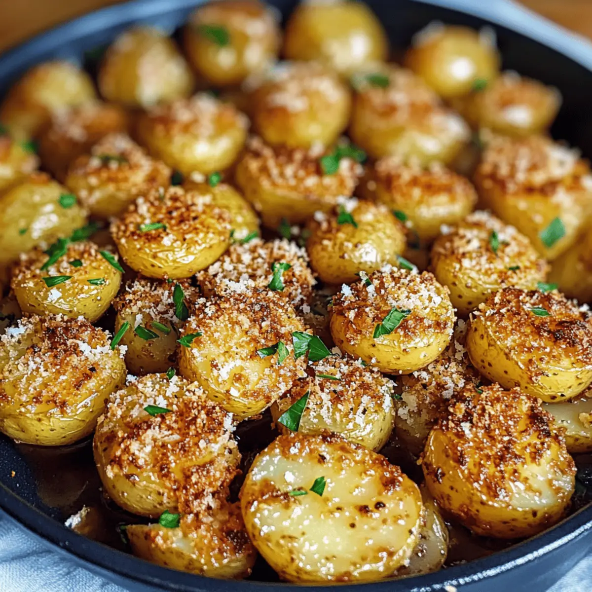 Die goldbraunen Crispy Parmesan Crusted Baby Potatoes sind der Ausgang für unvergessliche Mahlzeiten. Ob beim geselligen Abendessen oder als vielseitige Beilage zu deinem Lieblingsgericht – diese kleinen Kartoffeln sind ein echter Hingucker. Mit ihrem knusprigen Käseüberzug und der fluffigen Textur im Inneren sorgen sie für Freude am Tisch und sind dabei noch ganz einfach zuzubereiten. Ein weiterer Pluspunkt? Du kannst sie nach Herzenslust mit verschiedenen Gewürzen und Aromen anpassen, sodass sie immer wieder aufs Neue begeistern. Bist du bereit, die beste Beilage deines Lebens zu entdecken? Warum sind diese Kartoffeln so unwiderstehlich? Crispy Genuss: Die Kombination aus knuspriger Parmesan-Kruste und zarten Baby-Kartoffeln bietet ein Geschmackserlebnis, das sowohl die Sinne anspricht als auch die Seele wärmt. Einfache Zubereitung: Mit wenigen Zutaten und klaren Schritten zauberst du im Handumdrehen eine köstliche Beilage. Vielseitig Einsetzbar: Ob als Ergänzung zu einem feinen Steak oder als Snack für den Filmabend – diese Kartoffeln passen einfach überall dazu. Kreativität Ausleben: Experimentiere mit Gewürzen und variierbaren Käsesorten, um immer wieder neue Geschmackserlebnisse zu kreieren. Crowd-Pleaser: Diese Köstlichkeiten sind bei allen Gästen beliebt und sorgen für Begeisterung am Tisch. Probiere auch unser Mango Sago Rezept oder die Spinat Feta Quesadillas, um deine nächste Mahlzeit noch abwechslungsreicher zu gestalten! Zutaten für Crispy Parmesan Crusted Baby Potatoes • Lass uns diese unwiderstehlichen Kartoffeln zaubern! Für die Kartoffeln: Baby Kartoffeln – Sorgfältig gewaschen und trocken getupft, sorgen sie für die perfekte Basis. Olivenöl – Damit die Kartoffeln gleichmäßig backen und eine goldene Kruste erhalten. Für die Kruste: Geriebener Parmesan – Kreiert die charakteristische knusprige Kruste; du kannst auch Grana Padano oder Pecorino Romano verwenden. Knoblauchpulver – Fügt eine herzhafte Tiefe hinzu. Zwiebelpulver – Verstärkt den herzhaften Geschmack. Getrockneter Oregano – Gibt einen pikanten Geschmack; Thymian oder Rosmarin sind ebenfalls gute Alternativen. Paprika – Verleiht milde Schärfe und Farbe. Salz – Hebt den gesamten Geschmack hervor. Pfeffer – Für ein wenig Wärme. Zum Garnieren: Frische Petersilie – Bringt Farbe und Frische auf den Teller. Diese knusprigen Parmesan-Crusted Baby Potatoes sind nicht nur ein echter Genuss, sondern auch glutenfrei und damit für viele diätetische Vorlieben geeignet. Schritt-für-Schritt-Anleitung für Crispy Parmesan Crusted Baby Potatoes Step 1: Ofen vorheizen Heize deinen Ofen auf 200°C vor, um eine optimale Knusprigkeit zu erreichen. Während der Ofen aufheizt, kannst du dich auf die Vorbereitung der Kartoffeln konzentrieren. Ein gut vorgeheizter Ofen sorgt dafür, dass die äußere Schicht der Crispy Parmesan Crusted Baby Potatoes schön bräunt. Step 2: Kartoffeln vorbereiten Wasche die Baby-Kartoffeln gründlich und tupfe sie trocken, um überschüssige Feuchtigkeit zu entfernen. Halbiere die Kartoffeln längs und gib sie in eine große Rührschüssel. Diese Vorbereitung ist entscheidend, um sicherzustellen, dass die Kartoffeln gleichmäßig garen und ihre Textur bleibt. Step 3: Kartoffeln einölen Träufle Olivenöl über die Kartoffeln in der Schüssel und wirf alles gut um, bis die Kartoffeln gleichmäßig mit dem Öl überzogen sind. Das Olivenöl hilft, eine goldene und knusprige Kruste bei den Crispy Parmesan Crusted Baby Potatoes zu erhalten. Achte darauf, dass alle Stücke schön glänzen. Step 4: Kruste mischen In einer separaten Schüssel vermische den geriebenen Parmesan, Knoblauchpulver, Zwiebelpulver, Oregano, Paprika, Salz und Pfeffer. Diese Mischung wird den Kartoffeln ihren charakteristischen Geschmack verleihen. Streue die Gewürzmischung großzügig über die Kartoffeln und wirf alles nochmals gut um, bis jede Kartoffel gleichmäßig bedeckt ist. Step 5: Backen Lege die Kartoffeln mit der Schnittfläche nach unten auf ein mit Backpapier ausgelegtes Backblech. Achte darauf, sie gleichmäßig zu verteilen, sodass sie beim Backen nicht überlappen. Backe die Kartoffeln für 25-30 Minuten und wende sie dann einmal. Die Oberfläche sollte goldbraun und knusprig sein. Step 6: Garnieren und Servieren Lass die Kartoffeln nach dem Backen einige Minuten abkühlen, bevor du sie auf eine Servierplatte überträgst. Bestreue sie zum Schluss mit frisch gehackter Petersilie, um Farbe und Frische hinzuzufügen. Die Crispy Parmesan Crusted Baby Potatoes schmecken am besten warm und sind eine perfekte Beilage für jedes Gericht. Tipps für die besten Crispy Parmesan Crusted Baby Potatoes Vorbereitung ist alles: Stelle sicher, dass die Baby-Kartoffeln gründlich gewaschen und trocken getupft sind. So erreichst du die bestmögliche Knusprigkeit. Gleichmäßiges Einölen: Gieße das Olivenöl gleichmäßig über die Kartoffeln und vermische sie gut. Dies verhindert, dass einige Stücke trocken bleiben. Wende sie rechtzeitig: Vergiss nicht, die Kartoffeln während des Backens zu wenden, um eine gleichmäßige Bräunung und Knusprigkeit zu erzielen. Experimentiere mit Aromen: Probiere verschiedene Gewürze oder Käsesorten aus, um deinen persönlichen Twist zu den Crispy Parmesan Crusted Baby Potatoes zu bringen. Für die perfekte Resteverwertung: Heiz die übrig gebliebenen Kartoffeln im Ofen auf, um ihre Knusprigkeit zurückzugewinnen – etwa 10 Minuten bei 175°C. Bereite Zeit für deine Crispy Parmesan Crusted Baby Potatoes vor! Du kannst die Crispy Parmesan Crusted Baby Potatoes leicht im Voraus zubereiten, was dir wertvolle Zeit in der hektischen Woche spart. Bereite die Kartoffeln in bis zu 24 Stunden im Voraus vor, indem du sie waschst, schneidest und in der Öl-Gewürzmischung marinierst; bewahre sie einfach in einem luftdichten Behälter im Kühlschrank auf, um ihre Frische zu bewahren. Alternativ kannst du die Gewürzmischung ebenfalls im Voraus zubere