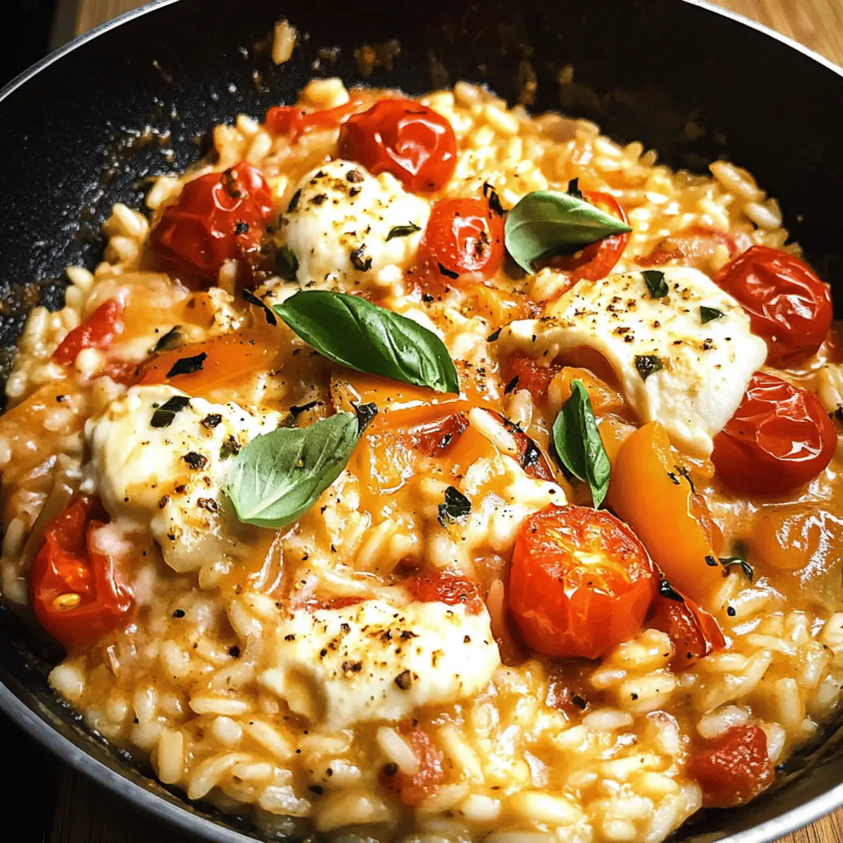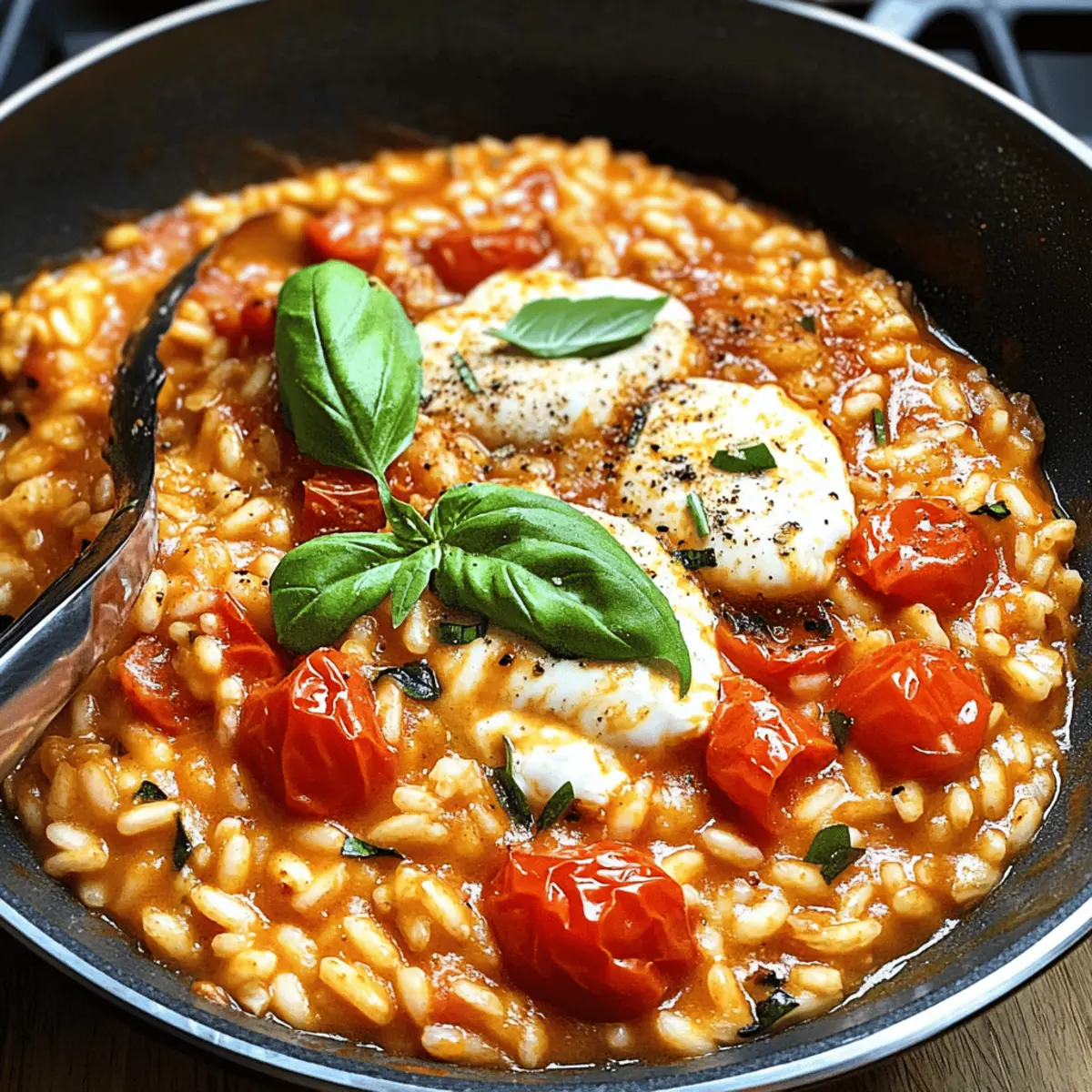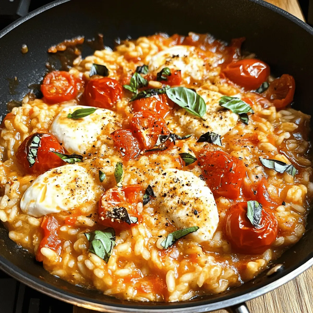 Wenn ich an schnelle, aber köstliche Abendessen denke, fällt mir sofort mein geliebtes Tomato Mozzarella Risotto ein. Dieses Gericht ist nicht nur unglaublich einfach zuzubereiten, sondern bietet auch den Komfort und die Aromen der italienischen Küche, ganz ohne großen Aufwand. Angereichert mit einer aromatischen tomatigen Sauce, schmelzender Mozzarella und saftigen Kirschtomaten ist dieses Risotto ein echter Hit, der sowohl Kinder als auch Erwachsene begeistert. Perfekt für einen hektischen Wochentag, lässt es sich in weniger als 30 Minuten auf den Tisch bringen – und bleibt dabei super gesund und vegetarisch. Neugierig geworden, wie Sie dieses cremige Wunderwerk zaubern können? Dann lassen Sie uns gemeinsam in die Welt der Aromen eintauchen! Warum sollten Sie dieses Rezept ausprobieren? Einfachheit: Die Schritte sind unkompliziert und erfordern nur grundlegende Kochkenntnisse, perfekt für jede*n! Aromenvielfalt: Die Kombination aus frischen Tomaten, aromatischen Kräutern und schmelzendem Mozzarella sorgt für einen Geschmack, der zum Verweilen einlädt. Zeitersparnis: In weniger als 30 Minuten zubereitet, ist dieses Risotto ideal für abendliche Hektik. Familienfreundlich: Kinder lieben das cremige Gefühl und die leckeren Zutaten, während Erwachsene den herzhaften Geschmack genießen. Vielfältiges Gericht: Anpassungen mit saisonalen Gemüse oder zusätzlichen Proteinen machen es zu einem immer wieder neuen Erlebnis. Stellen Sie sicher, dass Sie auch bei der Zubereitung von Beilagen oder Salaten nicht ins Hintertreffen geraten – hier sind einige leckere Ideen. Der Ausgang: Tomaten-Mozzarella-Risotto Zutaten • Neugierig auf die Zutaten für dieses cremige Risotto? Hier sind sie! Für die Basis Olivenöl – Verleiht Reichtum und hilft beim Sautieren von Schalotte und Knoblauch. Butter – Sorgt für Cremigkeit und Geschmack im Risotto. Schalotte – Ein mild-süßer Zwiebelgeschmack für die Grundwürze. Knoblauchzehen – Intensiviert das herzhafte Aroma des Gerichts. Salz – Essenziell zur Geschmacksverstärkung. Schwarzer Pfeffer – Für eine angenehme Schärfe und Tiefe. Getrockneter Basilikum – Aromatischer Geschmack, der an die italienische Küche erinnert. Getrockneter Oregano – Fügt kräftige Kräuternoten hinzu. Zerdrückte rote Pfefferflocken – Für einen Hauch von Schärfe, je nach Vorliebe anpassen. Tomatenmark – Intensiviert den Tomatengeschmack und vertieft die Farbe. Für das Risotto Risotto-Reis (Carnaroli oder Arborio) – Sorgt für die charakteristische, cremige Textur des Risottos durch Stärkelösung. Warme Hühnerbrühe (oder Gemüsebrühe) – Dient als Kochflüssigkeit und verleiht dem Reis Geschmack. Pürierte Tomaten – Fügt dem Gericht Reichtum und Feuchtigkeit hinzu. Kirschtomaten – Sorgt für Süße und Saftigkeit. Geröstete Paprika – Bereichert das Risotto mit einer süßen, rauchigen Note. Für die Verfeinerung Schlagsahne – Sorgt für zusätzliche Cremigkeit im Endgericht. Geriebener Parmesan – Fügt herzhaften Umami-Geschmack und Cremigkeit hinzu. Mozzarellakugel – Schmilzt im Risotto und sorgt für eine käsige Textur. Frische Basilikumblätter – Garnierung für Geschmack und optische Anziehungskraft. Mit diesen Zutaten können Sie ein wahrhaft köstliches Tomaten-Mozzarella-Risotto zubereiten, das alle begeistert! Schritt-für-Schritt-Anleitung für das Tomaten-Mozzarella-Risotto Step 1: Zutaten vorbereiten Zuerst müssen Sie alle Zutaten für das Tomaten-Mozzarella-Risotto vorbereiten. Schneiden Sie die Schalotte fein, hacken Sie den Knoblauch und halbieren Sie die Kirschtomaten. Bereiten Sie auch die gerösteten Paprika vor, indem Sie sie in kleine Stücke schneiden. Dies wird etwa 10 Minuten in Anspruch nehmen und sorgt dafür, dass alles schnell zur Hand ist, wenn das Kochen beginnt. Step 2: Aromaten anbraten Erhitzen Sie in einer großen Pfanne bei mittlerer Hitze 2 Esslöffel Olivenöl und 1 Esslöffel Butter. Fügen Sie die fein gehackte Schalotte und den Knoblauch hinzu und braten Sie sie für 2 Minuten, bis sie durchscheinend und aromatisch sind. Achten Sie darauf, dass der Knoblauch nicht anbrennt, da er sonst bitter wird. Step 3: Würzen Geben Sie jetzt 1 Teelöffel Salz, ½ Teelöffel schwarzen Pfeffer, 1 Teelöffel getrockneten Oregano, 1 Teelöffel getrockneten Basilikum und eine Prise zerdrückte rote Pfefferflocken in die Pfanne. Rühren Sie alles gut um, sodass sich die Gewürze gleichmäßig verteilen, und lassen Sie sie eine Minute ziehen, um die Aromen freizusetzen. Step 4: Tomatenbasis hinzufügen Fügen Sie 2 Esslöffel Tomatenmark hinzu und rühren Sie es sorgfältig unter die Aromaten, bis es gut vermischt ist. Geben Sie dann 1 Tasse Risotto-Reis dazu und rösten Sie ihn etwa 1 Minute lang, dabei ständig rühren. Der Reis sollte leicht durchsichtig werden, was den Geschmack verstärkt. Step 5: Reis kochen Gießen Sie nun nach und nach 4 Tassen warme Hühnerbrühe (oder Gemüsebrühe) in die Pfanne, je ½ Tasse auf einmal. Rühren Sie häufig um, bis die Flüssigkeit fast vollständig aufgenommen ist, und wiederholen Sie diesen Vorgang für ca. 15 Minuten, bis der Reis al dente ist. Achten Sie darauf, die Konsistenz zu überprüfen; das Risotto sollte cremig, aber nicht zu flüssig sein. Step 6: Tomaten und Paprika integrieren Nach dem Garen des Reises fügen Sie 1 Tasse pürierte Tomaten, die halbierten Kirschtomaten und die vorbereiteten gerösteten Paprika hinzu. Lassen Sie alles bei niedriger Hitze für weitere 5 Minuten köcheln, bis die Tomaten weich sind und das Risotto die richtige cremige Textur erreicht hat. Rühren Sie gelegentlich um, um ein Ankleben zu verhindern. Step 7: Gericht vollenden Nehmen Sie die Pfanne vom Herd und rühren Sie ¼ Tasse Schlagsahne, ½ Tasse geriebenen Parmesan und die restliche 1 Esslöffel Butter ein. Folden Sie die gewürfelte Mozzarella und die frischen Basilikumblätter unter das Risotto und passen Sie die Gewürze nach Geschmack an. Lassen Sie
