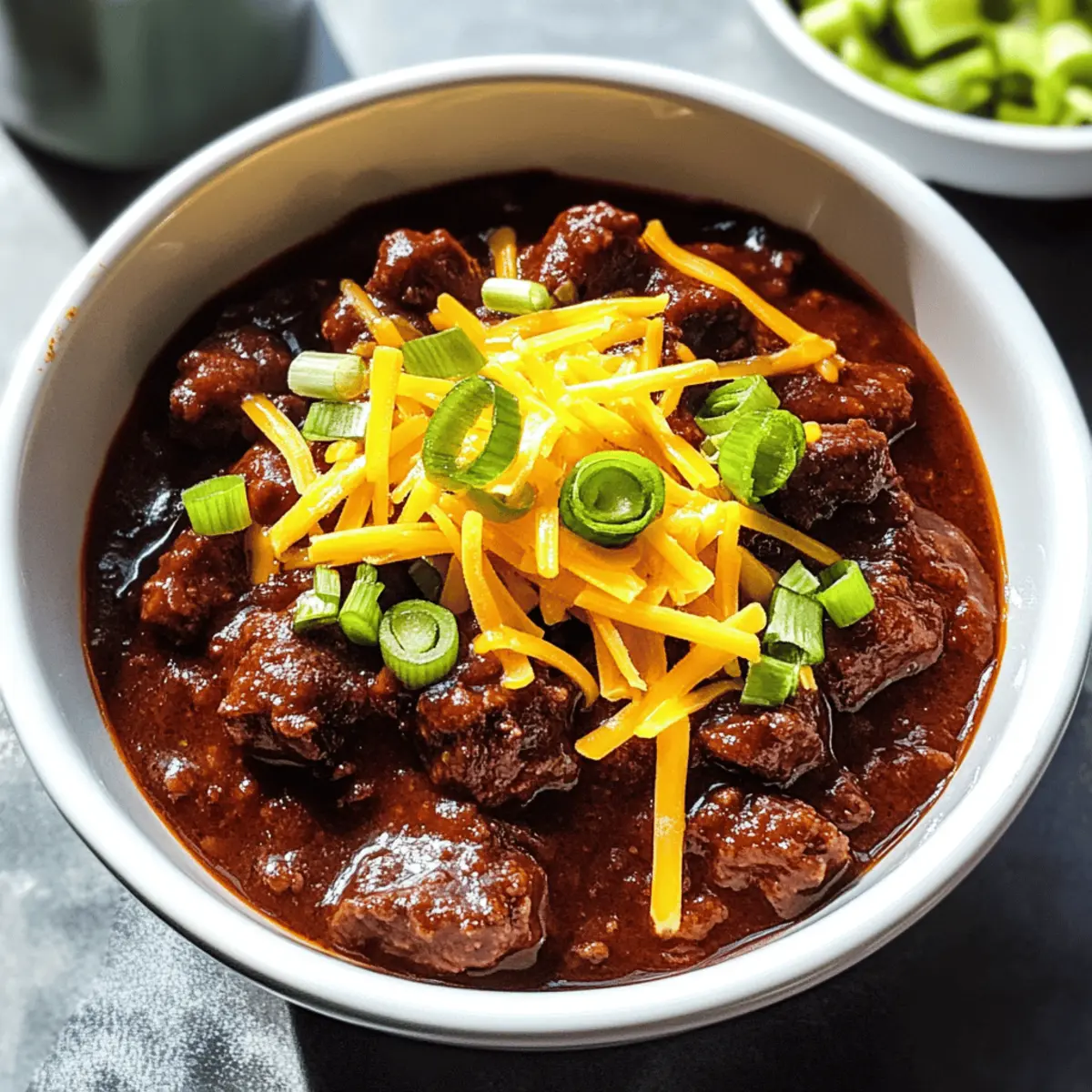 7. Sobald dein Chili fertig ist, serviere es heiß in Schalen und garniere jede Portion mit geriebenem Cheddar und geschnittenen Frühlingszwiebeln.