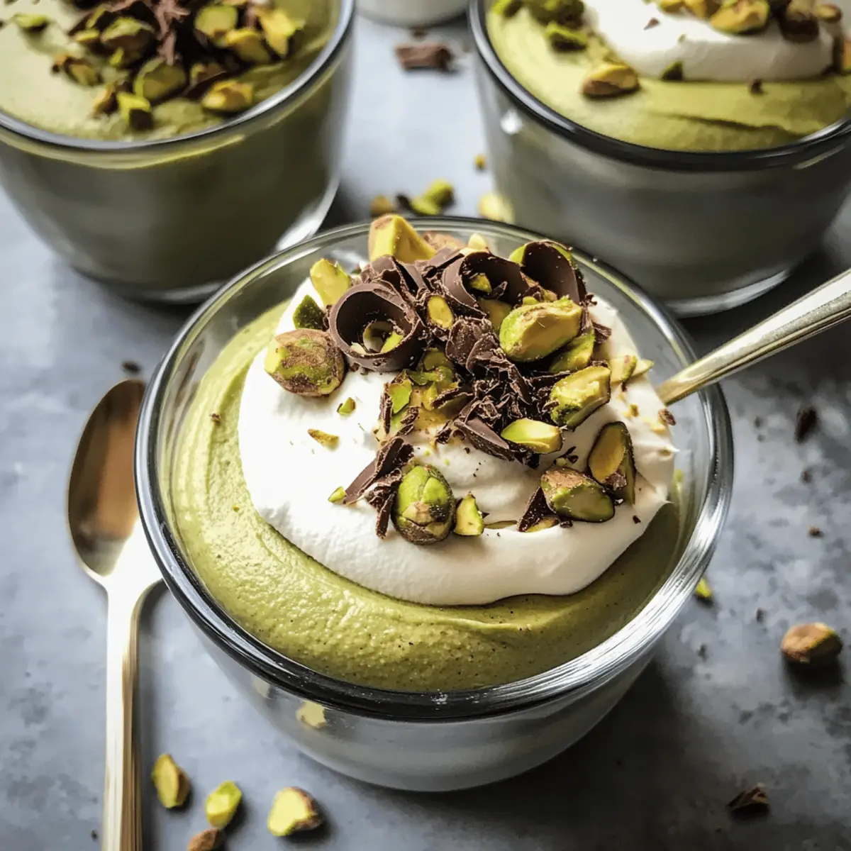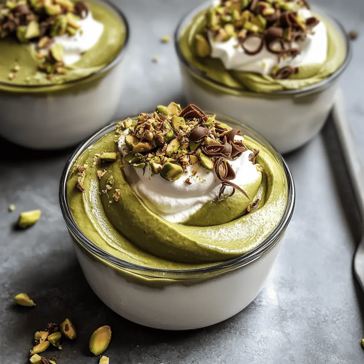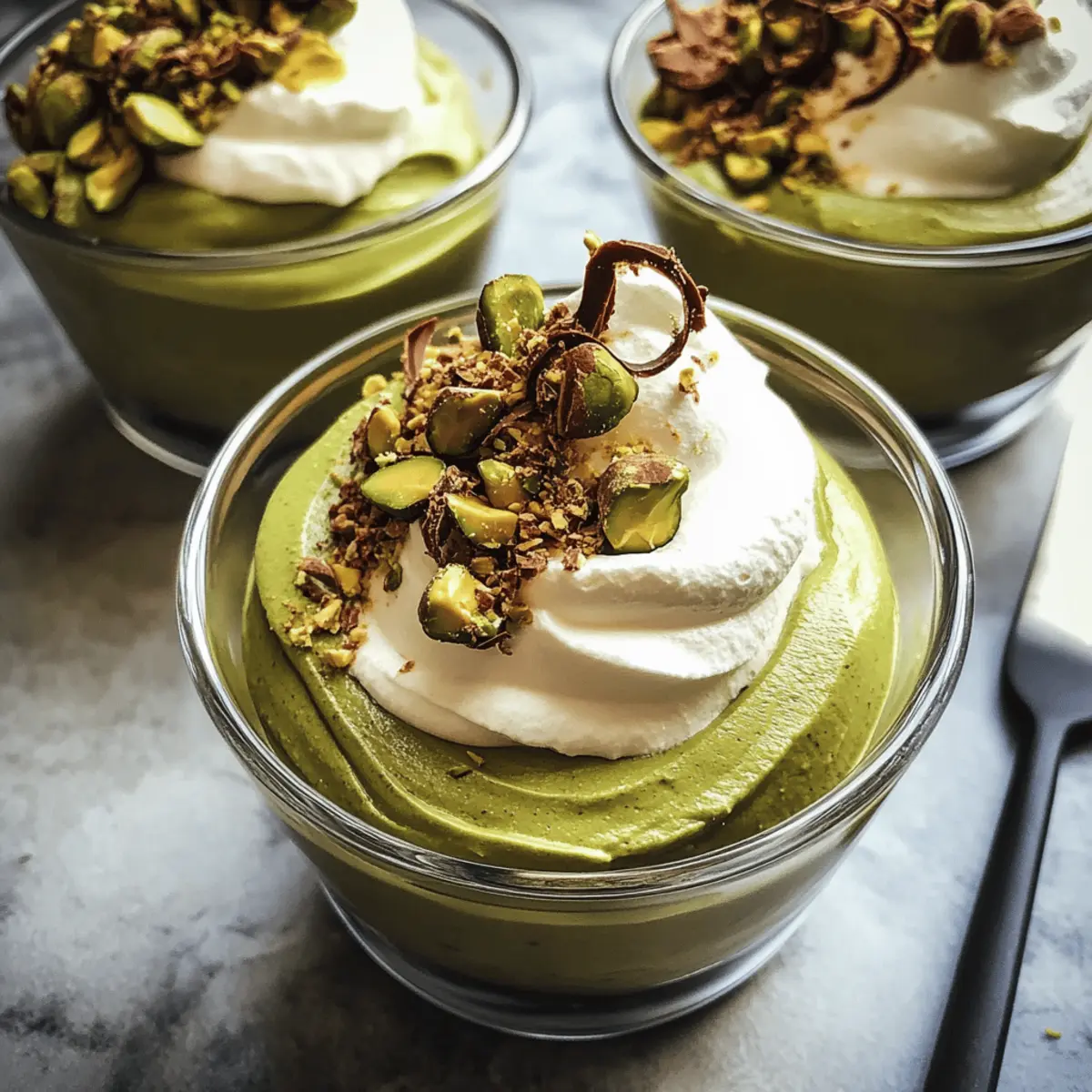 6. Garnieren Sie die Pistazienmousse mit gehackten gerösteten Pistazien und optionalen Schokoladenraspeln.