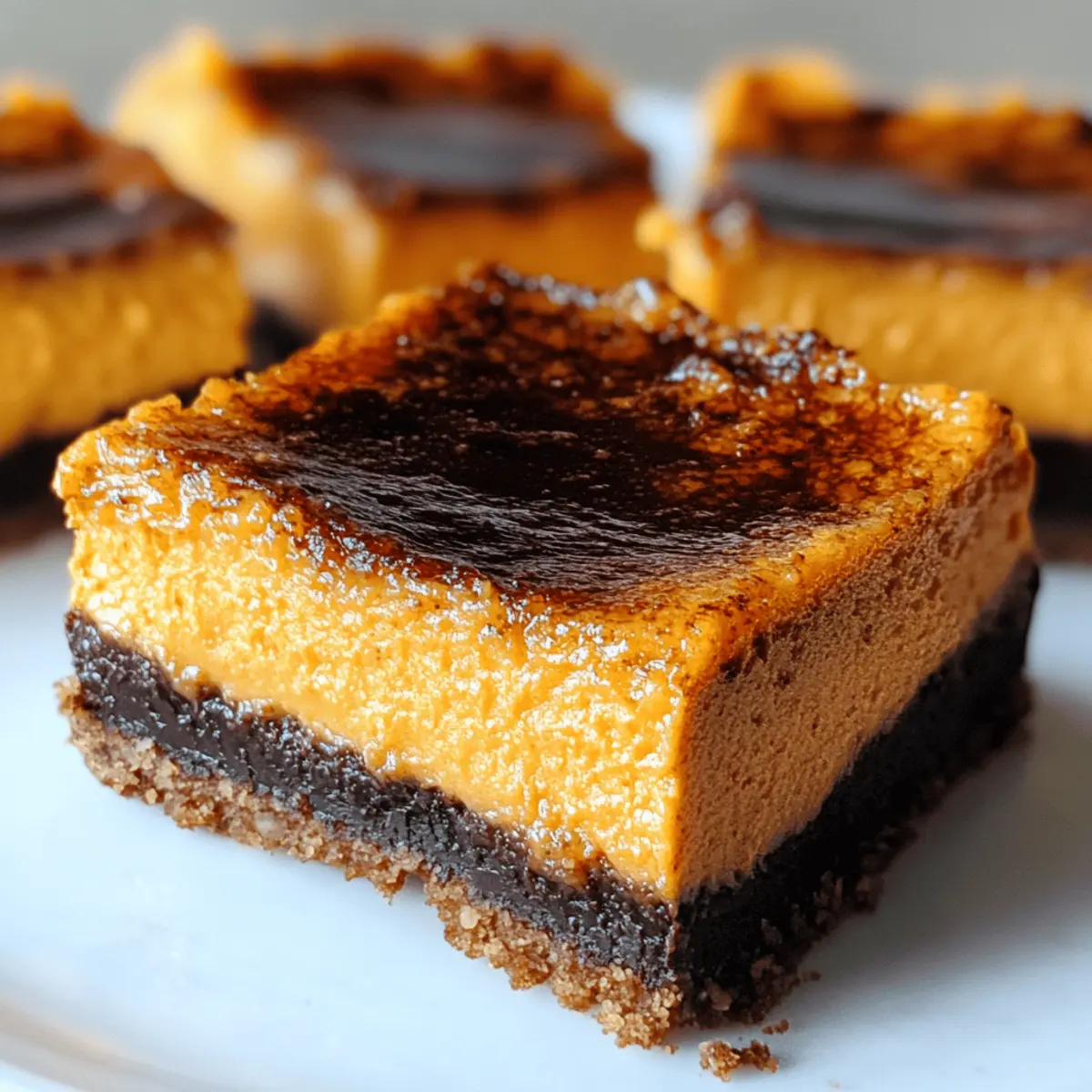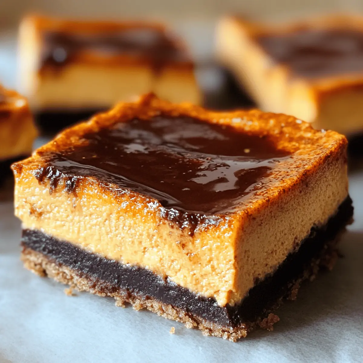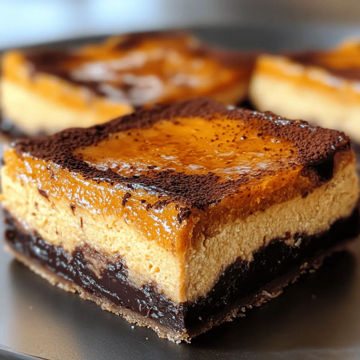 Ein köstlicher Duft von Herbst erfüllt die Luft, und in diesem Moment habe ich die perfekte Kombination für ein süßes Fest: Crème Brûlée Pumpkin Chocolate Cheesecake Bars. Diese himmlischen Leckerbissen vereinen die reichhaltige Süße von Kürbis mit einer dichten Schicht schokoladiger Gaumenfreuden, alles gekrönt von einer einzigartigen, knusprigen Karamellschicht. Ihr beliebter Keksboden sorgt dafür, dass jeder Bissen eine harmonische Textur bietet: knusprig außen und cremig innen. Das Beste daran? Sie sind einfacher zuzubereiten, als man denkt! Diese Bars sind nicht nur der ideale Abschluss für jedes herbstliche Buffet, sondern auch ein wahres Highlight bei gemütlichen Abenden zu Hause. Neugierig geworden, wie du diese himmlischen Leckerbissen selbst kreieren kannst? Lass uns loslegen! Warum wirst du dieses Rezept lieben? Einfachheit: Die Zubereitung dieser Kürbis-Schokoladen-Käsekuchen Riegel ist ein Kinderspiel! Mit grundlegenden Backfähigkeiten erhältst du ein beeindruckendes Dessert. Reiche Aromen: Die Kombination aus Kürbis und Schokolade sorgt für einen unvergleichlichen Geschmack, der perfekt in die Herbstsaison passt. Vielseitigkeit: Du kannst die Basis variieren, indem du beispielsweise Oreos für den Keksboden verwendest oder die Gewürze an deine Vorlieben anpasst. Crowd-Pleaser: Diese Riegel sind ideal für Gäste und lassen sich hervorragend auf festlichen Buffets präsentieren. Texturvielfalt: Der knusprige Keksboden trifft auf eine cremige Füllung und eine zarte Karamellschicht, die beim Schneiden schmilzt und für Begeisterung sorgt. Willst du mehr über köstliche herbstliche Desserts erfahren? Probiere auch unsere anderen herbstlichen Rezeptideen! Kürbis-Schokoladen-Käsekuchen Riegel Zutaten • Diese himmlischen Riegel sind einfach und lecker – hier sind die Zutaten, die du benötigst! Für den Keksboden Graham Crackers – Der Grundstein für die Kruste; verwende Digestive-Kekse oder Biscoff für eine andere Geschmacksrichtung. Ungesalzene Butter – Bindet die Kruste; für mehr Geschmack kannst du gesalzene Butter verwenden. Für die Schokoladenschicht Halbbitterschokolade Chips – Sorgt für eine reichhaltige, schokoladige Schicht; dunkle Schokolade kann für intensiveren Geschmack genutzt werden. Für die Käsekuchenfüllung Frischkäse – Gibt der Füllung ihre cremige Konsistenz; achte darauf, dass er Zimmertemperatur hat für ein einfaches Mixen. Zucker – Süßt die Käseschicht; brauner Zucker kann ebenfalls für zusätzlichen Geschmack verwendet werden. Kürbispüree – sorgt für Geschmack und Feuchtigkeit; stelle sicher, dass es reines Kürbis ist und kein Kürbiskuchenfüllung. Eier/Eigelb – Fügen Struktur und Reichhaltigkeit hinzu; verwende große Eier für Konsistenz. Vanilleextrakt – Verstärkt den Geschmack; nutze reinen Vanilleextrakt für das beste Aroma. Allzweckmehl – Unterstützt die Stabilität der Füllung; kann für eine glutenfreie Version weggelassen werden. Feines Meersalz – Balanciert die Süße aus; gewöhnliches Salz kann als Ersatz verwendet werden. Zimt, Muskatnuss, Ingwer, Nelken – Sorgen für die warmen Herbstgewürze; passe die Gewürze nach deinem Geschmack an. Für die Karamellschicht Zucker – Dient zum Karamellisieren; benutze feinen Zucker für eine gleichmäßige Schicht. Nutze die oben genannten Zutaten, um deine eigenen Kürbis-Schokoladen-Käsekuchen Riegel zu kreieren und entdecke das köstliche Zusammenspiel der Aromen! Schritt-für-Schritt-Anleitung für Kürbis-Schokoladen-Käsekuchen Riegel Step 1: Keksboden vorbereiten Heize den Ofen auf 180°C vor. Lege eine 20 cm große Backform mit Alufolie aus. Zerkrümle die Graham Crackers in einer Küchenmaschine, bis sie fein sind. Vermische die Krümel mit geschmolzener Butter und drücke die Mischung gleichmäßig auf den Boden der Form. Backe den Keksboden etwa 8 Minuten, bis er leicht goldbraun ist. Step 2: Schokoladenschicht hinzufügen Sobald der Keksboden gebacken ist, streue die Schokoladenstückchen gleichmäßig darüber. Stelle die Form für 2 Minuten zurück in den Ofen, damit die Schokolade schmelzen kann. Verwende einen Spatel, um die geschmolzene Schokolade glatt zu streichen und gleichmäßig zu verteilen. Step 3: Käsekuchenfüllung zubereiten Gib den Frischkäse in die saubere Küchenmaschine und püriere ihn, bis er cremig ist. Füge Zucker, Kürbispüree, Eier, Vanilleextrakt, Mehl und die Gewürze hinzu. Mische alles, bis es gut kombiniert ist, aber übermix nicht, um eine samtige Textur der Füllung für die Kürbis-Schokoladen-Käsekuchen Riegel zu erhalten. Step 4: Schichten kombinieren Gieße die Käsekuchenfüllung vorsichtig über die geschmolzene Schokoladenschicht in der Backform. Backe die Riegel bei 150°C für etwa 45 Minuten, bis die Füllung fest ist, aber in der Mitte noch leicht wackelt. Achte darauf, dass die Ränder goldbraun sind und das Zentrum stabil bleibt. Step 5: Abkühlen und Kühlen Nimm die Form aus dem Ofen und lasse sie auf einem Kuchengitter abkühlen. Decke die Form ab und stelle sie dann für mindestens 2 Stunden in den Kühlschrank, damit die Kürbis-Schokoladen-Käsekuchen Riegel fest werden und sich die Aromen verbinden können. Step 6: Karamellschicht brüsten Hole die Riegel aus dem Kühlschrank, streue eine gleichmäßige Schicht Zucker über die Oberfläche und benutze einen Küchenbrenner, um den Zucker zu karamelisieren, bis er goldfarben und knusprig ist. Achte darauf, den Brenner in Bewegung zu halten, um ein Anbrennen zu vermeiden und eine gleichmäßige Karamellschicht zu erzielen. Variationen und Alternativen Es gibt viele kreative Möglichkeiten, das Rezept nach deinem Geschmack anzupassen! Lass deiner Fantasie freien Lauf und probiere verschiedene Abwandlungen aus. Süßkartoffel: Ersetze das Kürbispüree durch Süßkartoffelpüree für eine andere, süße Note. Es sorgt für eine herrliche Farbe und einen tollen Geschmack. Oreos: Verwende zerbröselte Oreos als Keks