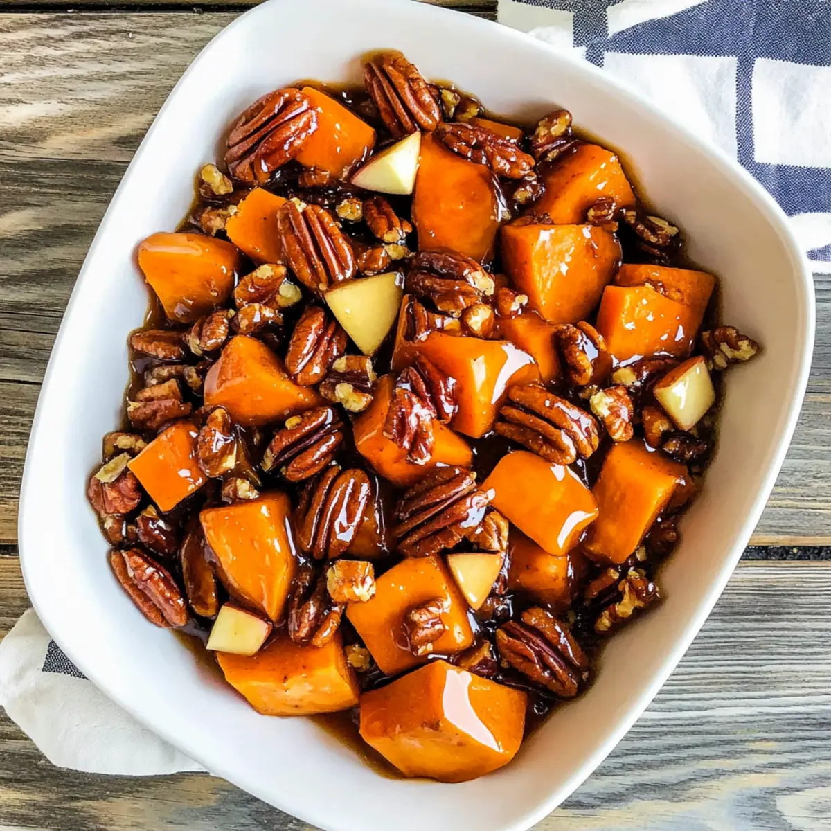 4. In einer großen Auflaufform die gekochten Süßkartoffeln und die gewürfelten Äpfel vorsichtig vermengen. Gießt die vorbereitete Glasur gleichmäßig über die Mischung.