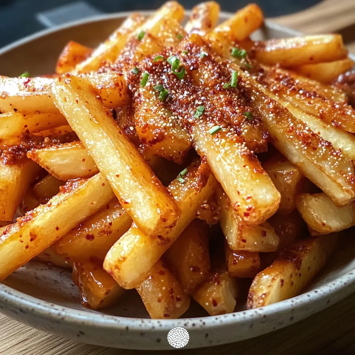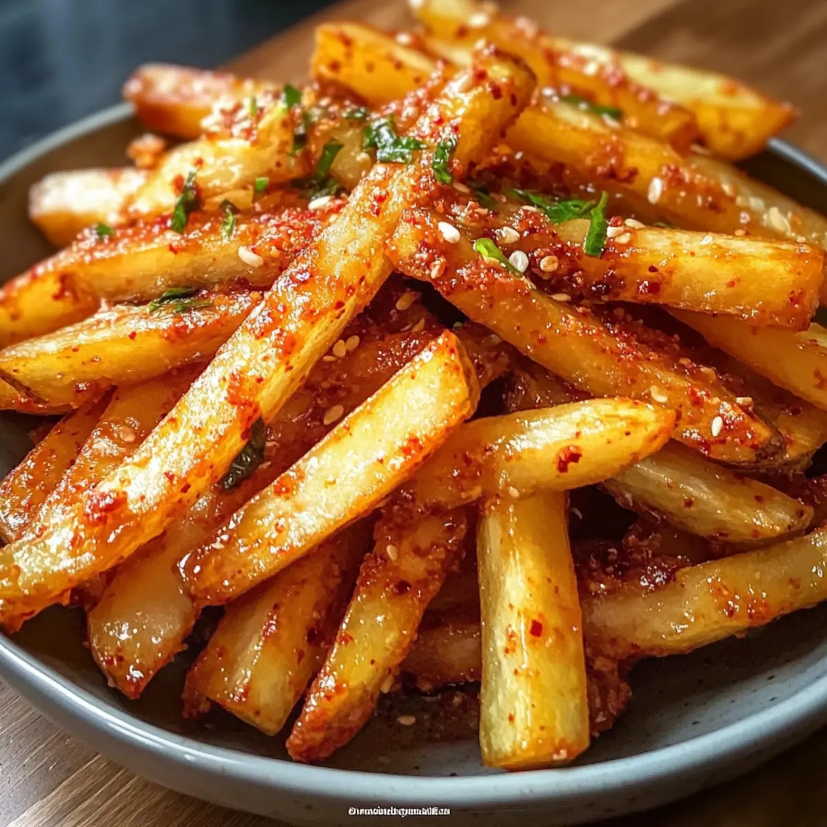 Entdecke die köstlichen und knusprigen dunklen koreanischen Pommes, die mit Gochugaru gewürzt sind. Eine wahre Geschmacksexplosion!