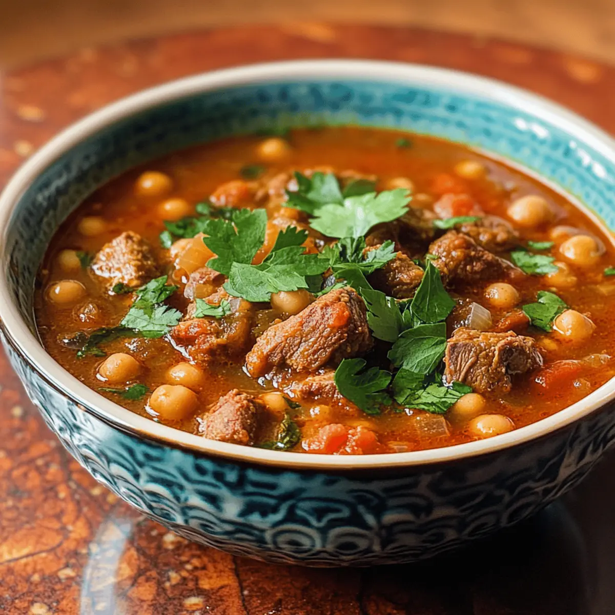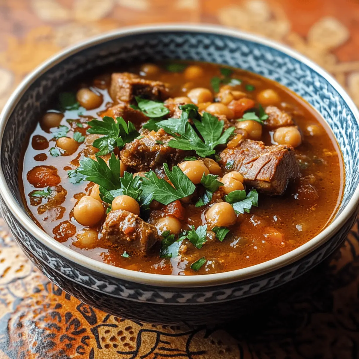 Der verführerische Duft von Gewürzen erfüllt die Küche, während ich eine Schüssel mit warmem, nahrhaftem Harira zubereite. Diese marokkanische Suppe mit zartem Lamm und aromatischen Kräutern bietet nicht nur eine umhüllende Wärme, sondern ist auch ein echtes Komfortessen. Harira ist unglaublich vielseitig; sie kann als reichhaltige Hauptmahlzeit oder als leichter Vorspeise dienen, perfekt für entspannte Abende mit Freunden oder der Familie. Mit ihrer Kombination aus herzhaften Linsen und proteinreichen Kichererbsen macht sie nicht nur satt, sondern ist auch ein echtes Fest für die Sinne. Ob für ein gemeinsames Essen oder um sich nach einem langen Tag etwas Gutes zu tun, dieses Rezept wird deinen Gaumen erfreuen. Bist du bereit, die Aromen Marokkos zu entdecken? Warum ist Harira das perfekte Gericht? Wärme und Komfort: Diese marokkanische Suppe ist nicht nur nahrhaft, sie umhüllt dich auch mit einer wohltuenden Wärme. Vielseitigkeit: Du kannst mit verschiedensten Proteinen wie Hähnchen oder sogar einer vegetarischen Version experimentieren. Aromatische Fülle: Die harmonische Kombination von Gewürzen und frischen Kräutern sorgt für ein Geschmacksfeuerwerk. Einfache Zubereitung: Mit nur wenigen Schritten und alltäglichen Zutaten gelingt dir ein wunderbares Gericht, das alle begeistert. Gesunde Zutaten: Linsen und Kichererbsen liefern dir eine reichhaltige Portion Protein und Ballaststoffe, ideal für eine ausgewogene Ernährung. Perfekt für jeden Anlass: Sei es ein Familienessen oder eine entspannte Dinnerparty – Harira zieht alle in den Bann. Zutaten für marokkanische Harira Für die Suppe: • Lamm Schulter – sorgt für reichhaltigen Geschmack und Zartheit; kann durch Hähnchen ersetzt oder für eine vegetarische Variante ganz weggelassen werden. • Zwiebel – fügt Süße und Tiefe zur Geschmacksbasis hinzu. • Knoblauch – verleiht dem Gericht aromatische und herzhafte Noten. • Olivenöl – wird zum Anbraten verwendet und verbessert den Gesamteindruck. • Gemahlener Kurkuma – bietet einen warmen, erdigen Geschmack und hat gesundheitliche Vorteile. • Gemahlener Kreuzkümmel – sorgt für Tiefe und Rauchigkeit. • Gemahlener Koriander – bringt Frische in die Gewürzmischung. • Gemahlener Zimt – rundet das Geschmacksprofil mit einer süßen Note ab. • Rinder- oder Lammbrühe – bildet die herzliche Basis der Suppe. • Tomatenpassata – liefert Säure und Süße, wichtig für die Reichhaltigkeit der Brühe. • Rote Linsen – sorgen für Cremigkeit und fügen Körper zur Suppe hinzu. • Kichererbsen – tragen zur Textur und zum Proteingehalt der Suppe bei und machen sie gehaltvoll. • Frische Petersilie – fügt einen Farbtupfer und Frische hinzu. • Frischer Koriander – verstärkt den Geschmack mit seinem unverwechselbaren Kräutergeschmack. • Zitronensaft – erhellt das Gericht und balanciert die Reichhaltigkeit aus. • Salz und Pfeffer – essentielle Gewürze, um den Gesamtschmack zu verbessern. Schritt-für-Schritt-Anleitung für marokkanische Harira mit zartem Lamm und Gewürzen Schritt 1: Lamm anbraten Erhitze das Olivenöl in einem großen Topf bei mittlerer Hitze. Füge die Lammstücke hinzu und brate sie rundherum an, bis sie schön gebräunt sind, etwa 5–7 Minuten. Achte darauf, dass das Fleisch eine goldene Kruste bekommt, um die Aromen zu versiegeln. Schritt 2: Zwiebeln und Knoblauch hinzufügen Gib die gehackte Zwiebel und den gehackten Knoblauch in den Topf zum Lamm. Sauté die Mischung für ca. 3–5 Minuten, bis die Zwiebeln weich und leicht durchsichtig sind und der Knoblauch aromatisch duftet. Schritt 3: Gewürze einrühren Streue den gemahlenen Kurkuma, Kreuzkümmel, Koriander und Zimt über die Zutaten im Topf. Rühre gut um und lasse die Gewürze für etwa 1–2 Minuten rösten, um ihre Aromen freizusetzen. Du solltest einen wunderbaren Duft in deiner Küche wahrnehmen. Schritt 4: Brühe und Tomatenpassata hinzufügen Gieße die Brühe und die Tomatenpassata in den Topf. Bringe die Mischung sanft zum Kochen, indem du die Hitze etwas erhöhst. Sobald es kocht, reduziere die Hitze wieder auf niedrig, um das köcheln zu fördern. Schritt 5: Linsen und Kichererbsen einrühren Füge die abgespülten roten Linsen und die abgetropften Kichererbsen hinzu. Rühre alles gut um, und lasse die Suppe bei niedriger Hitze für etwa 30 Minuten köcheln, bis die Linsen und Kichererbsen zart sind. Die Flüssigkeit sollte eindicken und die Aromen intensivieren. Schritt 6: Frische Kräuter und Zitronensaft hinzufügen Rühre kurz vor dem Servieren die frische Petersilie, den Koriander und den Zitronensaft unter die Suppe. Schmecke die Harira mit Salz und Pfeffer ab. Die frischen Kräuter verleihen dem Gericht Farbe und Frische, was perfekt mit der herzhaften Basis harmoniert. Schritt 7: Servieren Serviere die marokkanische Harira heiß in Schalen, begleitet von warmem Fladenbrot oder knusprigem Baguette. Diese Kombination macht die Erfahrung noch besser und sorgt dafür, dass jeder Löffel wunderbar schmeckt. Aufbewahrung und Einfrieren der Harira Zimmertemperatur:: Harira sollte nicht über längere Zeit bei Zimmertemperatur aufbewahrt werden. Lass die Suppe maximal 2 Stunden bei Raumtemperatur stehen, um die Sicherheit zu gewährleisten. Kühlschrank:: Bewahre Reste von Harira in einem luftdichten Behälter im Kühlschrank auf, wo sie bis zu 3 Tage haltbar sind. Die Aromen werden beim Wiedererhitzen intensiver. Einfrieren:: Du kannst Harira bis zu 3 Monate im Gefrierfach aufbewahren. Lass sie als Portionen abkühlen und fülle sie in gefriergeeignete Behälter, um die Qualität zu erhalten. Wiedererwärmen:: Um die gefrorene Harira wieder aufzuwärmen, lasse sie im Kühlschrank auftauen und erhitze sie dann auf dem Herd, bis sie durchgehend heiß ist. Füge gegebenenfalls einen Schuss Wasser oder Brühe hinzu, um die gewünschte Konsistenz zu erreichen. Variationen der Harira Entdecke, wie du dieses Rezept ganz nach deine
