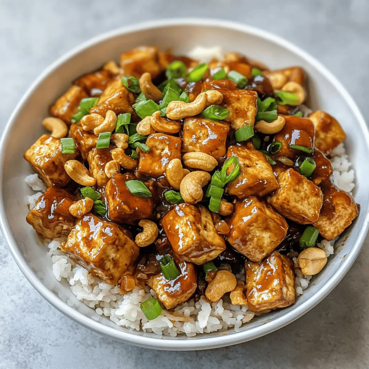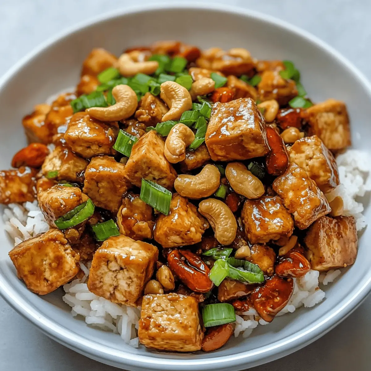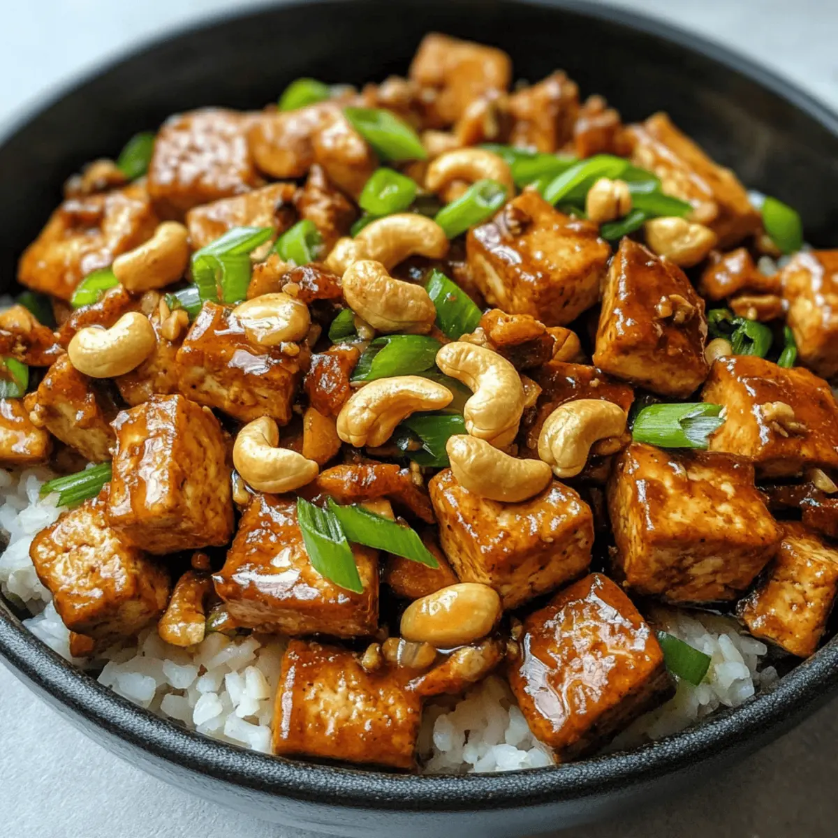 Ein unverhoffter Nachgeschmack von meinem letzten Restaurantbesuch erweckte meine Neugier auf ein klassisches chinesisches Gericht – Vegan Cashew Tofu Stir Fry. Dieses Rezept überrascht nicht nur mit der knusprigen Textur des Tofus, sondern auch mit dem unwiderstehlichen Crunch von gerösteten Cashews und der frischheit der Frühlingszwiebeln. Ideal für Stressfreie Abendessen, dieses Gericht ist nicht nur einfach zuzubereiten, sondern auch perfekt für die wöchentliche Mahlzeitenplanung. In nur 40 Minuten hält man eine gesunde und befriedigende Mahlzeit in der Hand, die✦ die Sehnsucht nach einer leckeren Alternative zu Fast Food stillt. Bereit, deine Kochkünste auf die nächste Stufe zu heben und gleichzeitig deine Geschmacksknospen zu verwöhnen? Warum wirst du dieses Rezept lieben? Einfachheit: Die Zubereitung ist so unkompliziert, dass auch Anfänger sich trauen können. Köstlicher Geschmack: Die Mischung aus Cashews, Tofu und aromatischen Gewürzen schafft ein unvergessliches Geschmackserlebnis. Vielseitigkeit: Ob als Hauptgericht oder als Beilage, diese Pfanne passt perfekt zu verschiedenen Beilagen und kann je nach Vorlieben angepasst werden. Zeitersparnis: In nur 40 Minuten zauberst du eine gesunde, sättigende Mahlzeit für die ganze Familie. Gesundheit: Mit nur 220 Kalorien pro Portion bietet dieses Gericht eine ausgewogene Mischung aus Proteinen, gesunden Fetten und Kohlenhydraten. Es ist ideal für eine pflanzenbasierte Ernährung. Kochspaß: Lass deiner Kreativität freien Lauf und experimentiere mit verschiedenen Gemüsesorten oder Nüssen! Zutaten für Cashew Tofu • Du wirst überrascht sein, wie einfach es ist, alle Zutaten für dieses köstliche Gericht zusammenzustellen! Für den Tofu Extra fester Tofu – Er zählt zu den Hauptproteinen in diesem Gericht und bleibt beim Kochen stabil. Maisstärke – Sie sorgt für eine knusprige Textur beim Braten des Tofus. Für die Sauce Sojasauce – Sie verleiht dem Gericht einen herrlichen Umami-Geschmack; Tamari kann als glutenfreie Alternative verwendet werden. Reisessig – Fügt eine leichte Säure hinzu; Apfelessig ist eine brauchbare Ersatzoption. Hoisin-Sauce – Diese bringt die notwendige Süße und Komplexität in die Sauce; kann im Laden gekauft oder selbst hergestellt werden. Sesamöl – Es intensiviert den nussigen Geschmack; kann weggelassen werden, falls nicht vorhanden, reduziert aber die Geschmacksintensität. Knoblauch – Er sorgt für eine aromatische Note; frischer, gehackter Knoblauch ist empfehlenswert. Für das Gemüse Frühlingszwiebeln – Sie verleihen Frische und Farbe; benutze sowohl die grünen als auch die weißen Teile für den vollen Geschmack. Geröstete Cashews – Fügen beim Essen einen köstlichen Crunch hinzu; du kannst auch andere Nüsse verwenden, wenn du möchtest. Die Kombination dieser Zutaten sorgt für ein aufregendes Geschmackserlebnis mit der Hauptzutat Tofu, die in seiner besten Form erstrahlt! Step-by-Step Instructions for Einfache vegane Cashew Tofu Pfanne Step 1: Tofu vorbereiten Drücke den extra festen Tofu für 10-20 Minuten, um überschüssige Feuchtigkeit zu entfernen. Verwende ein Tuch oder eine Presse, um den Tofu gleichmäßig zu pressen. Dies ist entscheidend, um eine knusprige Textur beim Braten zu erreichen. Step 2: Tofu beschichten Würfle den gepressten Tofu in mundgerechte Stücke und wende ihn in einer Mischung aus Maisstärke, Sojasauce und Olivenöl, bis jeder Würfel gleichmäßig beschichtet ist. Dies sorgt für einen knusprigen Überzug beim Braten und bringt zusätzlichen Geschmack in das Gericht. Step 3: Tofu garen Heize den Ofen auf 220°C vor und backe die Tofustücke für 30 Minuten. Wende sie nach der Hälfte der Zeit, um eine goldene Farbe und gleichmäßige Knusprigkeit zu erreichen. Alternativ kannst du die Stücke in einer Heißluftfritteuse bei 193°C für 15-20 Minuten garen, bis sie perfekt knusprig sind. Step 4: Sauce zubereiten Vermische in einer Schüssel Sojasauce, Reisessig, 2 Esslöffel Wasser und Hoisinsauce für die Grundsauce. In einer separaten kleinen Schüssel mische 1 Esslöffel Maisstärke mit der verbleibenden Flüssigkeit. Diese Mischung wird später die Sauce eindicken und für einen köstlichen Geschmack sorgen. Step 5: Aromaten anbraten Erhitze in einer großen Pfanne 1 Esslöffel Sesamöl und 1 Esslöffel Olivenöl bei mittlerer Hitze. Füge den gehackten Knoblauch sowie die weißen Teile der Frühlingszwiebeln hinzu und brate sie für 1-2 Minuten, bis sie duftend und leicht goldbraun sind. Dies wird eine aromatische Basis für dein Gericht schaffen. Step 6: Kombinieren Gib den gebackenen Tofu zusammen mit der vorbereiteten Saucemischung in die Pfanne. Rühre die Maisstärke-Wasser-Mischung ein, um die Sauce zu verdicken. Lass alles einige Minuten köcheln, damit der Tofu die Aromen aufnehmen kann und die Sauce leicht eindickt. Step 7: Fertigstellen Mische alles gründlich, bis der Tofu gleichmäßig mit der Sauce überzogen ist. Nimm die Pfanne vom Herd, gib die gerösteten Cashews dazu und garniere das Gericht mit den grünen Teilen der Frühlingszwiebeln. Serviere die einfache vegane Cashew Tofu Pfanne warm über Reis oder Quinoa. Aufbewahrungstipps für Cashew Tofu Kühlschrank: Bewahre den veganen Cashew Tofu in einem luftdichten Behälter auf; er hält sich bis zu 4-5 Tage frisch. Gefrierschrank: Für längere Lagerung kann der Tofu portioniert und eingefroren werden; er bleibt bis zu 3 Monate haltbar. Wiederv erwärmen: Erwärme den Tofu in der Mikrowelle oder in einer Pfanne; nimm ihn 5-10 Minuten vor dem Erhitzen aus dem Kühlschrank, um die Temperatur auszugleichen. Verpacken: Stelle sicher, dass der Tofu gut verpackt ist, um Gefrierbrand zu vermeiden; nutze idealerweise Gefrierbeutel oder luftdichte Behälter. Vorbereitungen für die Einfache vegane Cashew Tofu Pfanne Die Einfache vegane Cashew Tofu Pfanne ist ein hervorragendes Gericht für die Bestandteile der Mahlzeitenplanung! Du kannst den extra fes