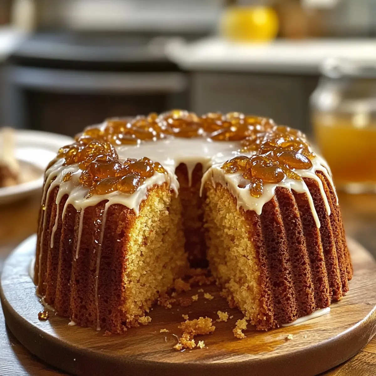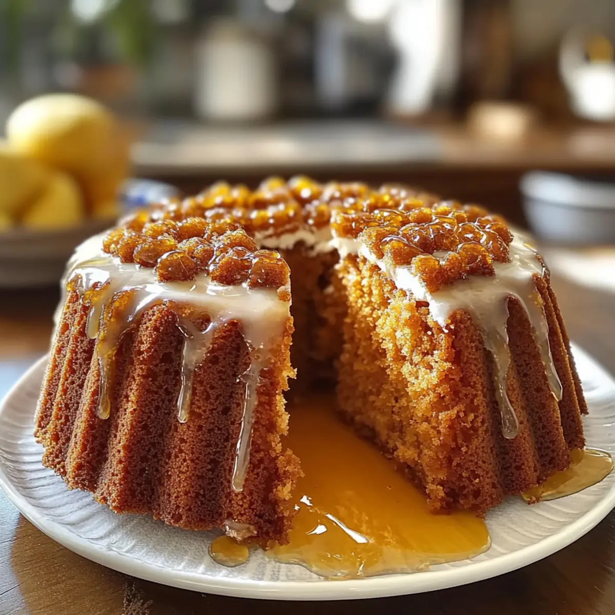 • Zitronenglasur: Bereite eine leichte Glasur aus Puderzucker und Zitronensaft zu und träufle diese über den abgekühlten Kuchen. Die Frische der Zitrone ergänzt den Honig perfekt.