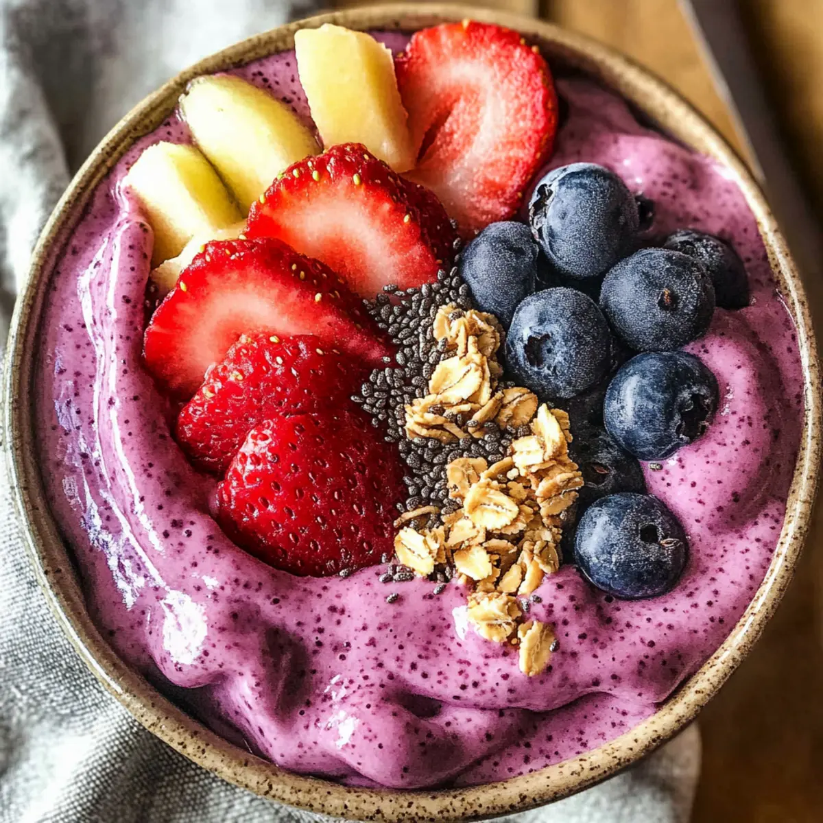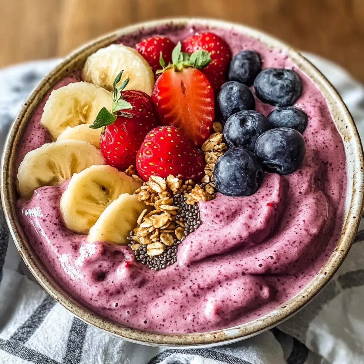 Entdecke die erfrischende Erdbeere Acai Smoothie Schüssel, ein gesundes Frühstück voller Energie und Geschmack.
