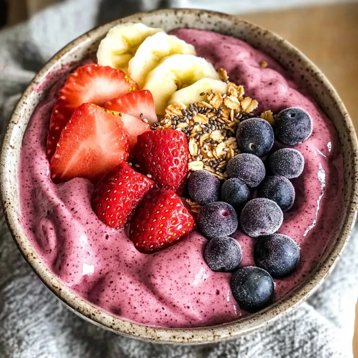 • Gefrorene Erdbeeren – Diese verleihen der Schüssel fruchtigen Geschmack und natürliche Süße; frische Erdbeeren können verwendet werden, benötigen aber eventuell Eis für die Textur.