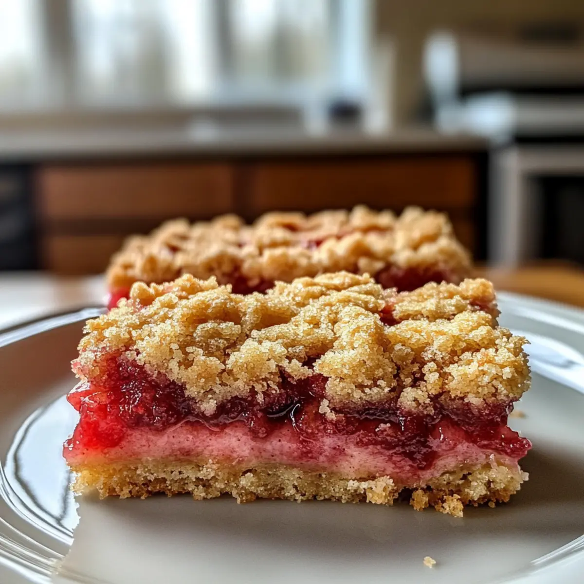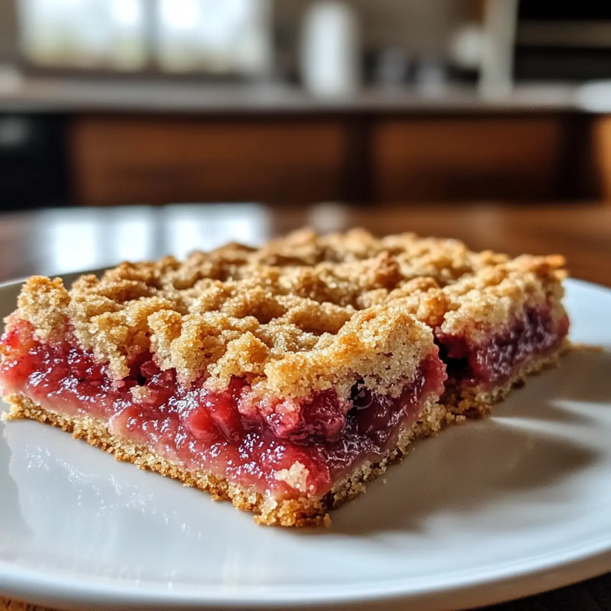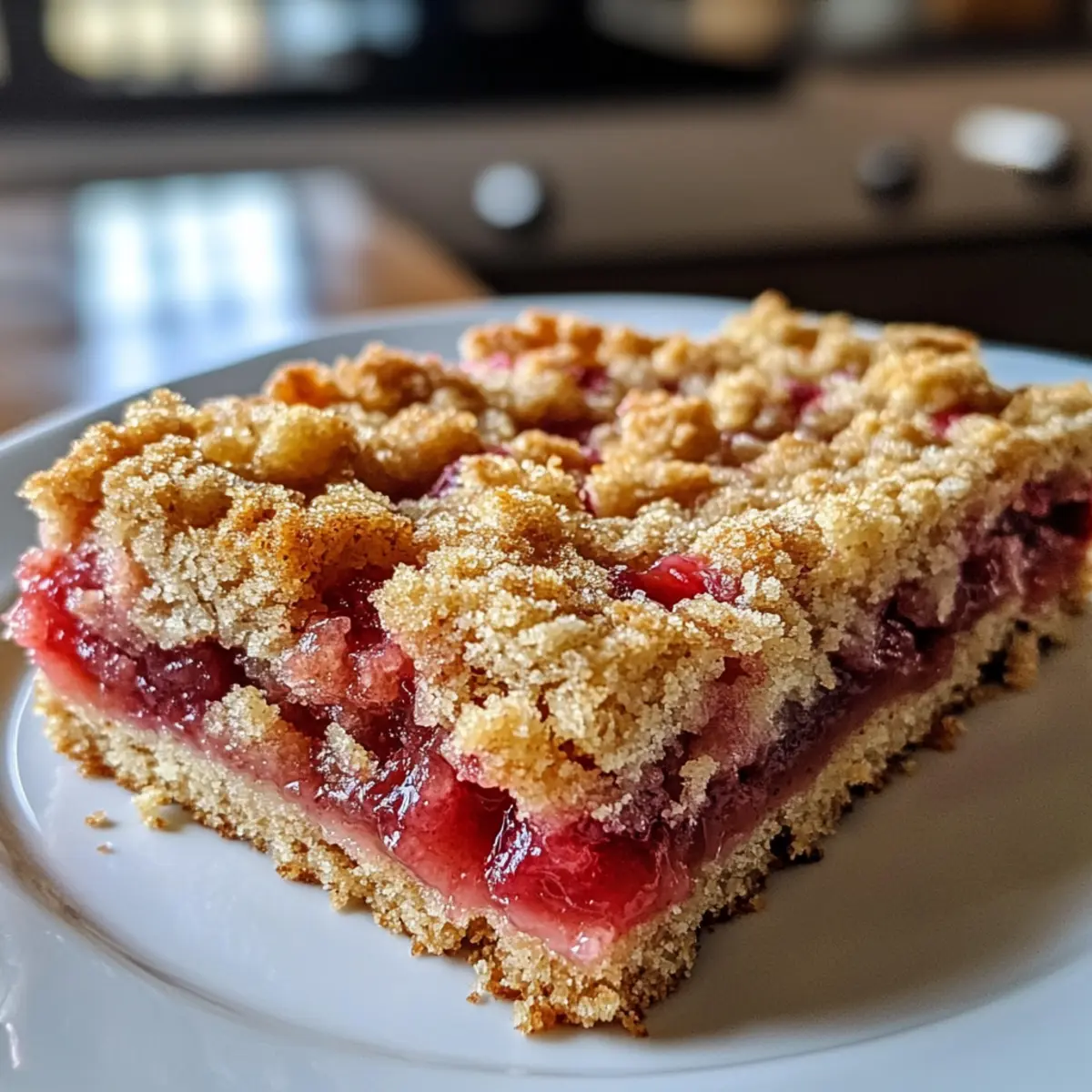 Hörst du das Knistern des Backofens? Es ist die perfekte Zeit für ein Rezept, das den Frühling auf den Tisch bringt: die Erdbeere Rhabarber Krümelriegel! Diese köstlichen Bars erfüllen nicht nur den Raum mit einem verlockenden Aroma, sondern kombinieren auch die Süße von frischen Erdbeeren mit der spritzigen Säure von Rhabarber – ein himmlischer Genuss. Was ich an diesem einfachen Dessert liebe, ist die unkomplizierte Zubereitung und die Tatsache, dass es sowohl warm als auch kalt serviert werden kann. Egal, ob für einen entspannten Nachmittagskaffee oder als süßer Abschluss bei einer Grillfeier, diese Krümelriegel sind die ideale Ergänzung. Hast du schon eine Vorstellung, wer sich darüber freuen würde? Warum wirst du diese Krümelriegel lieben? Einfachheit, die begeistert: Dieses Rezept erfordert nur grundlegende Backfähigkeiten und wenig Zeit in der Küche. Frischer Genuss: Die Kombination aus süßen Erdbeeren und spritzigem Rhabarber bietet dir das perfekte Geschmackserlebnis – ideal für den Frühling. Vielseitig: Ganz gleich, ob du sie warm oder kalt servierst, sie sind immer ein Hit bei deinen Gästen. Schnell zubereitet: In nur wenigen Schritten zauberst du diese unwiderstehlichen Krümelriegel, die sich hervorragend für den Nachmittagskaffee oder als Dessert bei einer Grillparty eignen. Klassiker neu interpretiert: Diese Bars sind eine köstliche Hommage an ein traditionelles amerikanisches Dessert. Probiere auch unsere Limonade für den perfekten Frühlingstag dazu! Erdbeere Rhabarber Krümelriegel Zutaten • Perfekt für ein fruchtiges Dessert! Für die Füllung Erdbeeren – sorgen für die Süße; verwende frische oder aufgetaute gefrorene Früchte und lasse überschüssige Flüssigkeit abtropfen, um Sumpfigkeit zu vermeiden. Rhabarber – bringt die spritzige Note; frische oder gefrorene Varianten sind möglich, einfach auftauen und abtropfen lassen. Zucker – süßt die Füllung; passe die Menge nach Geschmack an, besonders bei würzigem Rhabarber. Maisstärke – dickt die Fruchtfüllung ein und verhindert überschüssige Feuchtigkeit; eventuell um 1 TL erhöhen, wenn sehr saftige Erdbeeren verwendet werden. Zitronensaft – verstärkt den Geschmack und balanciert die Süße; frisch gepresst ist am besten. Für den Krümelbelag Mehl – bildet die Grundlage für die Kruste; kann durch glutenfreies Mehl ersetzt werden, wenn nötig. Haferflocken – verleihen der Krümelmasse Textur und Herzhaftigkeit; schnelle oder zarte Haferflocken sind ideal. Brauner Zucker – bringt einen reiche, karamellartige Note in die Krümel; Haushaltszucker ist ein akzeptabler Ersatz. Zimt – sorgt für Wärme und Geschmack; optional, aber empfehlenswert. Backpulver – hilft, eine leichtere Textur im Krümel zu erreichen; stelle sicher, dass es frisch ist. Salz – balanciert die Süße; eine kleine Menge genügt. Step-by-Step Instructions for Erdbeere Rhabarber Krümelriegel Step 1: Ofen vorheizen Heize deinen Ofen auf 175 °C (350 °F) vor und bereite eine 9×13 Zoll Backform vor, indem du sie mit Butter einfettest oder mit Backpapier auslegst. So wird das Herausnehmen der Krümelriegel nach dem Backen zum Kinderspiel. Step 2: Fruchtfüllung zubereiten In einer großen Schüssel mischst du die gehackten Erdbeeren, den Rhabarber, den Zucker, die Maisstärke und den frisch gepressten Zitronensaft. Lass die Mischung etwa 10 Minuten ruhen, damit sich die Aromen entfalten und der Zucker schmelzen kann, bevor du die Füllung auf die Krümelriegel gibst. Step 3: Krümelmasse herstellen Vermenge in einer weiteren Schüssel das Mehl, die Haferflocken, den braunen Zucker, Zimt, Backpulver und das Salz. Füge dann kalte, gewürfelte Butter hinzu und arbeite sie mit deinen Fingern oder einem Teigmischer ein, bis die Mischung krümelig aussieht und kleine Klümpchen bildet – das ist der perfekte Krümelbelag für die Erdbeere Rhabarber Krümelriegel. Step 4: Krümelriegel zusammensetzen Drücke etwa zwei Drittel der Krümelmasse gleichmäßig in den Boden der Backform, um eine feste Basis zu bilden. Darauf verteilst du gleichmäßig die vorbereitete Fruchtfüllung, sodass diese gut sichtbar ist und einen schönen Kontrast zur Kruste bietet. Step 5: Backen und goldbraun werden Streue die verbleibende Krümelmasse gleichmäßig über die Fruchtfüllung, so dass alles gut bedeckt ist. Backe die Erdbeere Rhabarber Krümelriegel etwa 40 bis 45 Minuten lang im vorgeheizten Ofen, bis die Oberfläche goldbraun und die Füllung blubbert – ein Zeichen dafür, dass sie perfekt ist. Step 6: Auskühlen lassen und schneiden Lass die Krümelriegel vollständig in der Form abkühlen, damit sie fest werden und sich leicht schneiden lassen. Dies dauert mindestens eine Stunde. Anschließend kannst du sie in Quadrate schneiden und servieren – am besten noch lauwarm oder gut gekühlt. Erdbeere Rhabarber Krümelriegel Variationen Lass deiner Kreativität freien Lauf und passe dieses köstliche Rezept nach deinem Geschmack an! Wärmer: Füge eine Prise Cayennepfeffer oder einige Chiliflocken zur Krümelmasse hinzu, um dem Dessert eine spannende, feurige Note zu verleihen. Fruchtige Änderungen: Tausche den Rhabarber gegen frische Himbeeren oder Brombeeren aus, um eine neue Geschmacksrichtung zu entdecken. Dairy-Free: Verwende anstelle von Butter pflanzliche Margarine, um die Krümelriegel milchfrei zu gestalten. Das Ergebnis bleibt genauso lecker! Nussige Note: Mische gehackte Nüsse wie Mandeln oder Walnüsse unter die Krümelmasse für zusätzlichen Biss und eine nussige Geschmacksnote. Karamellisieren: Gib etwas Karamellsirup über die Fruchtfüllung, um eine süßere und luxuriöse Schicht zu kreieren, die jede Biss zu einem Genuss macht. Glutenfrei: Ersetze das Weizenmehl durch eine glutenfreie Mehlmischung oder Mandelmehl, um die Krümelriegel für glutenempfindliche Genießer zugänglich zu machen. Zitrusfrisch: Ersetze einen Teil des Zuckers durch Orangen- oder Limettensaft, um eine sprit
