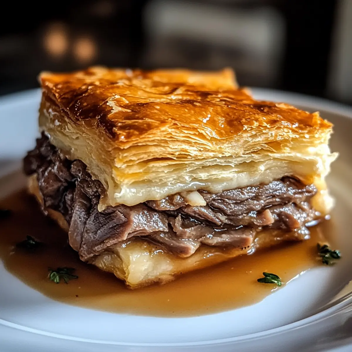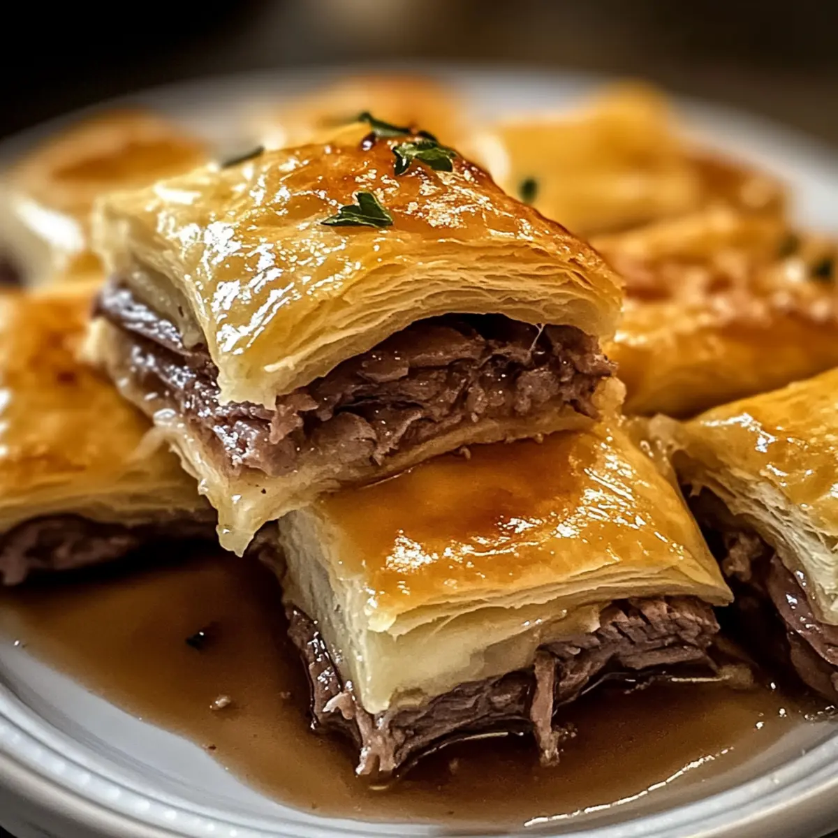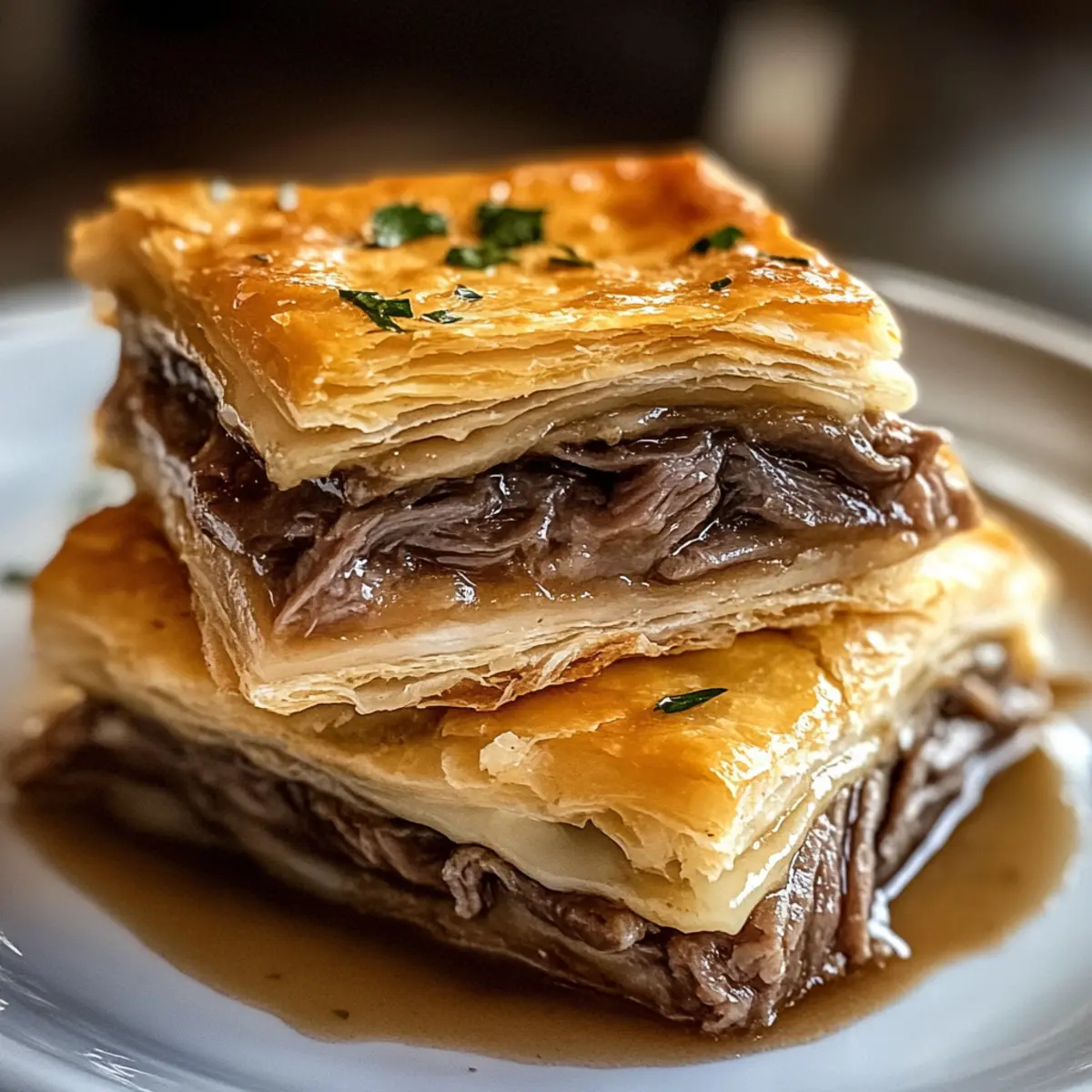 Wenn ich an gesellige Abende mit Freunden denke, kommt mir sofort der Wunsch nach einem einfachen, aber köstlichen Snack in den Sinn. Diese Französischen Dip Quadrate sind genau das: Eine geniale Verbindung zwischen dem klassischen französischen Dip-Sandwich und einem unkomplizierten Fingerfood. Mit frisch ausgerolltem, buttrigem Teig, zartem Roastbeef und schmelzendem Schweizer Käse, sind sie nicht nur ein echter Hingucker, sondern auch perfekt für jeden Anlass. Egal ob bei Partys, Familienfeiern oder einfach nur für einen gemütlichen Abend – diese quadratischen Leckerbissen sind der absolute Crowd-Pleaser! Und das Beste? Sie sind schnell zubereitet, sodass du mehr Zeit mit deinen Gästen verbringen kannst. Bist du bereit, deine nächste Versammlung mit diesen herzhaften Quadraten zu bereichern? Warum sind Französische Dip Quadrate besonders? Einfachheit: Die Zubereitung erfordert nur minimalen Aufwand, sodass du dich ganz auf die Geselligkeit konzentrieren kannst. Vielfältigkeit: Du kannst die Füllung anpassen – experimentiere mit verschiedenen Fleischsorten oder Käse für jeden Geschmack! Bester Geschmack: Der harmonische Mix aus zartem Roastbeef und schmelzendem Schweizer Käse sorgt für eine Geschmacksexplosion, die jedem gefällt. Perfekt für Partys: Dieses Fingerfood ist ideal zum Teilen – die Quadrate sind perfekt portioniert und kommen bei jedem Event gut an. Schnell gekocht: Mit nur wenigen Zutaten und einer schnellen Backzeit bist du im Handumdrehen fertig. Perfekt für die nächste spontane Feier! Französische Dip Quadrat Zutaten • Diese Zutaten machen deine Französischen Dip Quadrate unwiderstehlich. Für den Teig • Kühlregal Croissantteig – Dieser buttrige, flakige Teig dient als perfekte Basis und Oberseite für deine Quadrate. • Butter – sorgt für zusätzliche Reichhaltigkeit und gibt dem Teig das gewisse Etwas. Für die Füllung • Deli Roastbeef – Das Hauptprotein, das zart und herzhaft ist; perfekt, weil es gleichmäßig gegart und einfach geschichtet werden kann. • Schweizer Käse – Schmilzt wunderbar und ergänzt das Roastbeef mit einem milden, nussigen Geschmack. • Trockenes Zwiebelsuppenpulver – Fügt eine herzhaft-würzige Note hinzu, die den Geschmack der Füllung verstärkt. • Worcestershire-Sauce – Bringt einen umami-reichen Kick, der hervorragend mit dem Rindfleisch harmoniert. • Knoblauchpulver – Verleiht eine subtile Würze, die das Gericht abrundet. Für das Dippen • Rinderbrühe (zum Dippen) – Unverzichtbar für das authentische französische Dip-Erlebnis und bringt zusätzliche Feuchtigkeit in jeden Bissen. Mit diesen Zutaten bereitest du die perfekten Französischen Dip Quadrate zu, die jeder lieben wird! Schritt-für-Schritt-Anleitung für Französische Dip Quadrate Schritt 1: Ofen vorheizen Heize den Ofen auf 190 °C (375 °F) vor und sprühe eine 23×33 cm große Backform mit einer Antihaft-Kochsprühe ein. Dies sorgt dafür, dass deine Französischen Dip Quadrate nicht anhaften und gleichmäßig gebacken werden. Schritt 2: Teig in der Form auslegen Legen Sie eine Packung Croissantteig in die Backform, indem Sie die Nähte gut zusammendrücken, um eine gleichmäßige Basis zu bilden. Achte darauf, dass der Teig den gesamten Boden der Form abdeckt; so erhältst du eine köstliche, buttrige Kruste. Schritt 3: Füllung verteilen Verteile das Deli-Roastbeef gleichmäßig über die Teigschicht in der Form. Anschließend streue großzügig den Schweizer Käse darüber; der Käse wird beim Backen wunderbar schmelzen und den köstlichen Geschmack der Französischen Dip Quadrate entfalten. Schritt 4: Mischung vorbereiten Vermische das trockene Zwiebelsuppenpulver, die geschmolzene Butter, Worcestershire-Sauce und Knoblauchpulver in einer kleinen Schüssel. Diese aromatische Sauce sorgt für einen zusätzlichen Geschmackskick; träufle sie gleichmäßig über die Käseschicht, um die Füllung perfekt abzurunden. Schritt 5: Oberen Teig auflegen Rolle die zweite Packung Croissantteig aus und decke die Füllung komplett damit ab, wobei du die Nähte sorgfältig zusammendrückst, um die Füllung zu versiegeln. So entsteht eine schöne, gleichmäßige Schicht, die deine Französischen Dip Quadrate zusammenhält. Schritt 6: Backen Backe das Ganze im vorgeheizten Ofen für 15 bis 20 Minuten, bis die Oberseite goldbraun und knusprig aussieht. Achte auf eine schön gebräunte Kruste, die einladend und appetitlich ist, während sie die köstliche Füllung umschließt. Schritt 7: Brühe erhitzen Während die Quadrate backen, erhitze die Rinderbrühe in einem kleinen Topf bei mittlerer Hitze, bis sie warm ist. Dies ist ein wichtiger Schritt, um ein authentisches französisches Dip-Erlebnis zu ermöglichen und den perfekten Dip zu schaffen. Schritt 8: Abkühlen und Servieren Lass die Backform für 5 bis 10 Minuten abkühlen, um das Schneiden zu erleichtern. Schneide dann die Quadrate in gleichmäßige Stücke und serviere sie mit der warmen Rinderbrühe zum Dippen, damit jeder Bissen noch köstlicher wird. Lagerungstipps für Französische Dip Quadrate Raumtemperatur:: Die Quadrate sollten nicht länger als 2 Stunden bei Raumtemperatur stehen, um die Frische zu gewährleisten. Kühlschrank:: Im Kühlschrank kannst du die übrig gebliebenen Französischen Dip Quadrate bis zu 3 Tage in einem luftdichten Behälter aufbewahren, um die Aromen zu erhalten. Gefrierschrank:: Du kannst die gebackenen Quadrate bis zu 2 Monate einfrieren. Am besten in Frischhaltefolie einwickeln und in einen Gefrierbeutel legen, um Gefrierbrand zu vermeiden. Wiedererwärmen:: Um die Quadrate nach dem Einfrieren oder Kühlen wieder zuzubereiten, erwärmen sie im Ofen bei 180°C für etwa 15 Minuten, bis sie durchgehend warm sind und die Kruste knusprig wird. Französische Dip Quadrat Variationen Lass deiner Kreativität freien Lauf und passe die Rezeptur nach deinem Geschmack an – es gibt so viele leckere Möglichkeiten! Dairy-Free: Ersetze den 