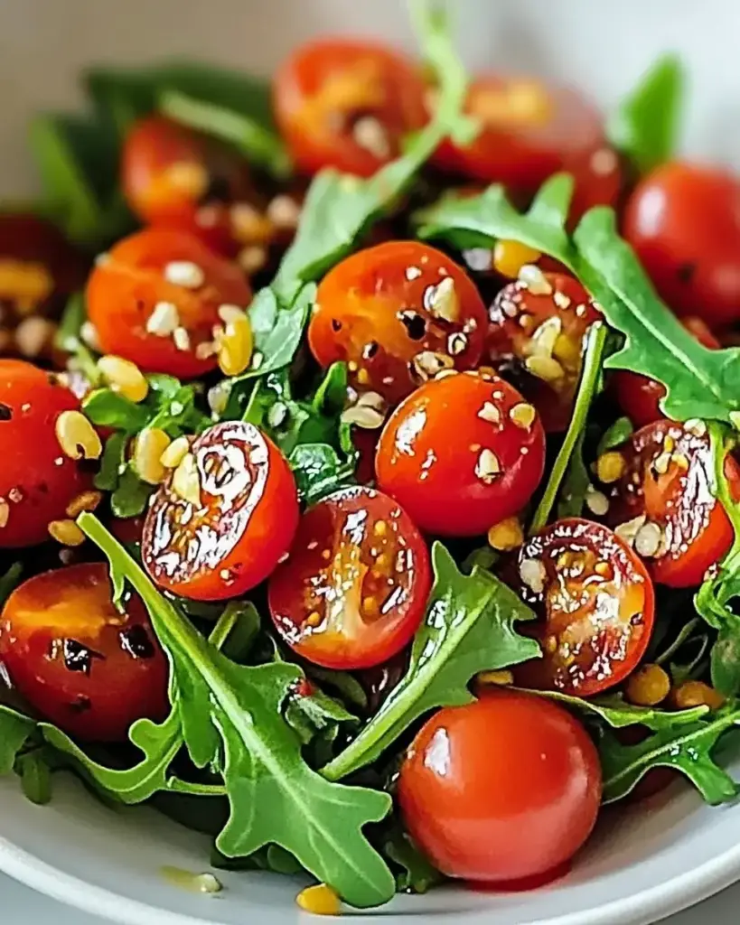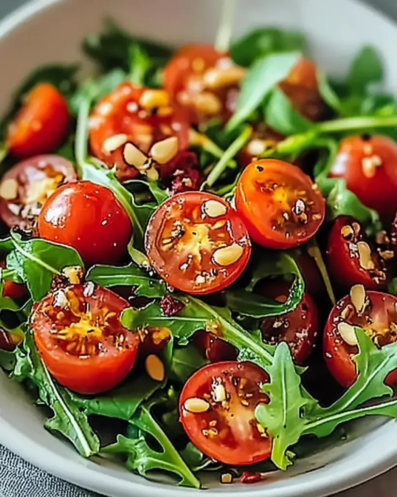 Jump to Recipe·Print Recipe Einführung in Frischer Tomaten-Rucola-Salat mit Pinienkernen Der Frische Tomaten-Rucola-Salat mit Pinienkernen ist wie ein Hauch Sommer auf dem Teller. Wenn ich an warme Tage denke, kommt mir sofort dieser Salat in den Sinn. Er ist nicht nur erfrischend, sondern auch blitzschnell zubereitet – perfekt für einen geschäftigen Tag oder wenn Freunde zu Besuch sind. Die Kombination aus saftigen Tomaten, würzigem Rucola und knackigen Pinienkernen sorgt für ein Geschmackserlebnis, das einfach begeistert. Egal, ob als leichtes Mittagessen oder als Beilage zum Grillabend, dieser Salat wird Ihre Lieben garantiert beeindrucken. Lassen Sie uns gemeinsam in die Zubereitung eintauchen! Warum Sie diesen Frischen Tomaten-Rucola-Salat mit Pinienkernen lieben werden Dieser Frische Tomaten-Rucola-Salat mit Pinienkernen ist der Inbegriff von Einfachheit und Geschmack. In nur 15 Minuten zaubern Sie ein Gericht, das nicht nur frisch, sondern auch voller Aromen ist. Die knackigen Pinienkerne und der würzige Rucola harmonieren perfekt mit den saftigen Tomaten. Egal, ob für ein schnelles Mittagessen oder als Beilage – dieser Salat bringt Freude auf den Tisch und lässt sich mühelos anpassen. Ein echtes Highlight für jeden Anlass! Zutaten für Frischer Tomaten-Rucola-Salat mit Pinienkernen Um diesen köstlichen Frischen Tomaten-Rucola-Salat mit Pinienkernen zuzubereiten, benötigen Sie einige einfache, aber geschmackvolle Zutaten. Hier ist eine kurze Übersicht: Reife Tomaten: Sie sind das Herzstück des Salats. Wählen Sie saftige, aromatische Tomaten für den besten Geschmack. Rucola: Dieser würzige Blattgemüse bringt eine angenehme Schärfe und Frische in den Salat. Pinienkerne: Geröstet verleihen sie dem Gericht eine nussige Note und einen knackigen Biss. Olivenöl: Hochwertiges Olivenöl sorgt für eine geschmeidige Textur und rundet die Aromen ab. Balsamico-Essig: Ein Spritzer davon bringt eine süß-saure Komplexität in das Dressing. Honig: Er sorgt für eine subtile Süße, die die anderen Zutaten perfekt ergänzt. Salz und Pfeffer: Diese Grundgewürze sind entscheidend, um die Aromen zum Strahlen zu bringen. Parmesan (optional): Für einen zusätzlichen Geschmackskick können Sie feine Späne darüber streuen. Die genauen Mengenangaben finden Sie am Ende des Artikels, bereit zum Ausdrucken. So haben Sie alles, was Sie brauchen, um diesen erfrischenden Salat zuzubereiten! So bereiten Sie Frischen Tomaten-Rucola-Salat mit Pinienkernen zu Schritt 1: Tomaten vorbereiten Waschen Sie die reifen Tomaten gründlich unter fließendem Wasser. Schneiden Sie sie dann in gleichmäßige Würfel, damit sie schön im Salat verteilt sind. Achten Sie darauf, die Stielansätze zu entfernen, um den besten Geschmack zu erzielen. Frische, saftige Tomaten sind der Schlüssel zu diesem Gericht! Schritt 2: Rucola vorbereiten Nehmen Sie den Rucola und waschen Sie ihn gründlich, um eventuelle Erde oder Rückstände zu entfernen. Schütteln Sie ihn vorsichtig trocken oder verwenden Sie eine Salatschleuder. So bleibt der Rucola knackig und frisch. Ein gut vorbereiteter Rucola ist das Herzstück dieses Salats! Schritt 3: Pinienkerne rösten Erhitzen Sie eine Pfanne bei mittlerer Hitze und geben Sie die Pinienkerne hinein. Rösten Sie sie ohne Fett, bis sie goldbraun sind. Achten Sie darauf, regelmäßig umzurühren, damit sie nicht anbrennen. Geröstete Pinienkerne bringen eine nussige Tiefe in den Salat! Schritt 4: Salat vermengen In einer großen Schüssel vermengen Sie die gewürfelten Tomaten und den frisch gewaschenen Rucola. Mischen Sie die Zutaten vorsichtig, damit der Rucola nicht zerdrückt wird. Die Farben und Texturen sollten harmonisch zusammenkommen. Ein gut vermischter Salat sieht nicht nur gut aus, sondern schmeckt auch besser! Schritt 5: Dressing zubereiten In einer kleinen Schüssel kombinieren Sie das Olivenöl, den Balsamico-Essig, den Honig, Salz und Pfeffer. Verrühren Sie alles gut, bis sich die Zutaten verbunden haben. Das Dressing sollte eine ausgewogene Süße und Säure haben. Ein perfektes Dressing hebt den Geschmack des Salats auf ein neues Level! Schritt 6: Salat anrichten Gießen Sie das Dressing über den Salat und heben Sie alles vorsichtig unter. Streuen Sie die gerösteten Pinienkerne darüber und fügen Sie optional Parmesan hinzu. Servieren Sie den Salat sofort oder lassen Sie ihn kurz im Kühlschrank ziehen. So entfalten sich die Aromen und der Salat wird noch köstlicher! Tipps für den Erfolg Wählen Sie reife, aromatische Tomaten für den besten Geschmack. Rösten Sie die Pinienkerne in einer beschichteten Pfanne, um ein Ankleben zu vermeiden. Für extra Frische können Sie den Salat kurz im Kühlschrank ziehen lassen. Experimentieren Sie mit verschiedenen Essigsorten für ein individuelles Dressing. Fügen Sie Avocado oder Gurke hinzu, um den Salat noch frischer zu gestalten. Benötigte Ausrüstung Schneidebrett: Ein robustes Brett ist ideal zum Schneiden der Tomaten und des Rucola. Schneidemesser: Ein scharfes Messer erleichtert das Würfeln der Tomaten. Pfanne: Eine beschichtete Pfanne eignet sich hervorragend zum Rösten der Pinienkerne. Schüssel: Eine große Schüssel zum Mischen der Zutaten ist unerlässlich. Salatschleuder: Diese hilft, den Rucola schnell zu trocknen, ist aber nicht zwingend erforderlich. Variationen Avocado hinzufügen: Für eine cremige Textur können Sie gewürfelte Avocado unter den Salat mischen. Sie bringt eine zusätzliche Frische und gesunde Fette. Gurke einfügen: Fügen Sie gewürfelte Gurke hinzu, um dem Salat noch mehr Knackigkeit und Frische zu verleihen. Perfekt für heiße Sommertage! Feta-Käse: Ersetzen Sie den Parmesan durch zerbröckelten Feta-Käse für eine salzige, würzige Note, die wunderbar mit den Tomaten harmoniert. Geröstete Paprika: Geben Sie einige Stücke gerösteter Paprika hinzu, um dem Salat eine süßliche und rauchige Komponente zu verleihen. Quinoa oder Couscous: Machen Sie den Salat sä
