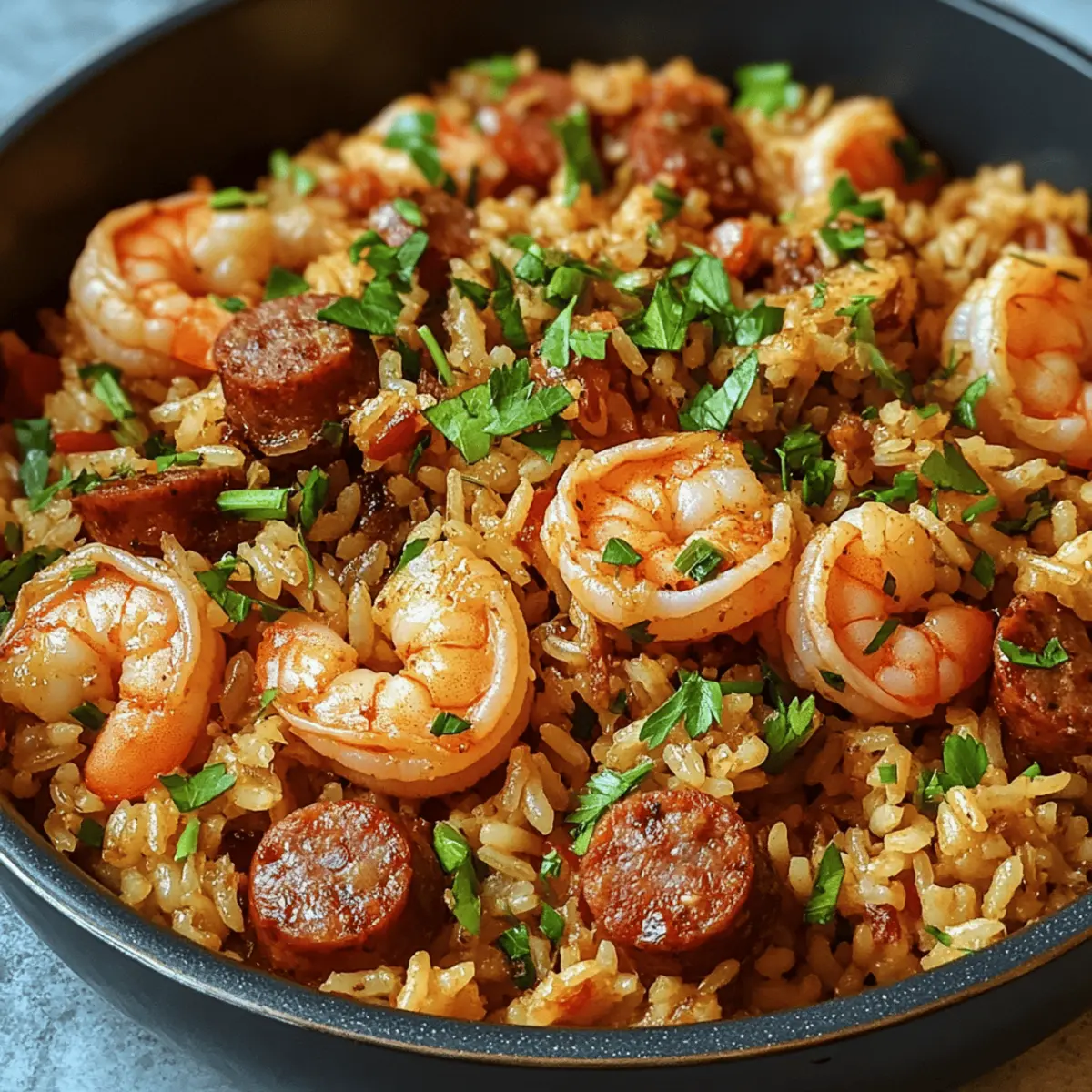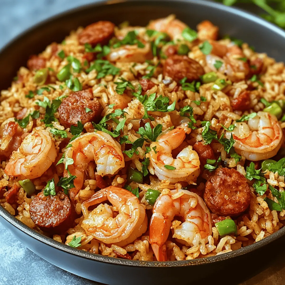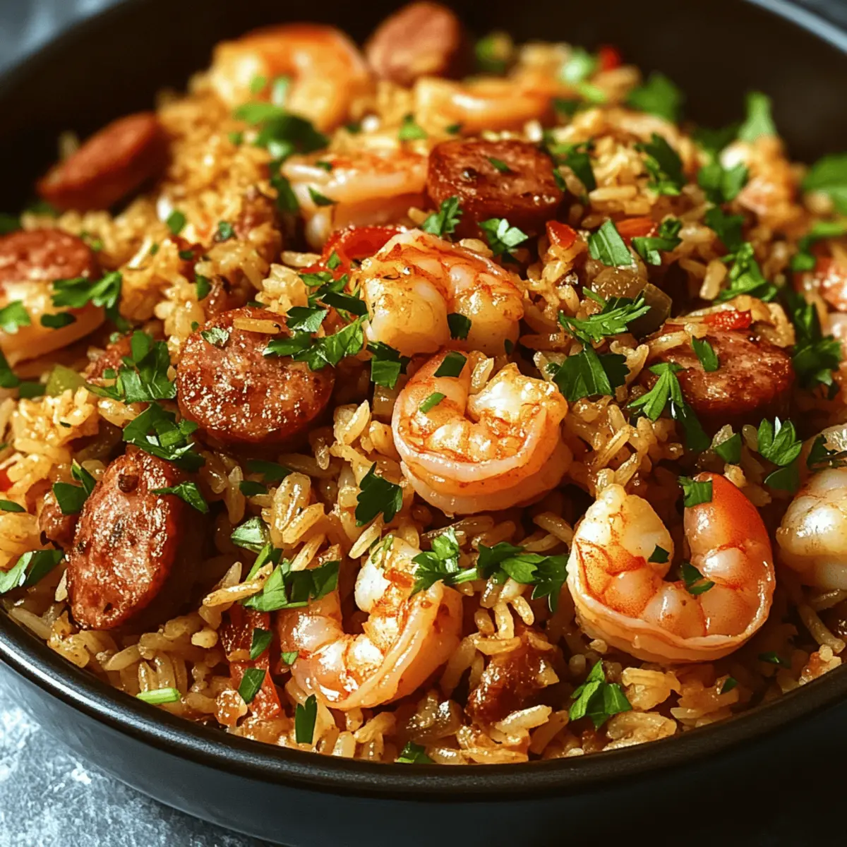 Die bunten Aromen von Cajun-Küche kommen direkt auf deinen Tisch mit diesem Spicy One-Pot Shrimp Dirty Rice. Diese köstliche Kombination aus zarten Garnelen, würziger Wurst und aromatischen Gemüse ist nicht nur ein wahrer Genuss für die Sinne, sondern auch die perfekte Lösung für hektische Wochentage. Dieses herzliche Gericht benötigt minimalen Aufwand und ist ein echter Publikumsliebling, der sowohl Familie als auch Freunde begeistern wird. Während die Aromen in einem Topf harmonieren, kannst du dich entspannt zurücklehnen und den unwiderstehlichen Duft genießen. Bist du bereit, deine Küche mit einem Stück Südstaaten zu bereichern? Warum wirst du dieses Rezept lieben? Einfachheit: Die Zubereitung ist ein Kinderspiel und erfordert nur grundlegende Kochkenntnisse. Herzhafter Geschmack: Die Kombination aus Garnelen, Wurst und Cajun-Gewürzen bringt einen reichhaltigen, unvergesslichen Geschmack auf den Tisch. Ein Topf, viele Aromen: Bei diesem Gericht kannst du alles in einem einzigen Topf zubereiten – weniger Abwasch, mehr Zeit zum Genießen! Vielfältige Anpassungsmöglichkeiten: Ob du es schärfer magst oder vegetarische Alternativen suchst, dieser Dirty Rice ist flexibel genug, um deinen Vorlieben gerecht zu werden. Probiere auch unsere leckere Pan Honig BBQ Variante! Ideal für die ganze Familie: Schon auf der Suche nach einem schnellen Abendessen? Dieses herzliche Gericht ist perfekt für ein stressfreies Wochendinner, das alle satt macht. Garnelen Dirty Rice Zutaten Garnelen – Verwende geschälte und entdarmte Garnelen für einfachen Umgang; alternativ sind Hähnchen oder Tofu auch möglich. Olivenöl – Als Kochfett ideal; kann auch durch neutrales Öl wie Raps- oder Sonnenblumenöl ersetzt werden. Langkornreis – Basis des Gerichts, sorgt für Textur; brauner Reis kann für extra Ballaststoffe verwendet werden, benötigt aber eine längere Garzeit. Schweine-Cajun-Wurst – Fügt Fülle und Tiefe hinzu; Alternativen sind Hähnchen- oder Putenwurst für eine magerere Option. Grüne Paprika – Aromatisch und leicht süß; rote oder gelbe Paprika können für einen milderen Geschmack verwendet werden. Selleriestange – Bringt Crunch und Geschmack; kann weggelassen oder durch gewürfelte Karotten ersetzt werden, wenn nicht verfügbar. Zwiebel – Essentiell für die Geschmacksbasis; süße Zwiebeln oder Schalotten können ebenfalls verwendet werden. Knoblauch – Verstärkt die Gesamtgeschmack; frisch gehackter Knoblauch ist ideal, Knoblauchpulver kann in der Not verwendet werden. Hühnerbrühe – Sorgt für Feuchtigkeit und Würze; Gemüsebrühe kann für eine vegetarische Version genutzt werden. Cajun-Gewürz – Schlüsselgewürzmischung für Geschmacksvertiefung; nach persönlicher Vorliebe anpassen, auch hausgemachte Mischungen sind möglich. Räucherpaprika – Fügt Rauchigkeit hinzu; normale Paprika kann für ein anderes Geschmacksprofil verwendet werden. Cayennepfeffer – Führt Würze ein, an den eigenen Schärfegrad anpassbar. Salz und Pfeffer – Grundgewürze, nach Geschmack anpassen. Frische Petersilie – Bringt Frische und Farbe; kann durch Frühlingszwiebeln ersetzt werden. Optional: Chili-Sauce – Fügt zusätzliche Schärfe für Scharfesser hinzu. Schritt-für-Schritt-Anleitung für Schmackhafte Kreole Garnelen Dirty Rice Step 1: Garnelen anbraten Erhitze Olivenöl in einer großen Pfanne bei mittlerer Hitze. Gib die geschälten und entdarmten Garnelen hinein und brate sie etwa 2-3 Minuten pro Seite, bis sie pink und gar sind. Achte darauf, dass sie nicht übergart werden, damit sie zart bleiben. Nimm die Garnelen dann aus der Pfanne und stelle sie beiseite. Step 2: Wurst anbraten In derselben Pfanne die Schweine-Cajun-Wurst hinzufügen und bei mittlerer Hitze braten, bis sie schön gebräunt und krümelig ist. Dies dauert ungefähr 5-7 Minuten. Rühre währenddessen regelmäßig um, um ein gleichmäßiges Garen zu gewährleisten und die Aromen miteinander zu vermengen. Step 3: Gemüse hinzufügen Füge nun die gewürfelte Zwiebel, grüne Paprika und Sellerie in die Pfanne. Koche das Gemüse für etwa 5 Minuten, bis es weich und aromatisch ist. Achte darauf, dass die Zwiebeln transparent werden und die Paprika leicht gebräunt sind, um den Geschmack des Schmackhaften Kreole Garnelen Dirty Rice zu intensivieren. Step 4: Gewürze einrühren Gib den gehackten Knoblauch, Cajun-Gewürz, geräucherte Paprika, Cayennepfeffer sowie Salz und Pfeffer hinzu. Koche alles für 1 Minute, bis die Gewürze duften. Dies bringt die Aromen des Dirty Rice wirklich zur Geltung und sorgt für eine köstliche Grundlage für das Gericht. Step 5: Reis anrösten Füge den Langkornreis in die Pfanne hinzu und rühre gut um, sodass der Reis gleichmäßig mit den Gewürzen und dem Gemüse bedeckt ist. Röste den Reis für 1-2 Minuten, bis er leicht goldbraun wird. Dieser Schritt verstärkt den Geschmack und sorgt für eine aromatische Basis. Step 6: Brühe hinzufügen Gieße die Hühnerbrühe in die Pfanne und bringe alles zum Kochen. Reduziere dann die Hitze, decke die Pfanne ab und lasse es 18-20 Minuten köcheln, bis der Reis gar und das gesamte Flüssigkeit aufgesogen ist. Achte darauf, dass der Reis weich wird, aber nicht matschig. Step 7: Garnelen und Petersilie einrühren Nachdem der Reis gekocht ist, füge die angebratenen Garnelen und die gehackte Petersilie hinzu. Mische alles vorsichtig unter, um die Garnelen gleichmäßig im Schmackhaften Kreole Garnelen Dirty Rice zu verteilen. Schmecke das Gericht ab und passe es nach Belieben mit zusätzlichem Salz oder Pfeffer an. Step 8: Servieren Serviere den Schmackhaften Kreole Garnelen Dirty Rice heiß und optional mit einer Seite von Chili-Sauce, falls du es schärfer magst. Genieße dieses herzliche Gericht als Hauptspeise und erfreue deine Familie und Freunde mit den köstlichen Aromen der Cajun-Küche. Lagerungstipps für Garnelen Dirty Rice Raumtemperatur: Die Garnelen Dirty Rice sollten nicht bei Raumtemperatur