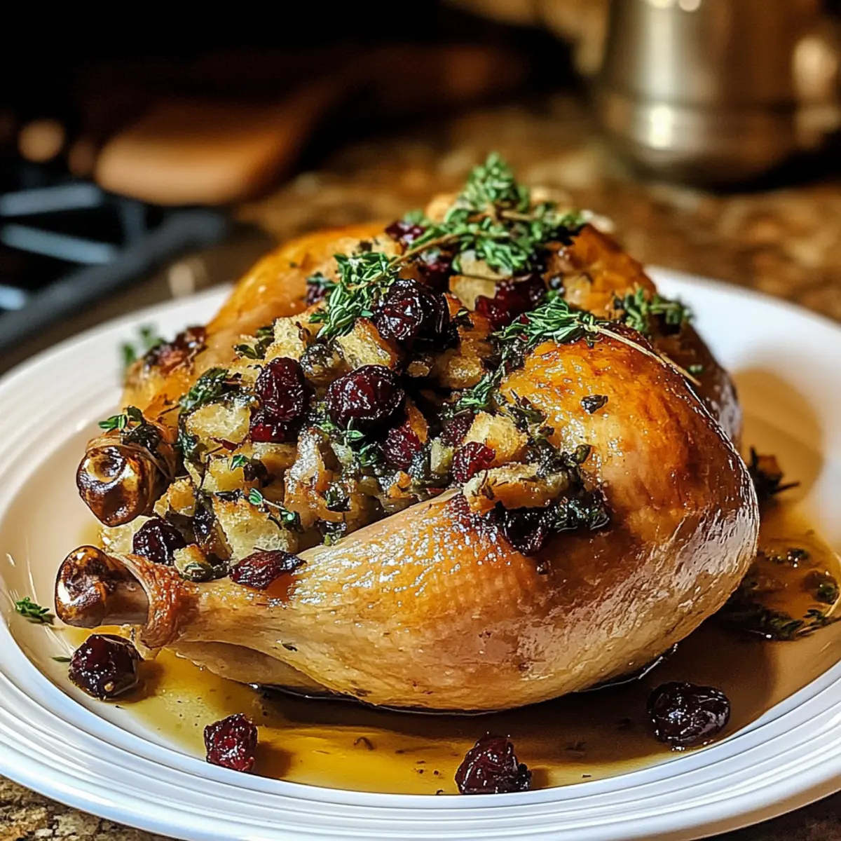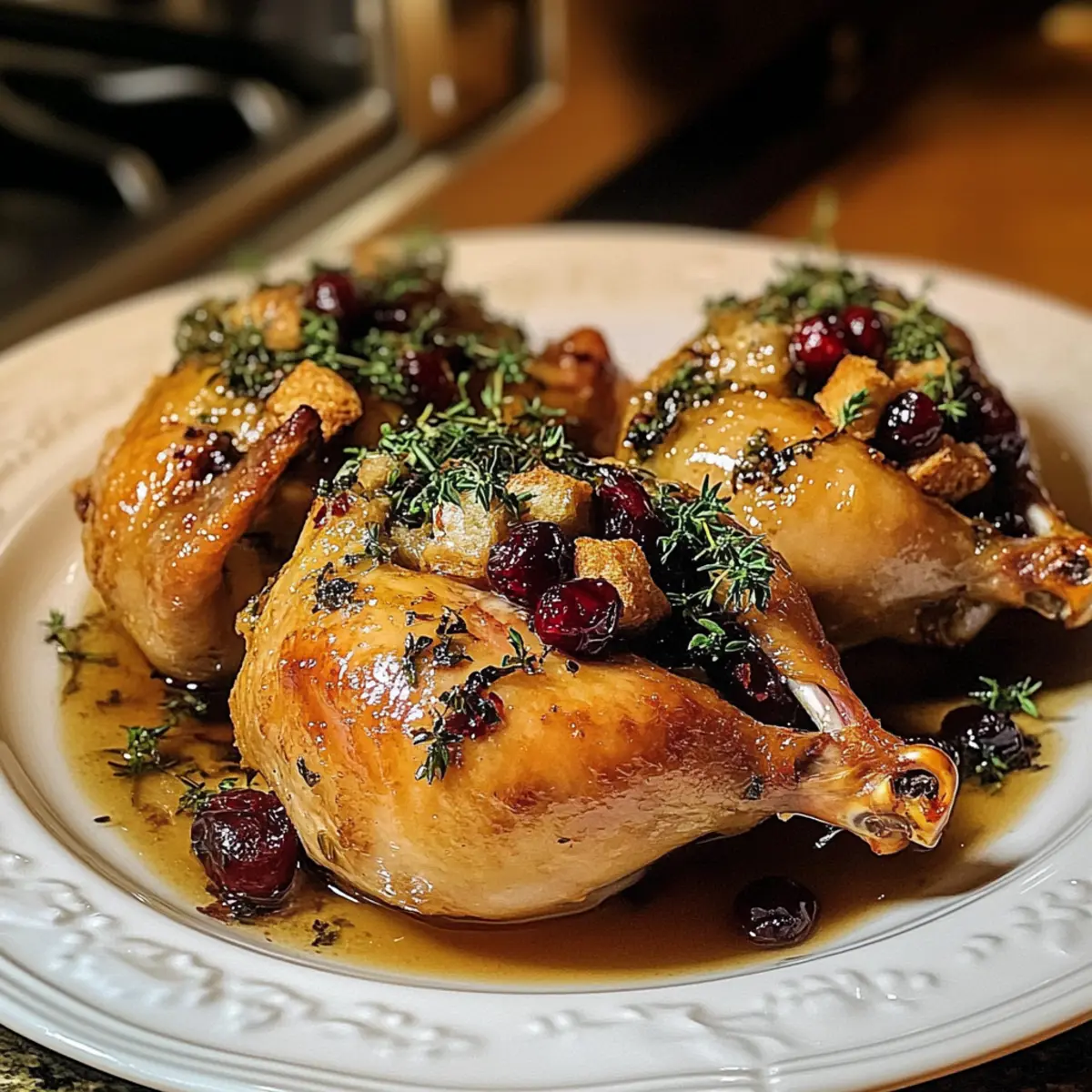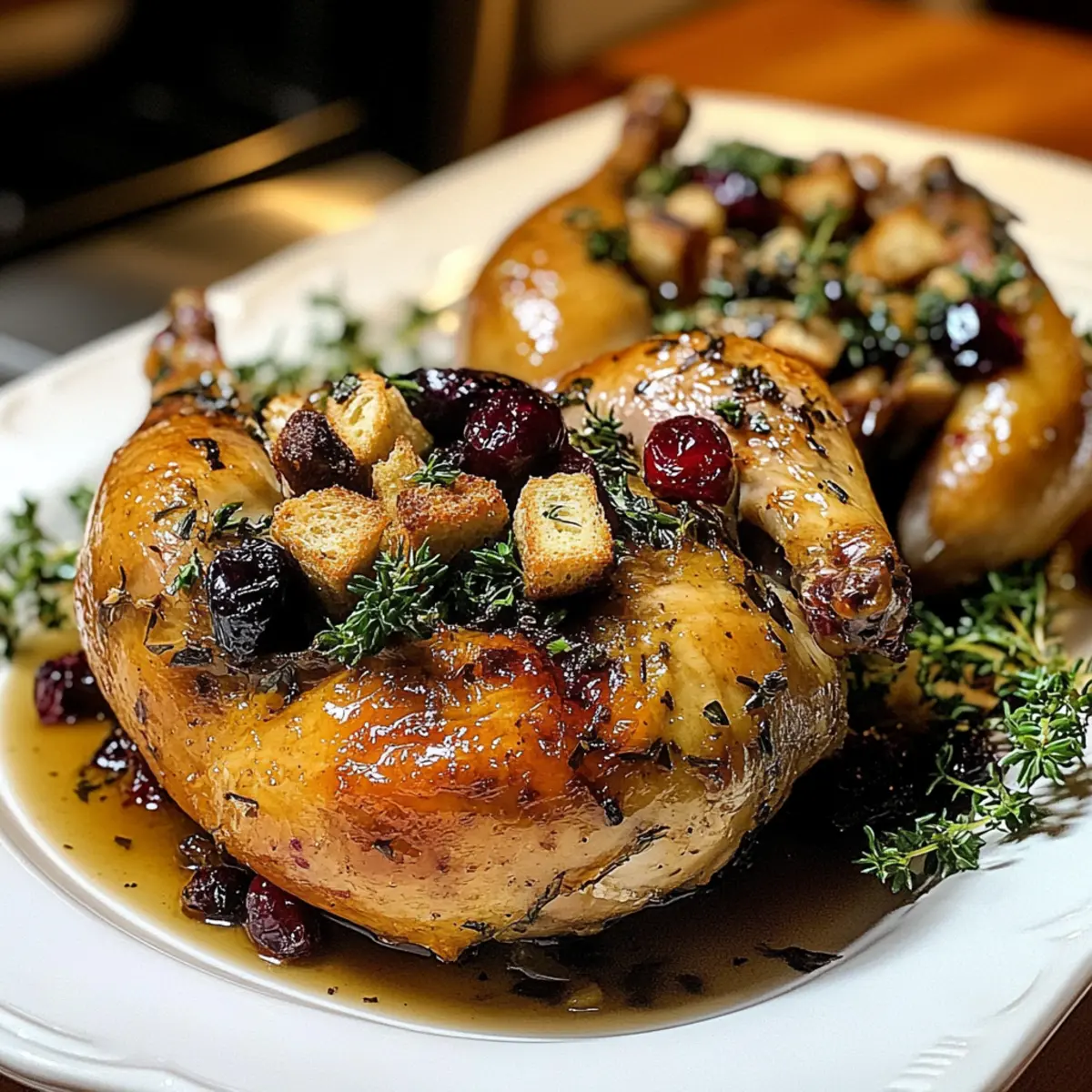 Eines der Geheimnisse, die ich bei der Zubereitung meiner eleganten gefüllten Cornish-Spielhühner entdeckt habe, ist die Kunst, geschmackvolle Zutaten in einem zarten Hühnerkörper zu vereinen. Diese kleine Delikatesse, umhüllt von knuspriger, goldbrauner Haut, eignet sich hervorragend für besondere Anlässe oder ein gemütliches Abendessen unter der Woche. Die Kombination aus herzhaftem Brot, süßen Cranberries und frischen Kräutern sorgt für ein wohltuendes Geschmackserlebnis, das sowohl Freude als auch Komfort in jeden Bissen bringt. Und das Beste: Diese gefüllten Spielhühner sind nicht nur ein Hingucker auf jedem Tisch, sondern auch schnell und einfach zuzubereiten. Wie könnte man nicht neugierig werden, was zu dieser köstlichen Harmonie aus Aromen führt? Warum sind gefüllte Cornish-Spielhühner so besonders? Eleganz auf dem Tisch: Diese gefüllten Cornish-Spielhühner sind nicht nur ein Fest für die Augen, sondern auch ein Gaumenschmaus! Vielseitigkeit punktet: Mit einfachen Variationen kannst du die Füllung nach deinem Geschmack anpassen – probiere zum Beispiel, die Cranberries durch Datteln zu ersetzen oder saisonale Kräuter zu verwenden. Zeitsparend: Schnell vorbereitet und köstlich gebacken, sind sie die ideale Wahl für ein spontanes Festmahl oder ein entspanntes Abendessen mit Freunden. Perfekte Textur: Saftiges Fleisch kombiniert mit einer knusprigen Haut und einer herzhaften Füllung. Diese Kombination macht jeden Bissen unwiderstehlich. Für etwas Abwechslung, serviere sie mit einem frischen Griechischer Krautsalat Gesund als Beilage! Wohlfühl-Faktor: Die Aromen von Brot, Kräutern und Cranberries machen die gefüllten Hühner zum Inbegriff eines gemütlichen Abendessens, das alle zusammenbringt. Gefüllte Cornish-Spielhühner Zutaten • Verwöhnen Sie Ihre Sinne mit diesen köstlichen gefüllten Cornish-Spielhühnern, die perfekt für festliche Anlässe sind. Für die Hühner Cornish-Spielhühner – Diese kleinen Hühner sorgen für zartes Fleisch und perfekte Portionen für Gourmet-Gerichte. Olivenöl oder geschmolzene Butter – Ideal zum Einreiben, um eine knusprige Haut zu erzielen; wähle das, was deinem Geschmack entspricht. Für die Füllung Brotwürfel – Sie bilden die Basis und saugen die köstlichen Aromen auf; du kannst auch glutenfreies Brot verwenden, wenn nötig. Zwiebel, gehackt – Verleiht der Füllung Süße und Tiefe; für einen milderen Geschmack können auch Schalotten verwendet werden. Sellerie – Bringt Crunch und Aroma; optional für eine reduzierte Füllung. Getrocknete Cranberries – Sorgen für eine perfekte Balance von Süße und Säure; sie lassen sich auch durch Rosinen oder gehackte Äpfel ersetzen. Nüsse (z.B. Pekannüsse oder Walnüsse) – Fügen zusätzliches Crunch und Reichtum hinzu; weglassen für eine nussfreie Option. Knoblauch, gehackt – Verstärkt den Geschmack; kann weggelassen werden, wenn du Knoblauch vermeidest. Hühnerbrühe – Hält die Füllung feucht; verwende Gemüsebrühe für eine vegetarische Variante. Geschmolzene Butter – Erhöht den Geschmack und hilft beim Bräunen der Füllung; auch Olivenöl ist eine gute Option. Gewürze Salz, schwarzer Pfeffer, Knoblauchpulver, Paprika, getrockneter Thymian – Unverzichtbar für den richtigen Geschmack; passe die Mengen nach persönlichem Geschmack an. Diese gefüllten Cornish-Spielhühner sind ein wahrer Genuss und garantieren ein elegantes Dinner-Erlebnis! Schritt-für-Schritt-Anleitung für Gefüllte Cornish-Spielhühner Step 1: Ofen vorheizen Heize deinen Ofen auf 190 °C vor. Lege ein Bratblech mit Alufolie oder Backpapier aus, um die Reinigung zu erleichtern. Diese Vorbereitung ist wichtig, um die gefüllten Cornish-Spielhühner gleichmäßig zu garen und eine schöne, goldbraune Haut zu erhalten. Step 2: Füllung zubereiten In einer großen Schüssel mische die Brotwürfel, gehackte Zwiebel, Sellerie, getrocknete Cranberries und Nüsse. Gib den gehackten Knoblauch hinzu und würze mit Salz, Pfeffer und anderen Gewürzen nach Geschmack. Gieße die Hühnerbrühe und die geschmolzene Butter darüber und vermenge alles gut, bis die Brotstücke gleichmäßig mit der Mischung durchtränkt sind. Step 3: Cornish-Spielhühner vorbereiten Nehme die gefrorenen Cornish-Spielhühner aus der Verpackung und tupfe sie gründlich mit Küchenpapier trocken. Reibe die Hühner mit Olivenöl oder geschmolzener Butter ein, um sicherzustellen, dass die Haut schön knusprig wird. Vergiss nicht, sie großzügig von allen Seiten zu würzen – dies sorgt für zusätzlichen Geschmack. Step 4: Hühner füllen Fülle jedes Cornish-Spielhuhn gleichmäßig mit der vorbereiteten Füllung. Wenn du möchtest, kannst du die Beine der Hühner mit Küchengarn zusammenbinden, um eine schöne Form zu behalten während des Garens. Achte darauf, nicht zu viel Füllung hineinzugeben, damit sie während des Kochens gleichmäßig gart. Step 5: Hühner braten Platziere die gefüllten Cornish-Spielhühner mit der Brustseite nach oben auf dem vorbereiteten Bratblech. Brate sie im vorgeheizten Ofen für etwa 50–60 Minuten. Überprüfe regelmäßig die Haut: Sie sollte goldbraun und knusprig sein. Step 6: Temperatur überprüfen Um sicherzustellen, dass die gefüllten Cornish-Spielhühner perfekt durchgegart sind, benutze ein Fleischthermometer. Die Innentemperatur sollte 75 °C erreichen, insbesondere am dicksten Teil des Schenkels. Dies garantiert, dass das Fleisch zart und saftig bleibt. Step 7: Ruhen lassen und servieren Lasse die gefüllten Cornish-Spielhühner nach dem Herausnehmen aus dem Ofen etwa 10 Minuten ruhen. Dieser Schritt ist wichtig, da er dazu beiträgt, die Säfte im Fleisch zu verteilen. Serviere die Hühner anschließend warm mit der köstlichen Füllung als Mittelpunkt deines Festmahls. Expertentipps für gefüllte Cornish-Spielhühner Fleischthermometer verwenden: Überprüfe die Temperatur im dicksten Teil des Schenkels, um sicherzustellen, dass das Huhn perfek