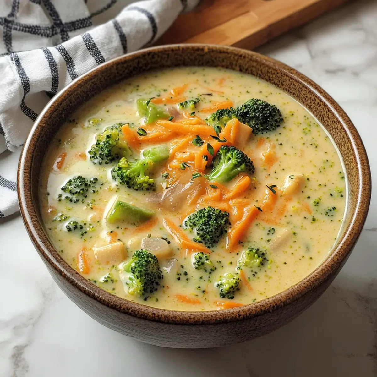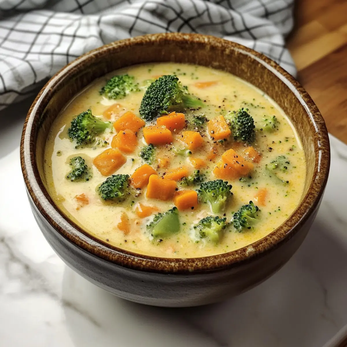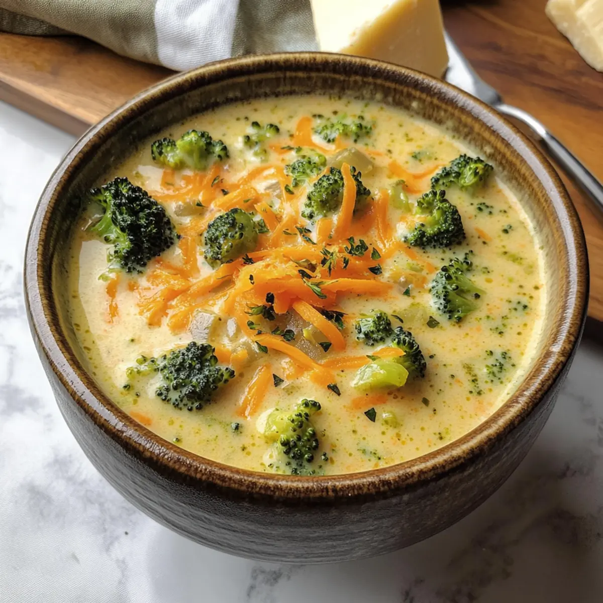 „Könnte ich nicht eine leichte Suppe zaubern?“ fragte ich mich, während ich durch meinen Kühlschrank stöberte. Als ich eine große Köpfe frischer Brokkoli und einen Rest rauchigen Gouda entdeckte, war die Antwort klar: Es musste eine Geräucherte Gouda Brokkoli Suppe werden! Dieses einfache, aber unglaublich köstliche Rezept ist der Inbegriff von Comfort Food – perfekt für hektische Wochentage, denn es ist in nur 30 Minuten fertig und wird in einem einzigen Topf zubereitet. Die cremige Textur und der vollmundige, rauchige Geschmack sorgen für ein unvergessliches Geschmackserlebnis, das sowohl viele Herzen als auch Bäuche wärmt. Bist du bereit, deine Küche in einen Ort voller köstlicher Aromastoffe zu verwandeln? Lass uns loslegen! Warum ist diese Suppe perfekt für dich? Einfache Zubereitung: Diese Suppe erfordert nur grundlegende Kochfähigkeiten und ist einfach in einem Topf zuzubereiten. Schnell und unkompliziert: In nur 30 Minuten hast du ein schmackhaftes Gericht, das perfekt für hektische Abende ist. Vielseitigkeit: Du kannst verschiedene Käsesorten ausprobieren und somit immer wieder neue Geschmäcker entdecken. Cremige Textur: Die Verbindung von rauchigem Gouda und frischem Brokkoli sorgt für eine unvergessliche Genusserfahrung. Ideal zum Teilen: Diese Suppe ist ein Hit bei Familie und Freunden – perfekt für gesellige Abende oder als Vorspeise. Mach dich bereit, mit deinem eigenen Rezept für Geräucherte Gouda Brokkoli Suppe jeden Gast zu begeistern! Geräucherte Gouda Brokkoli Suppe Zutaten • Mach dich bereit für eine Geschmacksexplosion! Für die Basis: Ungesalzene Butter – Verleiht der Suppe einen reichen Geschmack; kann durch Olivenöl für eine leichtere Variante ersetzt werden. Zwiebel (1 mittelgroß, gewürfelt) – Verstärkt das Grundaroma der Suppe; kein Ersatz erforderlich, doch Schalotten geben einen süßeren Geschmack. Knoblauch (2 Zehen, gehackt) – Fügt ein aromatisches Element hinzu; Knoblauchpulver (1/2 Teelöffel) kann im Notfall verwendet werden. Weißes Mehl (1/4 Tasse) – Verdickt die Suppe; glutenfreies Mehl kann für eine glutenfreie Version genutzt werden. Brühe (480 ml, Gemüse oder Huhn) – Bildet die Geschmacksbasis der Suppe; passe die Würze je nach Brühe an. Vollmilch (480 ml) – Sorgt für Cremigkeit; kann durch Schlagsahne für eine dickere Konsistenz oder durch Halbrahm für ein ausgewogenes Verhältnis verwendet werden. Für den Geschmack: Salz (1/2 Teelöffel) – Hebt den Gesamtgeschmack hervor; nach Geschmack verwenden, insbesondere bei Verwendung von natriumarmer Brühe. Paprika (1/2 Teelöffel) – Bringt Wärme und subtile Rauchigkeit; rauchige Paprika sorgt für einen intensiveren Geschmack. Pfeffer (1/4 Teelöffel) – Verleiht eine milde Schärfe; nach Belieben anpassen. Für das Gemüse: Brokkoli (1 großer Kopf, in kleine Röschen geschnitten) – Hauptgemüsebestandteil; gleichmäßiges Schneiden sorgt für gleichmäßiges Garen. Karotte (1 große, gerieben) – Fügt Süße und Farbe hinzu; keine Ersatzstoffe erforderlich, aber andere Wurzelgemüse können für Abwechslung hinzugefügt werden. Für die Cremigkeit: Geräucherter Gouda (240 g, frisch gerieben) – Verleiht der Suppe ihren charakteristischen rauchigen Geschmack; kann durch Cheddar, Gruyere oder Monterey Jack ersetzt werden, jedoch ist frisch gerieben wichtig, um Texturprobleme zu vermeiden. Lass uns diese köstliche Geräucherte Gouda Brokkoli Suppe bald zubereiten! Schritt-für-Schritt-Anleitungen für Geräucherte Gouda Brokkoli Suppe Step 1: Butter schmelzen Erhitze in einem großen Kochtopf bei mittlerer Hitze die ungesalzene Butter. Lass sie schmelzen, bis sie leicht schäumt, was etwa 2 Minuten dauert. Achte darauf, dass die Butter nicht bräunt. Dies bildet die aromatische Basis für deine gemütliche Geräucherte Gouda Brokkoli Suppe. Step 2: Zwiebel und Knoblauch anbraten Gebe die gewürfelte Zwiebel in den Topf und brate sie etwa 4 Minuten lang an, bis sie glasig und duftend ist. Füge dann den gehackten Knoblauch hinzu und koche diesen für 30 Sekunden weiter. Dies gibt der Suppe eine köstliche aromatische Tiefe. Step 3: Mehl einrühren Streue das weiße Mehl über die Zwiebel-Knoblauch-Mischung und rühre gut um, um eine Paste zu bilden. Lasse diese Mischung für etwa 1 Minute kochen. Dies hilft, die Suppe zu verdicken und sorgt für eine cremige Konsistenz. Step 4: Brühe und Milch hinzufügen Gieße langsam die Brühe und die Vollmilch in den Topf und verrühre alles gut. Achte darauf, klumpenfreies Mehl zu gewährleisten. Würze mit Salz, Paprika und Pfeffer und bringe die Mischung zum Kochen. Die Grundlage für die Geräucherte Gouda Brokkoli Suppe ist jetzt bereit! Step 5: Gemüse hinzufügen Füge die kleinen Brokkoliröschen und die geriebene Karotte in den Topf. Rühre alles sorgfältig um, um das Gemüse gleichmäßig zu verteilen, und bringe die Suppe zum Simmern. Das Gemüse wird in der nächsten Phase zart und aromatisch. Step 6: Kochen lassen Decke den Topf mit einem Deckel ab, reduziere die Hitze auf niedrig und lasse die Suppe 10-12 Minuten kochen, bis das Gemüse gar ist und sich leicht mit einer Gabel zerdrücken lässt. Überprüfe den Brokkoli, um sicherzustellen, dass er zart, aber nicht matschig ist – das macht die Suppe perfekt. Step 7: Käse einrühren Nimm den Topf vom Herd und füge langsam den frisch geriebenen rauchigen Gouda hinzu. Rühre gut um, bis der Käse vollständig geschmolzen ist und eine cremige, seidige Textur entsteht. Diese Zutat verleiht der Suppe den charakteristischen rauchigen Geschmack, der sie so besonders macht. Step 8: Servieren Serviere die Geräucherte Gouda Brokkoli Suppe warm in Schalen und garniere sie nach Belieben mit knusprigen Croutons oder frischen Kräutern. Genieße dieses köstliche, cremige Gericht, das perfekt für eine angenehme Mahlzeit ist! Vorbereitung der Geräucherte Gouda Brokkoli Suppe Die Geräucherte Gouda Brokkoli Suppe ist perfekt für die Mea