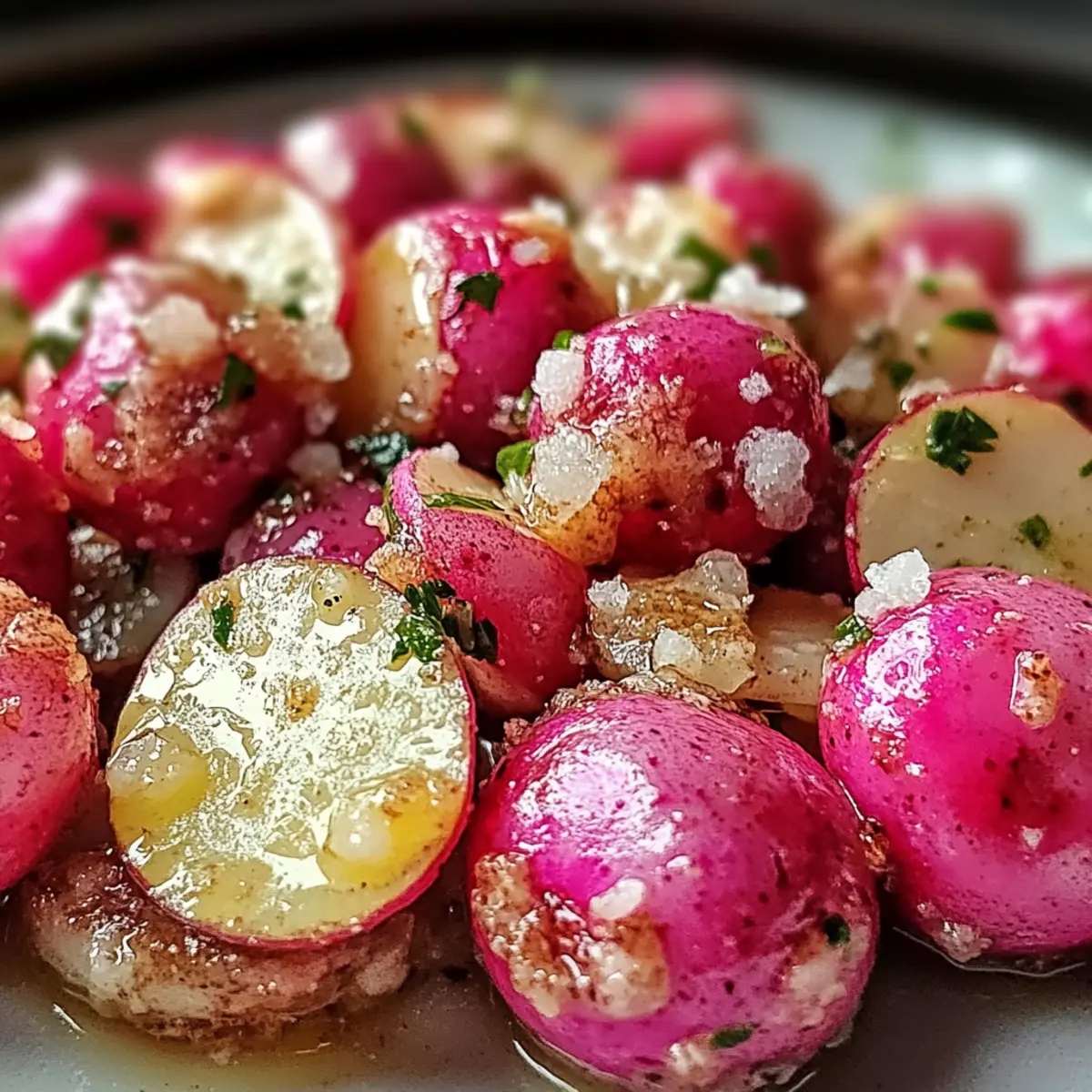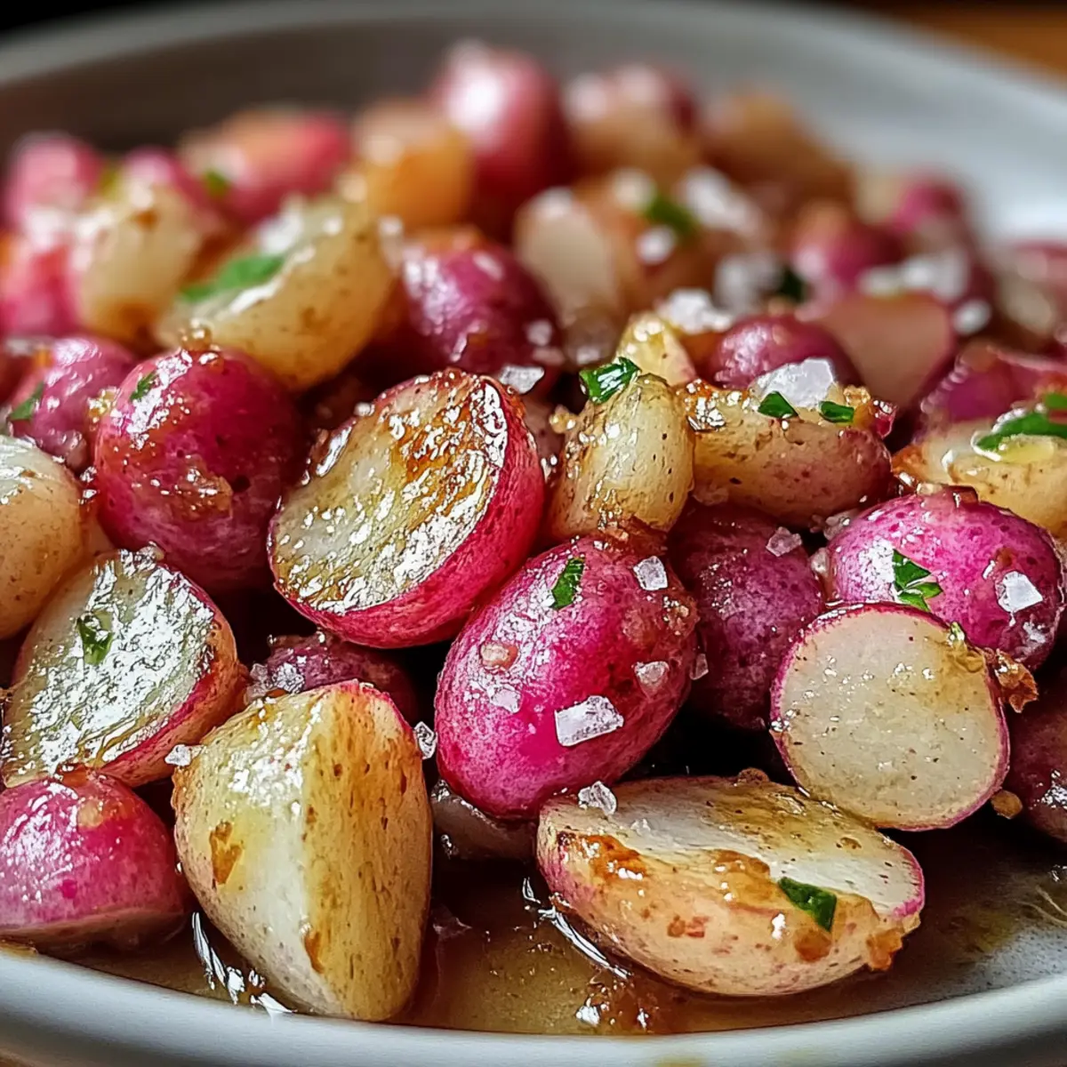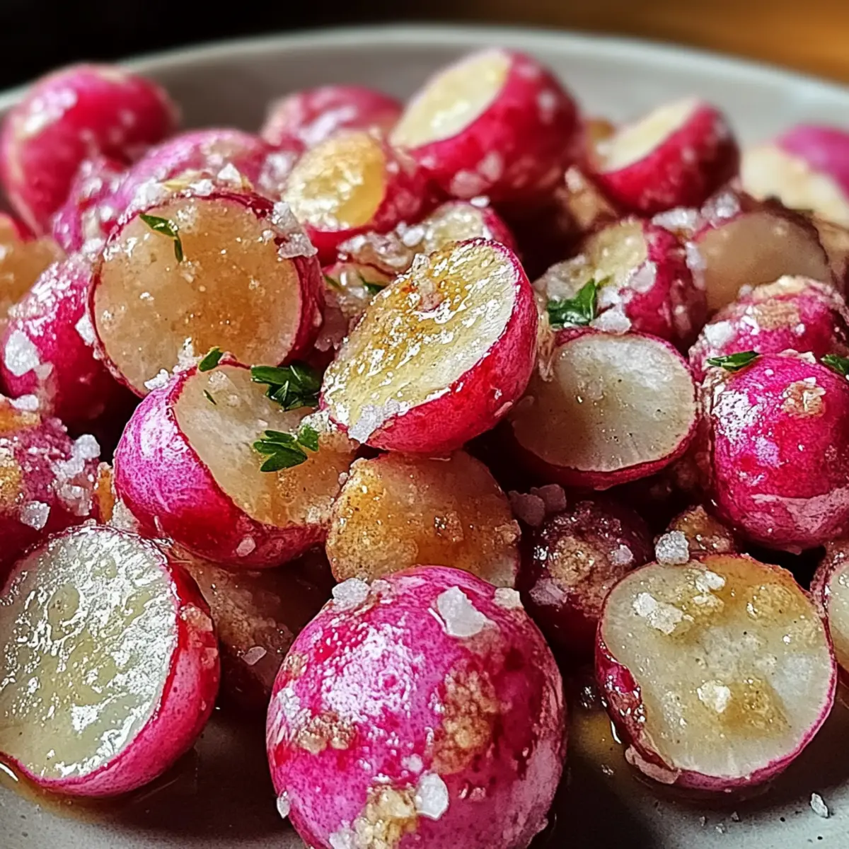 Als ich neulich in der Küche stand, fiel mir auf, wie wenig wir oft die schönen, kleinen Radieschen beachten. Diese oft übersehenen Wurzeln haben das Potenzial, sich in ein einfaches, aber unglaublich schmackhaftes Gericht zu verwandeln: Geröstete Radieschen mit Butter und Meersalz. Ihre knackige Textur verwandelt sich beim Rösten in eine zarte Köstlichkeit mit goldbraunen Rändern, während der Duft von geschmolzener Butter den Raum erfüllt. Dieses Rezept ist nicht nur schnell zubereitet, sondern auch ein wunderbares gesundes Low-Calorie-Beilage, die es schafft, die natürliche Süße der Radieschen zur Geltung zu bringen. Du wirst staunen, wie einfach es ist, diese Wurzelgemüse in ein Gourmet-Erlebnis zu verwandeln! Bist du bereit, deiner Küche einen Hauch von Raffinesse zu verleihen? Warum sind geröstete Radieschen so besonders? Einfachheit, die begeistert: Dieses Rezept ist einfach und benötigt keine besonderen Kochkünste. Gesunder Genuss: Mit frischen Radieschen und hochwertiger Butter erhältst du eine kalorienbewusste Beilage. Vielseitigkeit: Ergänze die Radieschen nach Belieben mit Kräutern wie Thymian oder Dill für zusätzlichen Geschmack. Schnell zubereitet: In nur 25 Minuten zauberst du dieses köstliche Gericht. Echter Geschmack: Der Kontrast von zarter Innenseite und knusprigen Rändern wird jeden Gaumen erfreuen. Egal ob zu gegrilltem Fisch oder Rinderrouladen Enoki Pilze, diese Beilage wird zur kulinarischen Entdeckung! Geröstete Radieschen Zutaten • Für alle Liebhaber der gerösteten Radieschen mit Butter und Meersalz! Für die Radieschen Frische Radieschen – Achte darauf, sie gut zu waschen, um eventuelle Erde zu entfernen. Butter – Verleiht dem Gericht eine reichhaltige Note; für eine leichtere Alternative kann auch Olivenöl verwendet werden. Für die Würze Flaky Sea Salt – Hebt den natürlichen Geschmack der Radieschen hervor; verwende hochwertiges Meersalz für das beste Ergebnis. Schwarzer Pfeffer (optional) – Schenkt dem Gericht eine leichte Schärfe; nach Geschmack verwenden. Für die Extras Frische Kräuter (optional) – Empfohlen für mehr Frische; Thymian und Dill passen besonders gut. Zitrusabrieb (optional) – Für einen frischen Kick; Zitronen- oder Orangenzest verleiht ein tolles Aroma und Geschmack. Schritt-für-Schritt-Anleitung für Geröstete Radieschen mit Butter und Meersalz Schritt 1: Radieschen vorbereiten Wasche die frischen Radieschen gründlich, um eventuelle Erde zu entfernen, insbesondere nahe den Stielen. Schneide die grünen Spitzen und die Wurzeln ab. Halbiere oder viertel die Radieschen, sodass alle Stücke möglichst gleich groß sind, um ein gleichmäßiges Garen zu gewährleisten. Schritt 2: Butter schmelzen In einer kleinen Pfanne bei niedriger Hitze die Butter sanft schmelzen, bis sie vollständig flüssig ist, aber nicht bräunt. Achte darauf, dass die Butter nicht zu heiß wird, um ihre köstliche, cremige Textur zu bewahren, die später den Radieschen ihren herrlichen Glanz verleiht. Schritt 3: Zutaten mischen Gib die vorbereiteten Radieschen in eine große Schüssel und füge die geschmolzene Butter hinzu. Streue großzügig mit Meersalz und nach Belieben mit schwarzem Pfeffer und optionalen frischen Kräutern. Mische alles gut, sodass die Radieschen gleichmäßig mit Butter und Gewürzen überzogen sind. Schritt 4: Ofen vorheizen Heize den Ofen auf 220°C (425°F) vor. Lege ein Backblech mit Backpapier aus, um ein Ankleben der Radieschen zu verhindern und das Putzen zu erleichtern. Die hohe Temperatur sorgt dafür, dass die Radieschen beim Rösten schön karamellisieren und goldbraun werden. Schritt 5: Auf dem Backblech anrichten Verteile die gewürzten Radieschen gleichmäßig auf dem Backblech, wobei die Schnittseiten nach unten zeigen. Dadurch erzielst du eine optimale Karamellisierung und Röstaromen, die den Geschmack der Radieschen intensivieren. Schritt 6: Rösten Backe die Radieschen ca. 20–25 Minuten lang im vorgeheizten Ofen, bis sie zart und leicht goldbraun sind. Wende sie nach etwa der Hälfte der Garzeit, damit sie gleichmäßig garen und schön kross werden. Achte darauf, dass sie nicht zu dunkel werden. Schritt 7: Fertigstellen und servieren Nimm das Blech aus dem Ofen und streue nach Belieben zusätzliches Meersalz und die optionalen frischen Kräuter oder Zitrusabrieb darüber. Serviere die gerösteten Radieschen sofort, während sie noch warm sind, und genieße diese einfach köstliche Beilage zu deinen Lieblingsgerichten! Expertentipps für Geröstete Radieschen Einfache Vorbereitung: Achte darauf, die Radieschen gleichmäßig zu schneiden. Unregelmäßige Stücke führen zu ungleichmäßigem Garen und können harte Teile hinterlassen. Perfekte Butter: Lass die Butter beim Schmelzen niemals bräunen. Übermäßige Hitze kann den Geschmack beeinträchtigen und macht die Butter bitter. Karamellisierung maximieren: Lege die Radieschen mit der Schnittseite nach unten auf das Backblech. So entwickeln sie die köstliche, goldbraune Karamellschicht. Timing beachten: Wende die Radieschen während des Garens, um eine gleichmäßige Röstung zu gewährleisten. Kleinere Radieschen benötigen oft weniger Zeit als größere. Reste aufbewahren: Lagere die übrig gebliebenen gerösteten Radieschen in einem luftdichten Behälter im Kühlschrank. Für die beste Textur, erwärme sie im Ofen, nicht in der Mikrowelle. Variationen & Alternativen für Geröstete Radieschen Lass deiner Kreativität freien Lauf und passe dieses Rezept nach deinem Geschmack an! Gesunde Variante: Verwende Olivenöl anstelle von Butter für eine leichte, pflanzliche Option, die trotzdem köstlich schmeckt. Aromatische Ergänzung: Füge ganze Knoblauchzehen in der Schale hinzu, um während des Röstens einen unverwechselbaren Geschmack zu erzielen. Würzige Note: Streue vor dem Rösten geräucherten Paprika, Thymian oder Rosmarin über die Radieschen für eine exzellente Geschmackstiefe. Fruchtige Frische: Gib nach dem Rö