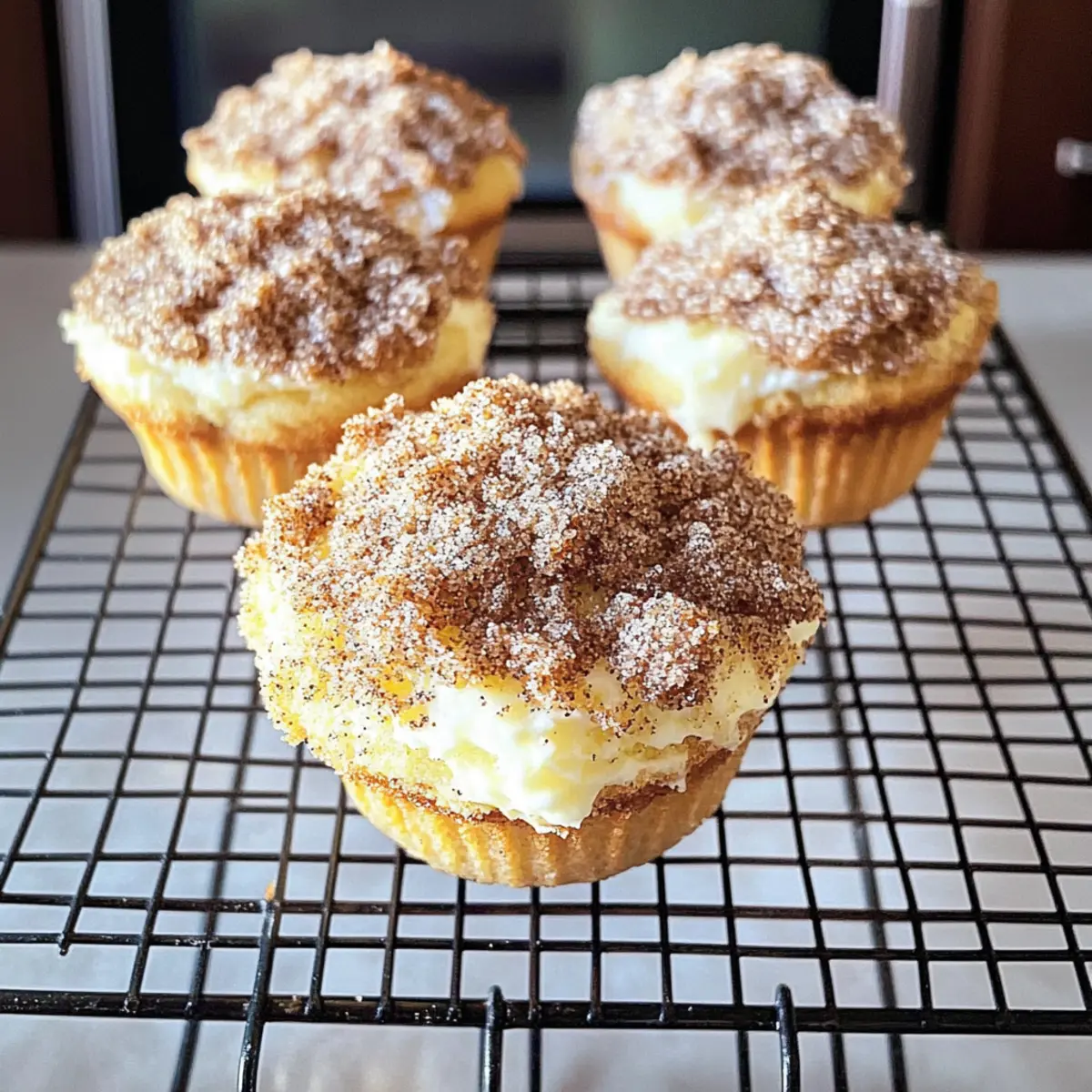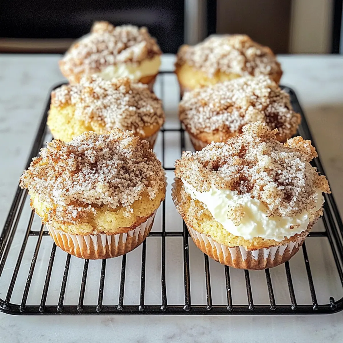 Genießen Sie glutenfreie Muffins, die mit Frischkäse gefüllt und mit einem Zimt-Streusel-Topping bedeckt sind.