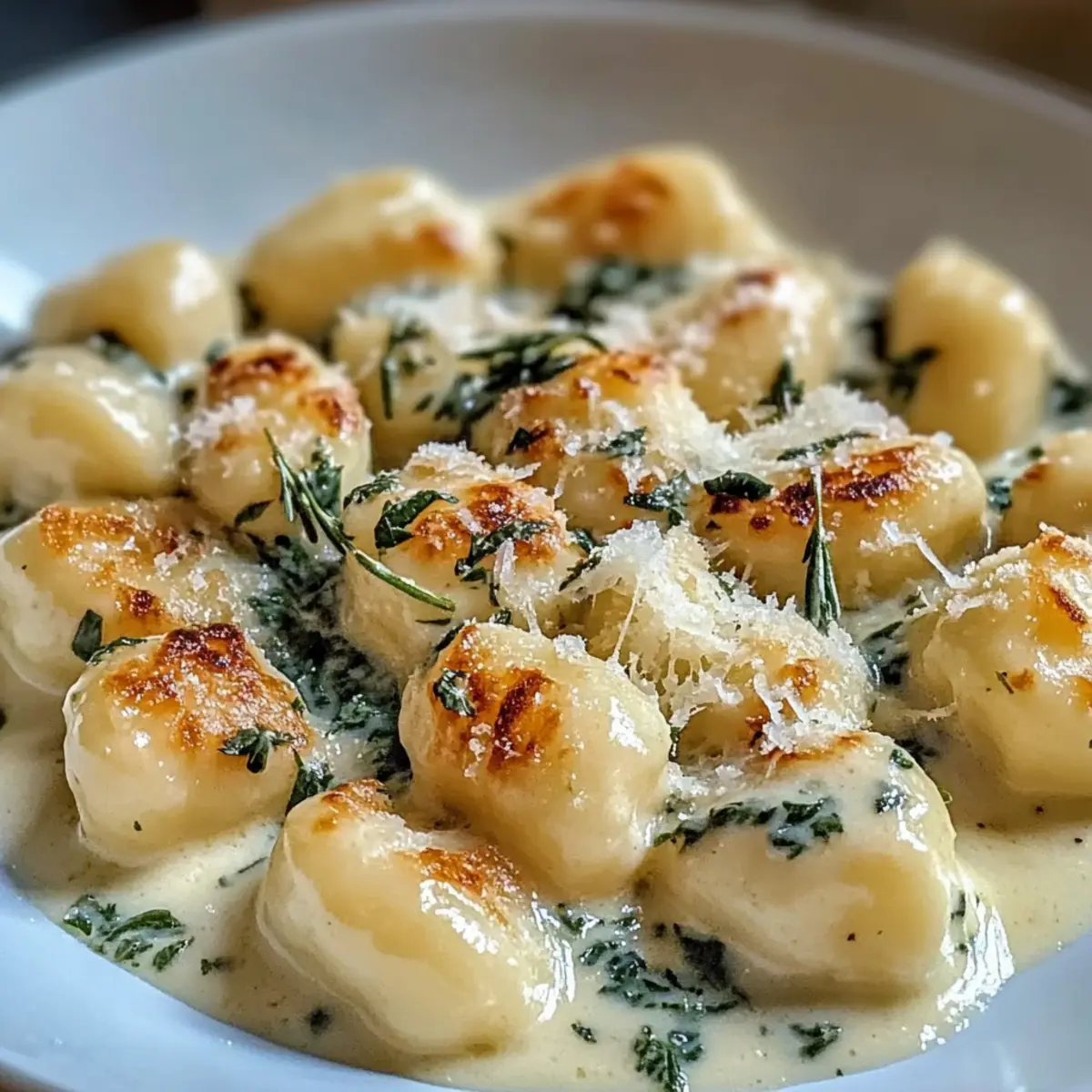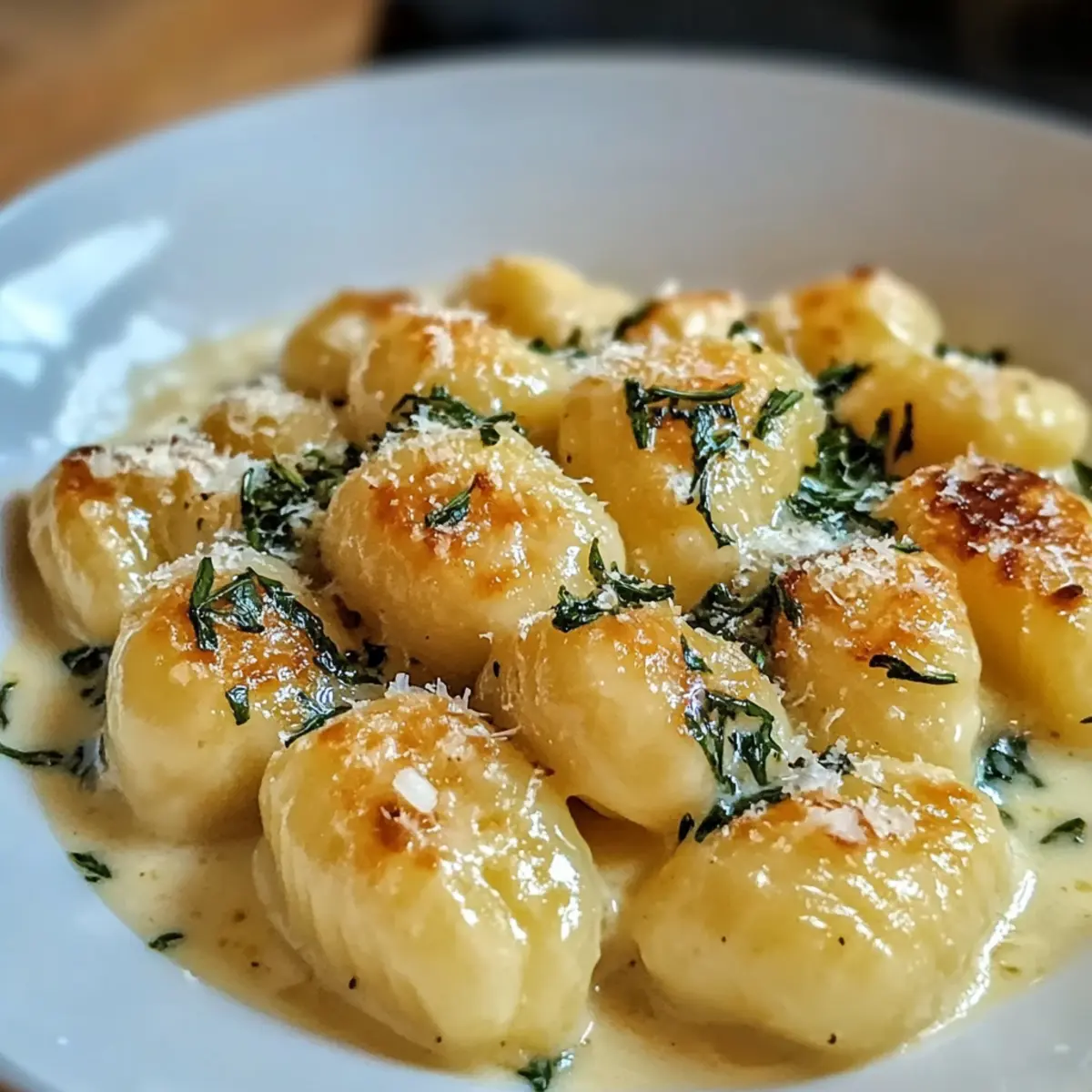 6. Servieren Sie die Gnocchi mit cremiger Sauce heiß auf einem Teller und garnieren Sie das Gericht nach Wunsch.