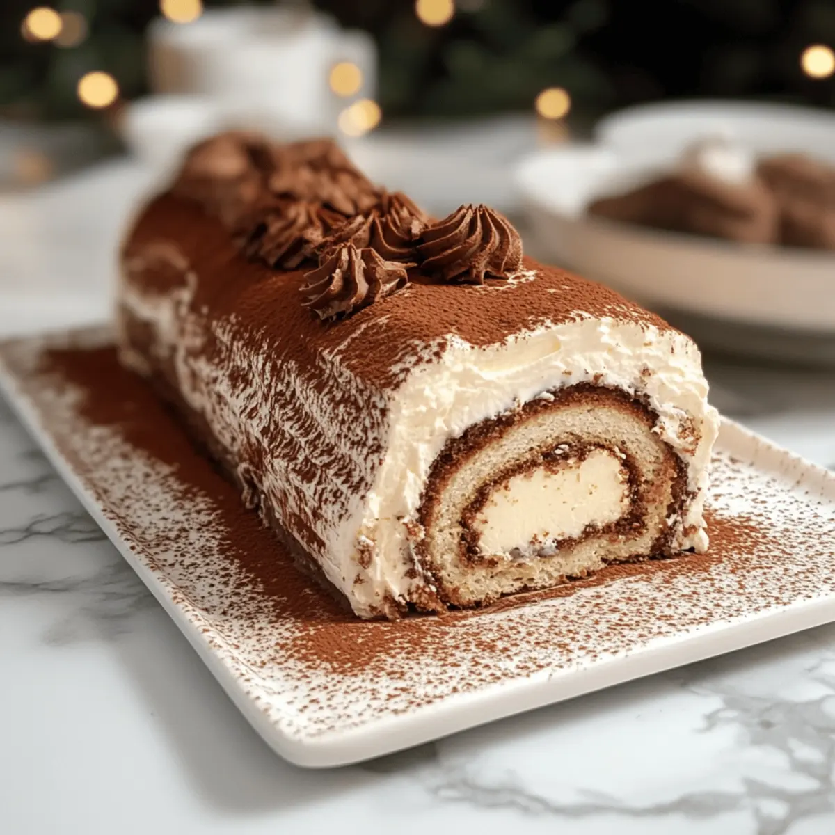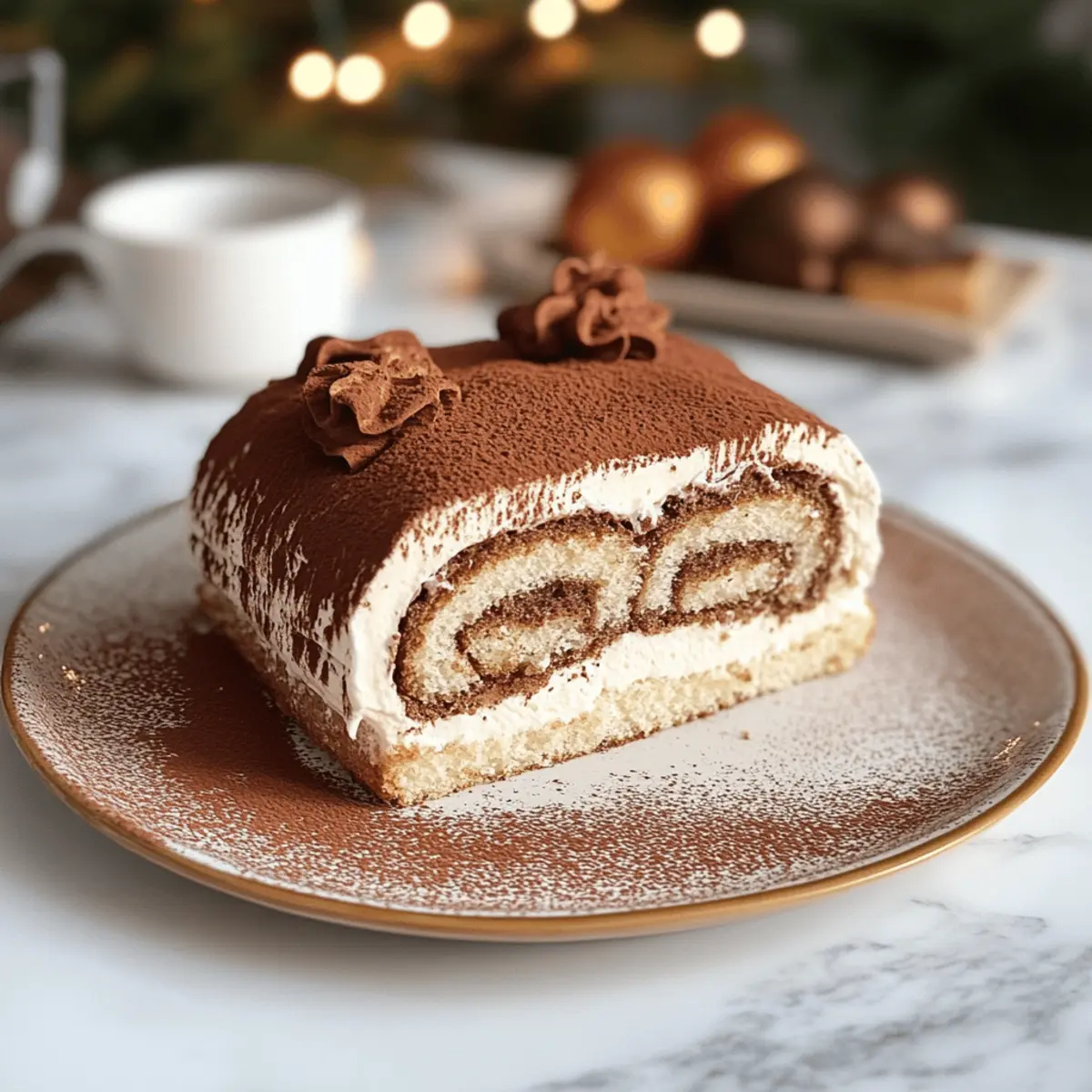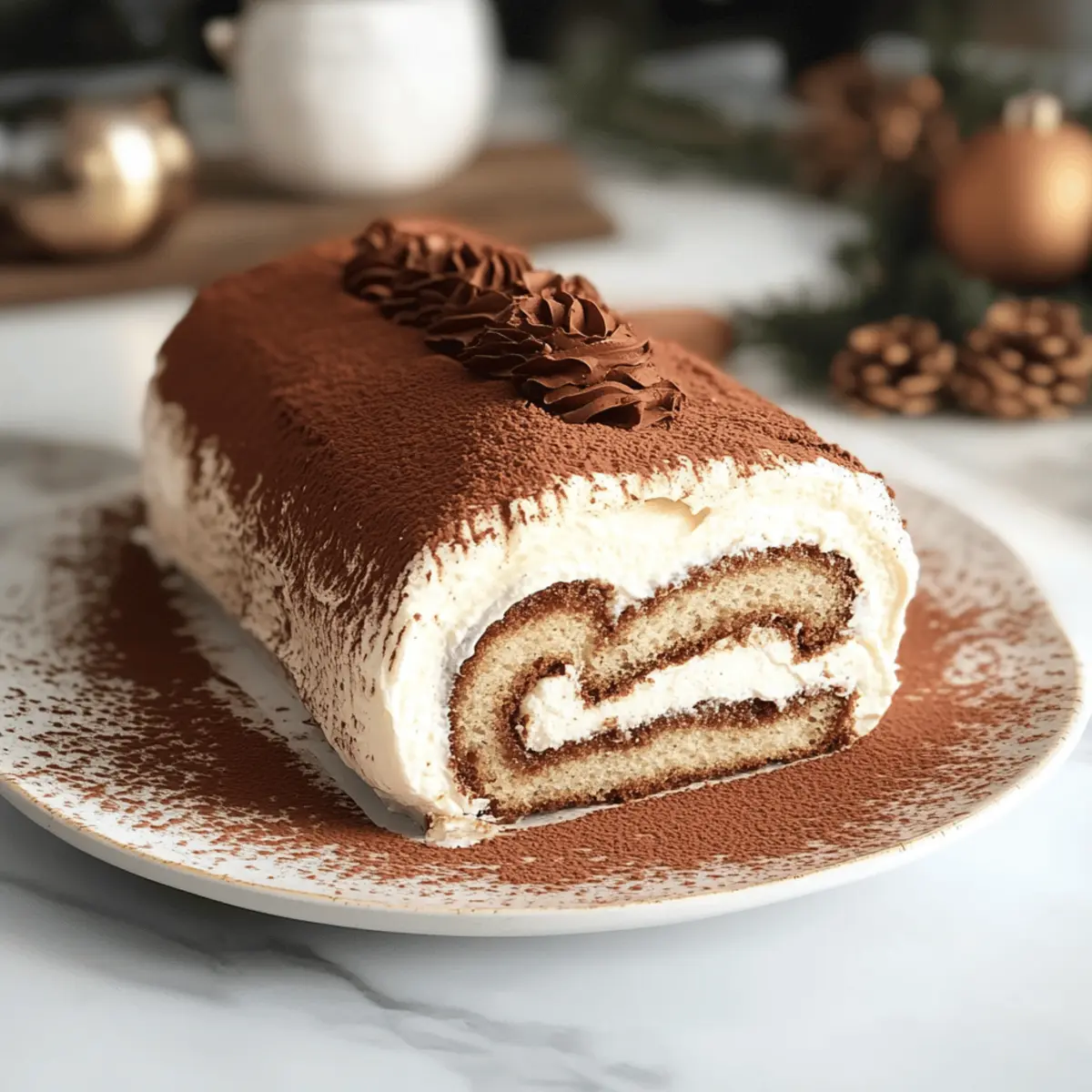Als ich das letzte Mal bei einer festlichen Feier war, wagte ich mich in die Küche, um einen echten Hingucker zu kreieren – die Gourmet Tiramisu Yule Log Cake! Diese Weihnachtsversion des klassischen Tiramisus vereint luftigen Kaffeegenuss und cremige Mascarponefüllung in einem kunstvoll gerollten Kuchen. Was ich an diesem Rezept besonders liebe, ist nicht nur die einfache Zubereitung, sondern auch die Möglichkeit, glutenfreie Variationen zu entdecken, die alle Gäste begeistern werden. Ganz gleich, ob als köstliches Dessert nach dem Festessen oder als süße Überraschung beim Kaffeeklatsch, dieser Log Cake bringt festliche Stimmung auf den Tisch. Bist du bereit für ein Dessert, das nicht nur lecker aussieht, sondern auch einfach zuzubereiten ist? Warum wirst du diesen Kuchen lieben? Einfachheit: Die Zubereitung ist unkompliziert, sodass auch Kochanfänger Freude daran haben werden. Vielfältige Optionen: Du kannst glutenfreie Alternativen verwenden, um sicherzustellen, dass alle Gäste ihn genießen können. Wunderbarer Geschmack: Die Kombination aus Kaffee und Mascarpone sorgt für ein unvergleichliches Geschmackserlebnis. Festliche Anziehungskraft: Dieser Kuchen ist ein echter Hingucker und perfekt für Feiertage oder besondere Anlässe. Wenn du auf der Suche nach mehr inspirierenden Rezepten bist, schau dir unser Erdbeer Shortcake Puppy an! Zutaten für die Gourmet Tiramisu Weihnachtsbaumrolle • Für den Kuchen • Weizenmehl – sorgt für Struktur; kann mit Mandel- oder Kokosmehl ersetzt werden, um eine glutenfreie Variante zu erhalten (Menge um 25 % reduzieren und einen Bindemittel wie Xanthan gumu hinzufügen). • Espressopulver – fügt den köstlichen Kaffeegeschmack hinzu; kann durch gebrühten Kaffee oder aufgelöste Instantkaffeekristalle ersetzt werden, wobei die Flüssigkeitsmenge angepasst werden muss. • Eiweiß – trägt zur leichten, luftigen Textur bei; darauf achten, dass sie bis zu mittleren Spitzen geschlagen werden. • Eigelb & Ganze Eier – sorgen für Feuchtigkeit und Reichhaltigkeit; bis zur „Röhren-Stufe“ schlagen für die beste Textur. • Zucker – süßt den Kuchen und stabilisiert die Eiweiße; variiert je nach Verwendung in Eimischungen und der Cremefüllung. • Kakaopulver – wird zum Bestäuben und für den Geschmack verwendet; verstärkt den schokoladigen Geschmack des fertigen Kuchens. • Für die Füllung • Mascarpone – ist die Hauptzutat für eine cremige Füllung; kann durch Frischkäse und Schlagsahne im Verhältnis 3:1 ersetzt werden. • Schlagsahne – wird für die Textur der Füllung geschlagen; kann durch Kokoscreme als pflanzliche Option ersetzt werden. • Vanilleextrakt – verbessert den Gesamtgeschmack. • Kaffeelikör – fügt der Füllung Tiefe hinzu; optional. Diese Zutaten werden deine Gäste begeistern, besonders die glutenfreien Optionen, um die Gourmet Tiramisu Weihnachtsbaumrolle jeder Feier anzupassen. Schritt-für-Schritt-Anleitung für die Gourmet Tiramisu Weihnachtsbaumrolle Schritt 1: Ofen vorheizen Heize den Ofen auf 200 °C (400 °F) vor und bereite ein Backblech mit Backpapier vor. Stelle sicher, dass das Backpapier glatt auf dem Blech liegt, um ein Ankleben des Kuchens zu verhindern. Diese ersten Schritte sind entscheidend für den perfekten Start deiner Gourmet Tiramisu Weihnachtsbaumrolle. Schritt 2: Zutaten sieben Siebe das Weizenmehl zusammen mit dem Espressopulver in eine Schüssel, um Klumpen zu vermeiden und die Zutaten gut zu vermischen. Beiseite stellen, während du die anderen Schritte durchführst. Dies sorgt für eine gleichmäßige Verteilung des Geschmacks und die notwendige Leichtigkeit des Kuchens. Schritt 3: Eiweiß schlagen Schlage die Eiweiße in einer großen Schüssel mit einem Handmixer, bis sie schaumig sind. Füge nach und nach den Zucker hinzu und schlage weiter, bis steife Spitzen entstehen. Dies dauert etwa 3-5 Minuten. Diese schaumige Masse bringt die notwendige Luftigkeit, die der Weihnachtsbaumrolle ihre besondere Textur verleiht. Schritt 4: Eigelb und Zucker schlagen In einer anderen Schüssel die Eigelbe zusammen mit den ganzen Eiern und dem Zucker auf hoher Stufe schlagen, bis die Mischung dick und hellgelb ist, was ungefähr 5-10 Minuten dauert. Auf die „Röhren-Stufe“ achten, da dies für die perfekten Ergebnisse der Tiramisu Weihnachtsbaumrolle entscheidend ist. Schritt 5: Eischnee unterheben Falte vorsichtig die geschlagenen Eiweiße in die Eigelbmasse in drei Portionen. Achte darauf, dies sanft zu tun, um die Luftigkeit nicht zu verlieren. Diese Methode hilft dabei, die Tiramisu Weihnachtsbaumrolle leicht und fluffig zu machen, was den Genuss noch verstärkt. Schritt 6: Mehlmischung einarbeiten Falte die gesiebte Mehlmischung sanft unter die Eiermasse, bis sie gerade so kombiniert ist. Vermeide zu viel Rühren, da dies die Struktur des Kuchens beeinträchtigen kann. Der Teig sollte leicht und luftig erscheinen und bereit sein, gebacken zu werden. Schritt 7: Backen Gieße den Teig gleichmäßig auf das vorbereitete Backblech und klopfe es leicht auf die Arbeitsfläche, um Luftblasen zu entfernen. Backe die Mischung 8-10 Minuten lang oder bis sie leicht goldbraun ist und die Oberfläche elastisch reagiert. Achte darauf, dass der Kuchen nicht zu lange im Ofen bleibt, um Trockenheit zu vermeiden. Schritt 8: Abkühlen und rollen Nehme das Blech aus dem Ofen und bestäube sofort die Oberfläche des Kuchens mit Kakaopulver. Rolle den warmen Kuchen vorsichtig mit dem Backpapier von der langen Seite her auf und lass ihn vollständig abkühlen. Diese Technik hilft, die Form der Tiramisu Weihnachtsbaumrolle beizubehalten. Schritt 9: Füllung vorbereiten Schlage die Schlagsahne zusammen mit dem Puderzucker, dem Vanilleextrakt und dem optionalen Kaffeelikör, bis weiche Spitzen entstehen. Füge dann den Mascarpone hinzu und falte alles vorsichtig zusammen, bis eine homogene Füllung entsteht. Diese köstliche Füllung wird deinem Kuchen seinen reichen Geschmack