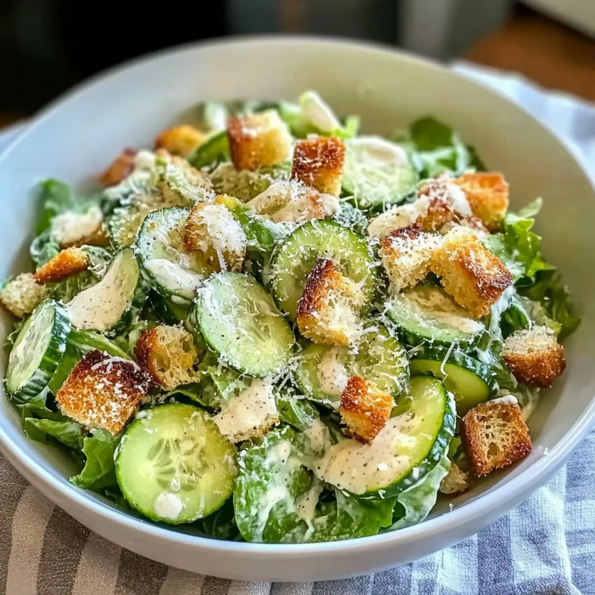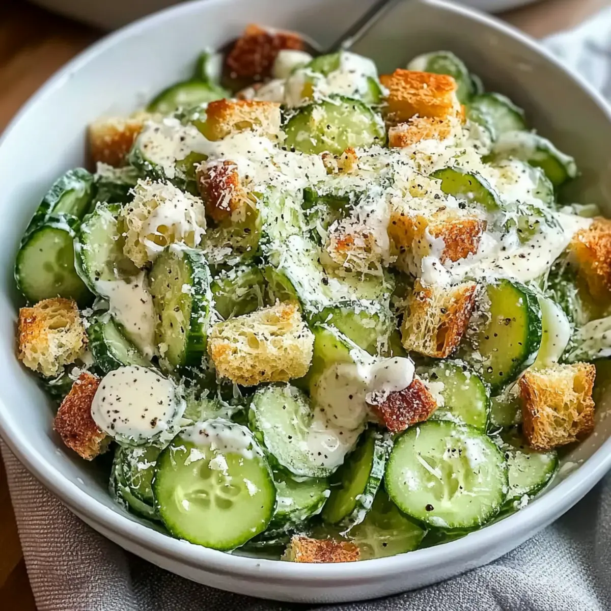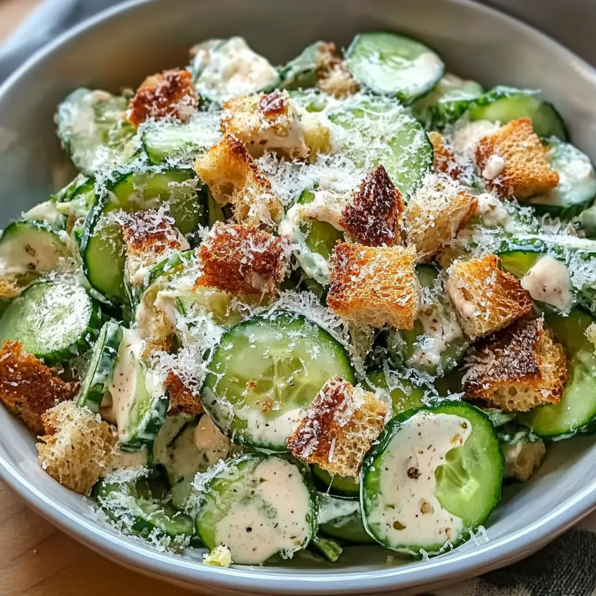 An heißen Sommertagen, wenn der Appetit nach etwas Leichtem und Erfrischendem verlangt, ist mein Gurken-Caesar-Salat genau das Richtige. Diese moderne Variante kombiniert die knackige Frische von Gurken mit einer cremigen, würzigen Caesar-Dressing, das den klassischen Geschmack auf schöne Weise aufgreift. Der Salat ist nicht nur schnell zubereitet und perfekt für ein leichtes Mittagessen geeignet, sondern bietet auch zahlreiche Variationsmöglichkeiten, die jeden Gaumen erfreuen. Ob vegan oder klassisch mit Parmesan – dieser Salat ist so vielseitig, dass ich ihn immer wieder gerne auf den Tisch bringe. Neugierig, wie Sie dieses Gericht in Ihre nächste Mahlzeit integrieren können? Lass uns zusammen in die Zubereitung eintauchen! Warum ist dieser Salat so besonders? Frische Zutaten: Der Gurken-Caesar-Salat punktet mit knackigen, saftigen Gurken, die für einen erfrischenden Biss sorgen und perfekt für heiße Tage sind. Einfache Zubereitung: Dieser Salat ist blitzschnell zusammengestellt – ideal für die, die in der Küche nicht viel Zeit verlieren möchten! Vielseitigkeit: Ob mit oder ohne Parmesan, Sie können ihn ganz nach Belieben anpassen. Ausprobieren lohnt sich! Gesunde Wahl: Mit frischen Zutaten bleibt er leicht und versorgt Sie trotzdem mit wichtigen Nährstoffen. Perfekte Begleitung: Der Salat ergänzt perfekt gegrilltes Fleisch oder kann unkompliziert als leichtes Mittagessen serviert werden. Genießen Sie die Kombination von Geschmäckern und Texturen, die Ihnen ein sattes, aber nicht schweres Gefühl gibt. Gurken-Caesar-Salat Zutaten Für den Salat: • Gurke – sorgt für einen frischen, knackigen Biss und ist die Basis für den Salat. Tipp: Die Gurken schälen und die Kerne entfernen, um die beste Textur zu erzielen. • Croutons – verleihen dem Salat die nötige Knusprigkeit. Achtung: Fügen Sie sie kurz vor dem Servieren hinzu, damit sie knusprig bleiben. Für das Dressing: • Mayonnaise – bildet die cremige Grundlage des Dressings. Ersatz: Verwenden Sie vegane Mayo für eine pflanzliche Version des Gurken-Caesar-Salats. • Zitronensaft – bringt frische Säure ins Dressing. Frisch gepresst ist am besten für ein intensiv frisches Aroma. • Dijon-Senf – sorgt für einen würzigen Kick im Dressing. Kein Ersatz nötig, aber die Menge kann für weniger Schärfe reduziert werden. • Worcestershire-Sauce – verstärkt den umami-Geschmack des Dressings. Kann für eine vegetarische Option weggelassen werden. • Minced Knoblauch – bringt aromatische Noten ins Dressing. Frischer Knoblauch ist ideal; die Menge kann nach Geschmack angepasst werden. • Parmesankäse – sorgt für eine sämige und salzige Note. Ersatz: Verwenden Sie Nährhefe für eine vegane Option. • Salz und Pfeffer – essenzielle Gewürze für die richtige Balance; nach Geschmack anpassen. Schritt-für-Schritt-Anleitung für Gurken-Caesar-Salat Schritt 1: Gurken vorbereiten Die Gurken schälen und mit einem Gemüsehobel in dünne Scheiben schneiden. Um die Textur zu optimieren, die Scheiben mit etwas Salz bestreuen und 15-20 Minuten ruhen lassen. Dies zieht überschüssige Feuchtigkeit heraus. Danach unter fließendem Wasser abspülen und mit einem Küchentuch gründlich trocken tupfen. Schritt 2: Dressing zubereiten In einer Schüssel die Mayonnaise, den frisch gepressten Zitronensaft, Dijon-Senf, Worcestershire-Sauce, den fein gehackten Knoblauch, den geriebenen Parmesan, sowie Salz und Pfeffer vermengen. Mit einem Schneebesen alles gut verrühren, bis eine glatte und cremige Konsistenz erreicht ist. Sollte das Dressing zu dick sein, einfach mit etwas Wasser verdünnen. Schritt 3: Zutaten kombinieren Die vorbereiteten Gurkenscheiben in eine große Schüssel geben. Nachdem das Dressing zubereitet wurde, die Gurken vorsichtig mit so viel Dressing vermengen, dass sie gleichmäßig bedeckt sind. Dabei darauf achten, dass die Gurken nicht zerdrückt werden und schön intact bleiben. Schritt 4: Knusprigkeit hinzufügen Kurz vor dem Servieren die frischen Croutons obenauf streuen. Wer möchte, kann optional gegrilltes Hühnchen oder Garnelen für zusätzlichen Proteinbedarf anrichten. Achten Sie darauf, die Croutons erst kurz vor dem Verzehr hinzuzufügen, um ihre Knusprigkeit zu bewahren. Schritt 5: Servieren Den Gurken-Caesar-Salat mit zusätzlich geriebenem Parmesan und frisch gemahlenem schwarzen Pfeffer garnieren. Sofort servieren, um den optimalen Kontrast zwischen den knackigen Gurken und den knusprigen Croutons zu genießen. Gurken-Caesar-Salat Variationen Fühlen Sie sich frei, Ihren Gurken-Caesar-Salat nach Ihren Wünschen anzupassen und mit verschiedenen Zutaten zu experimentieren! Vegan: Verwenden Sie vegane Mayo und Nährhefe anstelle von Parmesan für eine pflanzliche Version. Herzhafter Salat: Fügen Sie gegrillte Avocado oder gebratene Kichererbsen hinzu, um den Salat nahrhafter zu gestalten. Zusätzliche Frische: Integrieren Sie klein geschnittene Cherrytomaten oder Radieschen für ein frisches Aroma und zusätzliche Farben. Krispige Ergänzung: Ersetzen Sie Croutons durch geröstete Nüsse oder Samen für mehr Biss und gesunde Fette. Würzige Note: Geben Sie einen Hauch von Chili-Flocken oder scharfen Senf in das Dressing, um eine pikante Note hinzuzufügen. Fruchtige Variante: Probieren Sie frische Pfirsiche oder Ananasstücke, die dem Salat eine süße und saftige Komponente verleihen. Saisonal: Nutzen Sie saisonales Gemüse wie Spargel oder grüne Bohnen für eine großartige Vielfalt und saisonale Frische. Entdecken Sie auch, wie Sie mit meinen anderen Rezepten für Pistazien Traum Kekse oder Karamell Salz Kekse experimentieren können, um ein köstliches Menü zu kreieren. Was passt gut zu Gurken-Caesar-Salat? Der leichte und erfrischende Gurken-Caesar-Salat ist die perfekte Grundlage für eine harmonische und köstliche Mahlzeit. Gegrilltes Hühnchen: Saftige Stücke von grilliertem Hühnchen fügen eine herzhafte Note hinzu und machen das Gericht nährstoffreicher.