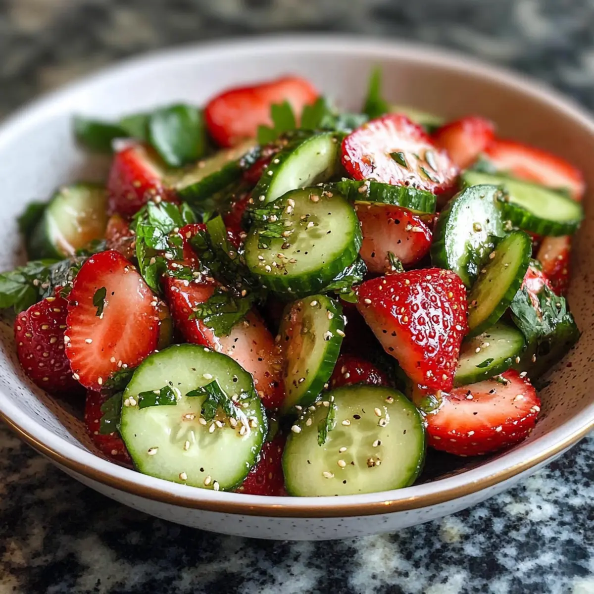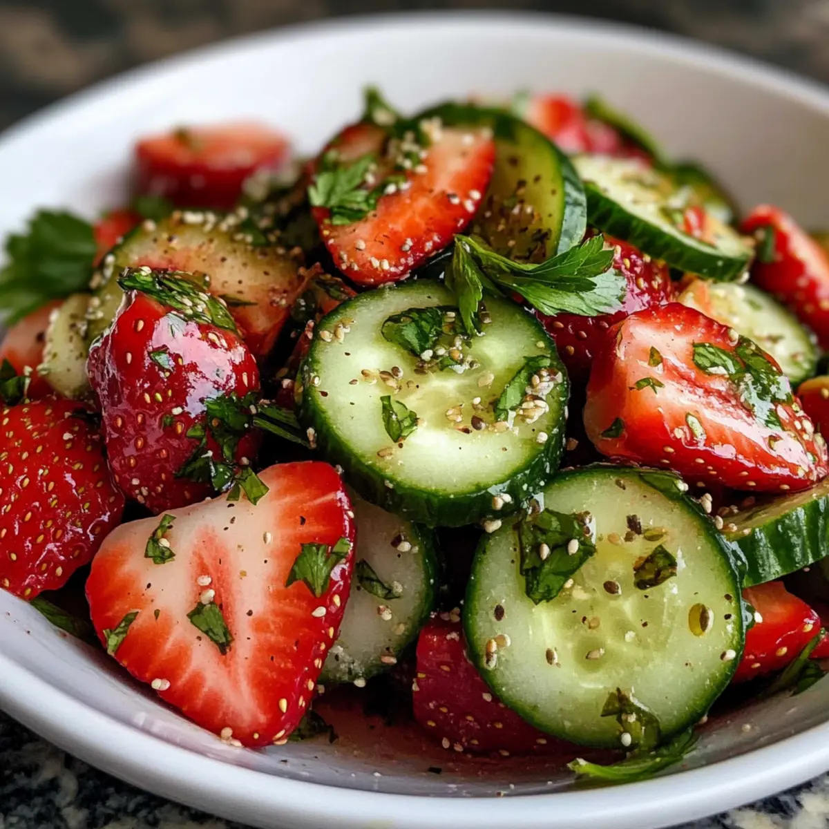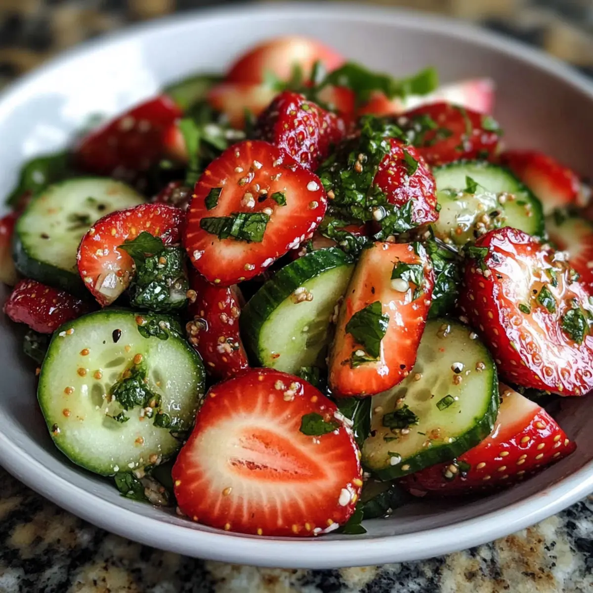 Der Sommer steht vor der Tür und damit auch die Zeit für erfrischende Salate! Wenn ich an ein Gericht denke, das sowohl leicht als auch voller Geschmack ist, kommt mir sofort unser Gurken Erdbeer Salat in den Sinn. Diese wunderbare Kombination aus knackigen Gurken und süßen, saftigen Erdbeeren zaubert nicht nur ein Lächeln auf die Gesichter der Gäste, sondern ist auch extrem einfach zuzubereiten – in nur 15 Minuten! Mit einem leichten Vinaigrette, die das süß-saftige Profil der Zutaten perfekt ergänzt, wird diese glutenfreie Sommererfrischung zum echten Star auf jedem Grillfest. Diese Rezeptur ist nicht nur ein echter Blickfang, sondern auch eine großartige Möglichkeit, frisches Obst und Gemüse in deine Ernährung zu integrieren. Neugierig, wie du diesen köstlichen Salat zubereiten kannst? Lass uns gleich loslegen! Warum ist dieser Salat ein Sommerhit? Frische Aromen: Der Gurken Erdbeer Salat bietet eine perfekte Balance aus knackigen und saftigen Texturen, die jeden Biss zu einem Erlebnis machen. Einfachheit pur: In nur 15 Minuten zubereitet, ist diese Rezeptur ideal für beschäftigte Tage oder spontane Grillpartys. Vielfältig: Du kannst ihn um proteinreiche Zutaten wie gegrilltes Hähnchen oder Kichererbsen erweitern und ihn so zum Hauptgericht machen. Nährstoffreich: Vollgepackt mit Vitaminen, ist dieser Salat nicht nur lecker, sondern auch gesund! Wenn du nach weiteren erfrischenden Optionen suchst, schau dir den Asiatischer Gurkensalat Chili oder den Erfrischender Weissbohnen Gurken an. Ein echter Publikumsliebling: Seine bunten Farben und frischen Zutaten machen ihn zum Star auf jeder Sommerveranstaltung! Gurken Erdbeer Salat Zutaten Für den Salat • Erdbeeren – Frische Früchte, die Süße und Säure beisteuern; wähle feste, reife Erdbeeren für die beste Textur. • Gurken – Bieten einen wasserreichen Crunch; wähle Persian oder Englische Varianten für Zartheit; bei normalen Gurken die Schale abziehen und entkernen. • Feta oder Ziegenkäse (optional) – Fügt Salzigkeit und Cremigkeit hinzu; ersetze durch Mozzarella-Perlen für einen milderen Geschmack. • Frische Minze oder Basilikum – Stellt herbale Noten bereit; wähle je nach Vorliebe für einen kühlenden Effekt. • Mandelscheiben, Sonnenblumenkerne oder Walnüsse – Sorgt für Crunch und gesunde Fette; röste sie für mehr Geschmack. Für das Dressing • Zitronensaft oder Balsamico-Essig – Wirkt als saurer Bestandteil; passe die Säure und Süße je nach Geschmack an. • Honig oder Ahornsirup – Liefert subtile Süße und balanciert die Säure aus. Schritt-für-Schritt-Anleitung für Gurken Erdbeer Salat Step 1: Zutaten vorbereiten Wasche und trockne die Erdbeeren und Gurken gründlich. Entferne die grünen Blätter der Erdbeeren, und schneide sie der Länge nach in Scheiben. Die Gurken in dünne Runden oder Halbmonden schneiden; bei normalen Gurken die Schale abziehen und entkernen. Lege die vorbereiteten Zutaten beiseite, um sie im nächsten Schritt zu kombinieren. Step 2: Dressing mischen In einer kleinen Schüssel den Zitronensaft, Honig, Olivenöl, Salz und Pfeffer gut verrühren. Verwende einen Schneebesen, um eine gleichmäßige Konsistenz zu erreichen. Probiere das Dressing, um sicherzustellen, dass es deinen Geschmack trifft; bei Bedarf mehr Honig oder Zitronensaft hinzufügen, je nach Vorliebe für Süße oder Säure. Step 3: Salat zusammenstellen Gib die geschnittenen Gurken, Erdbeeren und frischen Kräuter wie Minze oder Basilikum in eine große Rührschüssel. Wenn du Feta oder Ziegenkäse verwenden möchtest, füge auch diesen hinzu. Achte darauf, die Zutaten sanft zu kombinieren, damit die Erdbeeren nicht zerdrückt werden. Step 4: Leicht vermengen Träufle die Hälfte des Dressings gleichmäßig über den Salat in der Rührschüssel. Verwende einen großen Löffel, um die Zutaten vorsichtig zu vermengen, bis alles gut durchzogen ist, jedoch ohne die Beeren zu zerdrücken. Dies sorgt dafür, dass die Aromen gleichmäßig verteilt sind und der Gurken Erdbeer Salat frisch und knackig bleibt. Step 5: Garnieren & Servieren Übertrage den Salat auf eine Servierplatte und streue die gerösteten Mandelscheiben, Sonnenblumenkerne oder Walnüsse sowie zusätzliche Kräuter darüber. Träufle das restliche Dressing über den Salat für zusätzlichen Geschmack. Der Gurken Erdbeer Salat sollte sofort serviert werden, um die beste Frische und Textur zu genießen. Variationen & Alternativen für Gurken Erdbeer Salat Lass deiner Kreativität freien Lauf und passe diesen Salat nach deinem Geschmack an! Grünes Blattgemüse: Ergänze Arugula oder Babyspinat für einen nussigen Boost und eine zusätzliche Portion Nährstoffe. Beerenvielfalt: Füge andere Früchte wie Blaubeeren, Himbeeren oder Mangostücke hinzu, um verschiedene Geschmackskombinationen zu entdecken. Jede Beere bringt ihre eigene Süße und Frische mit. Proteinquelle: Integriere gegrilltes Hähnchen oder Kichererbsen, um den Salat in eine sättigende Hauptspeise zu verwandeln. Das gibt nicht nur Energie, sondern macht den Salat noch nahrhafter. Nussige Textur: Verwende Mandeln, Sonnenblumenkerne oder Walnüsse für zusätzlichen Crunch und gesunde Fette. Röste sie vorher, um das Aroma zu intensivieren. Herzhafter Käse: Probiere Feta, Ziegenkäse oder sogar Parmesan für eine salzige, cremige Komponente. Die Auswahl des Käses kann den gesamten Geschmack des Salates verändern. Zesty Dressing: Experimentiere mit verschiedenen Dressings wie Limettensaft oder einer balsamischen Vinaigrette für einen zusätzlichen Geschmackskick. Eine solche Variation hebt die fruchtigen und aromatischen Noten nochmals hervor. Würzige Note: Füge einen Hauch von Chili oder schwarzem Pfeffer für zusätzliche Schärfe hinzu. Diese subtile Schärfe wird die frisch-fruchtigen Aromen wunderbar ergänzen. Zusätzliche Kräuter: Frisches Basilikum oder Koriander können eine interessante Geschmacksnote bringen und den Salat aufregender machen. A