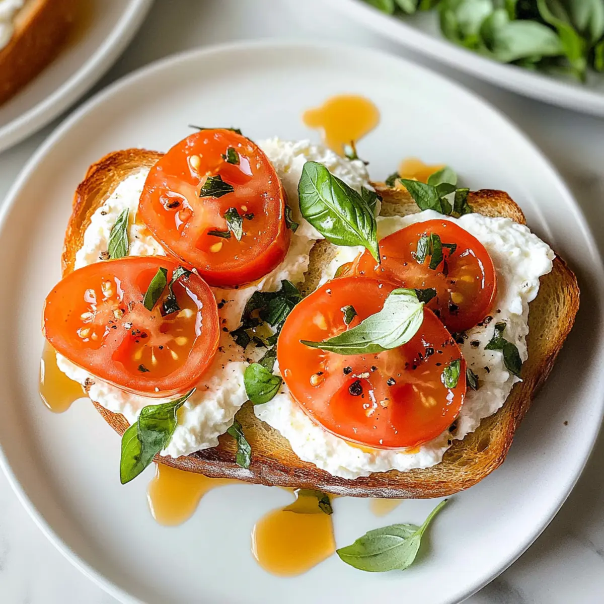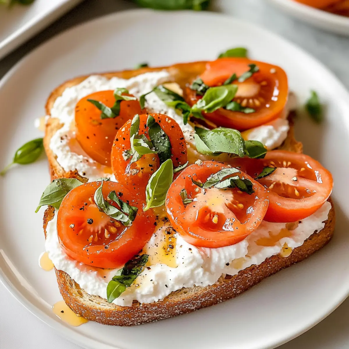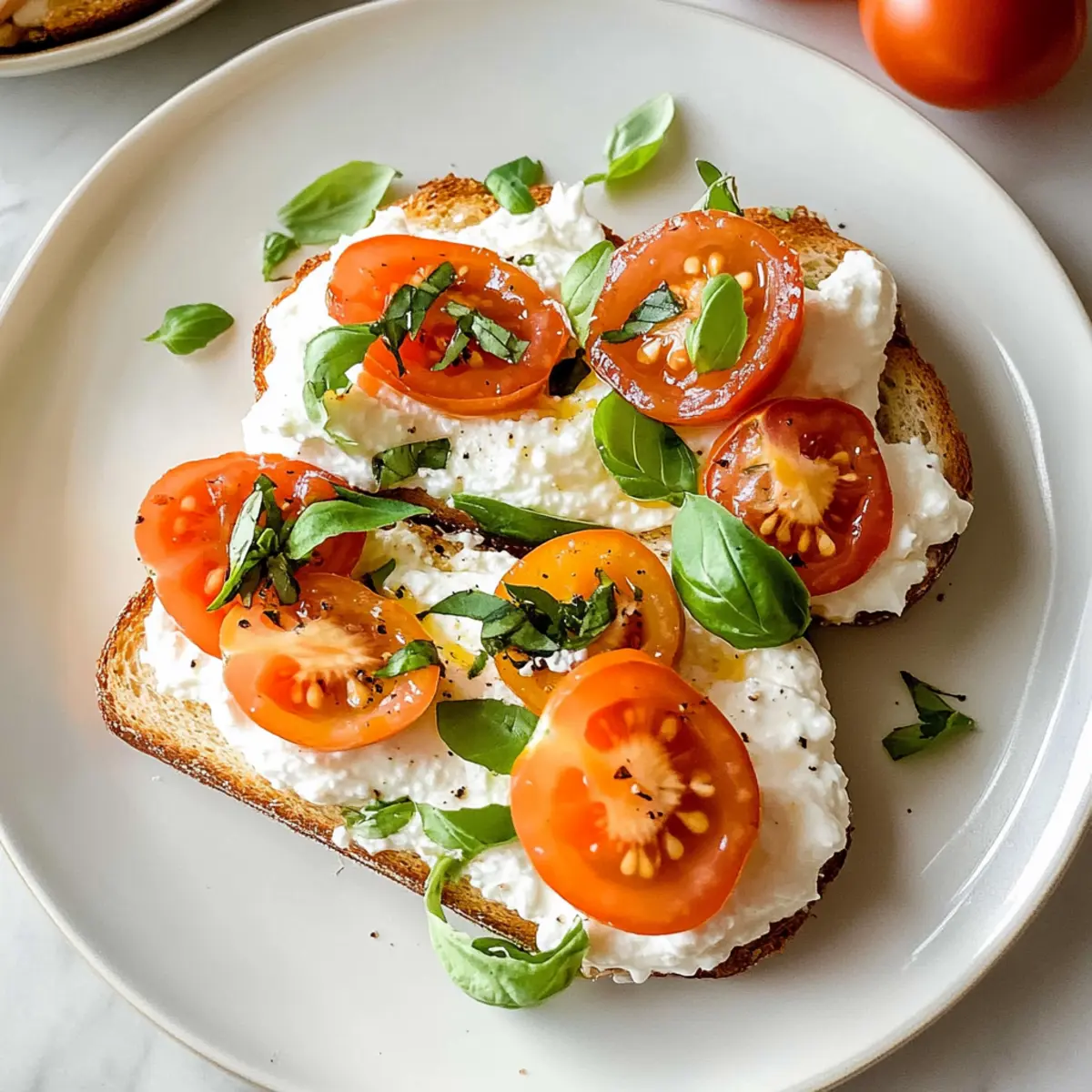 Wenn ich an meine Morgenroutinen denke, kommt mir oft der Geruch von frisch geröstetem Brot in den Sinn. Es ist der perfekte Start in den Tag, und heute möchte ich dir eine ganz besondere Variante präsentieren: den herzhaften geschlagenen Hüttenkäse-Toast mit Tomaten. Dieser köstliche Toast ist nicht nur ein schneller, no-cook Genuss, sondern auch eine proteinreiche Option, die dich bis zur Mittagszeit satt hält. Die cremige Hüttenkäse-Mischung harmoniert hervorragend mit den saftigen Tomaten und frischem Basilikum, was jedem Bissen eine aufregende Frische verleiht. Außerdem ist er glutenfrei, perfekt für alle, die auf ihre Ernährung achten. Bist du bereit, dein Frühstück auf ein neues Level zu heben? Lass uns gemeinsam in die Zubereitung eintauchen! Warum wirst du dieses Rezept lieben? Einfachheit: Die Zubereitung dieses herzhaften Hüttenkäse-Toasts ist kinderleicht und benötigt keine Kochkünste – perfekt für hektische Morgen! Proteinreich: Mit etwa 15 Gramm Protein pro Portion ist dieser Toast eine großartige Wahl für alle, die ihren Nährstoffbedarf decken möchten. Frische Aromen: Die Kombination aus cremigem Hüttenkäse, saftigen OMG-Tomaten™ und aromatischem Basilikum sorgt für ein Geschmackerlebnis, das jeden Morgen aufhellt. Vielseitigkeit: Ob als schnelles Frühstück oder köstlicher Snack, dieser Toast lässt sich anpassen – probiere verschiedene Toppings wie geröstetes Gemüse oder Räucherlachs für eine herzhaft Variante. Gesundheitsbewusst: Glutenfrei und ohne Kochen zubereitet, ist dieses Rezept ideal für alle, die eine gesunde und schmackhafte Mahlzeit suchen. Herzhafter geschlagener Hüttenkäse-Toast Zutaten • Mit diesen Zutaten zauberst du im Handumdrehen einen köstlichen herzhaften geschlagenen Hüttenkäse-Toast, der dir den Tag versüßt. Für den Hüttenkäse-Aufstrich Hüttenkäse – verleiht Cremigkeit und eine proteinreiche Basis; kann auch durch Ricotta oder griechischen Joghurt ersetzt werden. Zitronenschale – sorgt für Frische und hebt den Geschmack; Limettenschale kann ebenfalls verwendet werden. Schwarzer Pfeffer – gibt der Mischung eine angenehme Würze; nach Geschmack anpassen oder durch zerstoßenen roten Pfeffer ersetzen. Für die Tomatenschicht OMG-Tomaten™ (oder frische Tomaten) – bringen eine saftige Süße, die das Herzhafte ausgleicht; jede frische Tomate wie Kirschtomaten oder Rispentomaten funktioniert gut. Basilikum – fügt frische und Kräuternote hinzu; kann in Eile durch Petersilie oder Schnittlauch ersetzt werden. Meersalz – verstärkt die Aromen insgesamt; nach Geschmack anpassen. Für den Toast Sauerteigbrot – bietet eine knusprige Basis; Vollkorn- oder glutenfreies Brot sind gute Alternativen. Für die Süßung Thymian-honig – sorgt für einen süßen, aromatischen Akzent; einfach Honig sanft mit frischem Thymian erwärmen. Für die Garnitur (optional) Micro Greens – fügt eine nahrhafte Note und visuelle Attraktivität hinzu; lass sie weg, wenn du es einfacher magst. Mit diesen Zutaten bist du bereit, eine köstliche und gesunde Variante des herzhafter geschlagener Hüttenkäse-Toasts mit Tomaten zu kreieren! Schritt-für-Schritt-Anleitung für Herzhafter geschlagener Hüttenkäse-Toast mit Tomaten Schritt 1: Hüttenkäse-Mischung zubereiten Nimm einen Food Processor oder Mixer und gib den Hüttenkäse, die Zitronenschale und den schwarzen Pfeffer hinein. Vermische alles auf hoher Stufe für etwa 30 Sekunden, bis die Mischung glatt und cremig ist. Achte darauf, dass keine Klumpen übrig bleiben, da eine seidige Konsistenz den herzhaften geschlagenen Hüttenkäse-Toast perfekt macht. Schritt 2: Brot toasten Während die Hüttenkäse-Mischung im Mixer ist, heize deinen Toaster oder eine Grillpfanne vor. Toaste das Sauerteigbrot auf mittlerer Hitze für etwa 3-5 Minuten, bis es goldbraun und knusprig ist. Achte darauf, dass das Brot nicht zu dunkel wird, da es sonst bitter schmeckt. Schritt 3: Tomatenmischung vorbereiten In einer kleinen Schüssel vermengst du die OMG-Tomaten™ mit dem gehackten Basilikum und einer Prise Meersalz. Lass die Mischung für etwa 5 Minuten stehen, damit die Aromen gut durchziehen können. Die Süße der Tomaten harmoniert großartig mit dem herzhaften Hüttenkäse, wodurch der Geschmack deines herzhaften geschlagenen Hüttenkäse-Toasts verstärkt wird. Schritt 4: Hüttenkäse auf den Toast streichen Sobald das Brot getoastet ist, nimm es heraus und lass es kurz abkühlen. Verteile dann eine großzügige Menge der cremigen Hüttenkäse-Mischung auf jede Scheibe. Achte darauf, dass der Hüttenkäse gleichmäßig und bis an die Ränder verteilt wird, um den vollmundigen Geschmack in jedem Bissen zu gewährleisten. Schritt 5: Mit Tomaten belegen Platziere die vorbereitete Tomatenmischung gleichmäßig oberhalb des Hüttenkäse-Aufstrichs. Die saftigen Tomaten verleihen deinem Toast nicht nur Farbe, sondern auch eine erfrischende Süße. Je nach Vorliebe kannst du die Menge der Tomaten variieren und sogar zusätzliche Kräuter darüber streuen. Schritt 6: Mit Honig und Kräutern dekorieren Träufle langsam etwas von dem thymian-infusierten Honig über die Tomatenschicht. Dies sorgt für eine subtile Süße, die die herzhaften Aromen perfekt ergänzt. Garnisiere zusätzlich mit den restlichen Basilikumblättern und optional mit Micro Greens für einen ansprechenden visuellen Effekt. Schritt 7: Sofort servieren Serviere den herzhaften geschlagenen Hüttenkäse-Toast mit Tomaten sofort, damit er frisch und knackig bleibt. Dieser köstliche Toast ist nicht nur eine Augenweide, sondern auch ein nahrhaftes Frühstück, das dich mit Energie für den Tag versorgt. Guten Appetit! Expertentipps für herzhafter geschlagener Hüttenkäse-Toast Perfekte Konsistenz: Achte darauf, den Hüttenkäse lange genug zu mixen, um eine glatte und cremige Textur zu erreichen. Klumpen können das Erlebnis beeinträchtigen. Frische Zutaten: Verwende frische, hochwertige Zutaten, besonder