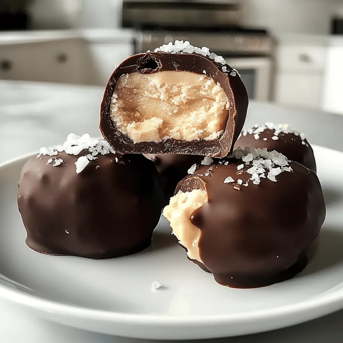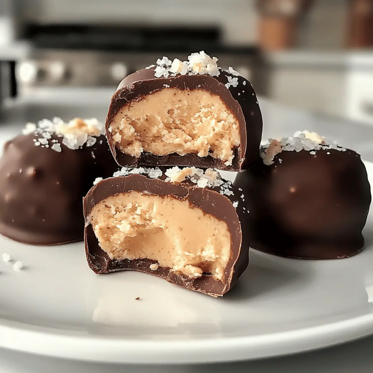 Nehmen Sie die gefrorenen Bites vorsichtig vom Blech und tauchen Sie jeden einzelnen in die geschmolzene Schokolade. Achten Sie darauf, dass die Bites vollständig bedeckt sind. Verwenden Sie eine Gabel, um überschüssige Schokolade abtropfen zu lassen. Wenn gewünscht, bestreuen Sie die Bites sofort mit flockigem Meersalz für einen zusätzlichen Geschmack.