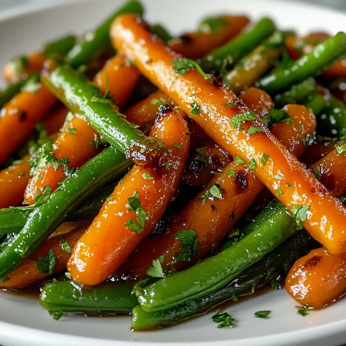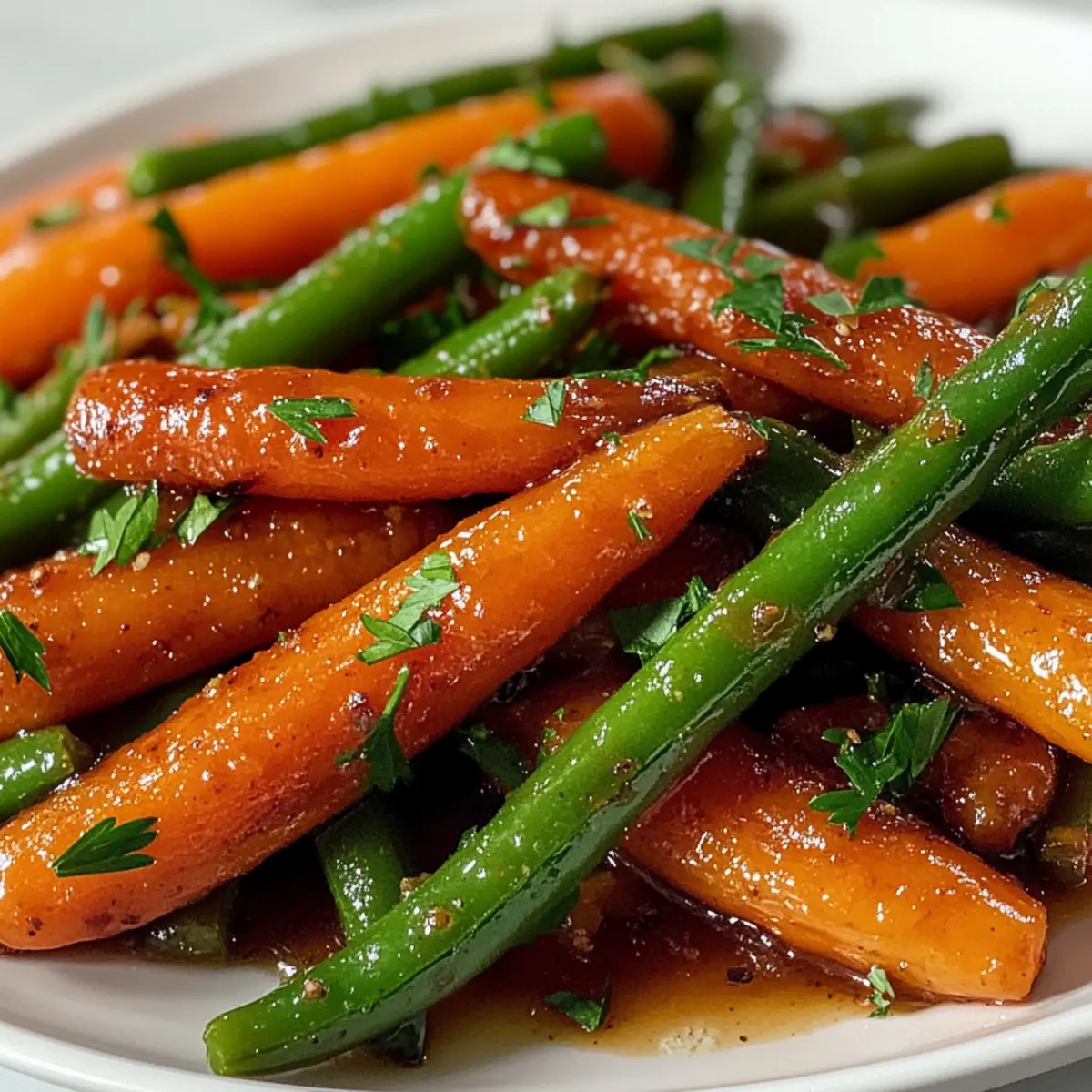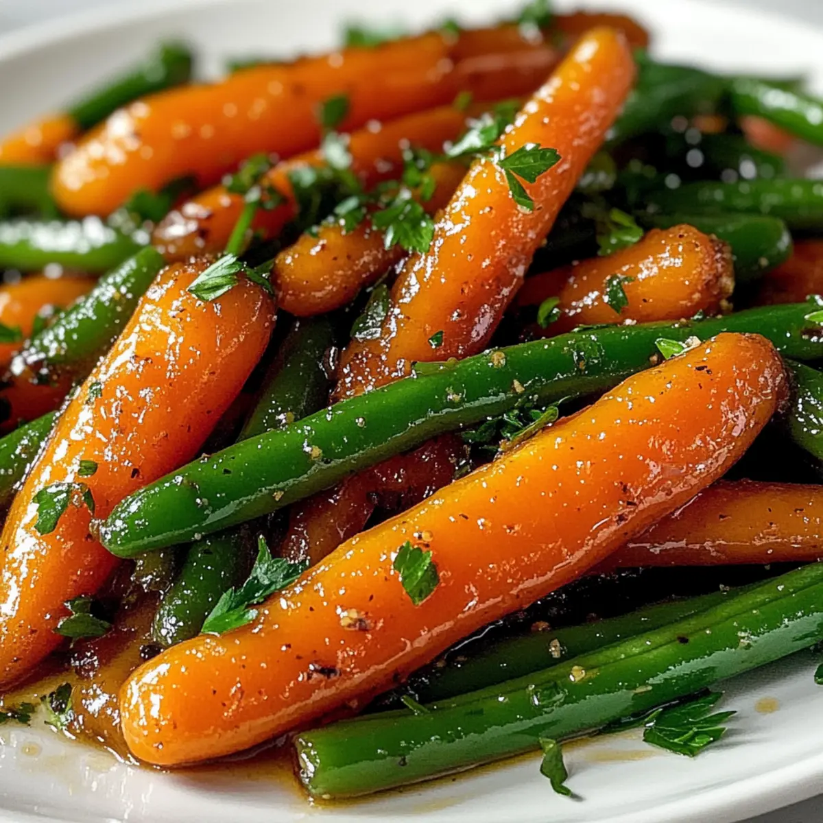 Als ich durch das bunte Gemüseangebot auf dem Markt schlenderte, fiel mir sofort die leuchtende orange Farbe der Karotten und das strahlende Grün der Bohnen ins Auge. Diese Kombination inspirierte mich, ein einfaches, aber köstliches Rezept für honigglasierte Karotten und grüne Bohnen zu kreieren. Das Ergebnis ist eine verführerische Beilage, die nicht nur schnell zubereitet ist, sondern auch gesunde Zutaten vereint. Die Süße des Honigs und die sanfte Würze der Gewürze machen dieses Gericht zum perfekten Begleiter für all eure Lieblingsmahlzeiten. Ob beim geselligen Abendessen oder als Highlight zum Wochenend-Brunch – diese honigglasierten Karotten und grünen Bohnen werden garantiert zum Gesprächsthema! Seid ihr bereit, euren Geschmackssinn zu verwöhnen? Warum sind honigglasierte Karotten so besonders? Einfachheit: Mit nur wenigen Zutaten ist dieses Rezept für honigglasierte Karotten und grüne Bohnen schnell und unkompliziert. Vielseitigkeit: Diese Beilage passt hervorragend zu verschiedenen Hauptgerichten, wie roast chicken oder grilled fish. Geschmacksexplosion: Die Kombination aus süßem Honig und warmen Gewürzen sorgt für einen unvergleichlichen Genuss. Nährstoffreich: Jedes Gericht ist nicht nur lecker, sondern auch gesund und reich an Vitaminen. Lasst euch von der perfekten Balance aus süß und herzhaft überraschen – diese Karotten und Bohnen sind der ideale Weg, um frisches Gemüse zu genießen! Zutaten für honigglasierte Karotten und grüne Bohnen Für das Gemüse • Karotten – bieten natürliche Süße und eine lebendige Farbe; ersetzen Sie sie durch Pastinaken für eine interessante Abwechslung. • Grüne Bohnen – sorgen für eine zarte, knackige Textur; gefrorene Bohnen können nach dem Auftauen und Abtrocknen eingesetzt werden. Für die Glasur • Olivenöl – unterstützt das Rösten und steigert die Karamellisierung; alternativ kann Avocadoöl verwendet werden. • Honig – dient als Süßungsmittel und verleiht der Glasur eine besondere Note; für eine vegane Variante einfach mit Ahornsirup austauschen. • Zitronensaft – bringt eine säuerliche Note ins Spiel; Apfelessig kann ebenfalls verwendet werden, wenn Sie eine andere Säure möchten. • Gemahlener Zimt – sorgt für warme Gewürzaromen; das Rösten der Gewürze zuvor verstärkt den Geschmack. • Gemahlene Muskatnuss – ergänzt den Zimt und verleiht dem Gericht Wärme; frisch geriebene Muskatnuss hat einen intensiveren Geschmack. • Salz und Pfeffer – verbessern den Gesamtgeschmack; nach Geschmack anpassen. • Frische Petersilie – bringt einen frischen Garnierungsakzent; andere Kräuter wie Thymian oder Schnittlauch sind ebenfalls eine gute Wahl. Schritt-für-Schritt-Anleitung für honigglasierte Karotten und grüne Bohnen Step 1: Backofen vorheizen Heizen Sie den Backofen auf 200 °C vor, um eine gleichmäßige Garung und Karamellisierung der Aromen zu gewährleisten. Dies ist ein wichtiger erster Schritt, da die Hitze dazu beiträgt, dass die honigglasierten Karotten und grünen Bohnen perfekt weich und leicht goldbraun werden. Step 2: Glasur zubereiten In einer großen Schüssel Olivenöl, Honig, Zitronensaft, gemahlenen Zimt, gemahlene Muskatnuss sowie Salz und Pfeffer gut vermengen. Verwenden Sie einen Schneebesen, um sicherzustellen, dass alle Zutaten gleichmäßig vermischt sind. Die Glasur wird eine süße und würzige Basis für die Karotten und grünen Bohnen schaffen. Step 3: Gemüse vorbereiten Schneiden Sie die Karotten in gleichmäßige Streifen und schneiden Sie die Enden der grünen Bohnen ab. Geben Sie die vorbereiteten Karotten und grünen Bohnen in die Schüssel mit der Glasur und vermengen Sie alles gründlich, bis das Gemüse gut beschichtet ist. Diese Mischung ist entscheidend für den köstlichen Geschmack der honigglasierten Karotten und grünen Bohnen. Step 4: Gemüse auf dem Backblech verteilen Legen Sie das Gemüse in einer einzigen Schicht auf ein Backblech, um ein optimales Röstergebnis zu erzielen. Achten Sie darauf, dass die Karotten und Bohnen genügend Platz haben, damit sie gleichmäßig garen und nicht gedämpft werden. Dies sorgt für die gewünschte Karamellisierung. Step 5: Rösten im Ofen Schieben Sie das Backblech in den vorgeheizten Ofen und rösten Sie das Gemüse für etwa 20–25 Minuten. Wenden Sie die Karotten und grünen Bohnen nach der Hälfte der Garzeit, um ein gleichmäßiges Rösten zu garantieren. Sie sind fertig, wenn die Karotten zart und golden sowie die Bohnen zart und knackig sind. Step 6: Anrichten und Garnieren Nehmen Sie das Backblech aus dem Ofen und lassen Sie das Gemüse kurz abkühlen, bevor Sie es in eine Servierschüssel umfüllen. Garnieren Sie die honigglasierten Karotten und grünen Bohnen mit frischer Petersilie für einen zusätzlichen Farbtupfer und eine frische Note. Diese Beilage eignet sich perfekt für jedes Ihrer Lieblingsgerichte. Variationen & Alternativen für honigglasierte Karotten und grüne Bohnen Customize your dish with delightful twists that excite the palate! Vegan: Tauschen Sie den Honig gegen Ahornsirup aus, um dieses Rezept vegan zu machen. Die süße Note bleibt erhalten und schmeckt köstlich! Extra Knoblauch: Fügen Sie gehackten Knoblauch oder Schalotten zur Glasur hinzu. Dies schafft eine herzhafte Tiefe, die wunderbar harmoniert. Würzige Note: Streuen Sie eine Prise Cayennepfeffer für einen aufregenden Kick. Dies ist eine großartige Möglichkeit, um die Würze zu erhöhen. Kräutervielfalt: Experimentieren Sie mit frischen Kräutern wie Thymian oder Rosmarin. Diese Kräuter geben dem Gericht einen aromatischen Twist. Nussiger Crunch: Streuen Sie geröstete Nüsse oder Kürbiskerne über das Gemüse vor dem Servieren. Dies sorgt für eine knusprige Textur und bereichert den Geschmack! Zitronensprudel: Fügen Sie etwas Zitronenzesten für zusätzliche Frische hinzu. Das garantiert eine lebendige Note, die den süßen Geschmack ausgleicht. Interessante Gewürze: Probieren