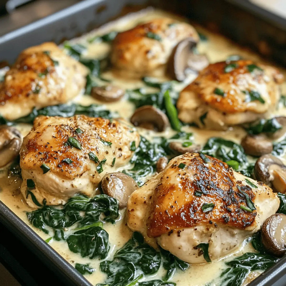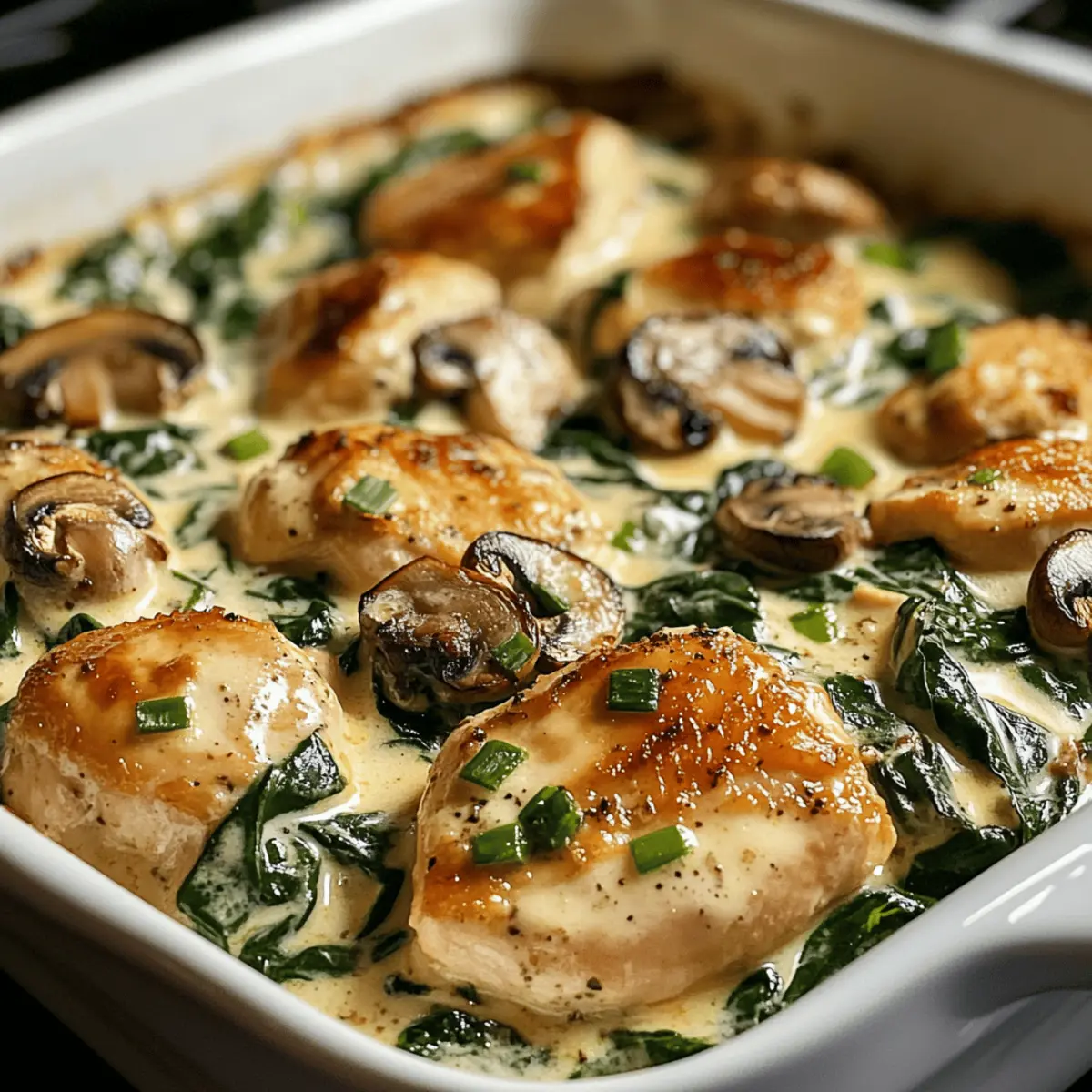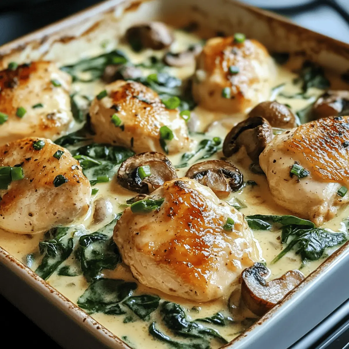 Ich kann den köstlichen Duft von frisch gebackenem Huhn, begleitet von zarten Pilzen und leuchtendem Spinat, förmlich in der Luft spüren. Mein Rezept für das cremige Chicken, Spinach und Mushroom Low-Carb Oven Dish ist die perfekte Lösung für all jene, die sich nach einem schnellen, gesunden Abendessen sehnen, das die ganze Familie begeistert. Diese einfache und nahrhafte Köstlichkeit ist nicht nur ideal für stressige Wochentage, sondern eignet sich auch hervorragend für entspannte Wochenendessen. Mit frischen Zutaten und einer cremigen Sauce ist dieses Gericht ein wahres Fest für die Sinne. Neugierig, was es so besonders macht und wie leicht es zuzubereiten ist? Lass uns gemeinsam in die Zubereitung eintauchen! Was macht dieses Gericht einzigartig? Einfache Zubereitung: Mit nur wenigen Schritten gelingt dieses Rezept mühelos, perfekt für alle Kochkünste. Gesunde Zutaten: Frischer Spinat und zarte Hähnchenbrust bieten eine nährstoffreiche Basis, ideal für eine Low-Carb-Diät. Cremiger Genuss: Die Kombination aus Mozzarella und Frischkäse sorgt für eine unvergleichliche, reichhaltige Sauce, die alle begeistert. Vielseitig: Du kannst mühelos andere Gemüsesorten oder Proteine wie Tofu hinzufügen, um es an deine Vorlieben anzupassen. Familienfreundlich: Ob für ein schnelles Abendessen unter der Woche oder ein entspanntes Sonntagsessen – dieses Gericht ist ein Hit für alle. Vorbereitungsmöglichkeiten: Perfekt für Meal Prep! Bereite es am Vorabend vor und backe es frisch am nächsten Tag für extra Zeitersparnis. Zutaten für das Käsecremige Hähnchen Für das Gericht: Hähnchenbrust dünn aufgeschnitten – Hauptproteinquelle, benutze entbeinte Stücke für mehr Zartheit. Frischer Babyspinat – Liefert Nährstoffe und Farbe; frisch nutzen, um überschüssige Feuchtigkeit zu vermeiden. Geschnittene Champignons – Fügen Umami-Geschmack hinzu; frisch sind für bessere Konsistenz ideal. Geriebener Mozzarella – Sorgt für Cremigkeit und Geschmack; kann durch eine milchfreie Variante ersetzt werden. Frischkäse mit Frühlingszwiebeln – Erhöht die Reichhaltigkeit der Sauce; für eine milchfreie Version, pflanzliche Alternativen nutzen. Olivenöl – Hilft beim Anbraten der Gemüse und Hähnchen, um den Geschmack zu verstärken. Hühnerbrühe – Fügt Feuchtigkeit und Tiefe hinzu; niedrige Natriumoptionen sind empfehlenswert. Pfeffer und Kräuter-Knoblauch-Gewürz – Gewürze zur Geschmacksverstärkung ohne zusätzliche Kohlenhydrate. Für die Garnierung (optional): Frische Kräuter – Verbessern das Aussehen des Gerichts; wähle Kräuter nach deinem Geschmack. Niedrig-Kohlenhydrat-Brot – Ideal als Beilage, um das Gericht zu ergänzen. Schritt-für-Schritt-Anleitung für das Käsecremige Hähnchen mit Spinat und Pilzen Schritt 1: Hähnchen und Gemüse vorbereiten Zuerst die Hähnchenbrust dünn aufschneiden und in eine große Schüssel legen. Dann die frischen Babyspinatblätter gründlich waschen und die Champignons in gleichmäßige Scheiben schneiden. Es ist wichtig, dass alle Zutaten gut vorbereitet sind, um einen reibungslosen Ablauf beim Kochen des Käsecremigen Hähnchens mit Spinat und Pilzen zu gewährleisten. Schritt 2: Das Gericht würzen Sobald das Hähnchen vorbereitet ist, mit Pfeffer und Kräuter-Knoblauch-Gewürz gleichmäßig würzen. Verwende die Hände oder eine Zange, um die Gewürze gründlich zu verteilen. Dies verstärkt die Aromen des Hähnchens. Lass das gewürzte Hähnchen für einige Minuten ruhen, damit die Gewürze gut einziehen können. Schritt 3: Die cremige Sauce zubereiten In einer separaten Schüssel den Frischkäse mit dem geriebenen Mozzarella und der Hühnerbrühe gut vermengen, bis eine glatte, cremige Konsistenz entsteht. Verwende einen Schneebesen oder einen Handmixer, um Klumpen zu vermeiden. Diese Sauce wird dem Käsecremigen Hähnchen mit Spinat und Pilzen die nötige Reichhaltigkeit verleihen. Schritt 4: Schichten und backen Eine große Auflaufform leicht mit Olivenöl einfetten. Zuerst die gewürzten Hähnchenstücke gleichmäßig in die Form legen. Darauf eine Schicht aus den sautierten Champignons und den frisch gewaschenen Spinatblättern verteilen. Schließlich die cremige Sauce gleichmäßig über die Schichten gießen, sodass alles gut bedeckt ist. Schritt 5: In Etappen backen Den Ofen auf 175 °C vorheizen und das Gericht etwa 50 bis 55 Minuten backen. Achte darauf, dass das Hähnchen vollständig durchgegart ist und die Sauce eine leicht goldbraune Farbe annimmt, was einen appetitlichen Anblick bietet. Die Backzeit kann je nach Ofen variieren, also gelegentlich nachsehen. Schritt 6: Ruhen lassen und servieren Nachdem das Käsecremige Hähnchen mit Spinat und Pilzen aus dem Ofen genommen wurde, etwa 10 Minuten abkühlen lassen. Dies ermöglicht den Aromen, sich zu setzen und intensiver zu werden. Serviere das Gericht warm und garniere es optional mit frischen Kräutern für einen zusätzlichen Farbtupfer. Vorbereitung für das Käsecremige Hähnchen mit Spinat und Pilzen Das Käsecremige Hähnchen mit Spinat und Pilzen eignet sich hervorragend für die Vorbereitung im Voraus und spart Ihnen wertvolle Zeit an stressigen Wochentagen. Sie können das gesamte Gericht bis zu 24 Stunden vorher zubereiten, indem Sie das gewürzte Hähnchen, die sautierten Champignons und den frischen Spinat in der Auflaufform schichten und die cremige Sauce darüber gießen. Decken Sie die Form gut ab und lagern Sie sie im Kühlschrank, um die Frische zu bewahren. Wenn Sie bereit sind zu genießen, heizen Sie den Ofen auf 175 °C vor und backen Sie das Gericht 50-55 Minuten lang, bis es goldbraun ist. On top sparen Sie Zeit und haben trotzdem ein köstliches Meal Prep Gericht, das ebenso lecker ist wie frisch zubereitet! Was passt zu Käsecremigem Hähnchen mit Spinat und Pilzen? Lass uns dein köstliches Abendessen mit den perfekten Beilagen ergänzen, die harmonisch mit diesem cremigen Genuss harmonieren. Cremige Blumenkohlpüree:
