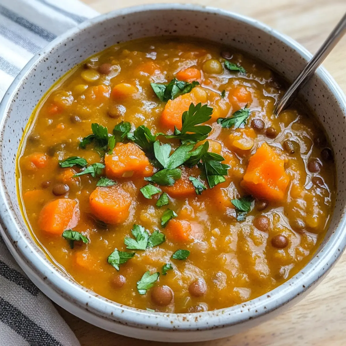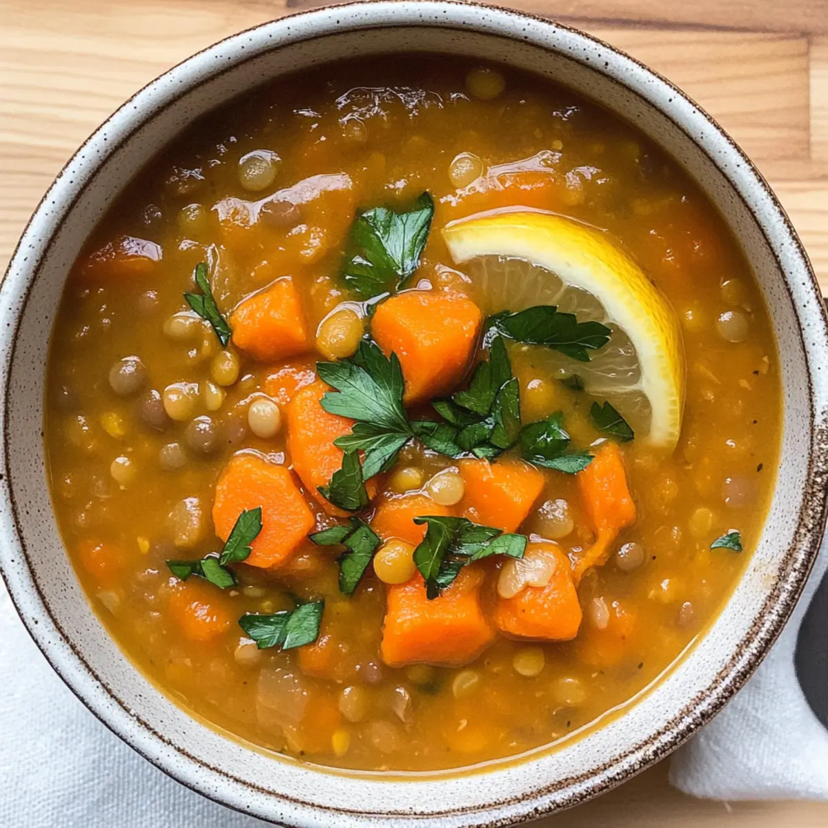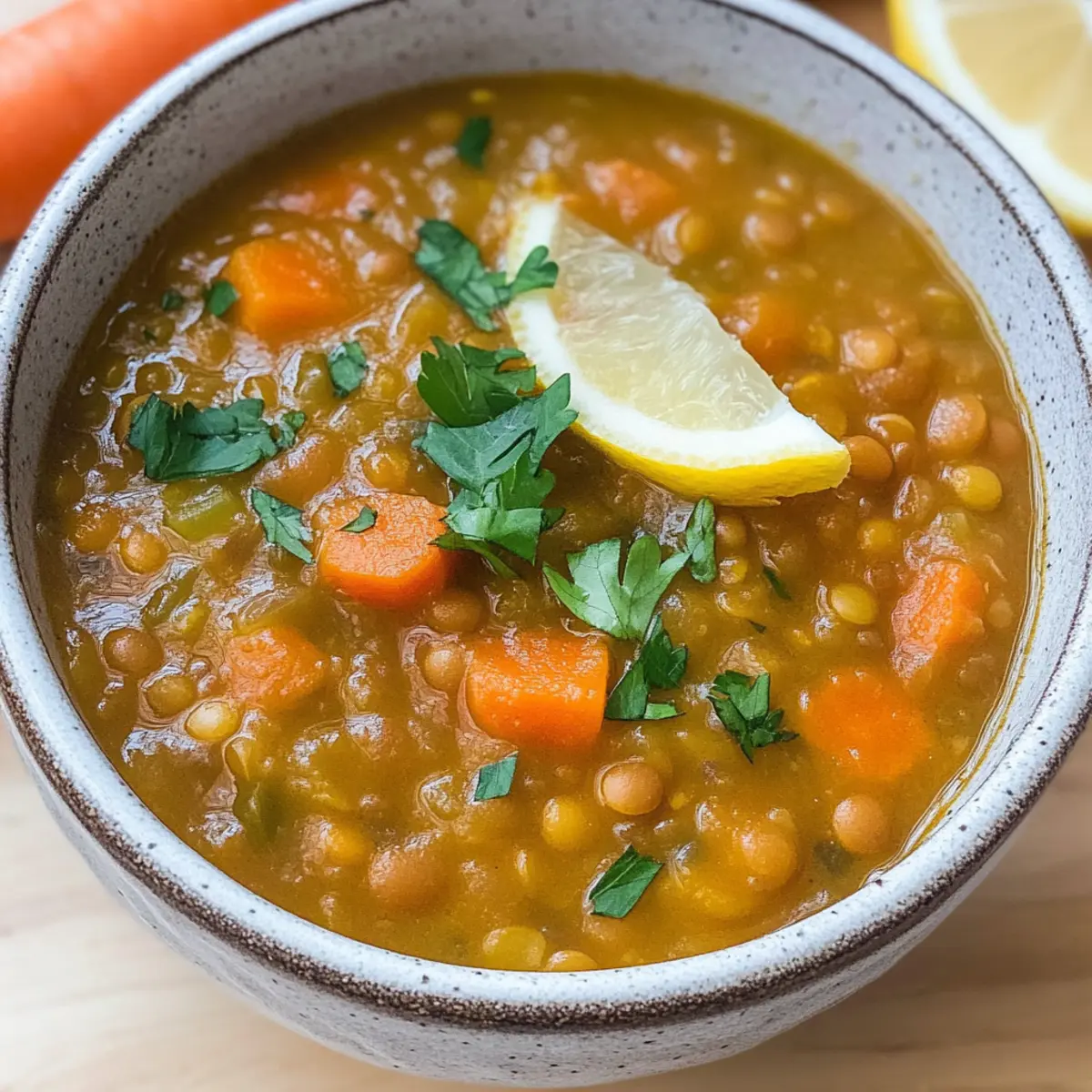 In einer kleinen, kuscheligen Küche, in der der Duft von frisch gekochtem Essen die Luft erfüllt, steht ein Topf auf dem Herd, der ein wahres Komfortessen verspricht. Diese Karotten- und Linsensuppe ist nicht nur ein Genuss für die Sinne, sondern auch ein nährstoffreicher Held, der selbst an den kältesten Tagen Wärme und Zuflucht bietet. Mit einfachen Zutaten, die man meist schon zuhause hat, zaubert man in nur 35 Minuten eine köstliche vegane Mahlzeit, die reich an Proteinen und Ballaststoffen ist. Außerdem ist dieses Rezept unglaublich anpassungsfähig – ideal zum Experimentieren mit verschiedenen Gemüsesorten! Was könnte besser sein als eine gesunde, herzhafte Suppe, die sich perfekt für eine schnelle Familienmahlzeit eignet? Lass uns entdecken, wie man dieses einfache, aber unglaublich leckere Gericht zubereitet! Warum ist diese Suppe so besonders? Einfache Zubereitung: Mit nur einer halben Stunde kannst du diese köstliche Karotten- und Linsensuppe zubereiten – perfekt für stressige Wochentage. Gesund und nahrhaft: Sie ist voll von pflanzlichem Protein und Ballaststoffen, die dich lange satt halten und schmackhaft sind. Vielfältig: Ob mit frischen Kräutern oder verschiedenen Gemüsesorten, diese Suppe lässt sich leicht an deine Vorlieben anpassen. Probiere neue Zutaten aus und kreiere deine eigene Version! Familienfreundlich: Kinder lieben die süßen Karotten und die angenehme Textur der Linsen – ein ideales Gericht für alle Altersgruppen. Wärmt von innen: An kalten Tagen ist ein großes Schüsselchen dieser herzhaften Suppe wie eine warme Umarmung. Egal, ob als Hauptgericht oder Beilage, sie wird garantiert für zufriedene Gesichter am Tisch sorgen. Entdecke zudem unseren Rezept Lecker Und für frisches Brot dazu! Karotten- und Linsensuppe Zutaten Für die Brühe: Extra Virgin Olive Oil – sorgt für eine reichhaltige Geschmacksbasis der Suppe. Zwiebel – fügt Tiefe und Süße hinzu; jede Zwiebelfarbe ist möglich. Knoblauch – verbessert den Geschmack; frisch gehackt ist am besten. Karotten – die Hauptzutat, frisch und in Scheiben oder Würfel geschnitten. Grüne oder Braune Linsen – liefern Protein und Textur; gut spülen und abtropfen. Tomatenmark – bringt Reichtum und Tiefe in den Geschmack der Suppe. Paprika – sorgt für dezente Rauchnoten und Wärme. Kreuzkümmel – ergänzt die Linsen mit erdigen Noten. Getrockneter Thymian – fügt eine pflanzliche Komplexität hinzu; frisch ist ebenfalls empfehlenswert. Lorbeerblatt – infundiert die Suppe mit aromatischem Geschmack. Low Sodium Gemüsebrühe – bildet die Grundlage der Suppe, Salz individuell anpassen. Salz & schwarzer Pfeffer – wichtig zum Würzen; nach Geschmack anpassen. Zwiebelpulver – verstärkt die Süße; optional, aber empfohlen. Zitronensaft – fügt Helligkeit und Säure hinzu; frisch ist ideal. Frische Petersilie – zur Garnierung und für Frische; kann durch Koriander ersetzt werden. … und schon bist du bereit, in die köstliche Welt der Karotten- und Linsensuppe einzutauchen! Step-by-Step Instructions für Karotten- und Linsensuppe Step 1: Zwiebel und Knoblauch anbraten Erhitze in einem großen Topf bei mittlerer Hitze 2 Esslöffel extra nativem Olivenöl. Füge die gehackte Zwiebel hinzu und brate sie etwa 5 Minuten lang, bis sie weich und durchsichtig ist. Achte darauf, dass sie nicht verbrennt, sondern schön goldgelb wird. Step 2: Gewürze hinzufügen Gib den frisch gehackten Knoblauch, das Paprikapulver und den Kreuzkümmel in den Topf und rühre für etwa 1 Minute um, bis die Aromen sich entfalten. Die Mischung sollte aromatisch und duftend sein, was dir ein Gefühl von Vorfreude auf die Karotten- und Linsensuppe gibt. Step 3: Karotten und Linsen hinzufügen Nun fügst du die geschnittenen Karotten, die gut abgespülten Linsen, das Tomatenmark, den getrockneten Thymian, das Lorbeerblatt sowie die Gemüsebrühe hinzu. Rühre alles gut um, bis eine homogene Mischung entsteht. Dies ist der Moment, in dem die Farben der Zutaten lebendig werden! Step 4: Kochen und simmern Bringe die Mischung zum Kochen und reduziere dann die Hitze auf niedrig. Decke den Topf ab und lasse die Suppe 25 bis 30 Minuten lang köcheln, bis die Linsen schön zart sind. Rühre gelegentlich um, damit nichts anbrennt, und genieße den beruhigenden Duft, der durch die Küche zieht. Step 5: Abschmecken und verfeinern Sobald die Linsen gar sind, füge den frischen Zitronensaft und das Zwiebelpulver hinzu. Schmecke die Suppe mit Salz und Pfeffer ab, um die Aromen perfekt zur Geltung zu bringen. Bei Bedarf kannst du auch zusätzliche Brühe hinzufügen, um die gewünschte Konsistenz zu erreichen. Step 6: Pürieren für eine cremige Textur Für eine geschmeidigere Konsistenz kannst du einen Teil der Suppe pürieren und anschließend wieder in den Topf geben. Dies wird die Karotten- und Linsensuppe noch cremiger machen, ohne die herzhaften Stücke zu verlieren. Verwende dazu gerne einen Pürierstab. Step 7: Servieren und garnieren Serviere die Suppe in tiefen Tellern und garniere sie mit frischer, gehackter Petersilie. Optional kannst du auch einen Hauch Olivenöl darüber träufeln, um extra Geschmack hinzuzufügen. Diese Karotten- und Linsensuppe ist nun bereit, genossen zu werden! Expert Tips für Karotten- und Linsensuppe Linsen richtig vorbereiten: Spüle die Linsen gründlich ab, um Verunreinigungen zu entfernen. Dies hilft, den Geschmack zu verbessern und mögliche Bitterkeit zu vermeiden. Kochzeit beachten: Verschiedene Linsensorten haben unterschiedliche Garzeiten. Überprüfe die Textur regelmäßig, um eine Übercooked-Linse zu vermeiden. Variationen ausprobieren: Experimentiere mit verschiedenen Gemüsesorten wie Sellerie oder Paprika, um deine Karotten- und Linsensuppe ganz individuell zu gestalten. Cremige Textur: Für eine sämige Konsistenz püriere einen Teil der Suppe, bevor du sie servierst. So erhältst du eine köstliche Balance zwischen cremiger und stückiger Konsistenz. N