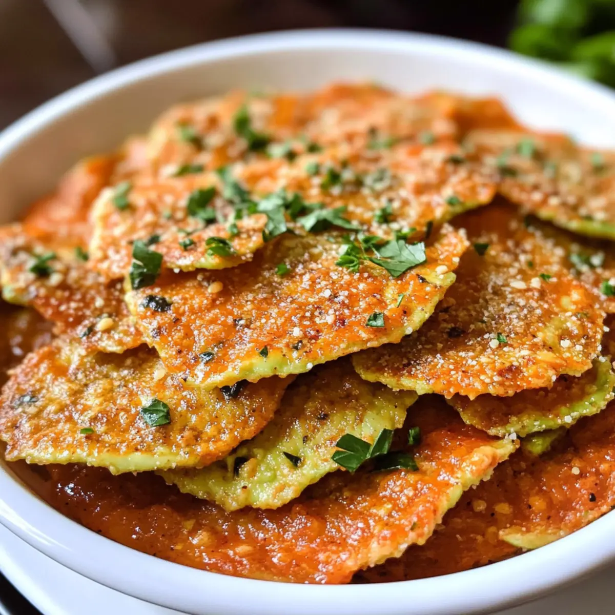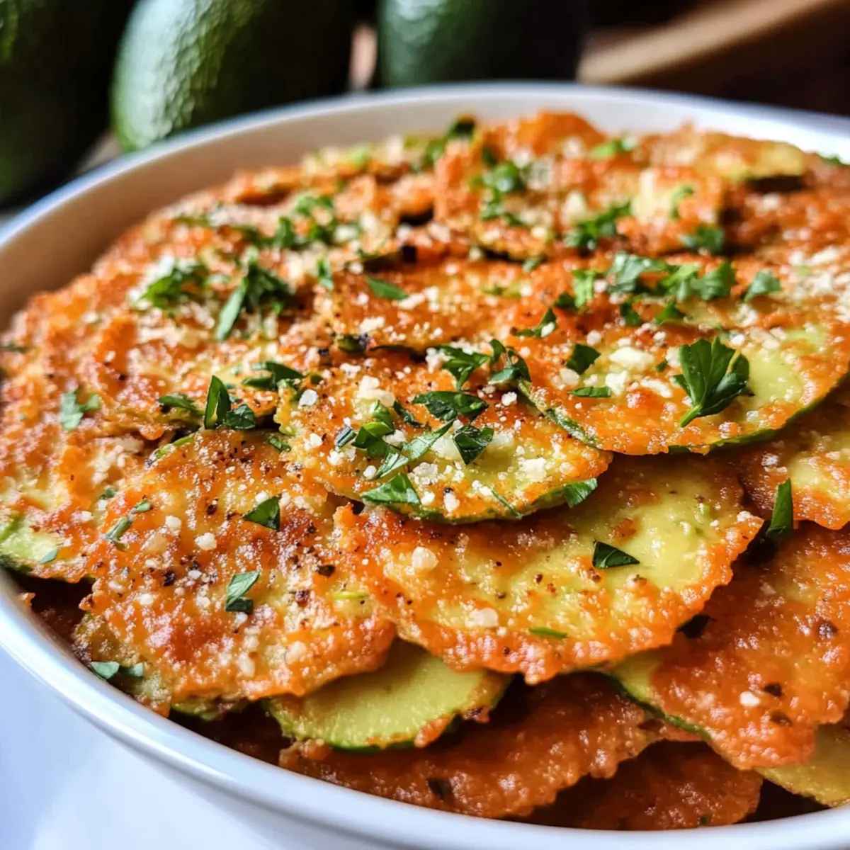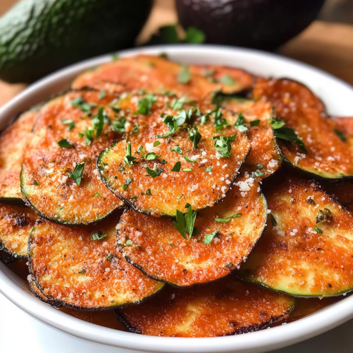 Als ich diese knusprigen Avocado Chips zum ersten Mal aus dem Ofen holte, konnte ich kaum glauben, wie wunderbar sie dufteten. Die Kombination aus zartem Avocadofleisch, würzigem Parmesan und aromatischen Gewürzen macht diese Keto Avocado Chips mit Parmesan und Gewürzen zu einem perfekten Snack für zwischendurch. In nur 15 Minuten zubereitet und in 40 Minuten gebacken, sind sie nicht nur schnell gemacht, sondern auch ein echter Hit bei deinen Freunden und Familien. Diese gesunden, kohlenhydratarmen Snacks bieten eine köstliche, glutenfreie Alternative zu traditionellen Chips und werden garantiert jeden Gaumen erfreuen. Hast du schon mal darüber nachgedacht, wie vielseitig Avocado sein kann? Lass uns gemeinsam herausfinden, wie du mit diesem einfachen Rezept zum Snack-Profi wirst! Warum wirst du diese Avocado Chips lieben? Simplicity, die Zubereitung ist denkbar einfach und dauert nur 15 Minuten. Gesunde Ernährung, diese Chips passen perfekt in deine ketogene oder glutenfreie Ernährung, ohne auf Geschmack zu verzichten. Vielfalt, mit verschiedenen Gewürzen und Käse kannst du das Rezept ganz nach deinem Geschmack anpassen. Knusprigkeit, jeder Biss macht Spaß und bietet ein unvergleichliches knuspriges Erlebnis. Crowd-Pleaser, ob als Snack für dich selbst oder für Gäste, diese Chips sorgen immer für Begeisterung! Probiere sie in Kombination mit einem niedrig-kalorischen Dip oder verwende sie als Beilage zu deiner nächsten Mahlzeit. Avocado Chips Zutaten • Diese gesunden Snacks sind schnell zubereitet und benötigen nur wenige Zutaten. Für die Chips Große reife Avocado – sorgt für gesunde Fette und die Basis der Chips; achte darauf, dass sie reif ist für die beste Textur. Frisch geriebener Parmesan – verleiht der Mischung eine salzige, käsige Note; kann bei Bedarf durch Hefeflocken für eine milchfreie Variante ersetzt werden. Zitronensaft – frischt den Geschmack auf und verhindert das Braunwerden der Avocado; frisch ist am besten, aber auch abgefüllter Saft kann genutzt werden. Knoblauchpulver – fügt eine herzhafte Tiefe hinzu; kann durch Zwiebelpulver ersetzt werden, um eine interessante Variation zu schaffen. Italienische Gewürzmischung – bringt eine Mischung aus getrockneten Kräutern mit; du kannst auch dein Lieblingsgewürz, wie Taco-Gewürz, verwenden, um einen neuen Geschmack zu entdecken. Koshersalz – wichtig für die Geschmacksverstärkung; passe die Menge deinem persönlichen Geschmack an oder lasse es weg, wenn du auf Natrium achten musst. Frisch gemahlener schwarzer Pfeffer – sorgt für einen subtilen Kick; für mehr Schärfe kannst du Cayennepfeffer hinzufügen. Mit diesen Zutaten bist du auf dem besten Weg, köstliche und knackige Avocado Chips zu zaubern, die perfekt für jede Gelegenheit sind! Schritt-für-Schritt-Anleitung für Keto Avocado Chips mit Parmesan und Gewürzen Step 1: Ofen vorheizen Heize deinen Ofen auf 190°C (375°F) vor. Diese Temperatur sorgt dafür, dass deine Keto Avocado Chips gleichmäßig garen und knusprig werden. Ein vorgeheizter Ofen ist entscheidend, um die perfekte Konsistenz deiner Chips zu erreichen, also nimm dir einen Moment Zeit, um sicherzustellen, dass er die richtige Temperatur hat. Step 2: Avocado vorbereiten Halbiere die große reife Avocado und entferne den Kern. Verwende einen Löffel, um das Fleisch herauszuholen und in eine Schüssel zu geben. Zerdrücke das Avocadofleisch mit einer Gabel, bis es ganz glatt ist. Dies bildet die cremige Basis für deine Keto Avocado Chips. Achte darauf, dass keine Stückchen zurückbleiben, um die Textur zu verbessern. Step 3: Zutaten vermengen Füge der zerdrückten Avocado den frisch geriebenen Parmesan, den Zitronensaft, das Knoblauchpulver, die italienische Gewürzmischung, das Koshersalz und den frisch gemahlenen schwarzen Pfeffer hinzu. Mische alles gründlich, bis die Zutaten gut vermengt sind und eine gleichmäßige Masse entsteht. Diese Mischung verleiht deinen Chips den köstlichen Geschmack, den jeder liebt. Step 4: Chips formen Lege ein Backblech mit Backpapier aus. Um gleichmäßige Chips zu formen, sprühe eine Messbecher mit Antihaft-Spray ein und verwende ihn, um portionsweise die Avocado-Mischung auf das Backblech zu setzen. Drücke die Mischung leicht mit dem Löffel flach, damit die Chips beim Backen schön gleichmäßig werden. Achte darauf, genügend Platz zwischen den Portionen zu lassen. Step 5: Chips backen Schiebe das Backblech in den vorgeheizten Ofen und backe die Keto Avocado Chips für etwa 40 Minuten. Überprüfe gelegentlich, ob die Chips goldbraun und knusprig werden. Die Chips sind fertig, wenn sie an den Rändern leicht gebräunt sind, also achte darauf, dass sie nicht verbrennen. Step 6: Abkühlen lassen Sobald die Chips fertig sind, nimm das Backblech aus dem Ofen und lasse die Chips einige Minuten abkühlen. Diese Ruhezeit hilft, die Chips noch knuspriger zu machen, während sie abkühlen. Sie sollten goldbraun und knackig sein – bereit zum Genießen. Step 7: Servieren Serviere deine Keto Avocado Chips mit einem Dip deiner Wahl, zum Beispiel einer scharfen Soße oder einem leckeren Salsa. Diese köstlichen Chips sind perfekt für einen Snack oder als gesunde Beilage zu deinem nächsten Gericht. Lass es dir schmecken! Expert Tips für Keto Avocado Chips • Richtige Reife: Achte darauf, eine reife Avocado zu verwenden, da dies die Textur und den Geschmack deiner Chips erheblich beeinflusst. • Käsewahl: Verwende frisch geriebenen Parmesan für den besten Geschmack. Das Backen mit anderen Käsearten kann die Konsistenz der Keto Avocado Chips verändern. • Vermeidung von Klumpen: Zerdrücke die Avocado gut, um eine gleichmäßige Masse zu erzielen. Klumpige Mischung führt zu ungleichmäßiger Textur und Knusprigkeit. • Backzeit im Auge behalten: Behalte die Chips während des Backens im Auge, um ein Verbrennen zu vermeiden. Sie sollten goldbraun werden, aber nicht zu dunkel sein. • Abkühlen für Knusprigkeit: Lasse 