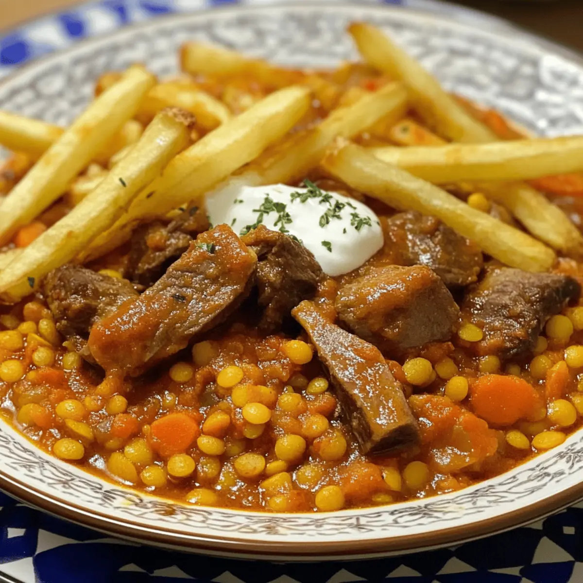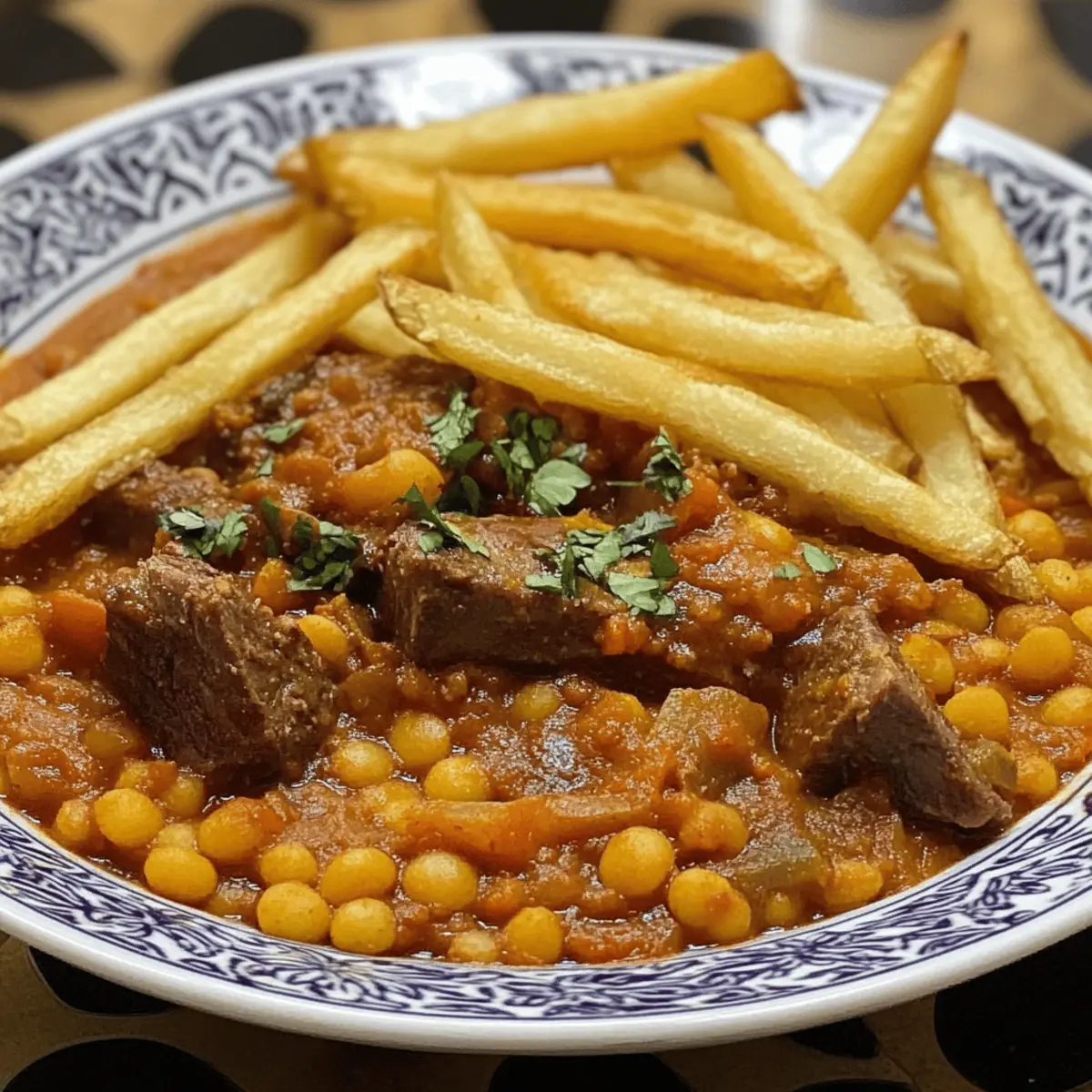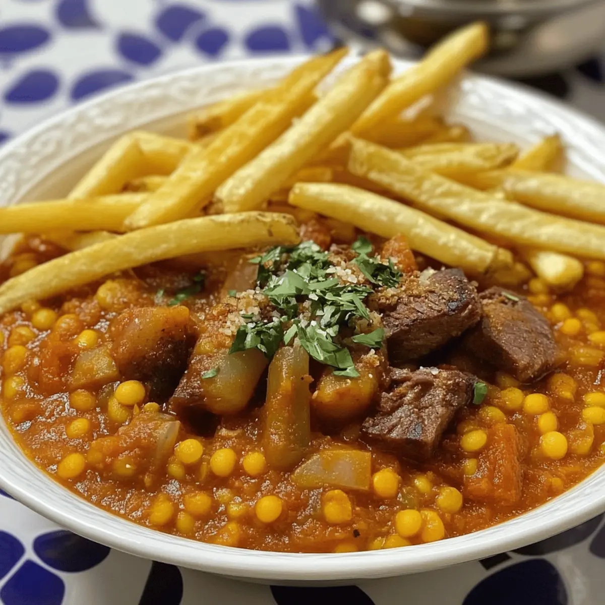Wenn ich an meine letzten Reisen nach Iran denke, schwirren mir die lebendigen Aromen von frischen Kräutern und Gewürzen im Kopf. Besonders begeistert bin ich von Khoresh Gheimeh, einem herzhaften persischen Linseneintopf, der mit knusprigen Pommes serviert wird. Diese köstliche Kombination aus zarten Linsen, saftigem Fleisch und knusprigen Kartoffeln ist nicht nur glutenfrei, sondern auch ein wahrer Familienliebling. Die besondere Würze von Zimt und Omani-Limetten gibt diesem Gericht seine unverwechselbare Note und macht es zum perfekten Komfortessen an einem gemütlichen Abend. Und das Beste daran? Es ist schnell zubereitet und sorgt für entspannte Küchenmomente! Wer kann da widerstehen? Lass uns gleich mit diesem schmackhaften Rezept starten! Warum lieben alle Khoresh Gheimeh? Herzhaft und satisfying: Khoresh Gheimeh vereint zarte Linsen und saftiges Fleisch in einem wohligen Eintopf, der einfach glücklich macht. Knusprige Pommes auf der Oberseite sorgen für den perfekten Crunch, der diesen Klassiker von anderen Gerichten abhebt. Schnell und einfach: Die Zubereitung ist unkompliziert, sodass du mehr Zeit mit deinen Liebsten verbringen kannst. Vielseitig und anpassbar: Egal, ob du die vegetarische Option wählst oder andere Gemüsesorten hinzufügst, dieses Gericht ist für jeden Geschmack geeignet. Familienfreundlich: Bestens geeignet für die gesamten Familie, macht es auch für kleine Esser Spaß, da sie die Pommes genießen können. Probiere auch eine Kombination mit anderen Rezepten wie Asiatisches Rinderhackfleisch Mit oder Zart Geschmorte Rinderkurzbraten – sie passen hervorragend zu diesem Eintopf! Khoresh Gheimeh Zutaten Zubereitungsnote: Diese Zutaten ergeben einen köstlichen persischen Linseneintopf, der perfekt für entspannte Abende ist! Für den Eintopf Lamm oder Rind (½ lb) – Hauptprotein, das Geschmack und Herzhaftigkeit bietet; du kannst auch Hühnchen verwenden oder es für eine vegetarische Option weglassen. Rote Linsen (1 Tasse) – Die Basis des Eintopfs, die Protein und Textur hinzufügt; du kannst sie auch durch gelbe Erbsen ersetzen. Zwiebeln (2, gehackt) – Fügen Süße und Tiefe hinzu; karamellisiere sie für mehr Geschmack. Knoblauch (4 Zehen, gerieben) – Verleiht dem Gericht Aroma und Geschmack. Brühe (5 Tassen) – Flüssigkeitsbasis für das Kochen; Gemüsebrühe eignet sich hervorragend für die vegetarische Variante. Tomatenmark (1 Tasse, ungewürzt) – Sorgt für Reichhaltigkeit und Säure. Omanische Limetten – Geben einen einzigartigen Zitrusgeschmack; verwende frische Limetten, wenn du keine findest. Gewürze (Zimt, Kreuzkümmel, Kurkuma, schwarzer Pfeffer, Kardamom, weißer Pfeffer, Muskatnuss) – Heben das Gericht mit warmen, aromatischen Noten hervor. Für die Pommes Kartoffeln (1 lb, in Pommes geschnitten) – Sorgt für einen knusprigen Belag; gefrorene Pommes sind eine schnelle Alternative. Für die Beilage Gekochter oder gedämpfter Reis (3 Tassen) – Serviere den Eintopf darüber für ein vollkommenes Gericht. Diese Zutaten machen Khoresh Gheimeh zu einer herzhaften Mahlzeit, die perfekt in die persische Küche passt und bei der ganzen Familie gut ankommt! Schritt-für-Schritt-Anleitung für Khoresh Gheimeh Step 1: Ofen vorheizen Heize deinen Ofen auf 200°C vor. Dies ist wichtig, um die Pommes knusprig zu backen und die perfekte Textur zu erreichen, während du den Khoresh Gheimeh zubereitest. Während der Ofen aufheizt, kannst du dich um die Kartoffeln kümmern und diese in gleichmäßige Pommes schneiden. Step 2: Pommes zubereiten In einer großen Schüssel die geschnittenen Kartoffeln mit etwas Öl und Salz vermengen. Danach die Pommes auf ein Backblech legen und im vorgeheizten Ofen für 20-30 Minuten backen, bis sie goldbraun und knusprig sind. Vergiss nicht, die Pommes nach der Hälfte der Zeit einmal umzudrehen, damit sie gleichmäßig garen. Step 3: Zwiebeln anbraten In einer großen Pfanne bei mittlerer Hitze etwas Öl erhitzen und die gehackten Zwiebeln hinzufügen. Brate die Zwiebeln etwa 5-7 Minuten lang an, bis sie golden und leicht karamellisiert sind. Füge danach den geriebenen Knoblauch hinzu und koche alles für eine weitere Minute unter Rühren, um eine aromatische Basis für deinen Khoresh Gheimeh zu schaffen. Step 4: Fleisch anbraten Gib das gewählte Fleisch in die Pfanne mit den Zwiebeln und würze alles großzügig mit Salz und Pfeffer. Brate das Fleisch für etwa 2-3 Minuten an, bis es leicht gebräunt ist. Dies sorgt dafür, dass die Aromen im Fleisch versiegelt werden, bevor die Flüssigkeiten hinzugefügt werden. Step 5: Brühe und Tomatenmark hinzufügen Gieße die Brühe und das Tomatenmark in die Pfanne und füge die Gewürze für Khoresh Gheimeh hinzu. Rühre alles gut um und bringe die Mischung zum Kochen. Decke die Pfanne ab und reduziere die Hitze auf ein Sanftes Köcheln. Lass den Eintopf für etwa 1-1,5 Stunden köcheln, bis das Fleisch zart ist. Step 6: Linsen hinzufügen Nach der Kochzeit die roten Linsen in die Eintopfmischung geben und gut umrühren, um sie gleichmäßig zu verteilen. Koche alles für weitere 20 Minuten, bis die Linsen weich sind und die Aromen gut durchgezogen sind. Überprüfe zwischendurch den Wasserstand und füge bei Bedarf mehr Brühe hinzu. Step 7: Servieren Richte den warmen Khoresh Gheimeh über dem gekochten oder gedämpften Reis an und garniere ihn großzügig mit den knusprigen Pommes. Diese Kombination aus herzhaftem Eintopf und knusprigen Kartoffeln schafft ein unvergessliches Geschmackserlebnis und lässt dich die reiche persische Küche genießen. Lagerungstipps für Khoresh Gheimeh Kühlschrank: Bewahre deinen Khoresh Gheimeh im Kühlschrank in einem luftdichten Behälter auf. Er bleibt bis zu 3 Tage frisch und behält dabei seinen köstlichen Geschmack. Einfrieren: Du kannst Khoresh Gheimeh auch gut einfrieren. Fülle ihn in einen gefriergeeigneten Behälter und friere ihn für bis zu 3 Monate ein. Achte darauf, ihn vollständig abkühlen zu la