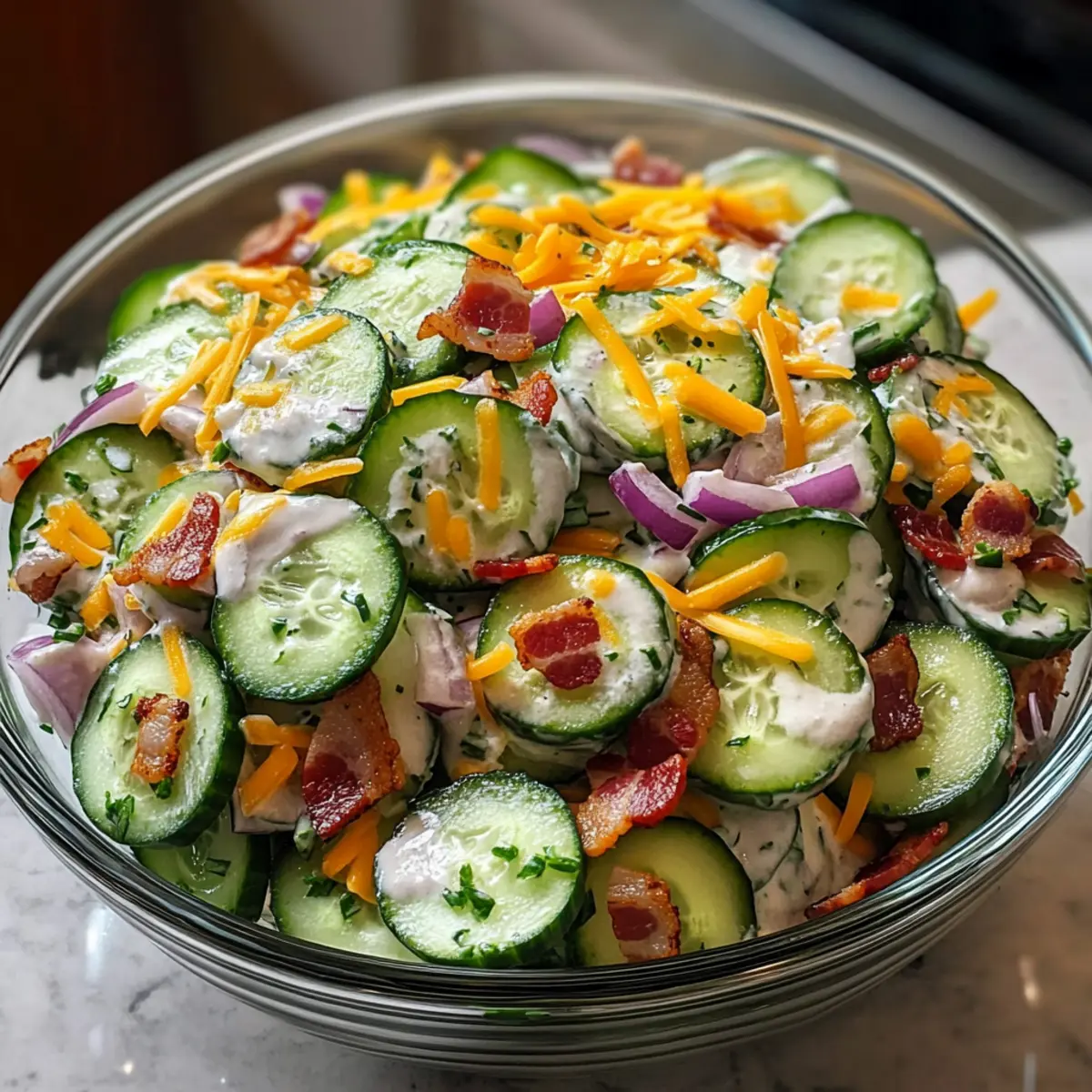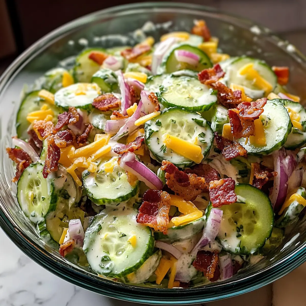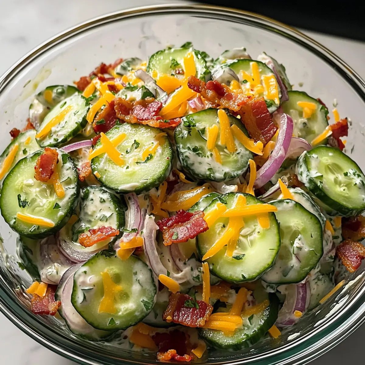 In einer warmen Sommernacht beim Grillen mit Freunden hörte ich das verführerische Knistern von Bacon auf dem Grill. Plötzlich überkam mich die Idee, einen erfrischenden Klassischen Gurken-Ranch-Crack-Salat zu zaubern. In nur 10 Minuten entsteht aus knusprigen Gurken, cremigem Ranch-Dressing, herzhaftem Bacon und würzigem Cheddar ein wahrer Genuss, der sowohl eine köstliche Beilage für Ihre Grillpartys als auch eine unkomplizierte Lösung für die wöchentlichen Abendessen darstellt. Dieser Salat ist nicht nur ein Hit für alle, die auf eine ketogene Ernährung achten; durch seine erfrischende Textur und den deftigen Geschmack wird er auch die Herzen der Fast-Food-Muffel erobern! Bereit, Ihre Geschmacksknospen zu verwöhnen? Lassen Sie uns beginnen! Warum wird dieser Salat Ihr Favorit? Einfachheit auf den Punkt gebracht: In nur 10 Minuten haben Sie einen köstlichen Salat, der keine komplizierte Zubereitung erfordert! Frischer Genuss: Die knackigen Gurken bieten eine erfrischende Basis, während das cremige Ranch-Dressing und gesalzener Bacon für einen unwiderstehlichen Geschmack sorgen. Vielseitigkeit pur: Servieren Sie ihn als köstliche Beilage zu Burgern oder als Snack zwischendurch. Für zusätzliche Abwechslung können Sie auch Kaeseburger Fruehlingsrollen Rezept probieren! Keto-freundlich: Ideal für alle, die auf Low-Carb-Diäten setzen. Dieser Salat bleibt trotzdem reichhaltig und befriedigend. Bunte Aromen: Mit frischem Dill und roter Zwiebel erhält jeder Bissen ein bisschen mehr Farbe und Geschmack – ein echter Hingucker auf dem Tisch! Klassischer Gurken-Ranch-Crack-Salat Zutaten • Zutaten für den Salat Gurken – bieten eine erfrischende Basis und sind knackig; verwenden Sie englische oder kleine Gurken, um das Schälen zu vermeiden. Scharfer Cheddar-Käse – sorgt für einen kräftigen Geschmack, der die cremige Sauce ergänzt; frisch gerieben schmilzt besser, aber Fertigprodukte sind praktisch. Gekochter Bacon – bringt eine rauchige, salzige Note ein; frisch zubereiteter Bacon sorgt für die beste Textur. Saure Sahne – bietet Cremigkeit und einen Hauch von Säure; für eine leichtere Variante können Sie griechischen Joghurt verwenden. Trockenes Ranch-Gewürz (z. B. Hidden Valley) – ein schneller Geschmacksheber, der zahlreiche Kräuter und Gewürze vereint. Rote Zwiebel – fügt Schärfe und Farbe hinzu; dünn schneiden und kurz in kaltem Wasser einweichen, um die Schärfe zu mildern. Frischer Dill – bringt einen frischen, kräuterigen Geschmack ein; getrockneter Dill kann als Ersatz verwendet werden. Salz & schwarzer Pfeffer – verstärken den Gesamteindruck; vorsichtig dosieren, da Bacon und Ranch bereits salzig sind. Step-by-Step Instructions für Klassischer Gurken-Ranch-Crack-Salat Step 1: Bacon knusprig braten Braten Sie den Bacon in einer Pfanne bei mittlerer Hitze für etwa 5–7 Minuten, bis er knusprig ist. Alternativ können Sie den Bacon auch in der Mikrowelle zubereiten. Lassen Sie den gebratenen Bacon auf einem Küchentuch abtropfen und abkühlen, bevor Sie ihn in kleine Stücke zerbröseln. Step 2: Gurken schneiden Waschen Sie die Gurken gründlich und schneiden Sie sie in 0,6 cm dicke Scheiben. Wenn Sie englische oder kleine Gurken verwenden, ist das Schälen optional. Legen Sie die Gurkenscheiben in eine große Schüssel und freuen Sie sich auf die knackige Grundlage für Ihren Klassischen Gurken-Ranch-Crack-Salat. Step 3: Dressing vorbereiten In einer separaten Schüssel verrühren Sie die saure Sahne mit dem trockenen Ranch-Gewürz bis eine glatte Mischung entsteht. Dies sollte ungefähr 2–3 Minuten dauern. Das Dressing erhält durch die Kinderleiche Konsistenz eine cremige Textur, die perfekt zu den knusprigen Zutaten passt. Step 4: Zutaten kombinieren Geben Sie die geschnittenen Gurken in eine große Schüssel und fügen Sie den geriebenen scharfen Cheddar, die zerbröselten Baconstückchen, die dünn geschnittene rote Zwiebel und den frischen Dill hinzu. Mischen Sie alles vorsichtig, um sicherzustellen, dass sich die Aromen gut miteinander verbinden. Step 5: Dressing hinzufügen Gießen Sie das vorbereitete Ranch-Dressing über die Salatzutaten und mischen Sie alles sanft, bis alle Zutaten gleichmäßig mit dem Dressing überzogen sind. Achten Sie darauf, die Gurken nicht zu zerdrücken, damit sie ihren Crunch behalten und der Klassische Gurken-Ranch-Crack-Salat seine Frische behält. Step 6: Würzen und servieren Schmecken Sie den Salat mit Salz und schwarzem Pfeffer ab. Servieren Sie ihn sofort als erfrischende Beilage oder lassen Sie ihn 10–15 Minuten im Kühlschrank ziehen, damit sich die Aromen intensiveren. Genießen Sie diesen köstlichen und vielseitigen Salat, der perfekt zu Ihren Grillabenden passt! Klassischer Gurken-Ranch-Crack-Salat Variationen Lassen Sie Ihrer Kreativität freien Lauf und passen Sie diesen köstlichen Salat nach Ihrem Geschmack an! Keto-Option: Verwenden Sie griechischen Joghurt statt saurer Sahne für eine leichtere, proteinreiche Variante. Diese Änderung sorgt für eine frische Note und bleibt trotzdem cremig. Bunte Gemüse: Fügen Sie Paprika oder Cherrytomaten hinzu, um mehr Farbe und Geschmack zu integrieren. Diese zusätzlichen Zutaten bringen sowohl Süße als auch Crunch in den Salat. Käsevielfalt: Experimentieren Sie mit verschiedenen Käsesorten wie Gouda oder Pepper Jack für einen unwiderstehlichen Geschmacks-Twist. Jeder Käse bringt seinen eigenen Charakter in den Salat. Würzige Note: Geben Sie einige frische Jalapeños oder einen Spritzer scharfer Sauce dazu, um dem Salat eine pikante Geschmacksexplosion zu verleihen. Dies ist eine großartige Möglichkeit, zusätzliche Wärme hinzuzufügen. Kräuter-Upgrade: Mischen Sie zusätzlich frischen Schnittlauch oder Petersilie unter, um dem Salat noch mehr aromatische Frische und Vielfalt zu verleihen. Solche Kräuter ergänzen perfekt den Geschmack des Dressings. Nussige Crunch: Streuen Sie einige Mandeln oder Walnüsse über den 