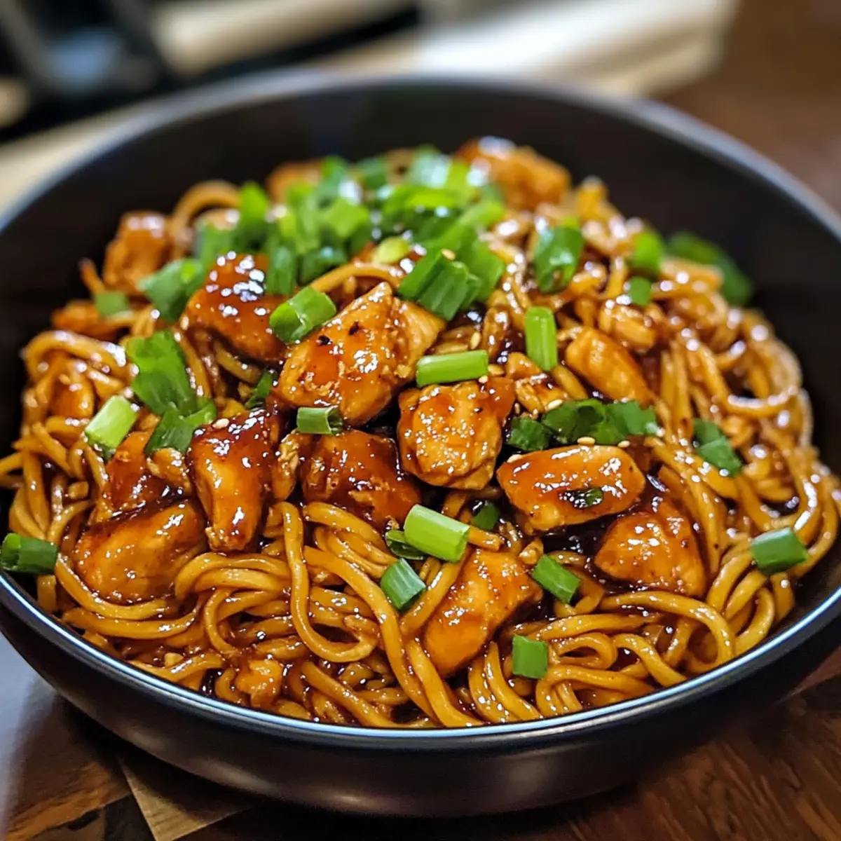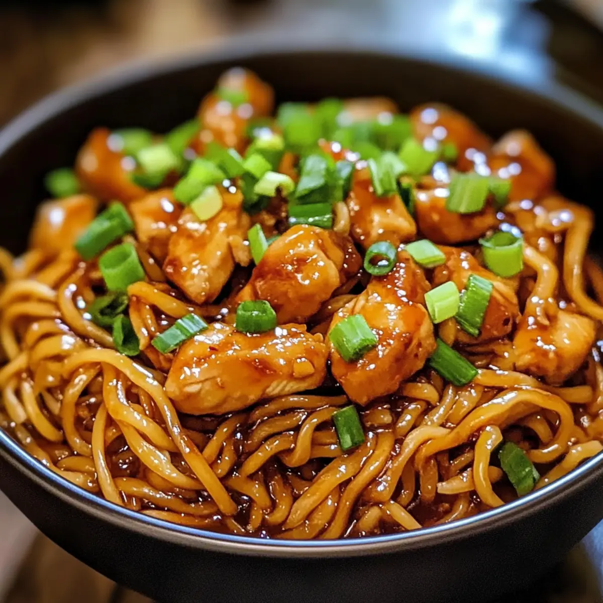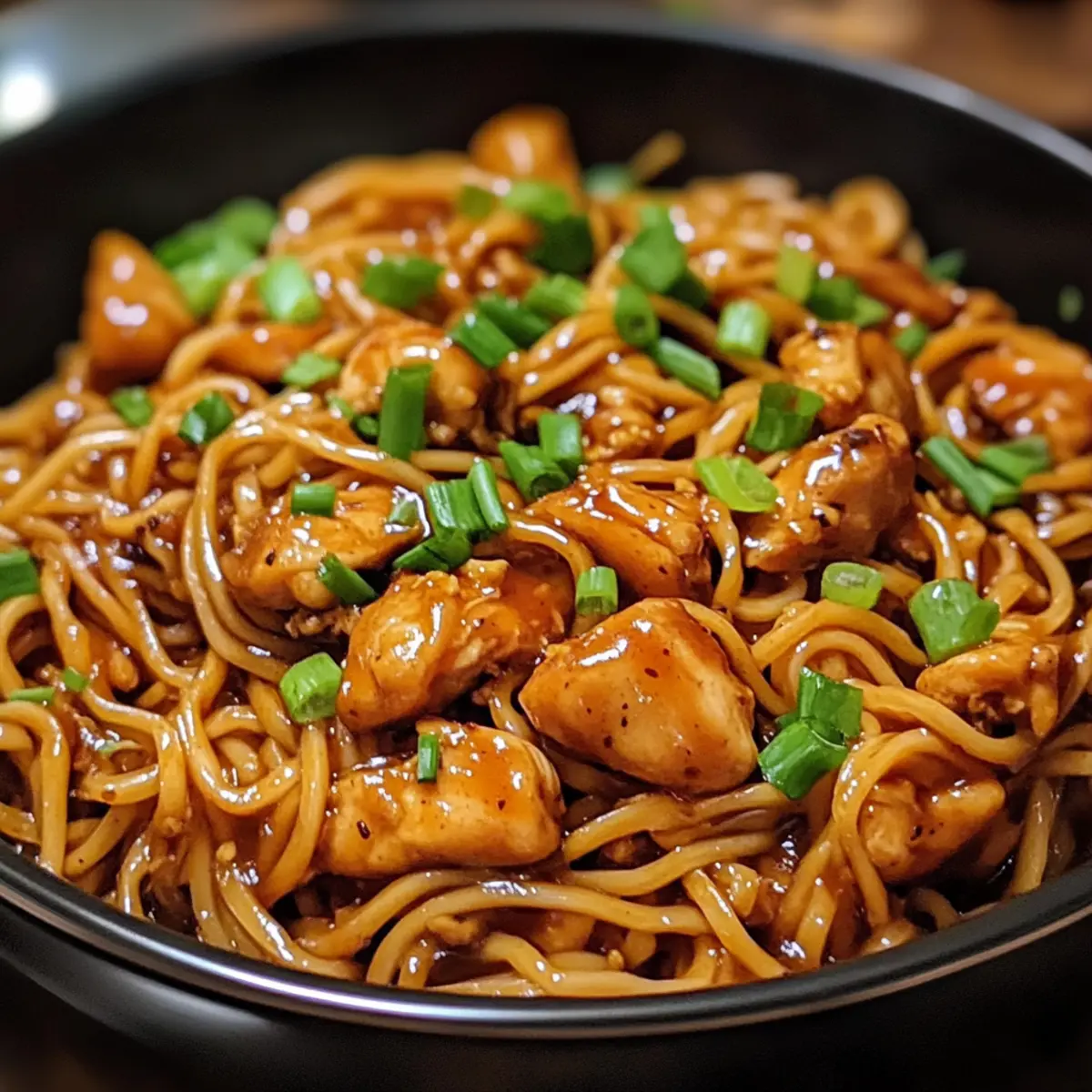 Das Aroma von frisch gebratenem Hähnchen mischt sich mit der verführerischen Süße von Knoblauch und Honig – ein Fest für die Sinne! Wenn ich nach einem unkomplizierten Abendessen suche, für das ich keine Stunden in der Küche verbringen muss, sind die klebrigen Knoblauchhähnchen-Nudeln mein Geheimtipp. In nur 30 Minuten zauberst du ein köstliches und herzhaftes Gericht, das sich perfekt für geschäftige Wochentage eignet. Dieser Mix aus saftigem Hühnchen, einer glänzenden Knoblauchsauce und weichen Nudeln ist nicht nur unglaublich einfach zuzubereiten, sondern auch vielseitig – füge deine liebsten Gemüse hinzu oder passe die Gewürze an! Ich verspreche dir, dass alle beim Essen den Genuss dieser herzhaften Kombination schätzen werden. Bist du bereit, deine nächste schnelle Dinner-Routine aufzupeppen? Warum wirst du dieses Rezept lieben? Einfachheit: Die Zubereitung erfordert keine speziellen Kochkünste, sodass du in der Küche schnell durchstarten kannst. Vielseitigkeit: Ob mit Gemüse oder verschiedenen Proteinen – passe die klebrigen Knoblauchhähnchen-Nudeln ganz nach deinem Geschmack an! Unwiderstehlicher Geschmack: Die Kombination aus süßem Honig und herzhaftem Knoblaucharoma sorgt für einen vollmundigen Genuss, der alle begeistert. Schnelle Zubereitung: In nur 30 Minuten hast du ein köstliches Abendessen auf dem Tisch, perfekt für stressige Tage. Gesunde Optionen: Ersetze die Nudeln durch ganze Körner oder Gemüse für eine nährstoffreiche Mahlzeit, die keinen Geschmack einbüßt. Crowd-Pleaser: Diese Nach-Hause-komm-Küche bringt die ganze Familie zusammen und macht es schwer, sich zu besprechen, wenn jeder nach mehr verlangt! Zutaten für Klebrige Knoblauchhähnchen-Nudeln Für die Sauce: • Sojasauce – Fügt einen salzigen Umami-Geschmack hinzu; für eine glutenfreie Variante einfach durch Tamari ersetzen. • Honig – Sorgt für Süße und hilft bei der Herstellung einer klebrigen Sauce; als vegane Alternative eignet sich auch Ahornsirup. • Zerkleinerter Knoblauch – Wichtig für den charakteristischen Knoblauchgeschmack; frischer Knoblauch ist am besten, aber im Notfall kann auch Knoblauchpulver verwendet werden. • Geriebener Ingwer – Steigert die Frische und Wärme des Gerichts; gemahlener Ingwer kann ebenfalls verwendet werden. • Rote Chiliflocken – Fügen Schärfe hinzu; die Menge kann je nach Vorliebe angepasst oder ganz weggelassen werden. Für das Hähnchen: • Hähnchenbrust – Das Hauptprotein für dieses Gericht; diese sollte in mundgerechte Stücke geschnitten werden. • Maisstärke – Sorgt für eine knusprige Textur; es gibt keinen direkten Ersatz, aber du kannst Allzweckmehl verwenden. • Pflanzenöl – Zum Braten des Hähnchens; Olivenöl oder Sesamöl können für zusätzlichen Geschmack ebenfalls verwendet werden. Für die Nudeln: • Nudeln (Reis- oder Eiernudeln) – Basis des Gerichts; wähle deine Lieblingssorte; Vollkorn- oder Gemüsenudeln sind gesunde Alternativen. • Frühlingszwiebeln – Zum Garnieren für zusätzliche Farbe und Frische; bei Bedarf können sie durch Schnittlauch ersetzt werden. • Sesamsamen – Optionale Garnitur, die für zusätzlichen Crunch sorgt; kann durch zerdrückte Erdnüsse substituiert werden. Entdecke die Aromen und den köstlichen Genuss dieser klebrigen Knoblauchhähnchen-Nudeln – ein Gericht, das deine Familie lieben wird! Schritt-für-Schritt-Anleitung für klebrige Knoblauchhähnchen-Nudeln Step 1: Sauce vorbereiten Verrühre in einer Schüssel die Sojasauce, den Honig, den zerkleinerten Knoblauch, den geriebenen Ingwer und die roten Chiliflocken kräftig, bis die Mischung glatt ist. Diese köstliche Sauce wird den klebrigen Charakter der Knoblauchhähnchen-Nudeln ausmachen. Stelle die Sauce zur Seite, während du die nächsten Schritte vorbereitest. Step 2: Hähnchen vorbereiten Schneide die Hähnchenbrust in mundgerechte Stücke und gib sie in eine große Schüssel. Bestäube das Hähnchen gleichmäßig mit Maisstärke und vermische es gut, sodass jedes Stück gleichmäßig bedeckt ist. Dies sorgt für eine knusprige Textur, wenn das Hähnchen in der Pfanne brät. Step 3: Hähnchen braten Erhitze in einer großen Pfanne bei mittelhoher Temperatur 2 bis 3 Esslöffel Pflanzenöl. Füge die Hähnchenstücke hinzu und brate sie für 6-8 Minuten, bis sie goldbraun und durchgegart sind. Achte darauf, das Hähnchen zwischendurch zu wenden, damit es gleichmäßig brät und eine knusprige Oberfläche erhält. Step 4: Sauce hinzufügen Gieße die vorbereitete Knoblauchsauce über das gebratene Hähnchen in der Pfanne. Rühre alles gut um und lasse es dann 2-3 Minuten köcheln, bis die Sauce leicht eingedickt ist und schön an den Hähnchenstücken haftet. Der aromatische Duft wird deine Küche erfüllen! Step 5: Nudeln kochen Koche in der Zwischenzeit die Nudeln nach den Anweisungen auf der Verpackung in einem separaten Topf. Achte darauf, die Nudeln al dente zu garen, damit sie beim Mischen mit der Sauce nicht zu weich werden. Nach dem Kochen, die Nudeln abtropfen lassen und kurz mit kaltem Wasser abspülen, um das Verkleben zu verhindern. Step 6: Gericht vollenden Füge die gekochten Nudeln zu dem Hähnchen und der Sauce in der Pfanne hinzu und vermenge alles gründlich. Lasse es für eine weitere Minute erhitzen, damit die Nudeln die köstliche Sauce aufnehmen können. Step 7: Anrichten und garnieren Serviere die klebrigen Knoblauchhähnchen-Nudeln heiß in Schalen. Garniere das Gericht großzügig mit frisch geschnittenen Frühlingszwiebeln und bestreue es nach Belieben mit Sesamsamen für den zusätzlichen Crunch. Genieße dieses aromatische und herzhafte Abendessen! Was passt zu Klebrigen Knoblauchhähnchen-Nudeln? Das perfekte Abendessen besteht aus mehr als nur dem Hauptgericht – es ist eine Kombination von Aromen, Texturen und Farben, die das Geschmackserlebnis abrunden. Cremige Erdnuss-Sauce: Sie ergänzt die süß-saftigen Nudeln wunderbar und fügt eine nussi