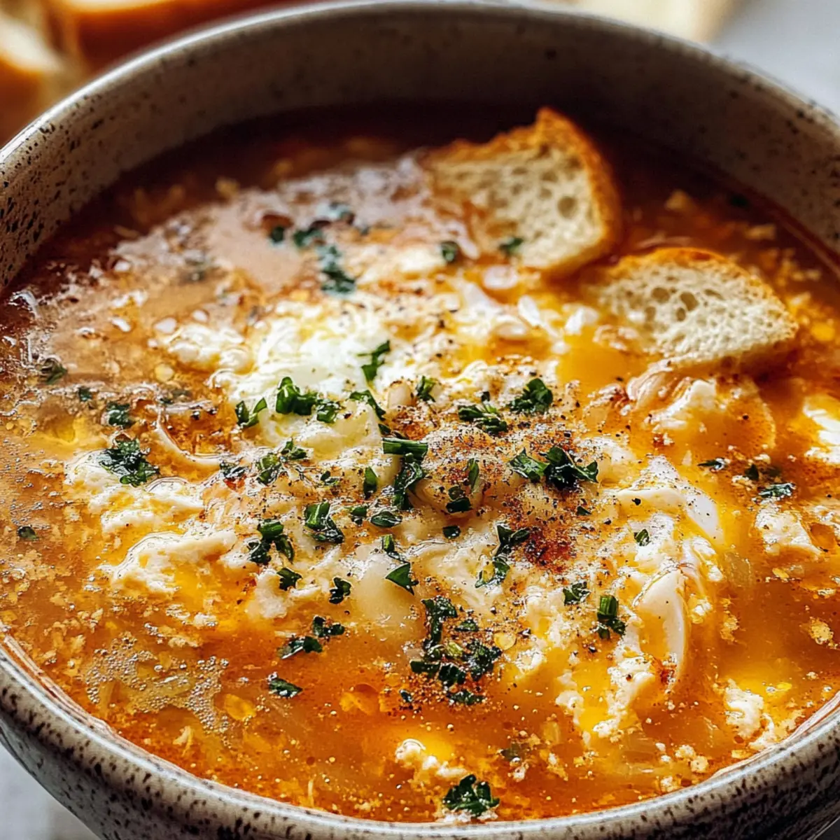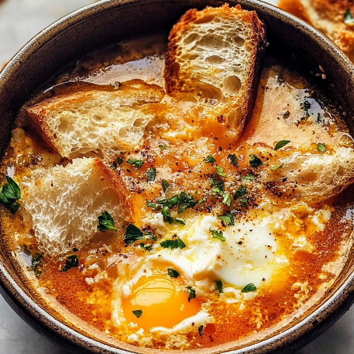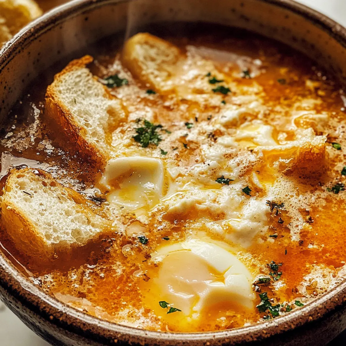 Eines der besten Dinge an kühlen Abenden ist der verlockende Duft von frisch zubereiteter Knoblauchsuppe, der durch die Küche zieht. Während ich genüsslich die knusprigen Brotwürfel in den goldenen, dampfenden Brühe eintauche, könnte ich schwören, dass auch die Nachbarn einen Blick auf das Fenster werfen. Diese authentische Sopa de Ajo ist einfach zuzubereiten und begeistert nicht nur Freunde und Familie, sondern ist auch eine wahre Umarmung für die Seele. Ideal, um sich nach einem langen Tag aufzuwärmen oder einfach mal eine Pause von der Schnellküche einzulegen, bietet dieses Gericht eine ehrliche, köstliche Lösung für jeden Hunger. Seid ihr bereit, euer Zuhause mit dem göttlichen Aroma dieser spanischen Klassikers zu erfüllen? Warum ist Knoblauchsuppe so besonders? Herzlicher Genuss: Diese Knoblauchsuppe ist mehr als nur eine Mahlzeit; sie ist eine Umarmung in Schüsseln, perfekt für kalte Tage. Einfachte Zubereitung: Die Zutaten sind leicht erhältlich, und die Zubereitung erfordert nur grundlegende Kochkenntnisse. Vielseitigkeit: Mit ihrem vollen, würzigen Geschmack lässt sich die Suppe nach Belieben abwandeln – beispielsweise mit Gemüsebrühe, um eine köstliche vegetarische Option zu kreieren. Besonderer Geschmack: Die Kombination von frisch geröstetem Knoblauch und rauchigem Paprika schafft ein einmaliges Geschmackserlebnis, das jeden Gaumen verwöhnt. Geselligkeit: Diese Suppe bringt Familie und Freunde zusammen – ideal für ein entspanntes Abendessen oder um Gäste zu beeindrucken. Probiert auch unsere andere Klassische spanische Rezepte, um eurer Speisekarte eine mediterrane Note zu verleihen! Knoblauchsuppe Zutaten Entdecke die köstlichen Zutaten für diese klassische Knoblauchsuppe! Für die Brühe Olivenöl – sorgt für eine reichhaltige Basis und kann bei Bedarf durch ein anderes Pflanzenöl ersetzt werden. Knoblauch – der Schlüsselaroma-Träger, dünn geschnitten für gleichmäßiges Garen; frischer Knoblauch ist unverzichtbar für das optimale Geschmackserlebnis. Stale Brot – verleiht der Suppe Struktur und Körper, ohne matschig zu werden; frisch gebackenes Brot kann verwendet werden, wenn es vorher geröstet wird. Räucherspaprika (Pimentón) – sorgt für Tiefe mit einem milden, rauchigen Geschmack, essentiell für die authentische Knoblauchsuppe; reguläre Paprika kann substituiert werden, hat jedoch nicht den gleichen rauchigen Charakter. Hühnerbrühe oder Gemüsebrühe – liefert den Grundgeschmack der Suppe; wähle je nach diätetischen Vorlieben. Eier – aufgeschlagen und hinzugefügt, um zarte Ribbons in der Suppe zu kreieren; kein Ersatz, sie sind für die Textur unerlässlich. Salz und Pfeffer – nach Geschmack; passe die Gewürze deinen Vorlieben an. Für die Garnitur Frische Petersilie – bringt Farbe und Frische; ideal für den letzten Schliff. Zusätzlicher Spritzer Olivenöl – verstärkt den Geschmack und gibt der Suppe ein luxuriöses Finish. Ein Spritzer Zitronensaft – verleiht einen Hauch von Frische, der die Aromen aufhellt. Egal, ob für ein geduldiges Abendessen oder einen schnellen Genuss an einem kühlen Abend, diese köstliche Knoblauchsuppe wird zum Mittelpunkt eures Tisches! Schritt-für-Schritt-Anleitung für Knoblauchsuppe Step 1: Knoblauch anbraten Erhitze in einem großen Topf bei mittlerer Hitze 3 Esslöffel Olivenöl. Füge die dünn geschnittenen Knoblauchzehen hinzu und brate sie für etwa 2-3 Minuten an, bis sie duften und eine leicht goldene Farbe annehmen. Achte darauf, dass der Knoblauch nicht zu dunkel wird, da er sonst bitter wird. Step 2: Brot hinzufügen Lass das bestrichene Brot in den Topf fallen und rühre es gut um, damit es mit dem aromatischen Knoblauchöl bedeckt wird. Koche das Brot für weitere 3 Minuten, eine goldene Farbe und ein leicht knuspriges Gefühl sind ideale Indikatoren dafür, dass es perfekt vorbereitet ist. Step 3: Brühe angießen Gieße vorsichtig 1 Liter Hühnerbrühe oder Gemüsebrühe in den Topf und rühre den Inhalt gut um. Zerkleinere das Brot mit einem Holzlöffel, während die Brühe beginnt zu köcheln. Bringe die Mischung zum kräftigen Köcheln und lasse alles etwa 5 Minuten simmern, damit sich die Aromen entfalten können. Step 4: Eier einrühren Schlage 2 Eier in einer separaten Schüssel auf und verquirle sie gründlich. Rühre die Suppe kontinuierlich in eine Richtung, um einen kleinen Strudel zu erzeugen, und gieße dann die verquirlten Eier langsam hinein. Die Eier sollten sich in zarten Ribbons in der heißen Brühe entfalten. Step 5: Würzen und Anpassen Schmecke die Knoblauchsuppe nach Belieben mit Salz, Pfeffer und etwas zusätzlichem geräuchertem Paprika ab. Wenn die Suppe zu dick ist, füge nach Bedarf mehr Brühe hinzu und rühre weiter, bis die gewünschte Konsistenz erreicht ist. Step 6: Servieren Verteile die heiße Knoblauchsuppe in Schalen und garniere sie nach Wunsch mit frischer Petersilie, einem Spritzer Zitronensaft oder einem zusätzlichen Spritzer Olivenöl. Serviere die Suppe sofort, um das volle Aroma und die Wärme zu genießen. Lagerungstipps für Knoblauchsuppe Raumtemperatur:: Serviere die Knoblauchsuppe frisch, da sie am besten schmeckt. Bei Raumtemperatur sollte sie nicht länger als 2 Stunden stehen bleiben. Kühlschrank:: Bewahre die Knoblauchsuppe in einem luftdichten Behälter im Kühlschrank auf. Sie bleibt bis zu 2 Tage frisch, aber das Brot kann an Textur verlieren. Gefrierschrank:: Du kannst die Suppe bis zu 3 Monate im Gefrierschrank aufbewahren. Achte darauf, sie in portionsgerechten Behältern einzufrieren, um eine einfache Portionierung zu ermöglichen. Wiedererwärmen:: Beim Erwärmen die gefrorene Knoblauchsuppe im Kühlschrank über Nacht auftauen lassen und dann sanft auf dem Herd erwärmen. Füge bei Bedarf Brühe hinzu, um die gewünschte Konsistenz zu erreichen. Knoblauchsuppe Variationen & Alternativen Lass deiner Kreativität freien Lauf und entdecke, wie du diese köstliche Knoblauchsuppe nach dei