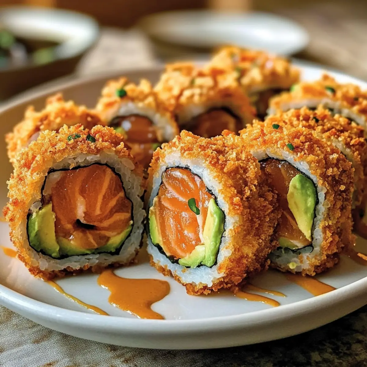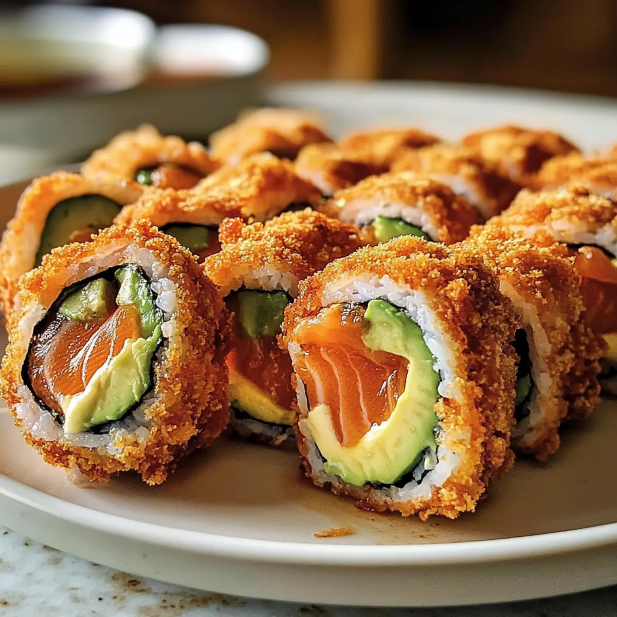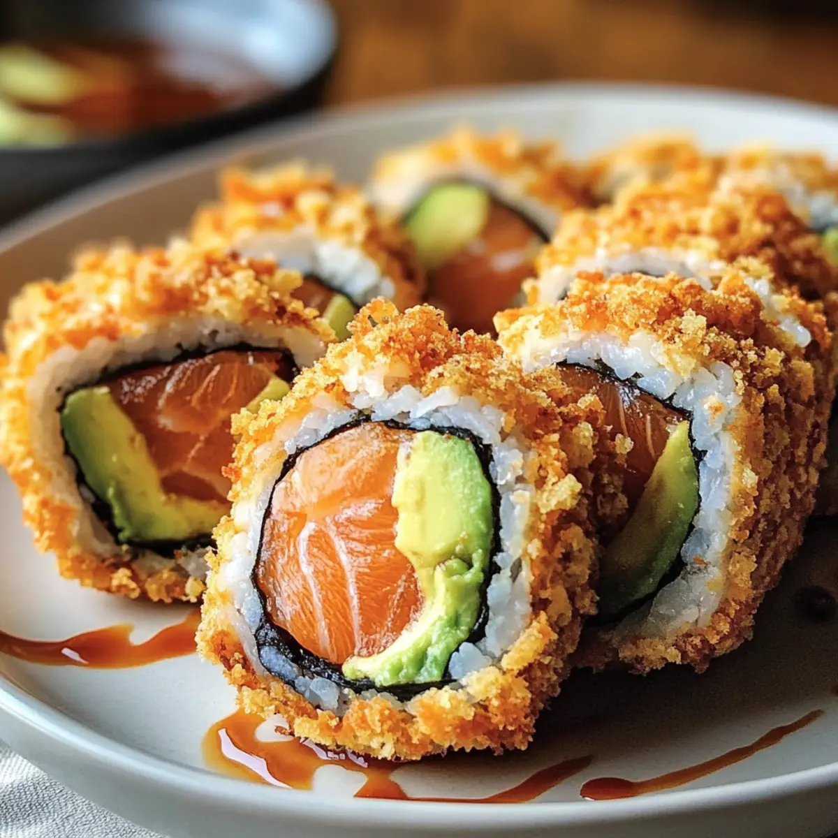 Als ich das erste Mal in meinem Lieblingsrestaurant saß und eine perfekte knusprige Rolle vor mir sah, wusste ich sofort: Das muss ich zu Hause nachmachen! Diese knusprigen frittierte Lachs- und Avocado-Rollen vereinen nicht nur den fantastischen Crunch mit dem cremigen Inneren des saftigen Lachs und der Avocado, sondern sind auch eine großartige Möglichkeit, sich nach einem langen Tag mit etwas Besonderem zu verwöhnen. Dank einer sorgfältigen Paniermethode und der richtigen Öltemperatur gelingen sie kinderleicht und bringen den Gourmet-Geschmack eines Sushi-Restaurants direkt in deine Küche. Ob als perfektes Snack für einen entspannten Abend oder als Glanzstück für dein nächstes Dinner, dieses Rezept ist sowohl schnell zubereitet als auch ein echter Publikumsliebling. Bist du bereit, die Fritteuse anzuschmeißen und deine Gäste zu beeindrucken? Warum sind diese Sushi-Rollen so besonders? Einzigartiger Geschmack: Die Kombination aus knuspriger, frittierter Außenschicht und cremigem Avocado-Füllung schafft ein unwiderstehliches Geschmackserlebnis. Einfachheit: Die Zubereitung ist unkompliziert und erfordert nur grundlegende Kochkenntnisse, sodass auch Anfänger eine hohe Erfolgsquote haben. Vielseitigkeit: Diese Rollen sind flexibel; du kannst verschiedene Füllungen wie Shrimp oder frisches Gemüse verwenden, je nach Vorliebe und Saison. Schnelligkeit: In weniger als 30 Minuten zubereitet, sind sie ideal für spontane Gäste oder als schmackhafter Snack! Publikumsfavorit: Die köstlichen, knusprigen Lachs- und Avocado-Rollen werden deine Gäste begeistern und sie nach mehr verlangen! Wenn du mehr über die verschiedenen Rollenvariationen erfahren möchtest, schau dir unsere anderen Sushi-Rezepte an. Knusprige frittierte Lachs- und Avocado-Rollen Zutaten • Um das beste Ergebnis zu erzielen, stellen Sie sicher, dass alle Zutaten frisch und von guter Qualität sind, besonders der Lachs. Für den Sushi-Reis Sushi-Reis – Essenziell für die Struktur und Textur. Achten Sie auf den richtigen Stärkegehalt fürs Rollen. Wasser – Wird zum Kochen des Reises verwendet. Befolgen Sie die Packungsanweisungen für die Reis-Wasser-Verhältnisse. Reisessig – Fügt der Sushi-Reis Mischung Säure und Geschmack hinzu. Apfelessig kann im Notfall verwendet werden. Zucker – Balanciert die Säure im Reisgewürz aus. Honig kann als natürliche Süßungsmittel verwendet werden. Salz – Verstärkt den Geschmack des Sushi-Reis. Meersalz ist eine gute Alternative für die Geschmacksverbesserung. Für die Rolle Nori-Algenblätter – Wickeln die Sushi-Rolle ein und liefern Stabilität und Geschmack. Reisblatt kann verwendet werden, bietet jedoch eine andere Textur. Gekochter Lachs oder Sushi-qualitativ Lachs – Bietet die Hauptproteinquelle. Zerflückter gekochter Lachs funktioniert gut; roher Lachs muss von einem vertrauenswürdigen Anbieter stammen. Reife Avocado – Fügt Cremigkeit und visuelle Anziehung hinzu. Frischkäse kann für ein anderes Geschmacksprofil verwendet werden. Für die Panade Panko-Brösel – Schlüssel für eine knusprige Außenschicht. Reguläre Brösel können ersetzt werden, bieten jedoch nicht die gleiche Luftigkeit. Weizenmehl – Dient als erste Beschichtung zur Bindung. Glutenfreies Mehl kann verwendet werden, um es glutenfrei zu machen. Große Eier – Sorgt für Bindung und verbessert die Knusprigkeit. Leinsamen-Eier eignen sich als vegane Alternative. Zum Frittieren und Dippen Pflanzenöl – Wird zum Frittieren verwendet, um diese knusprige Textur zu erreichen. Raps- oder Erdnussöl sind ebenfalls geeignete Optionen. Mayonnaise – Basis für die Dipsauce, die Cremigkeit beiträgt. Griechischer Joghurt kann eine leichtere Alternative sein. Sriracha-Sauce – Fügt der Mayonnaise Schärfe hinzu. Jede scharfe Sauce kann verwendet werden, je nach Vorliebe. Süße Sojasoße (Eelsauce) – Ergänzt die Aromen mit Süße. Hoisinsoße kann an ihrer Stelle verwendet werden. Jede Zutat trägt zur köstlichen Kombination der knusprigen frittierte Lachs- und Avocado-Rollen bei, die dich und deine Gäste begeistern wird! Schritt-für-Schritt-Anleitung für die Knusprige frittierte Lachs- und Avocado-Rollen Step 1: Reis kochen Koche den Sushi-Reis gemäß den Packungsanweisungen in einem Topf mit Wasser. Spüle den Reis vor dem Kochen gründlich ab, um überschüssige Stärke zu entfernen. Nach dem Kochen lasse den Reis einige Minuten abgedeckt ruhen, bis er gedämpft ist und die Körner weich geworden sind. Step 2: Reis würzen Mische in einer kleinen Schüssel Reisessig, Zucker und Salz, bis beides vollständig aufgelöst ist. Füge die Mischung dann vorsichtig in den warmen Reis ein und falte sie sanft unter. Lasse den gewürzten Reis auf Zimmertemperatur abkühlen, bevor du mit dem Rollen beginnst. Step 3: Füllung vorbereiten Zerkleinere den gekochten Lachs oder schneide den sushi-qualitativ Lachs in dünne Streifen. Schneide die reife Avocado in gleichmäßige Scheiben, um eine ansprechende Füllung für die knusprigen frittierte Lachs- und Avocado-Rollen zu erhalten. Step 4: Nori vorbereiten Lege ein Nori-Algenblatt auf eine Bambusmatte, damit du die Rolle leicht formen kannst. Verteile eine Schicht Sushi-Reis gleichmäßig auf dem Nori, lasse dabei an den oberen Kanten einen kleinen Rand von etwa 2 cm frei, um das Rollen zu erleichtern. Step 5: Füllungen positionieren Platziere die vorbereiteten Lachs- und Avocadoscheiben in der Mitte des Reises auf dem Nori. Achte darauf, dass die Füllungen gleichmäßig und kompakt angeordnet sind, damit die knusprigen frittierte Lachs- und Avocado-Rollen beim Rollen nicht auseinanderfallen. Step 6: Rolle formen Beginne an der unteren Kante der Bambusmatte und rolle das Nori mit einem festeren Druck auf. Halte die Füllung an Ort und Stelle, während du die Rolle vorsichtig, aber straff formst. Drücke die Rolle am Ende leicht zusammen, um sie zu verschließen. Step 7: Bepanieren vorbereiten Richte eine Panierstation ein: L